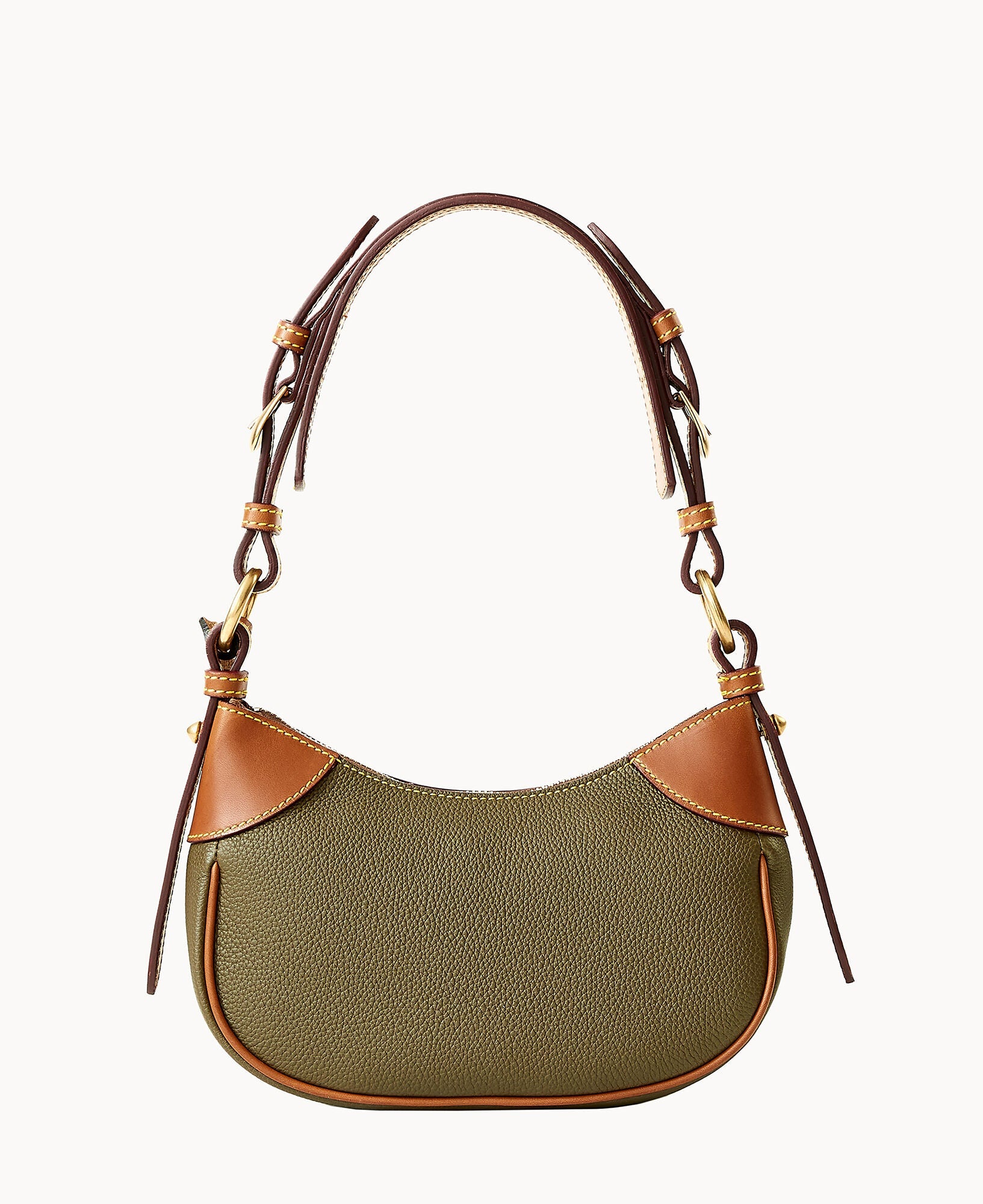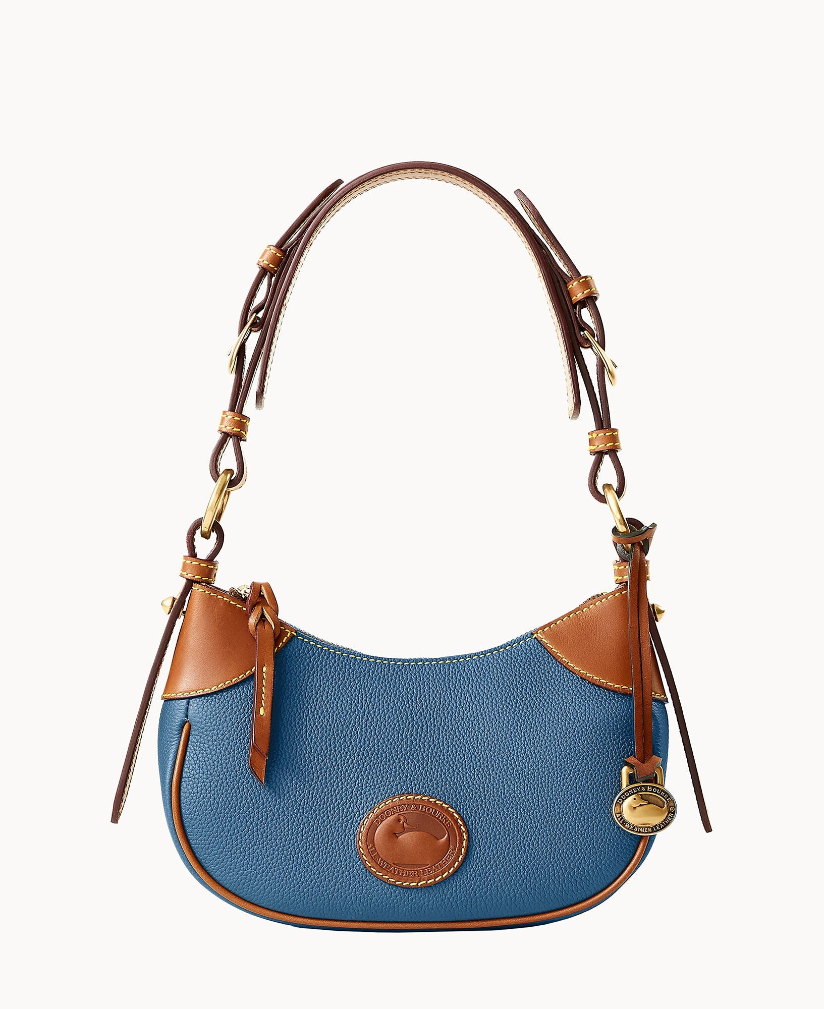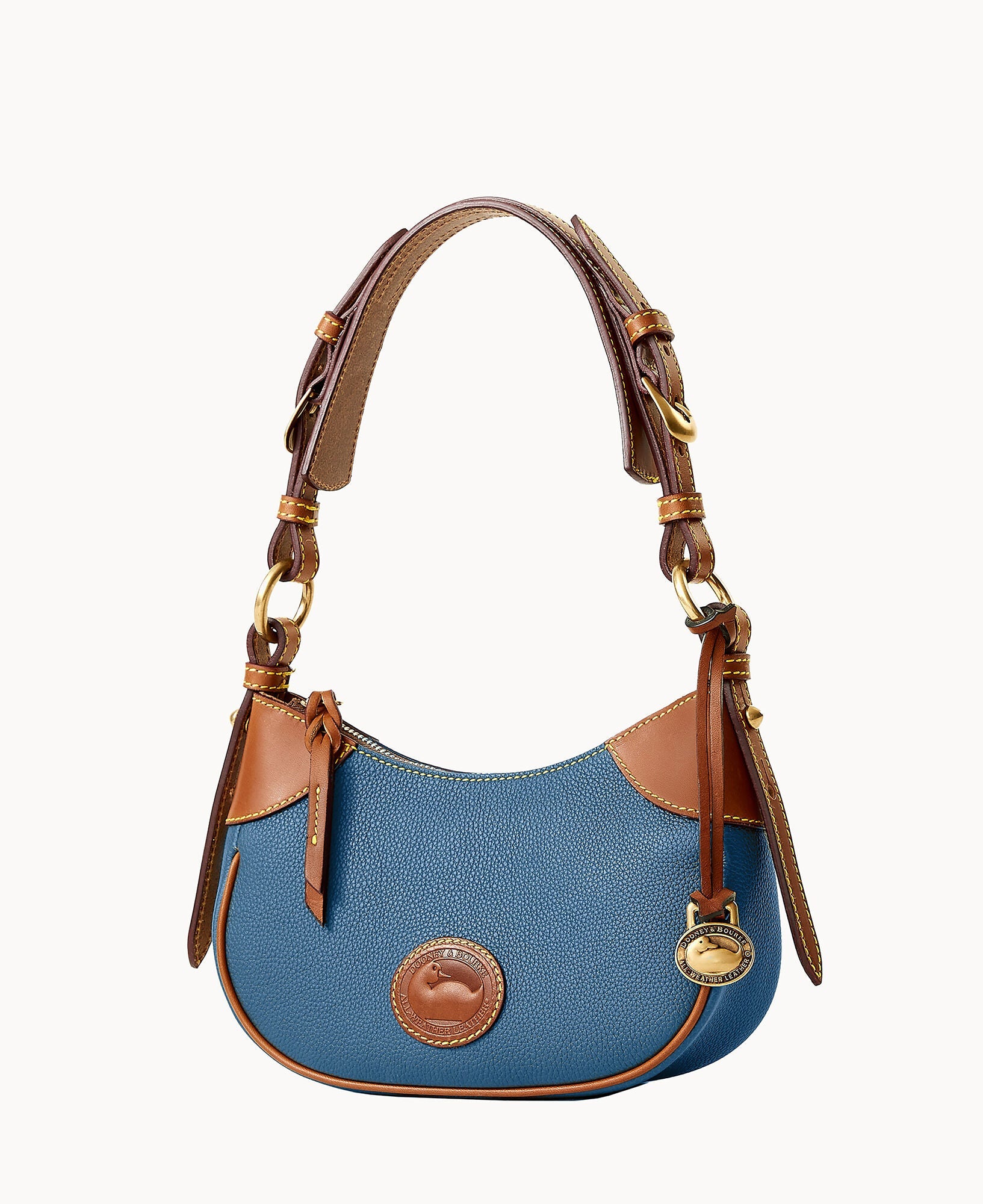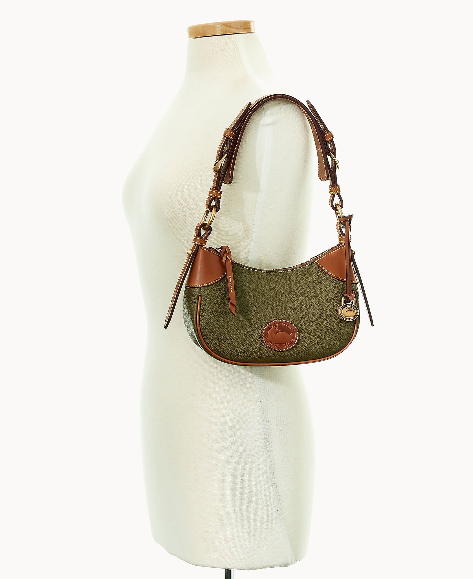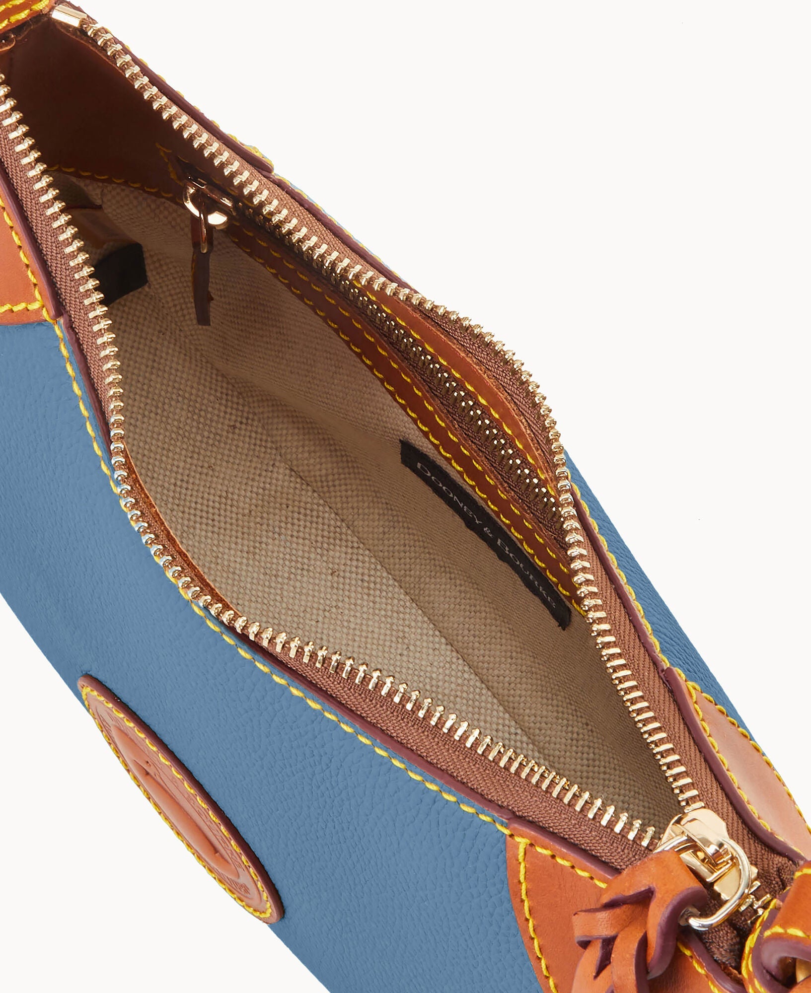 One inside zipper pocket. Handle drop length 9". Lined. Zipper closure.