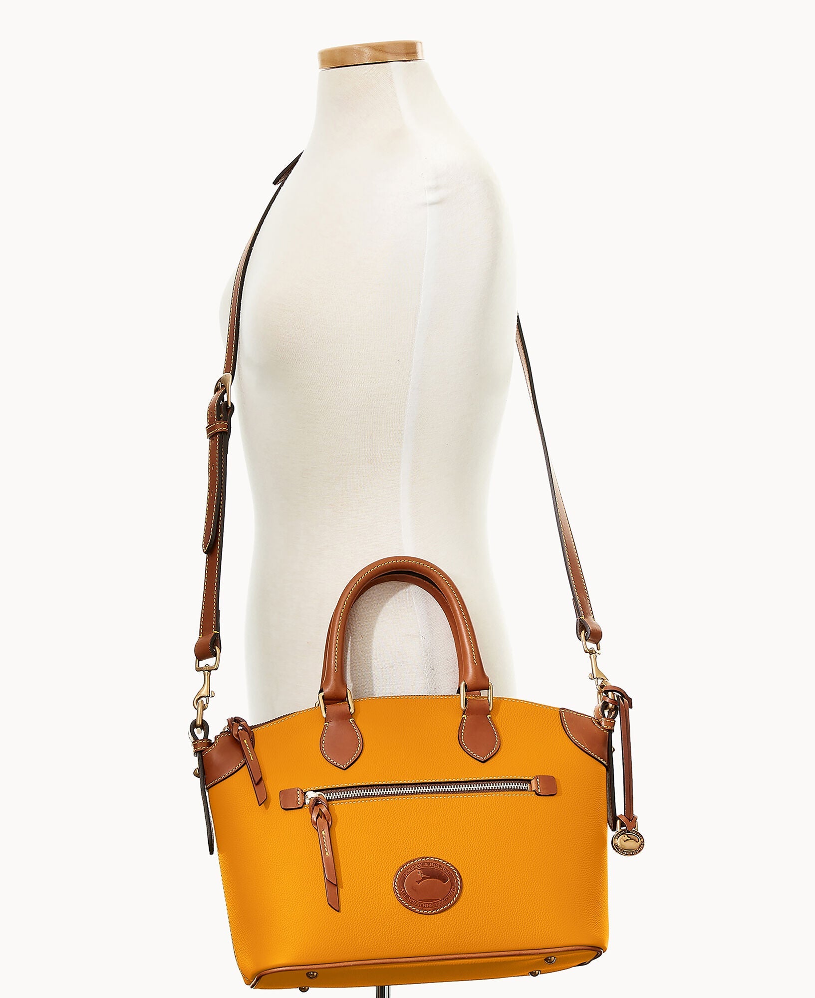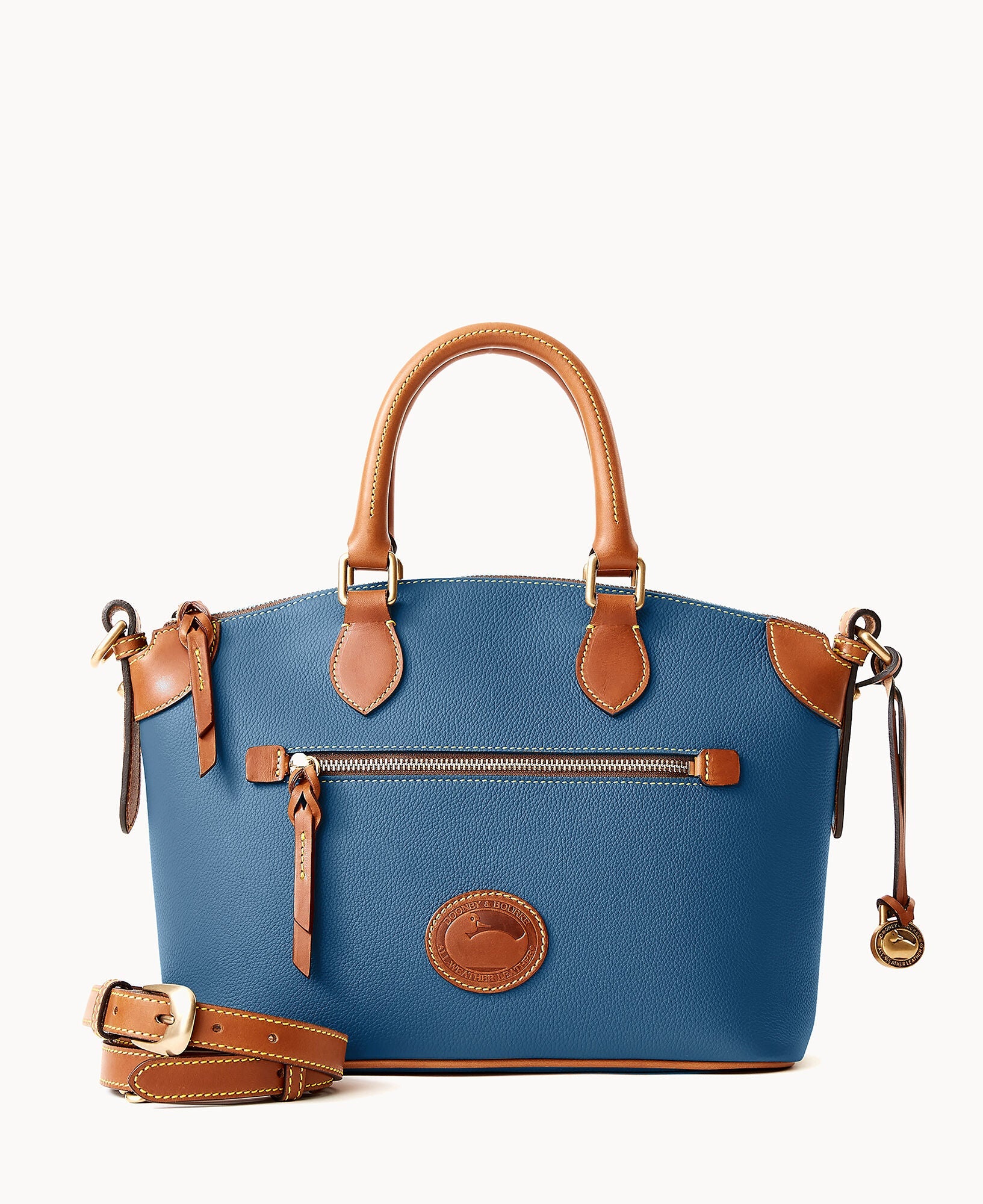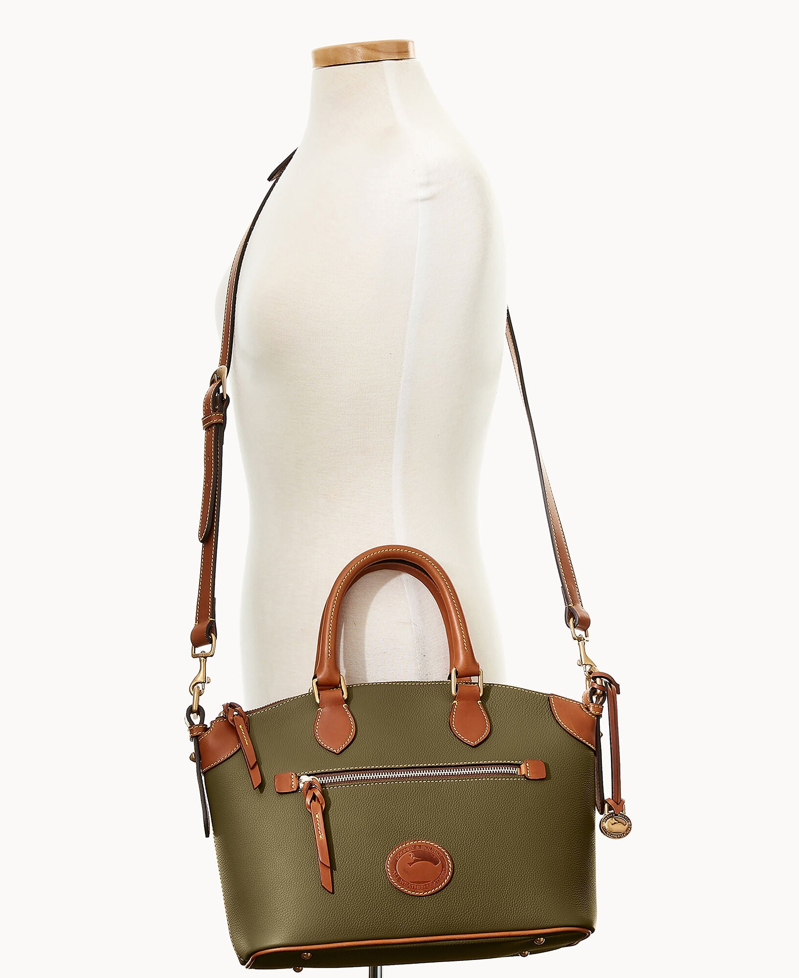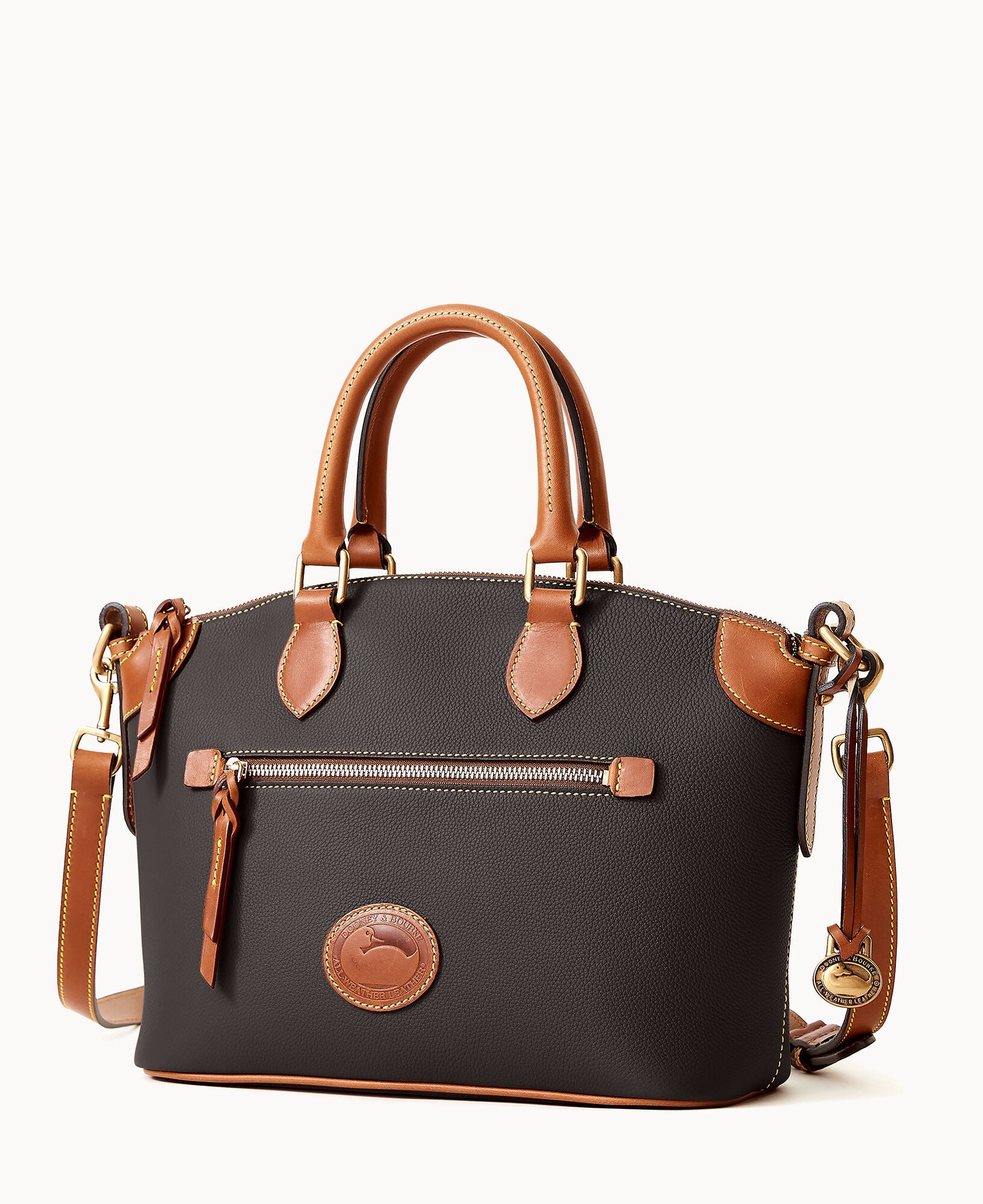 One outside zip pocket. One inside zip pocket. Two inside pockets. Handle drop length 4.25". Adjustable, detachable shoulder strap. Strap drop length 25.5". Lined. Feet. Zipper closure.