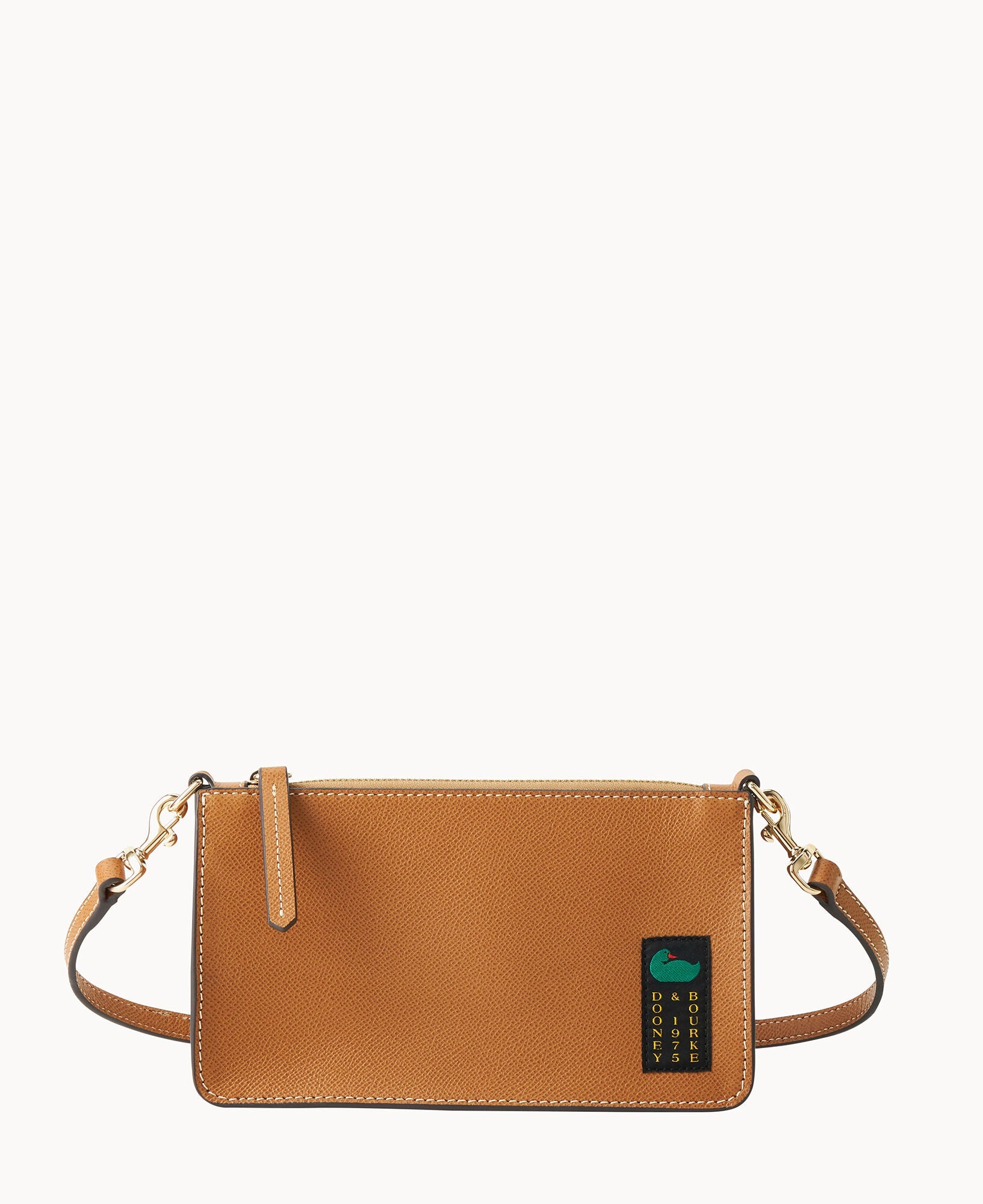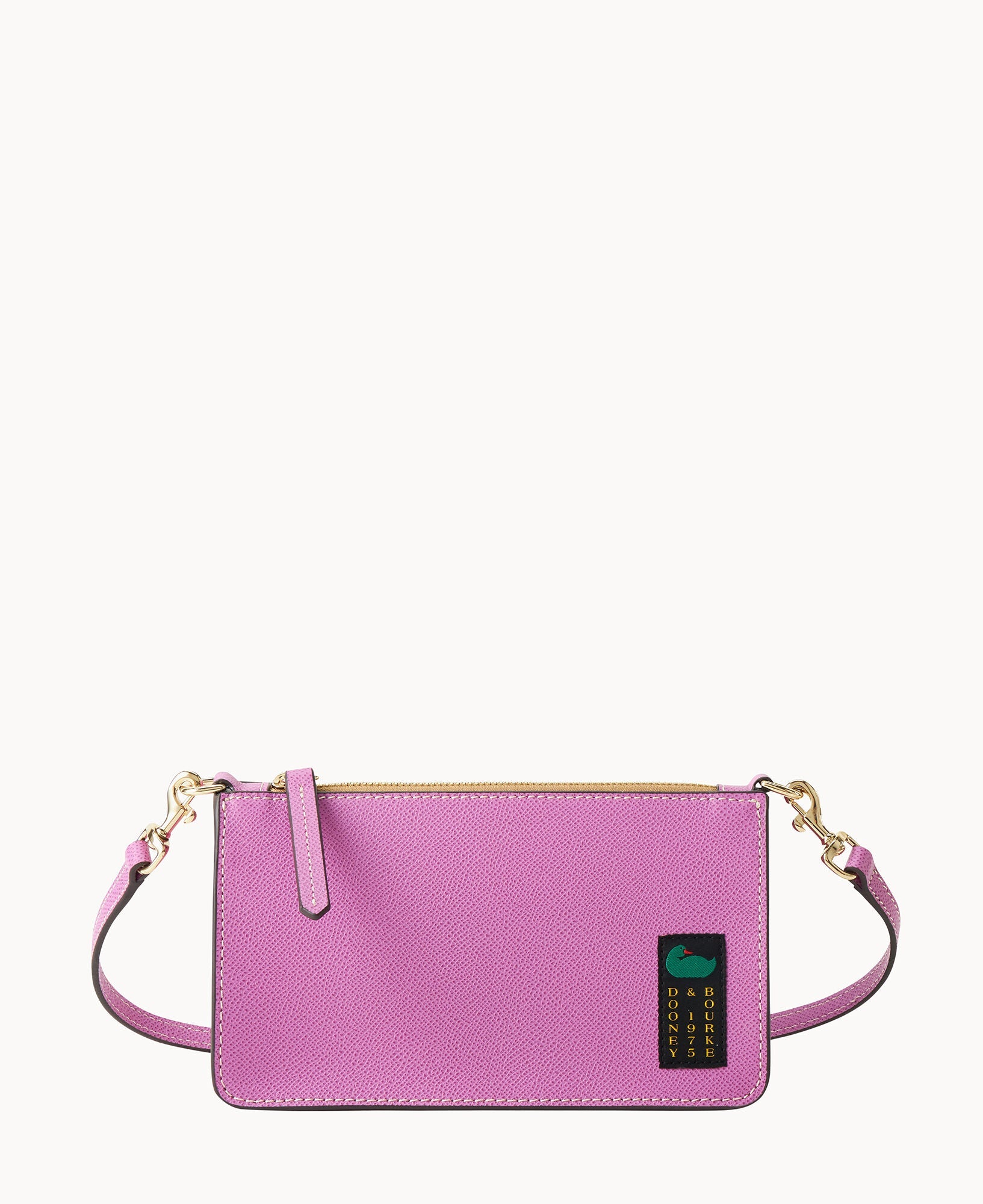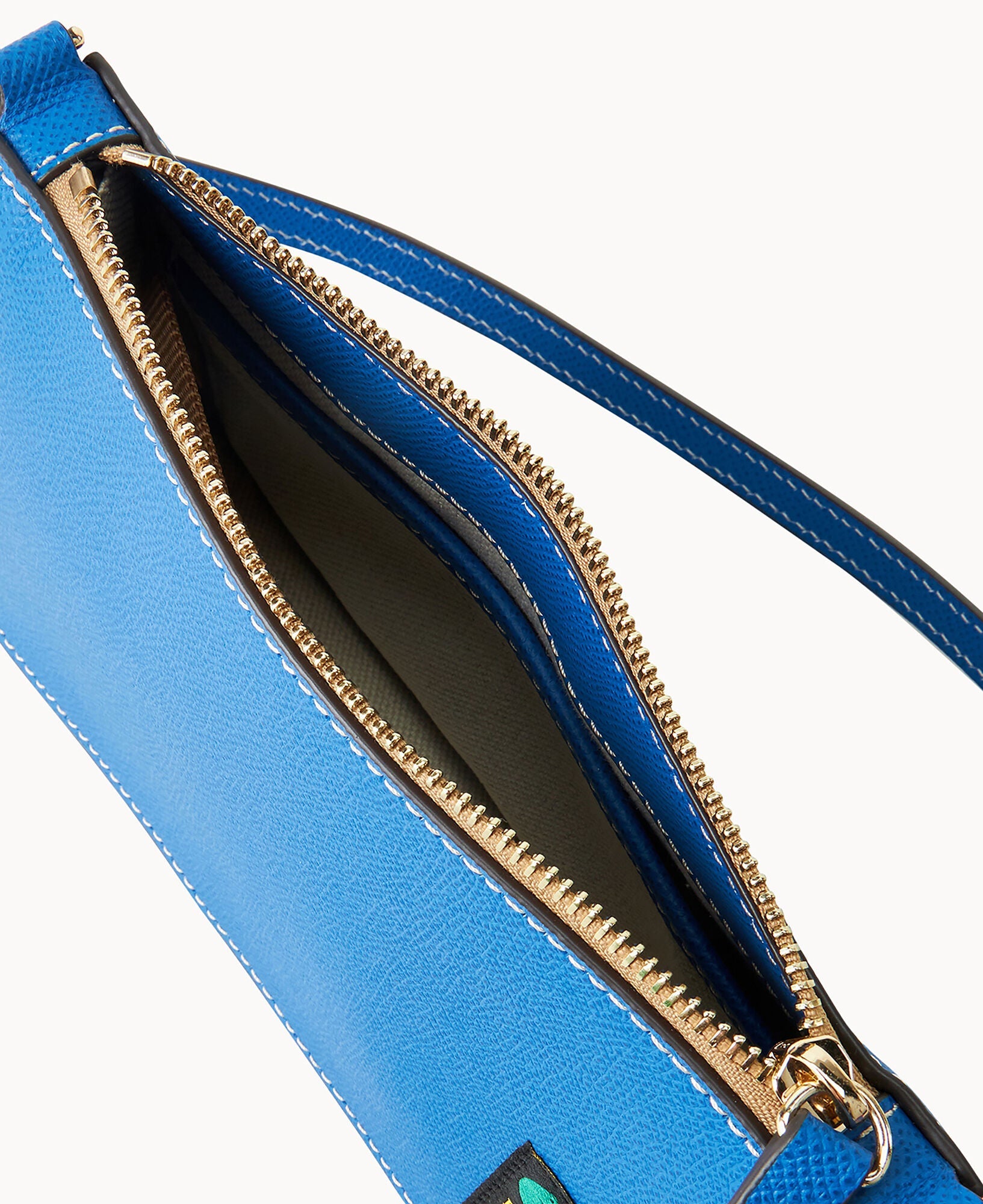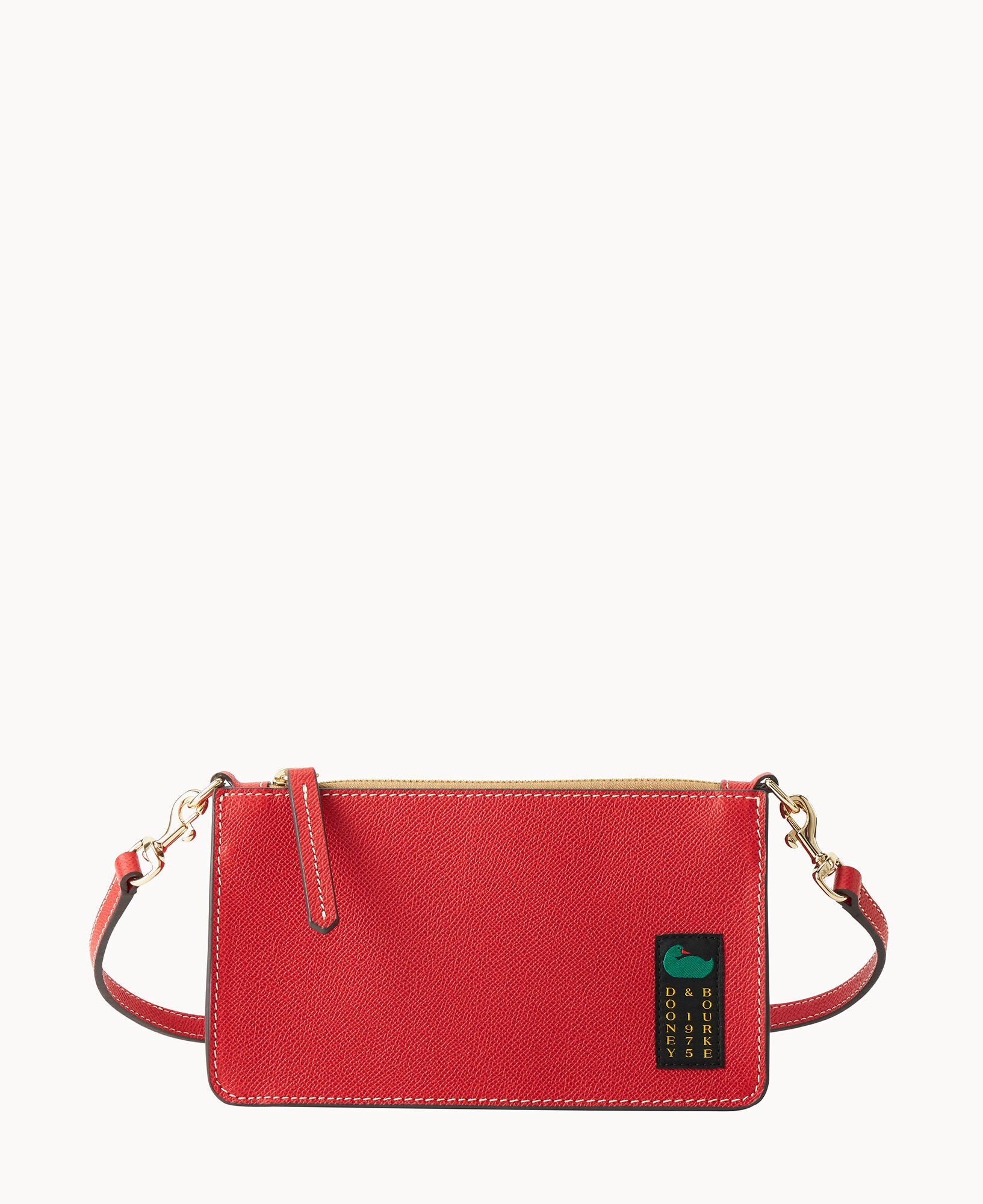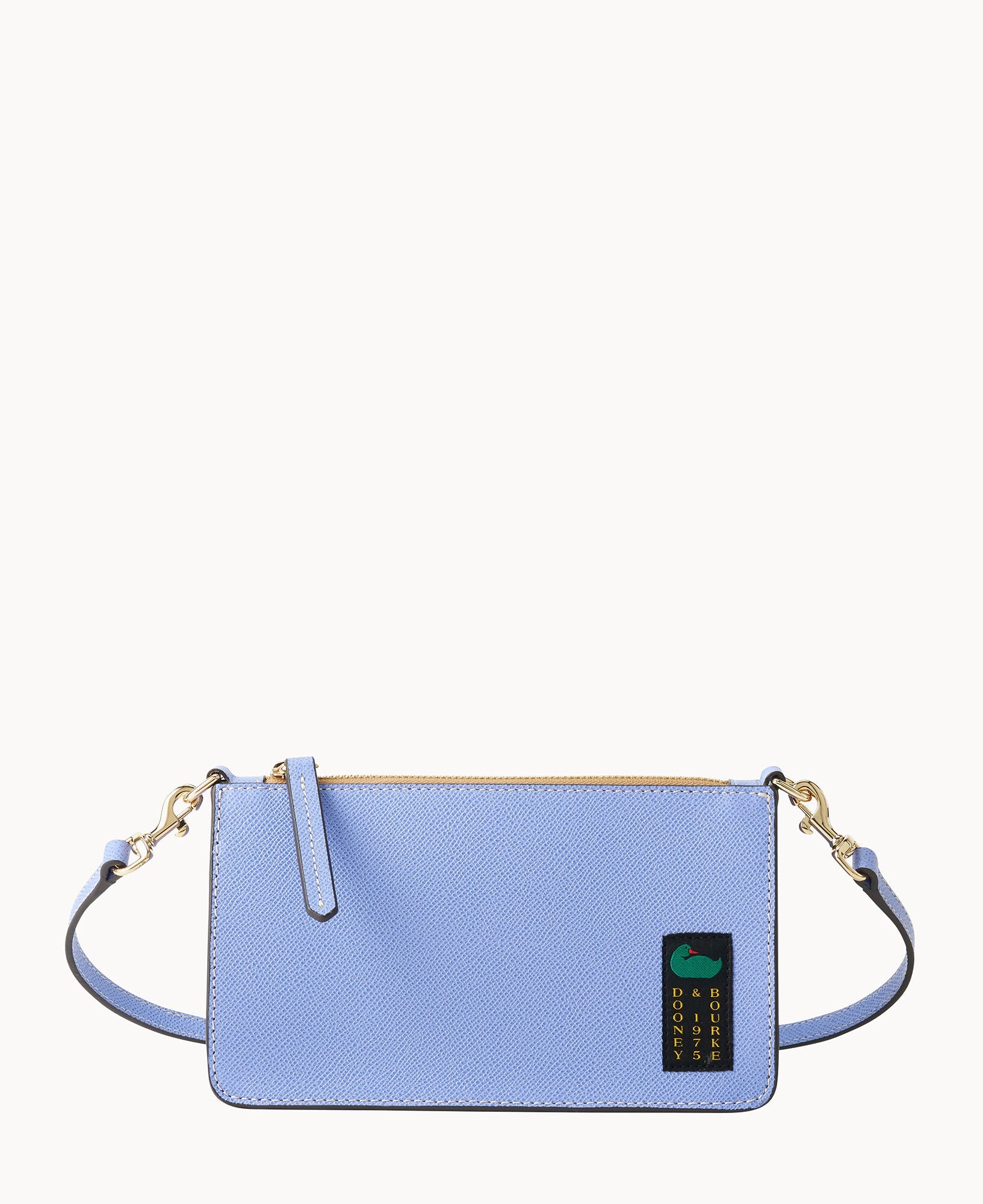 One inside pocket. One inside key hook. Removable strap. Strap drop length 11". Lined. Zipper closure.