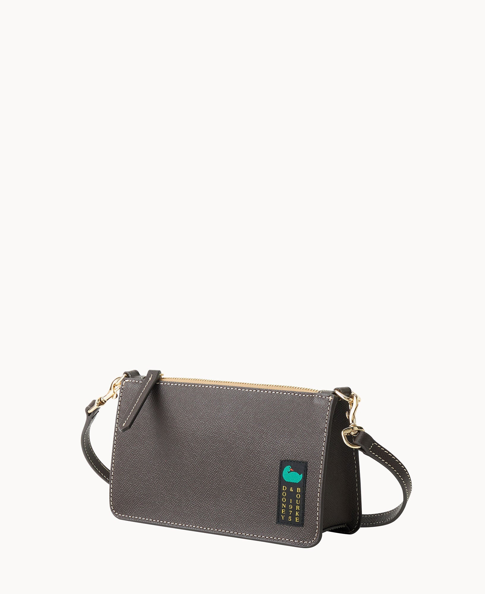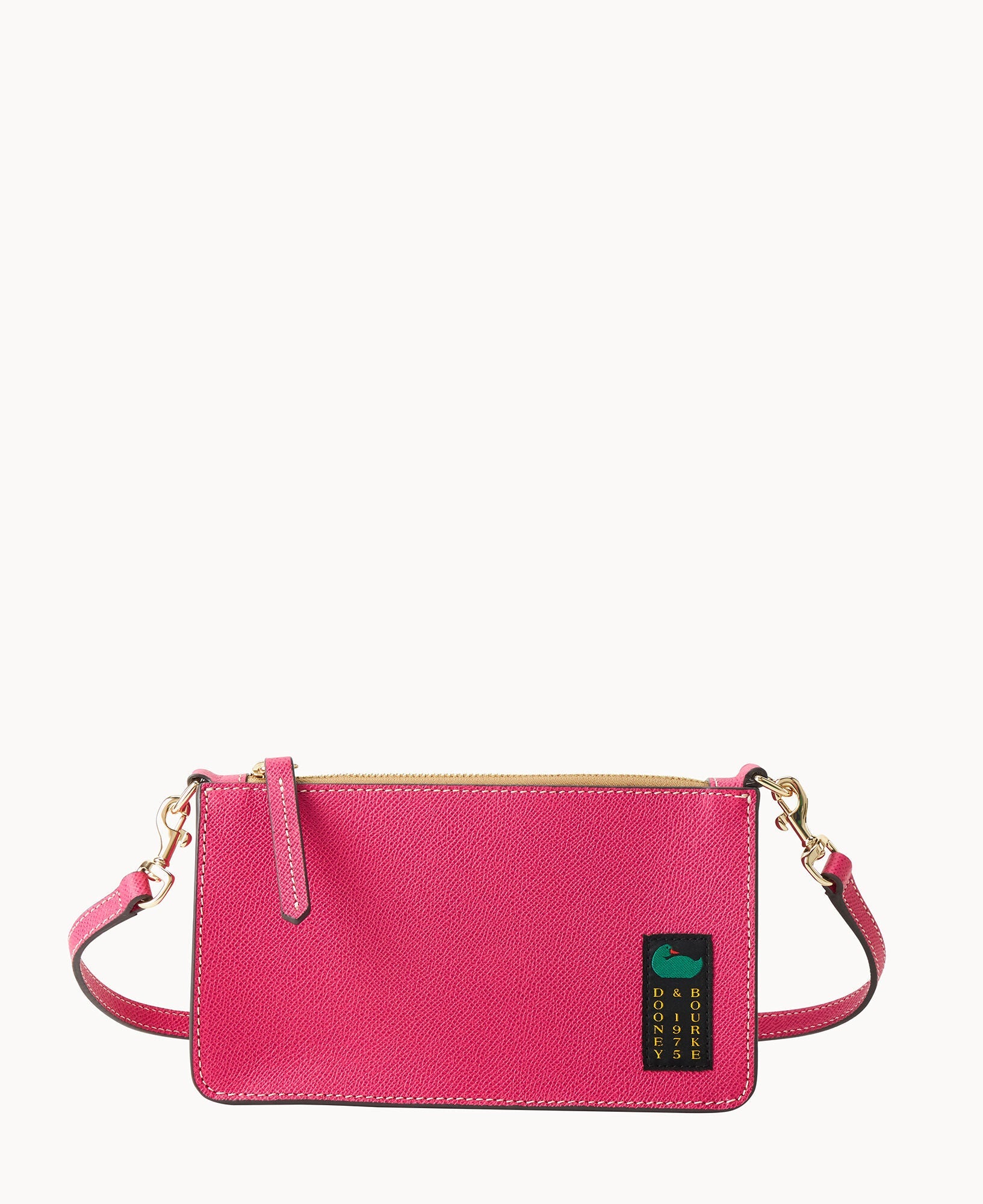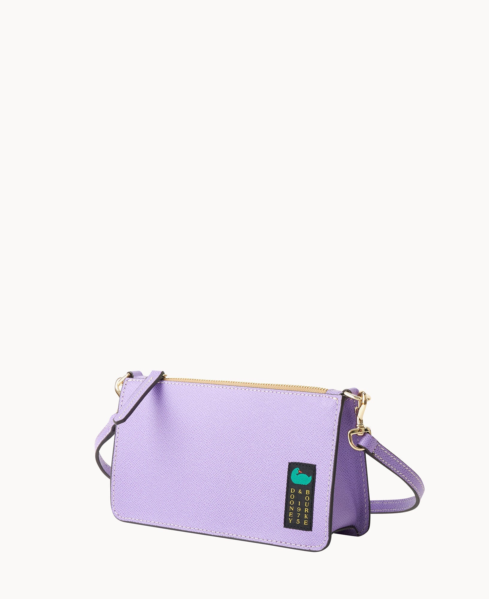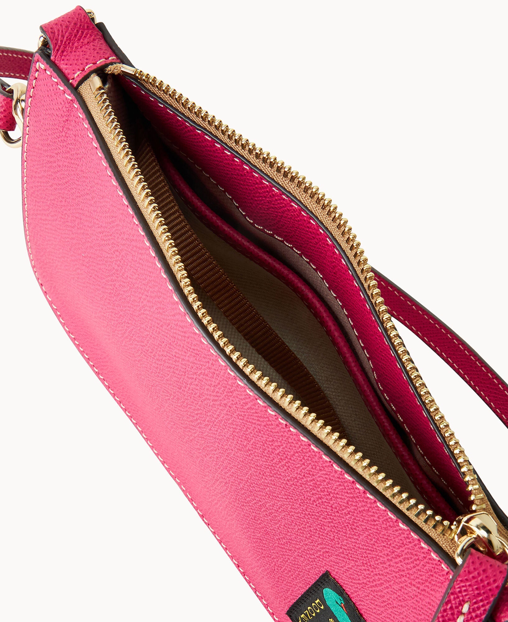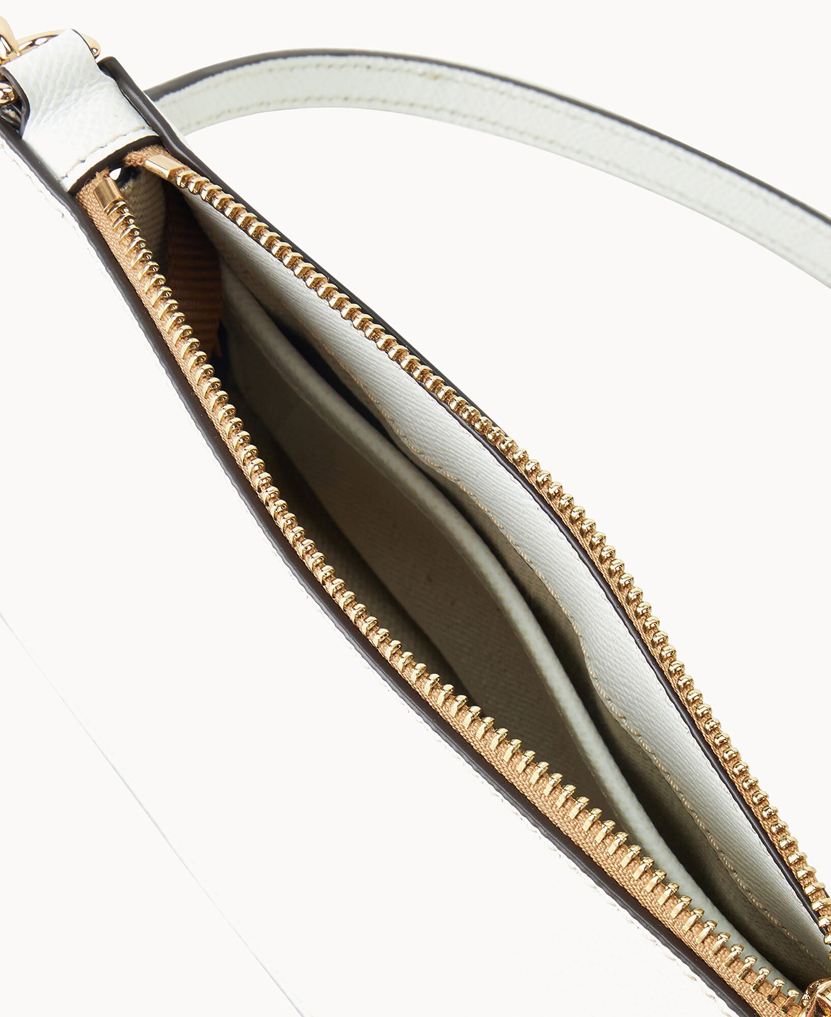 One inside pocket. One inside key hook. Removable strap. Strap drop length 11". Lined. Zipper closure.