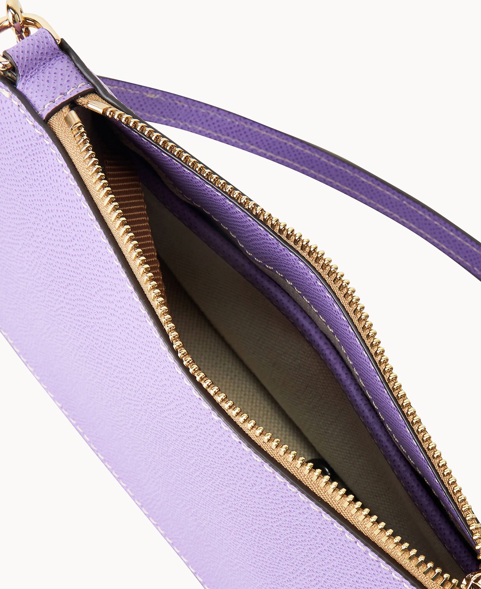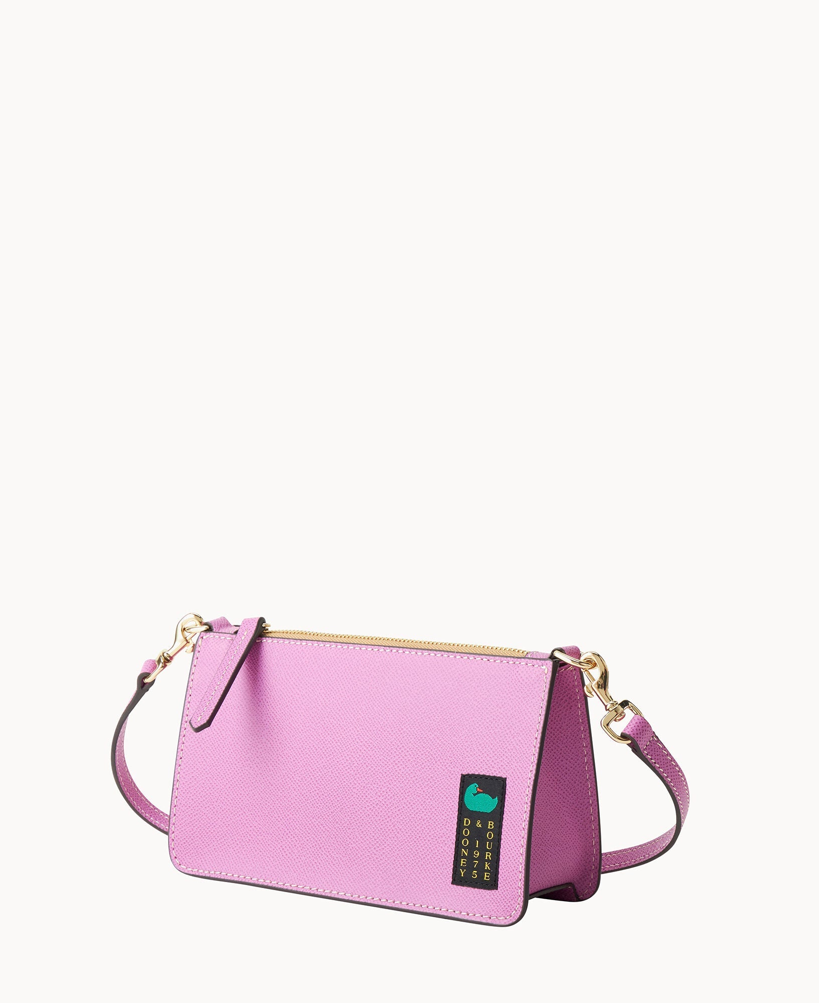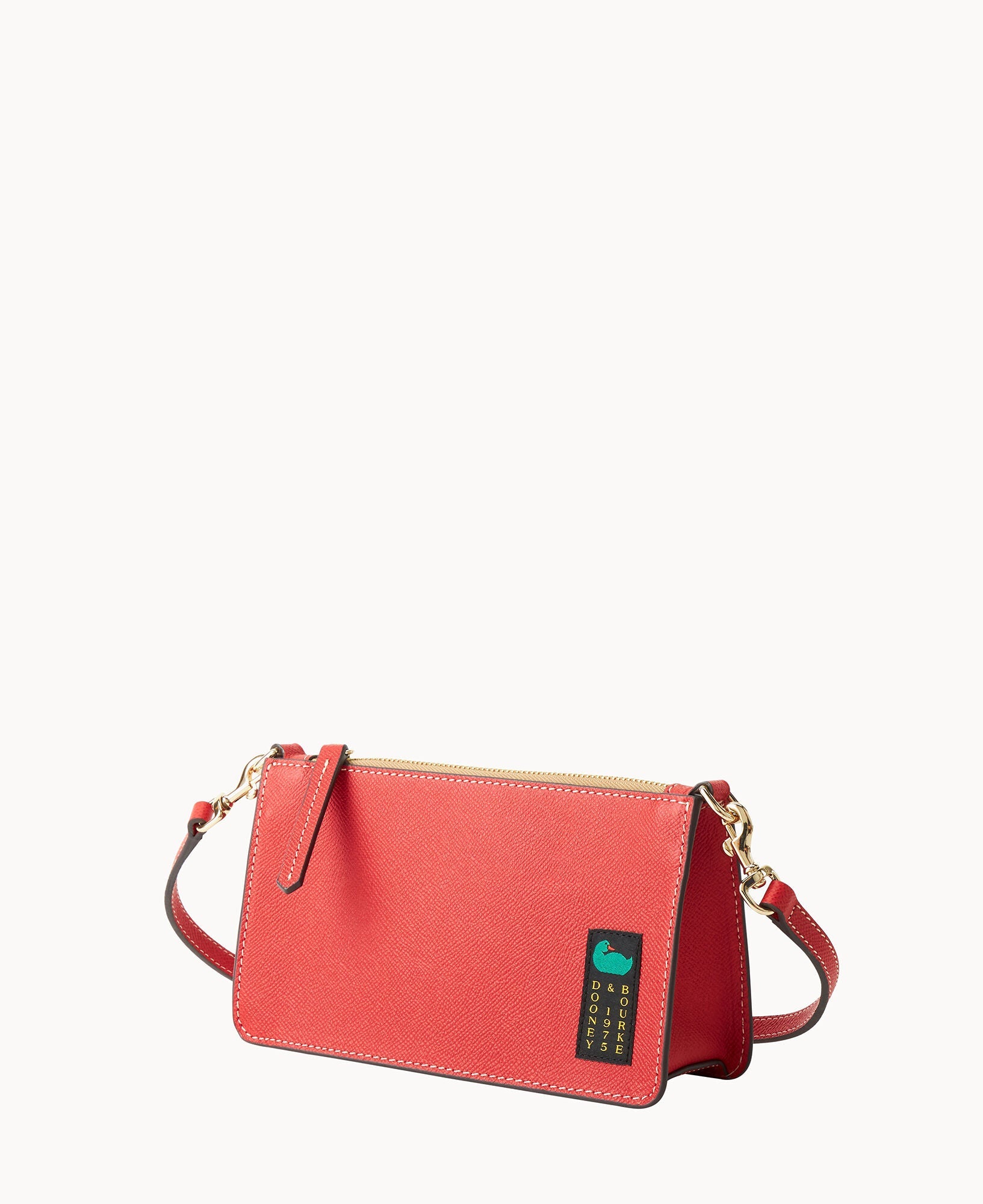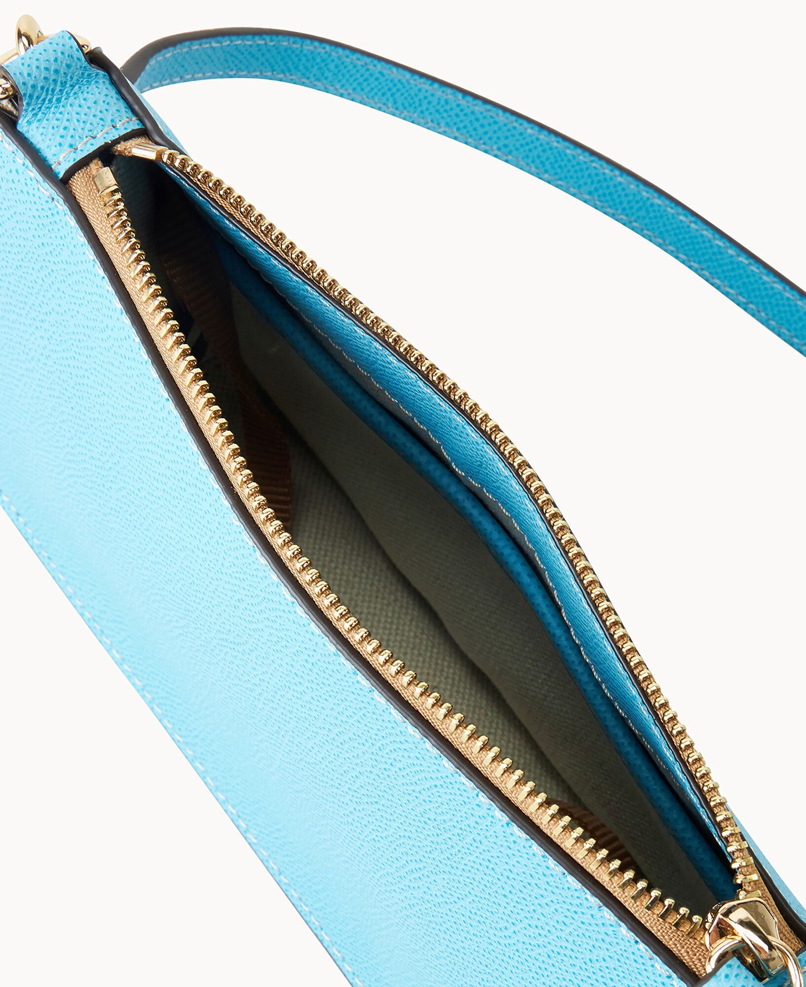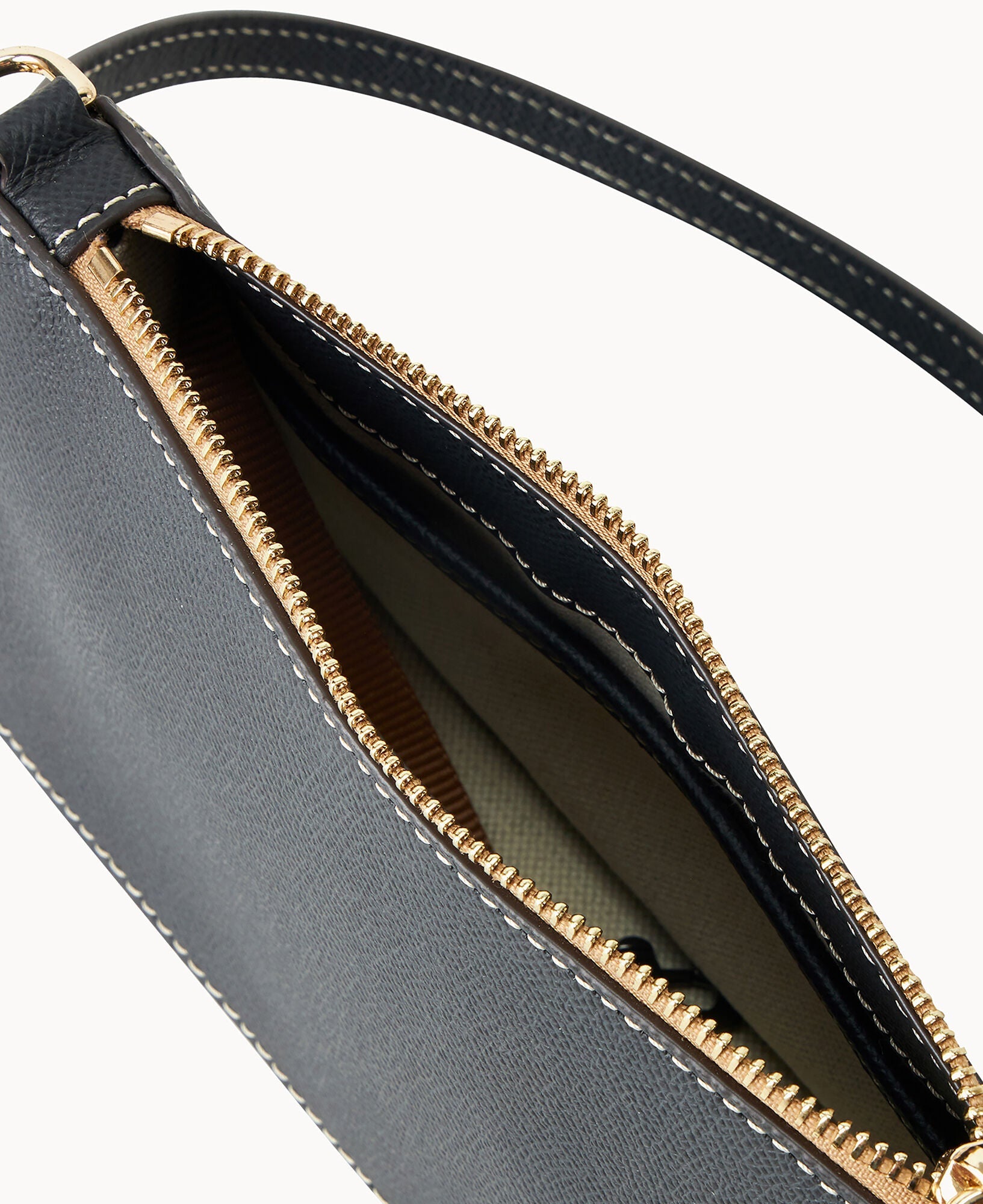 One inside pocket. One inside key hook. Removable strap. Strap drop length 11". Lined. Zipper closure.