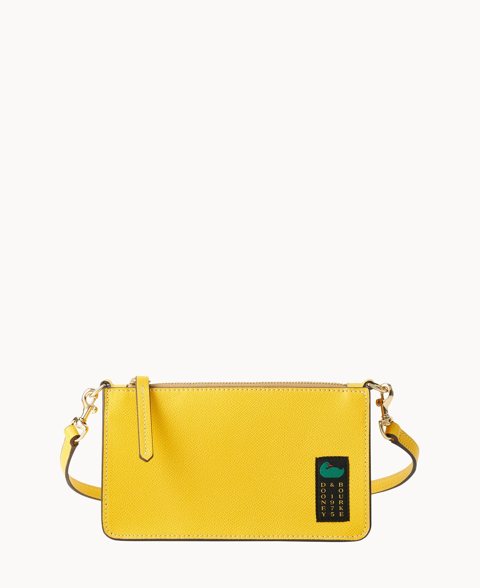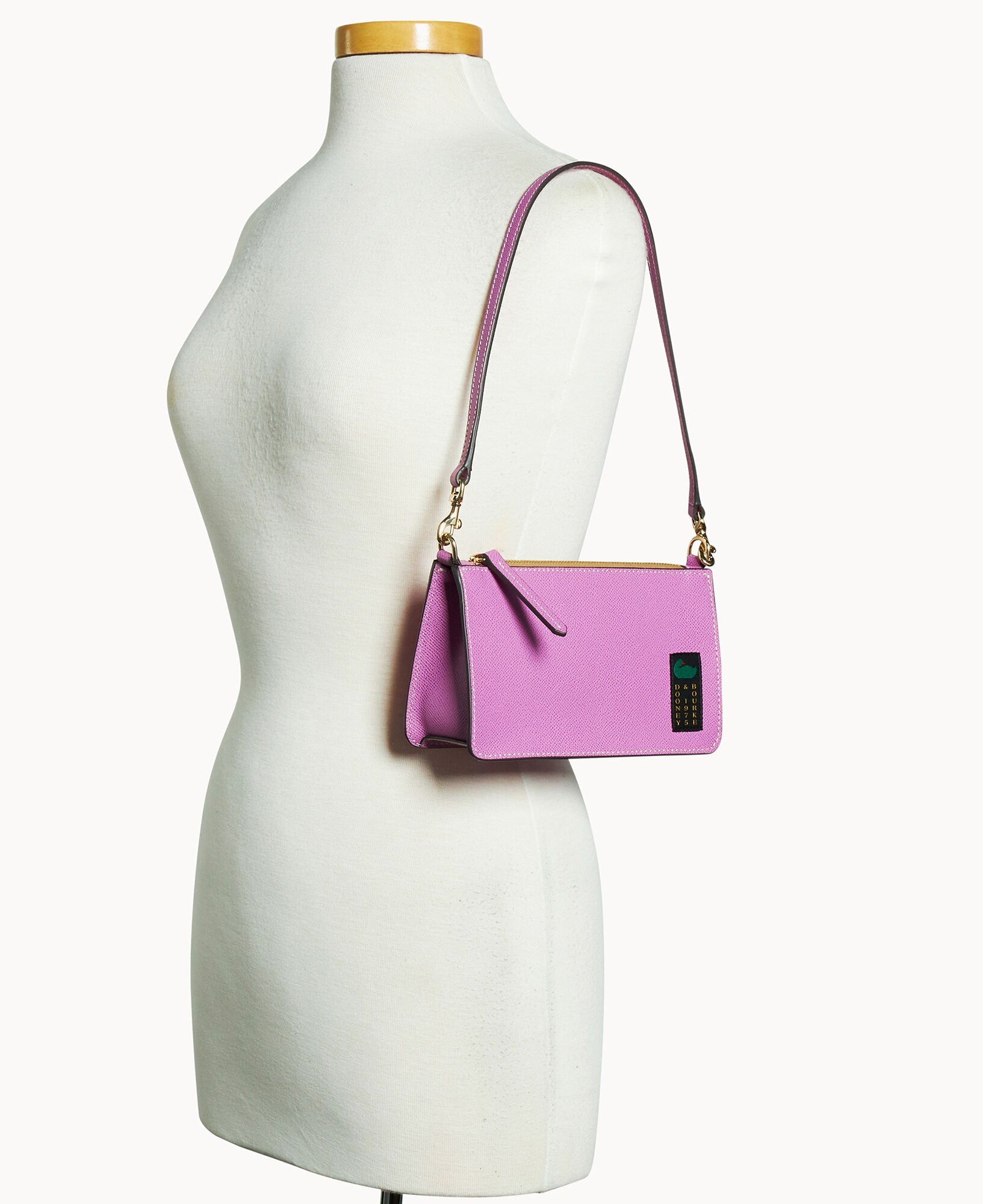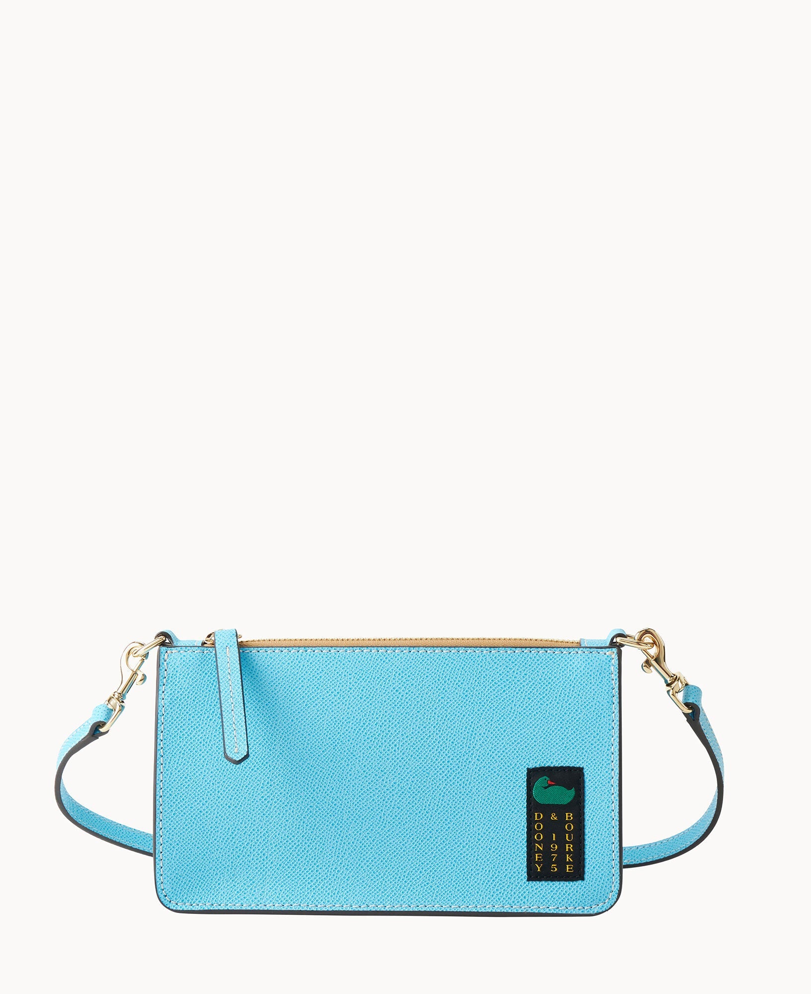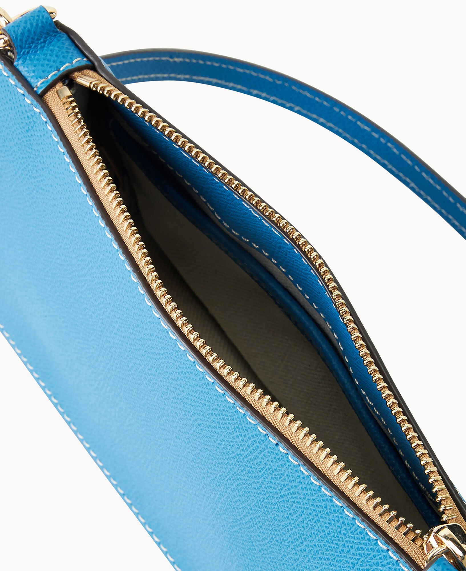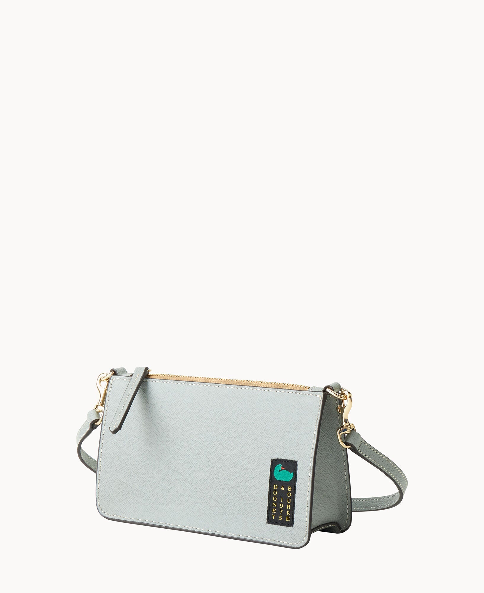 One inside pocket. One inside key hook. Removable strap. Strap drop length 11". Lined. Zipper closure.