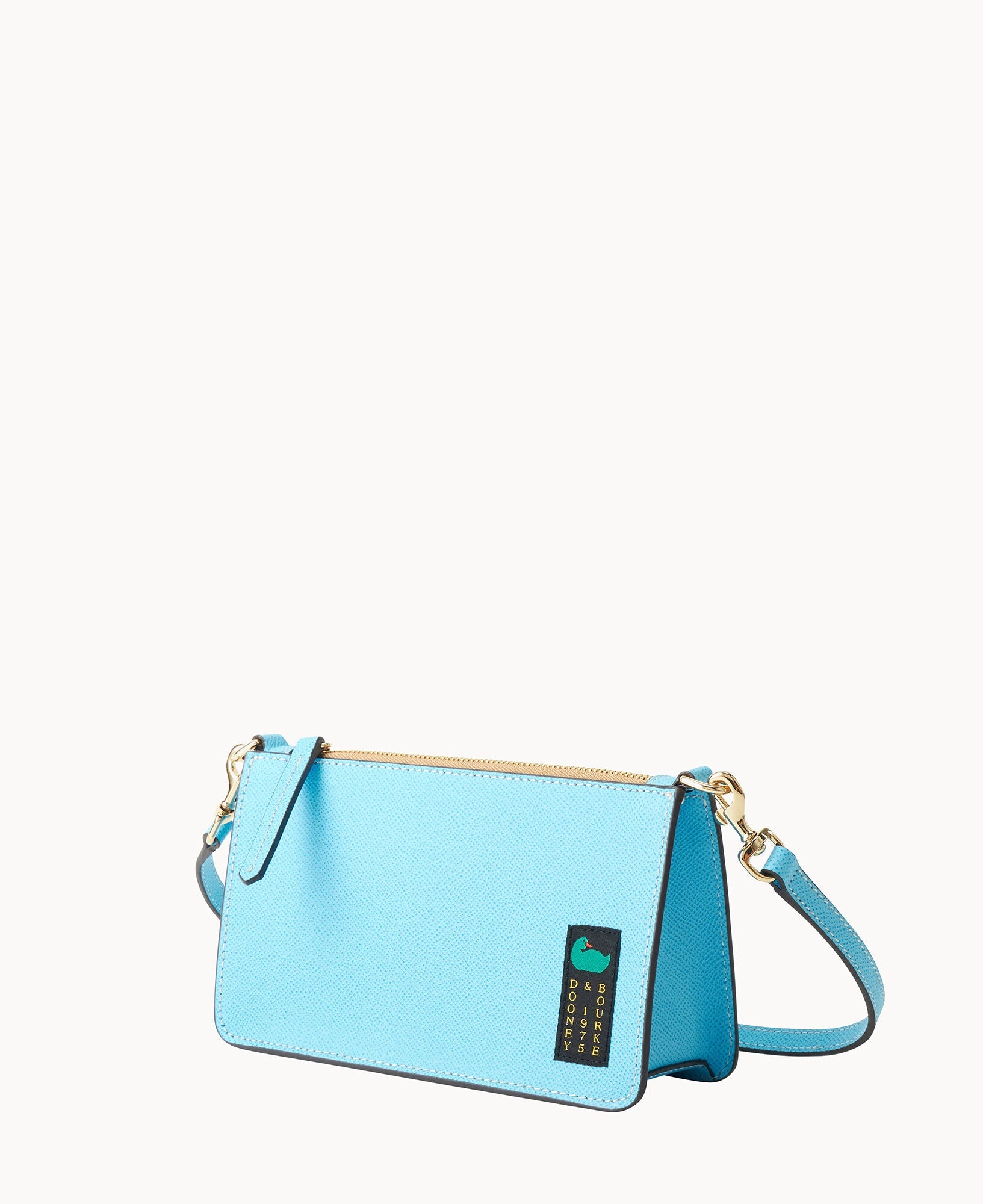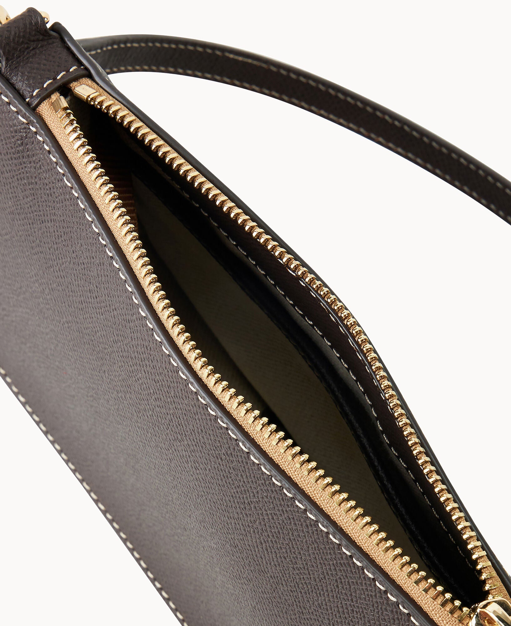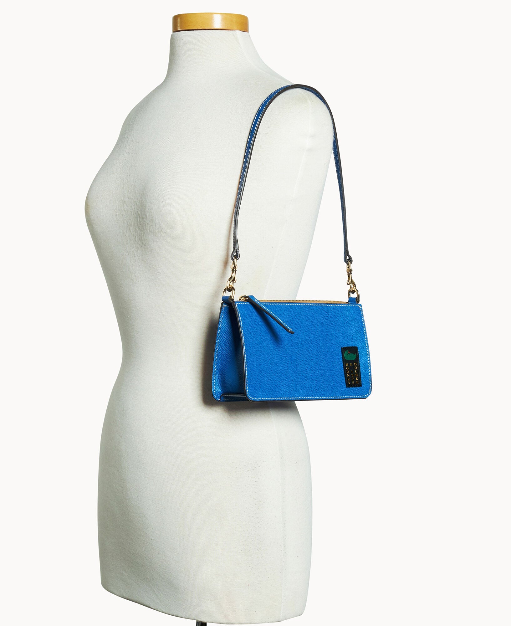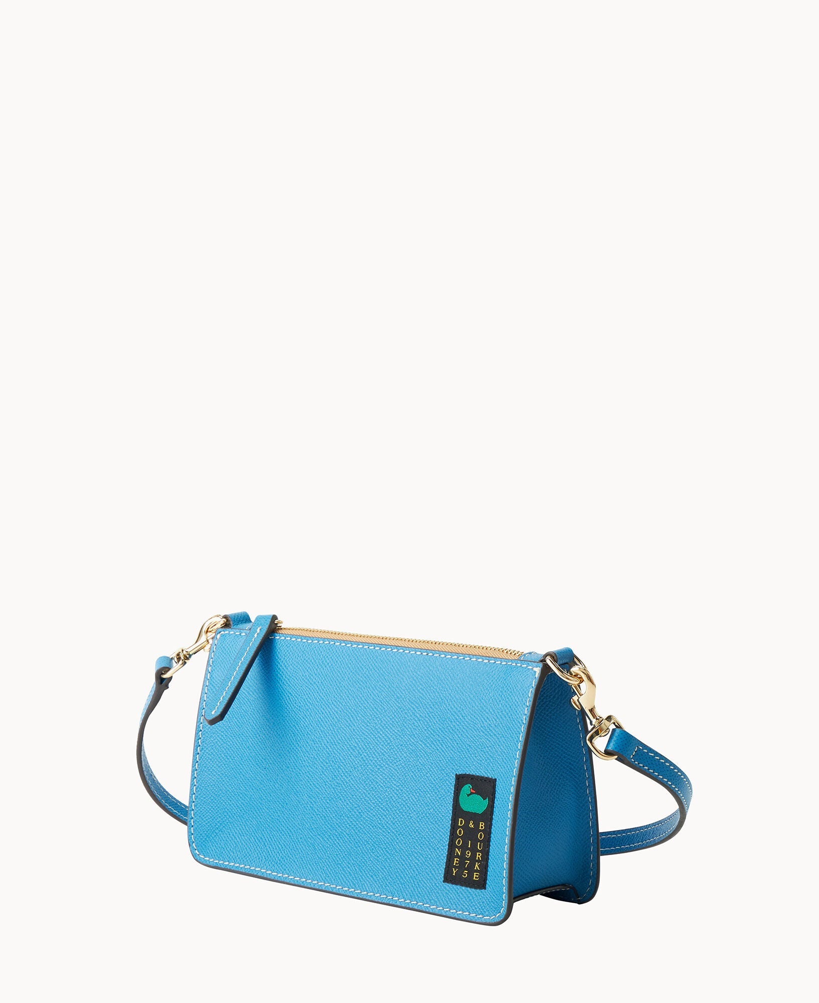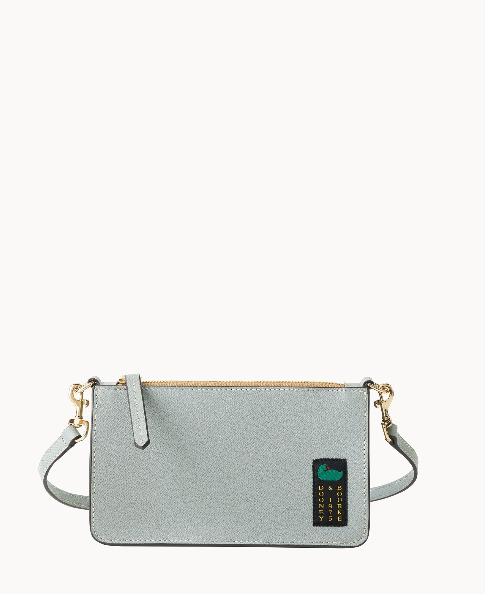 One inside pocket. One inside key hook. Removable strap. Strap drop length 11". Lined. Zipper closure.
