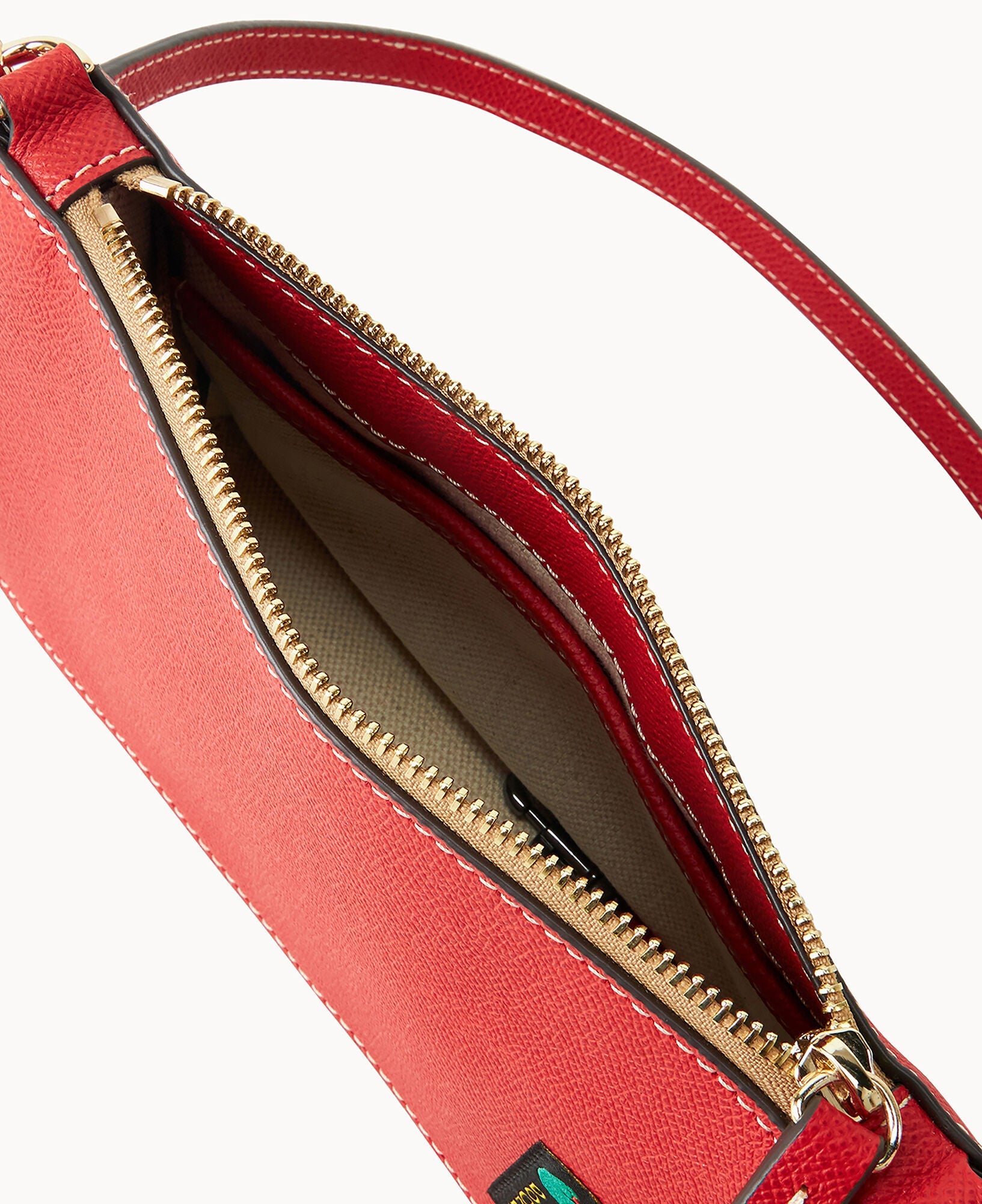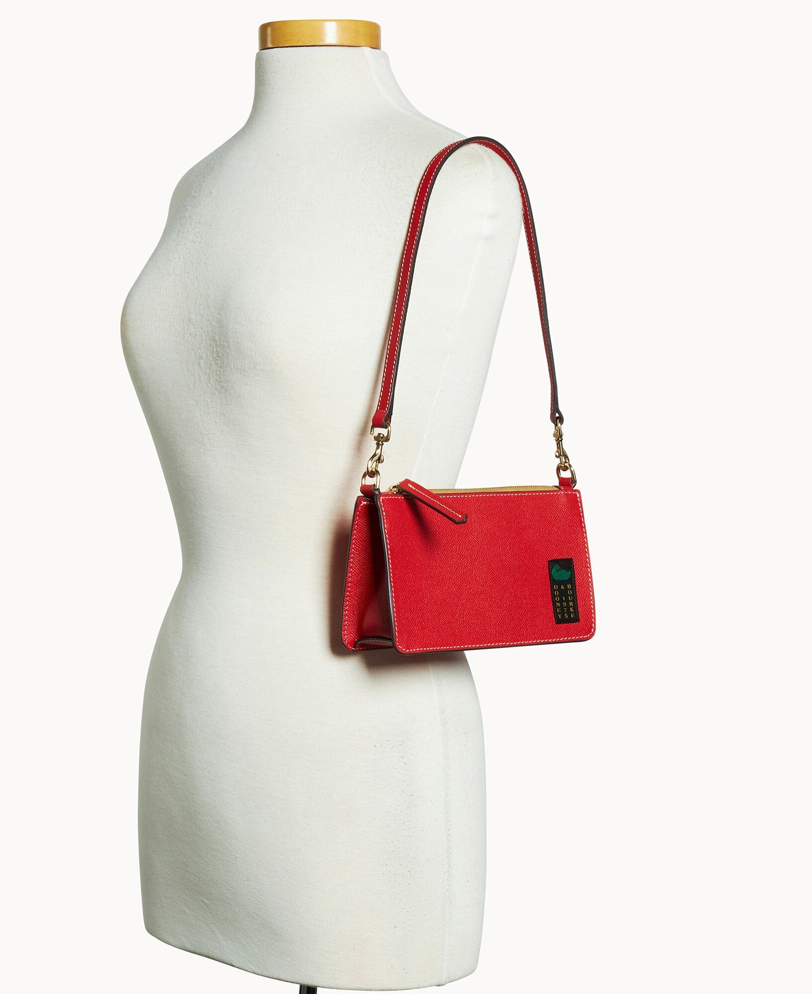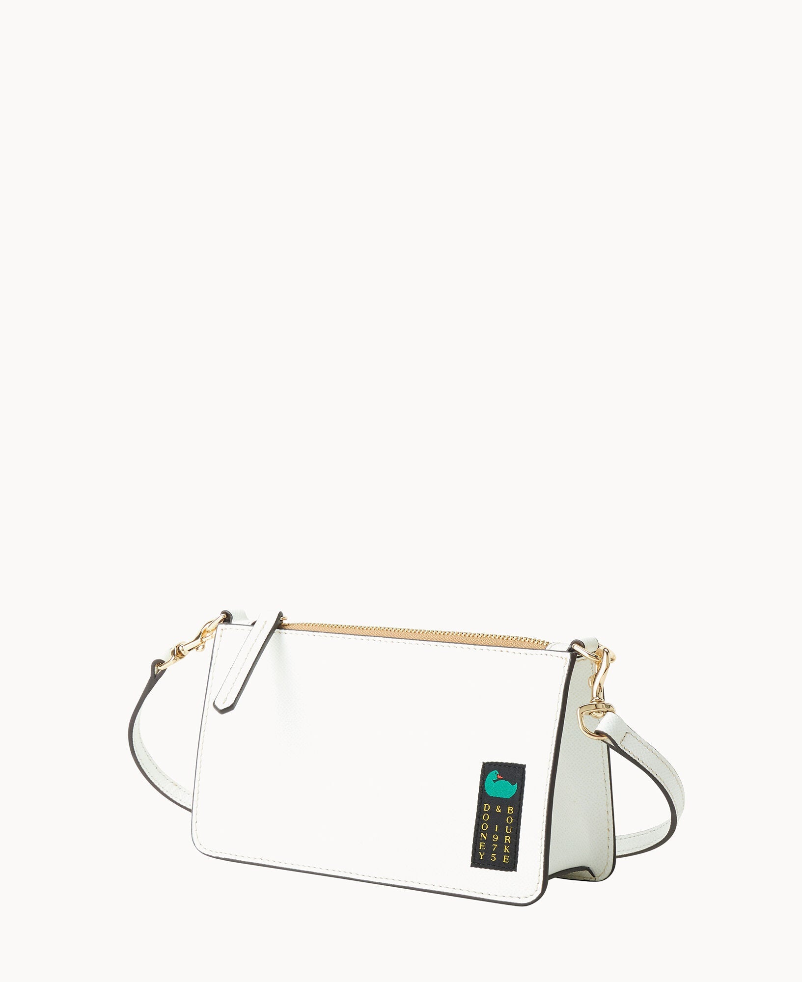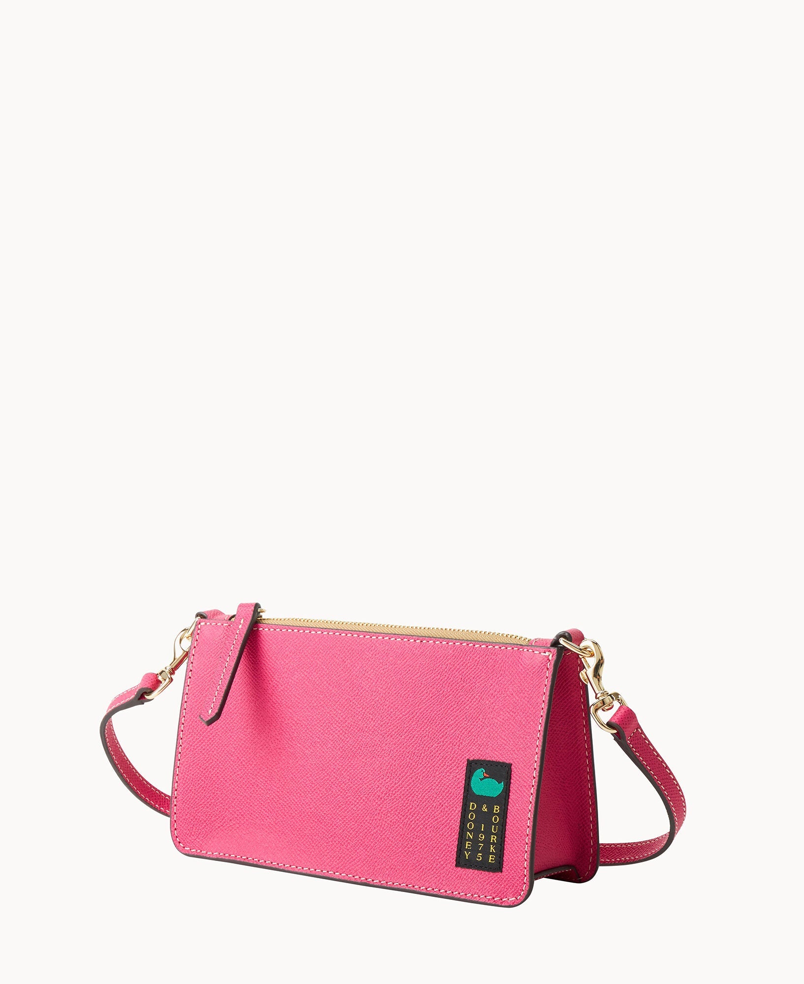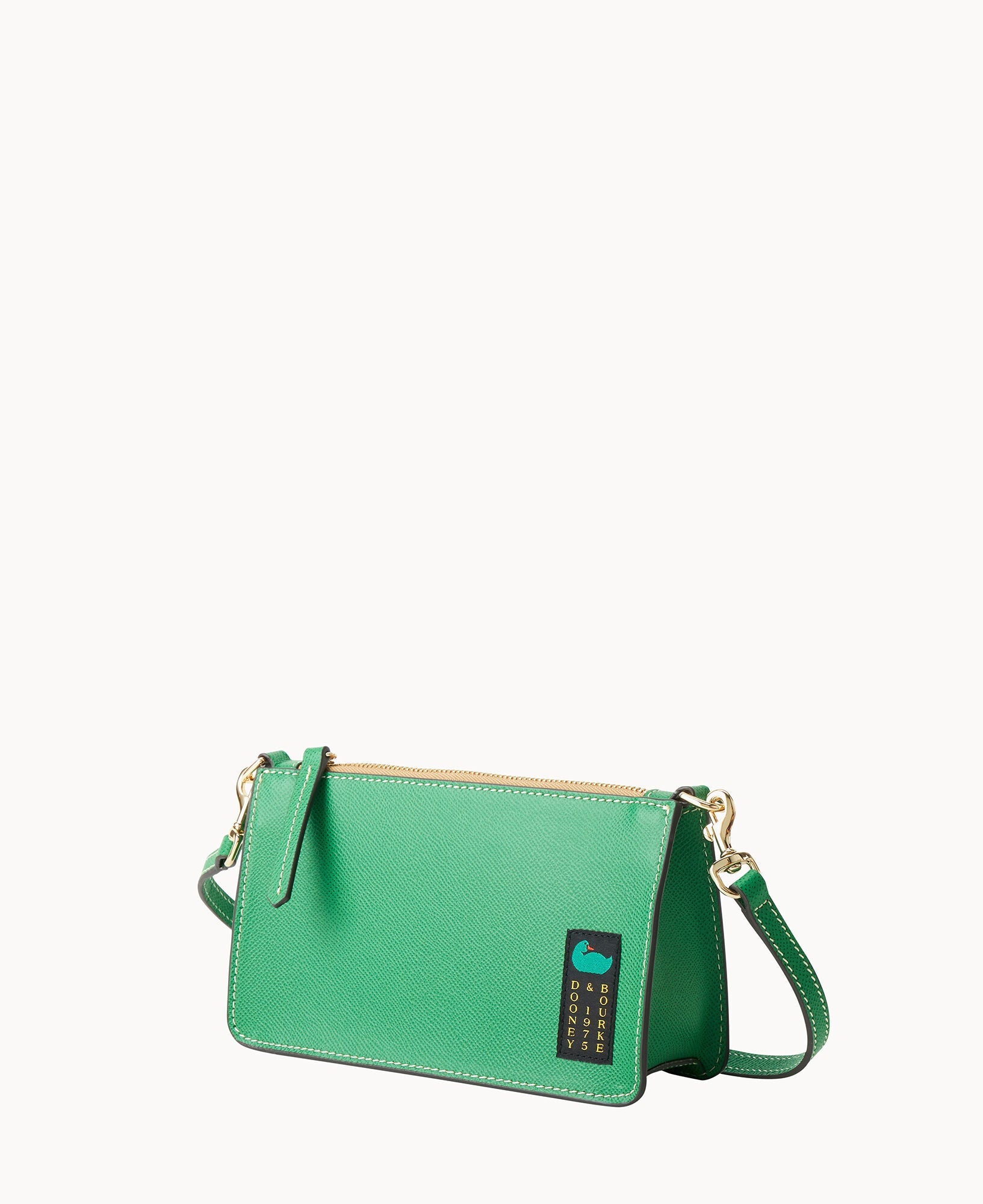 One inside pocket. One inside key hook. Removable strap. Strap drop length 11". Lined. Zipper closure.