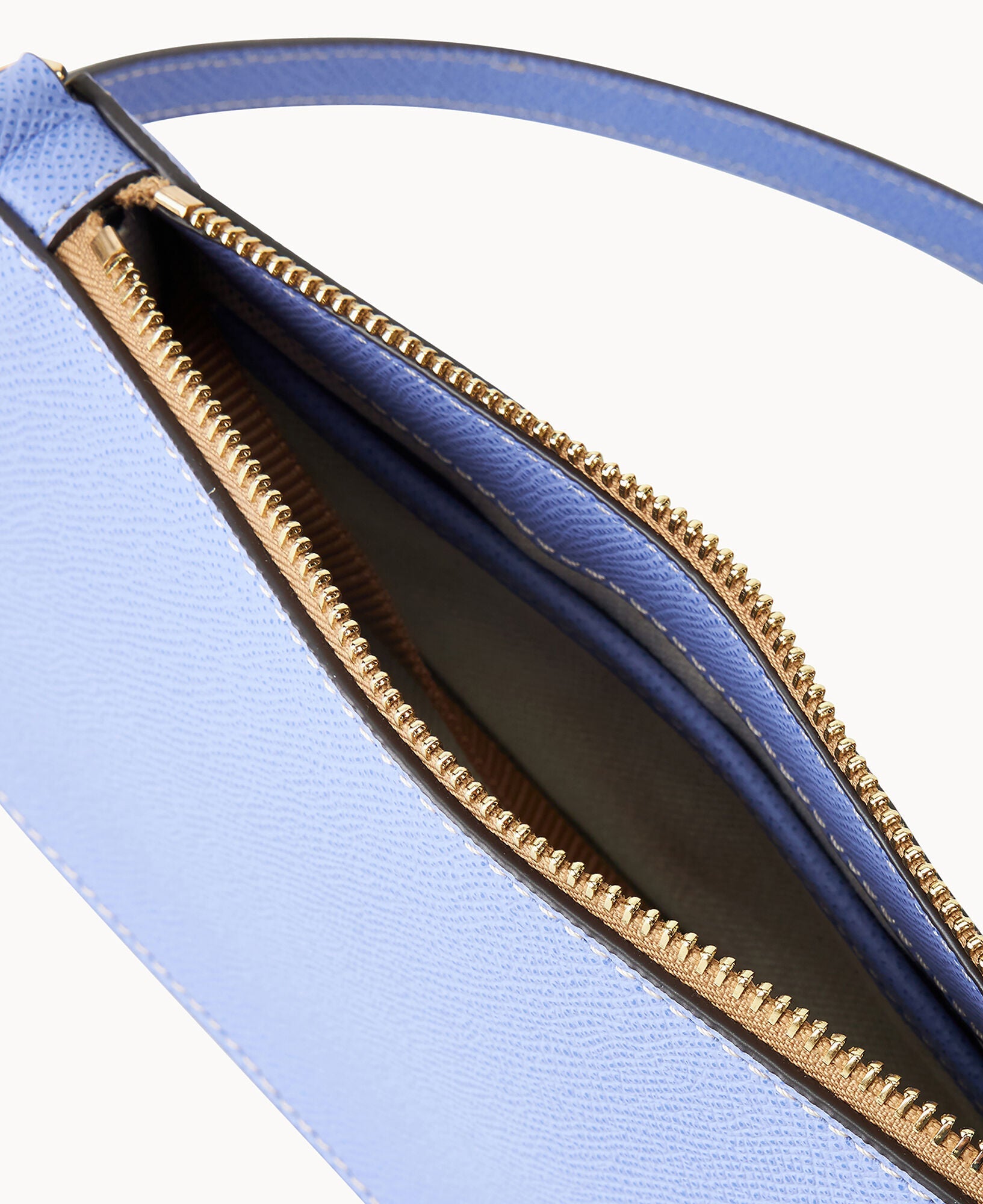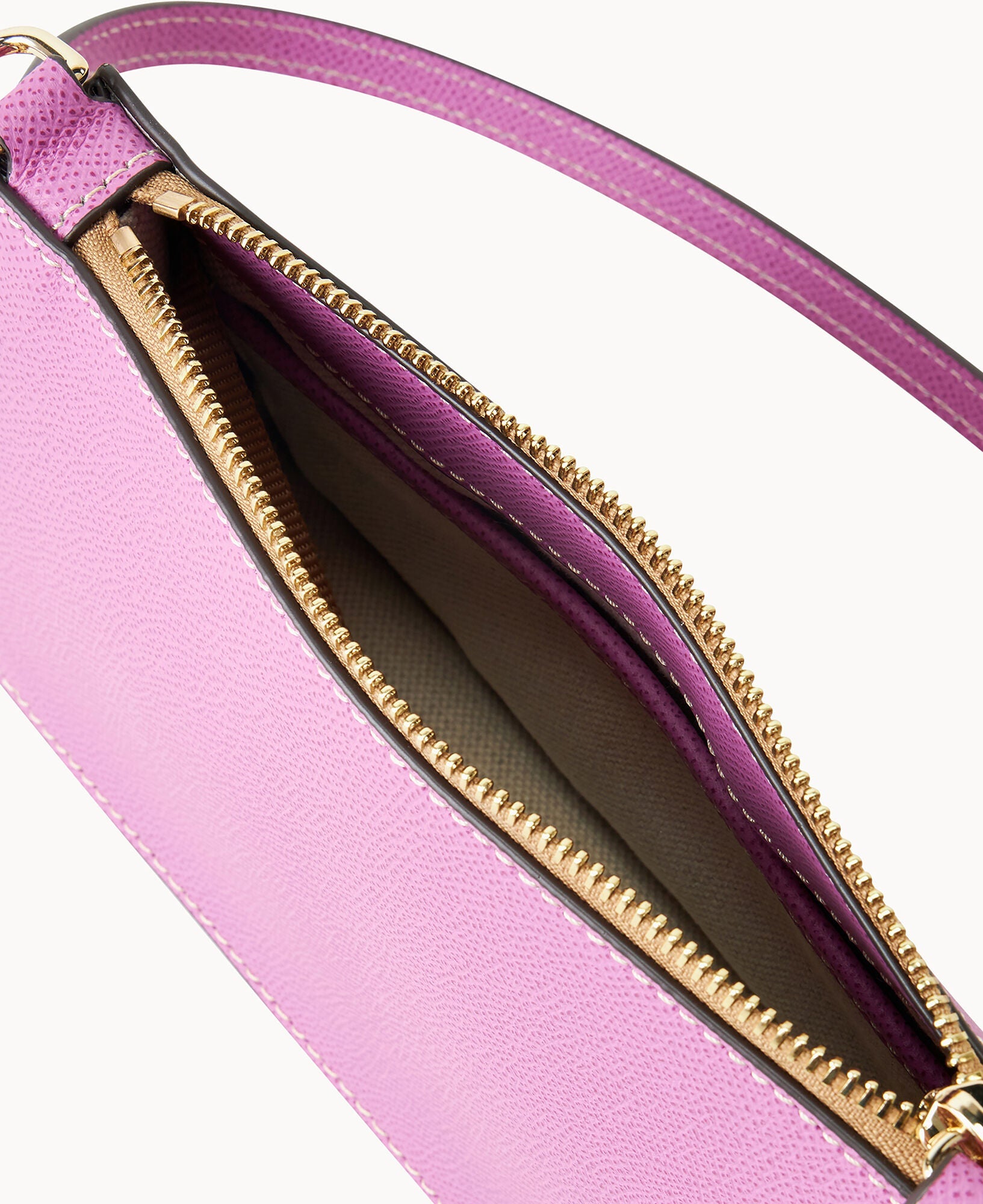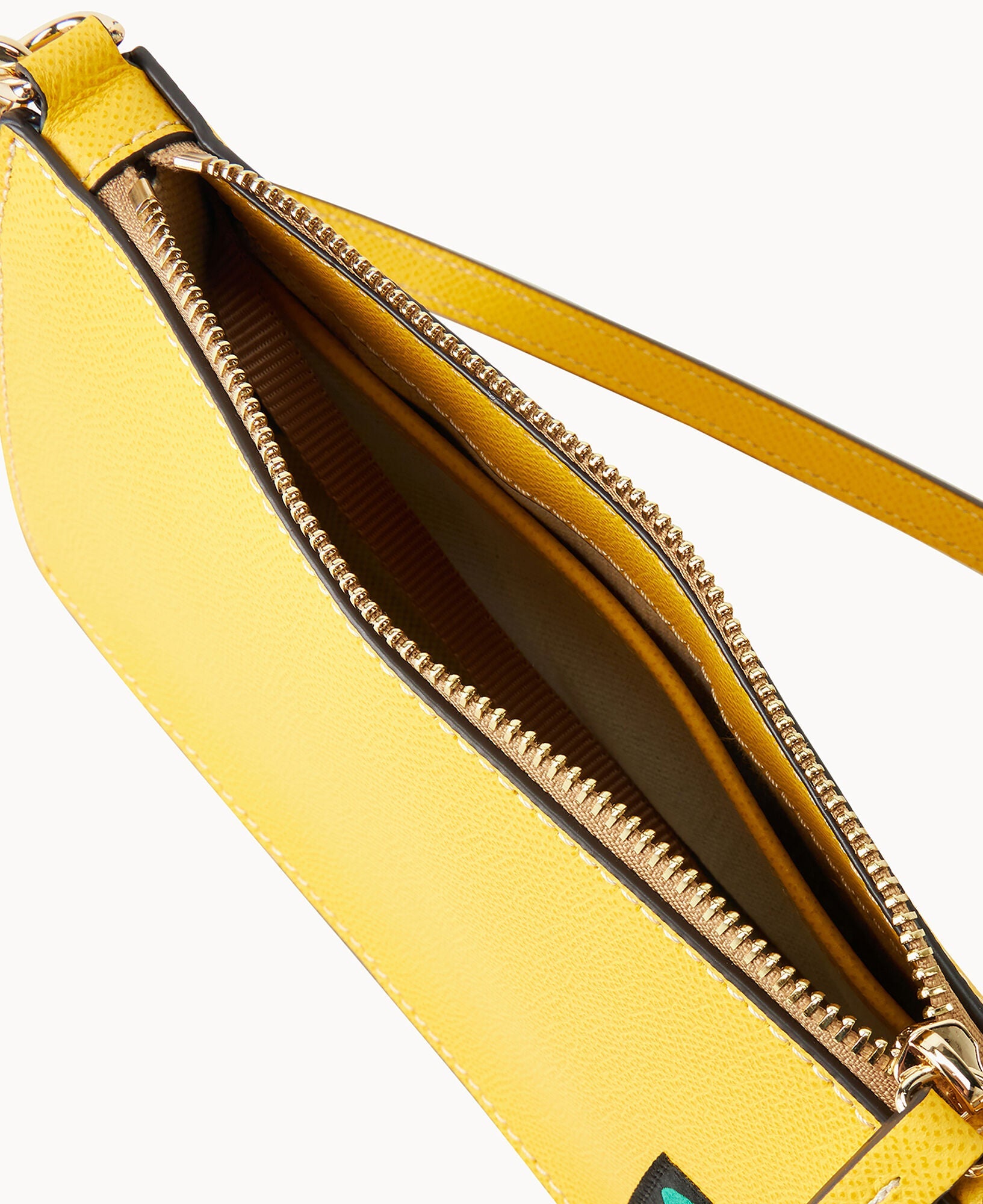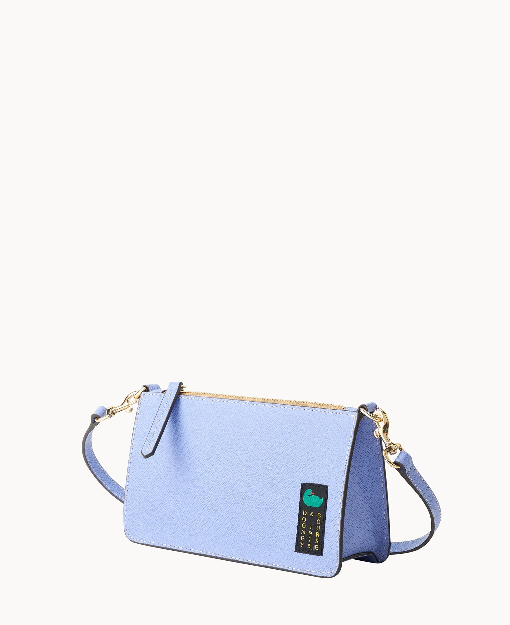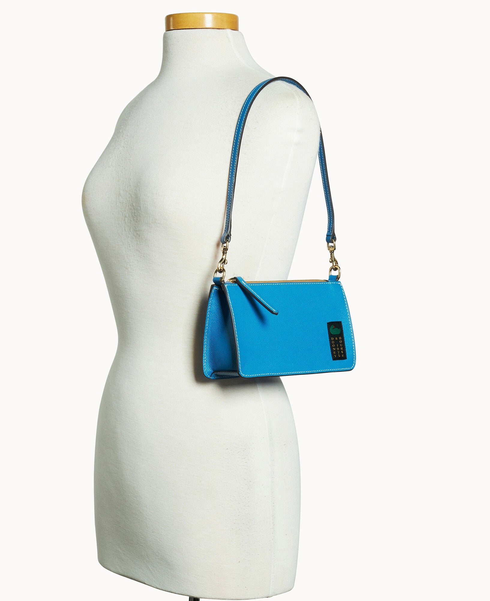 One inside pocket. One inside key hook. Removable strap. Strap drop length 11". Lined. Zipper closure.