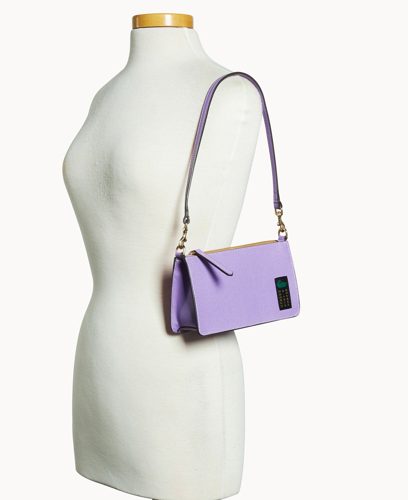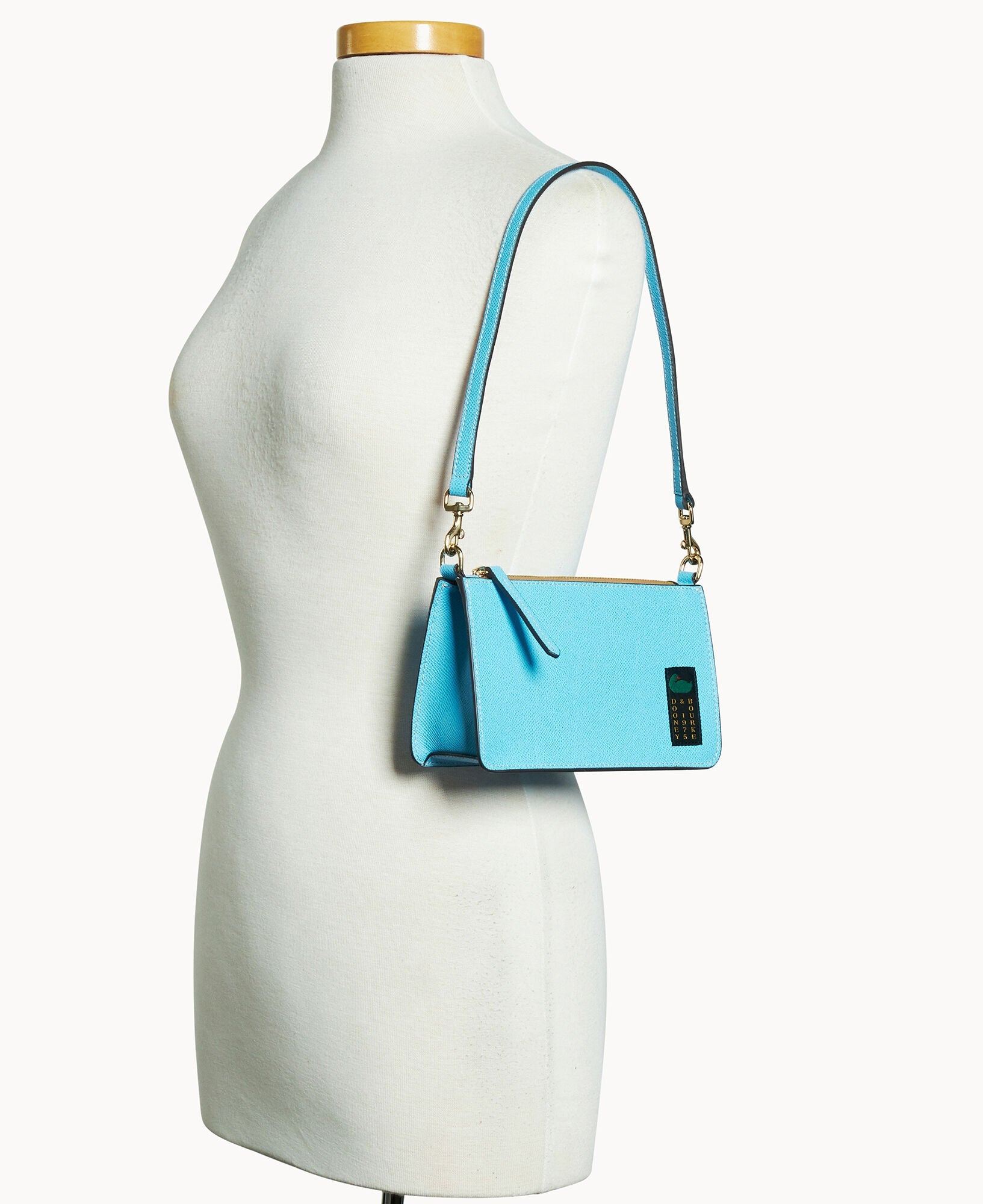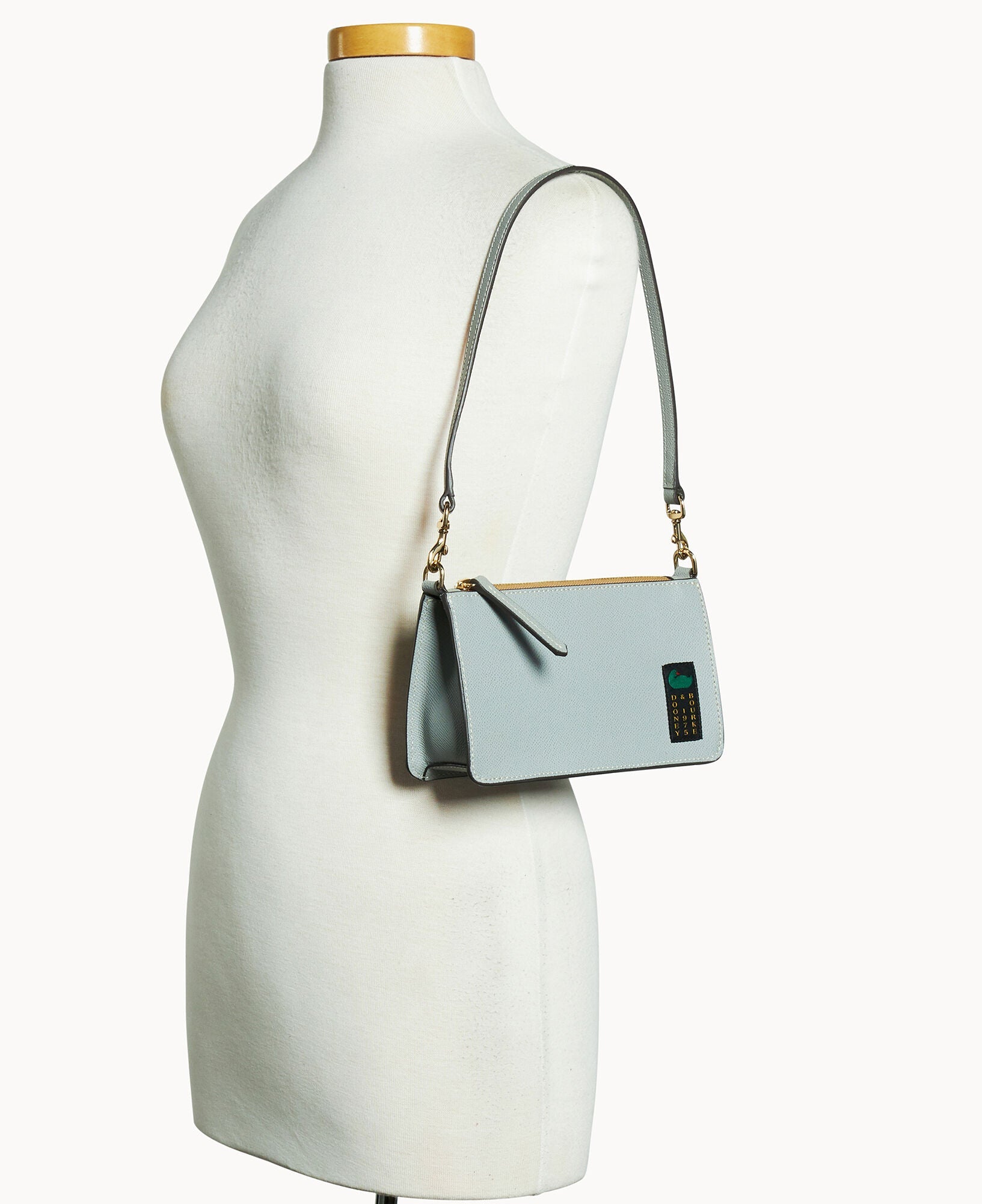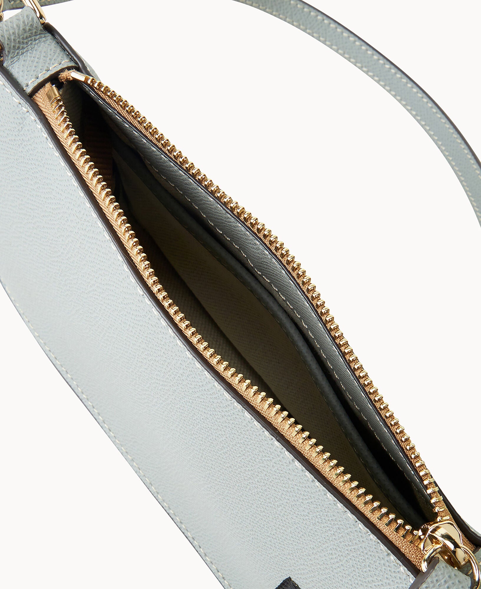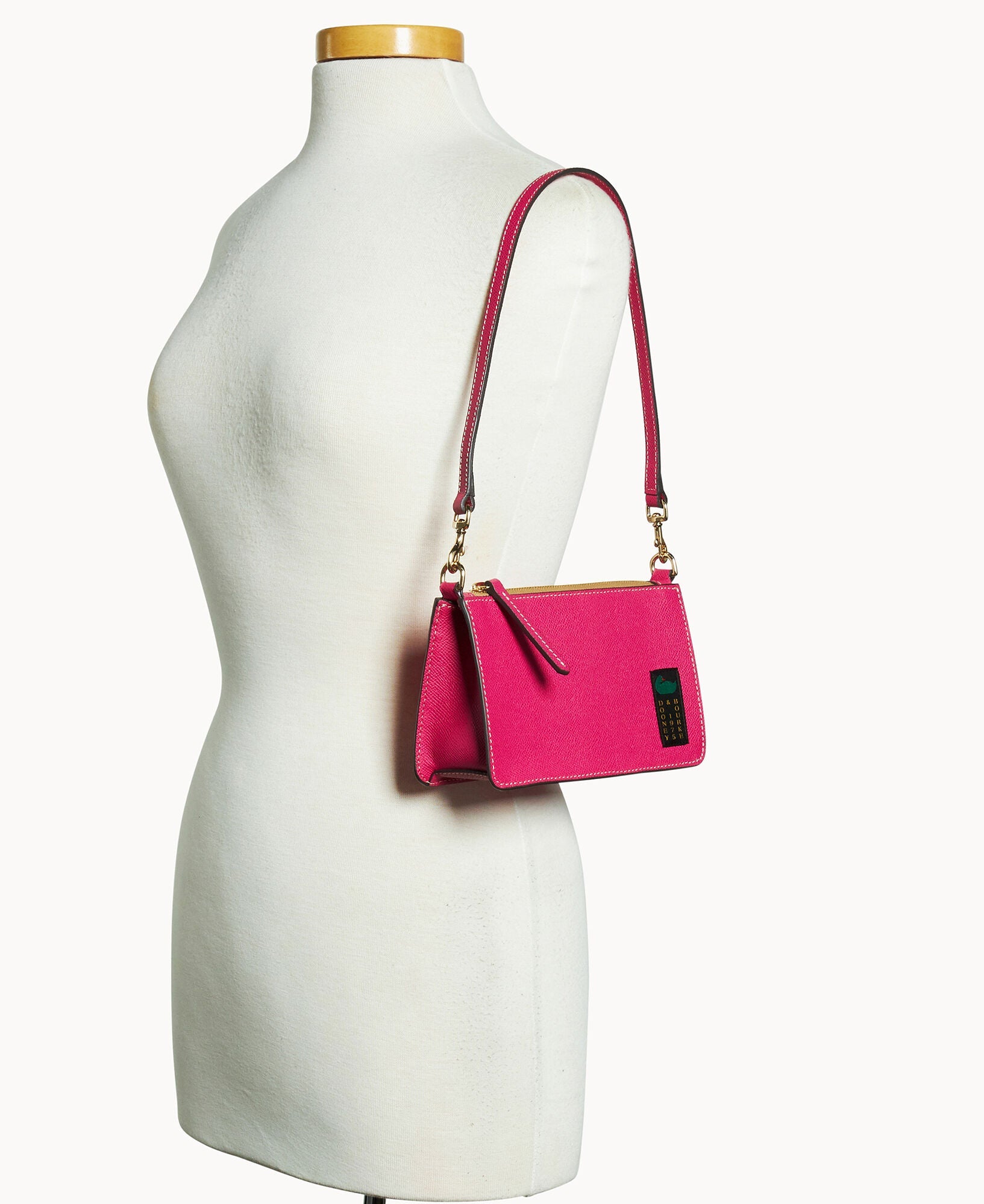 One inside pocket. One inside key hook. Removable strap. Strap drop length 11". Lined. Zipper closure.