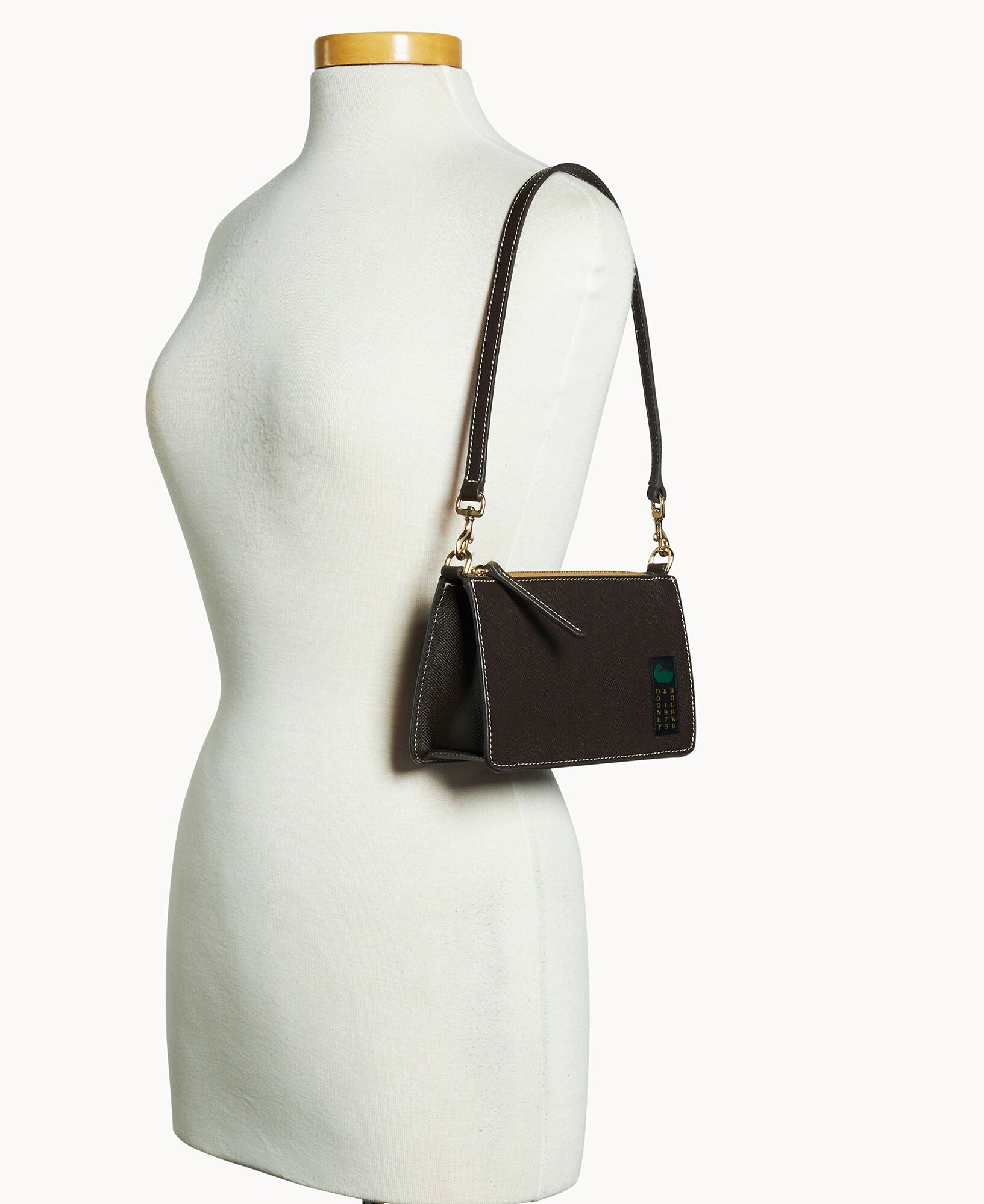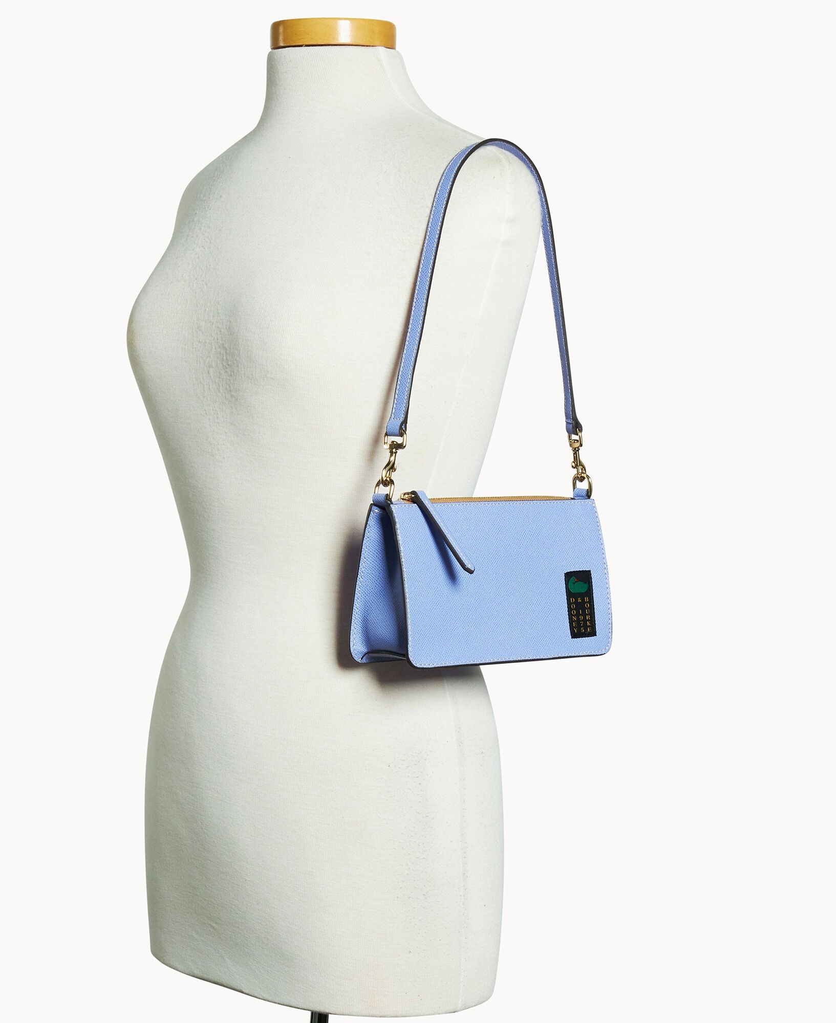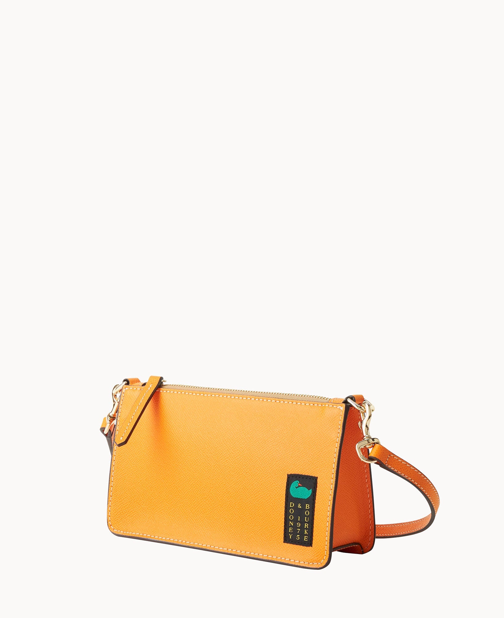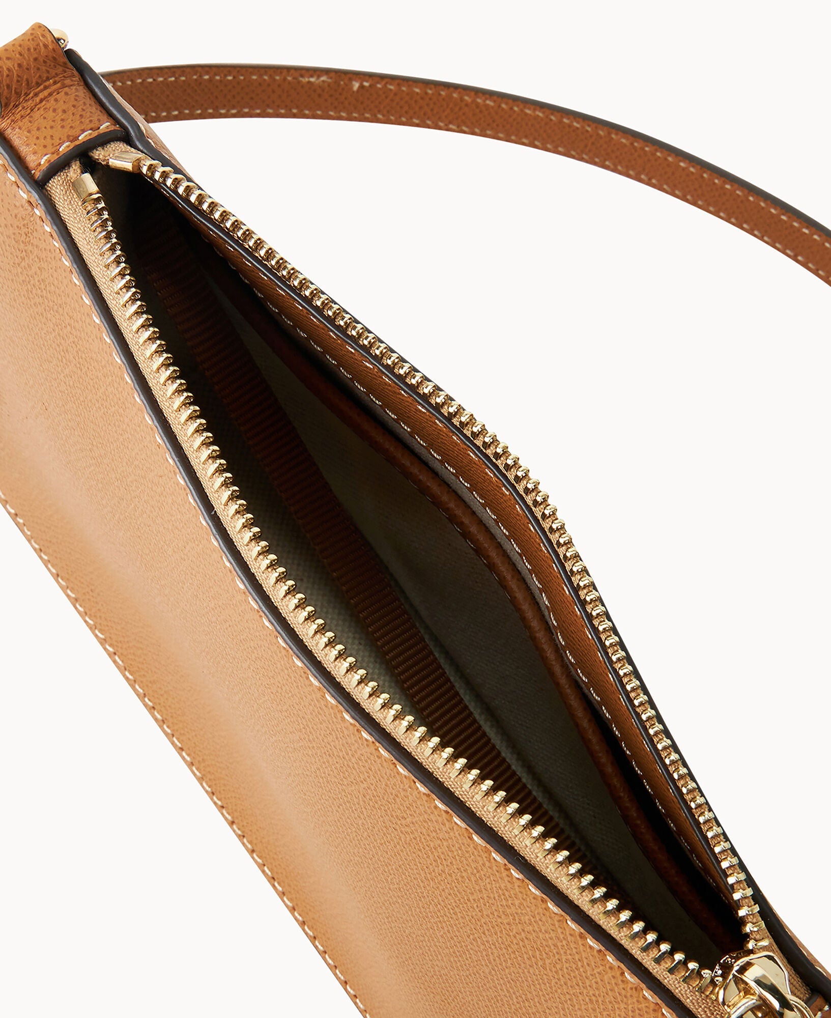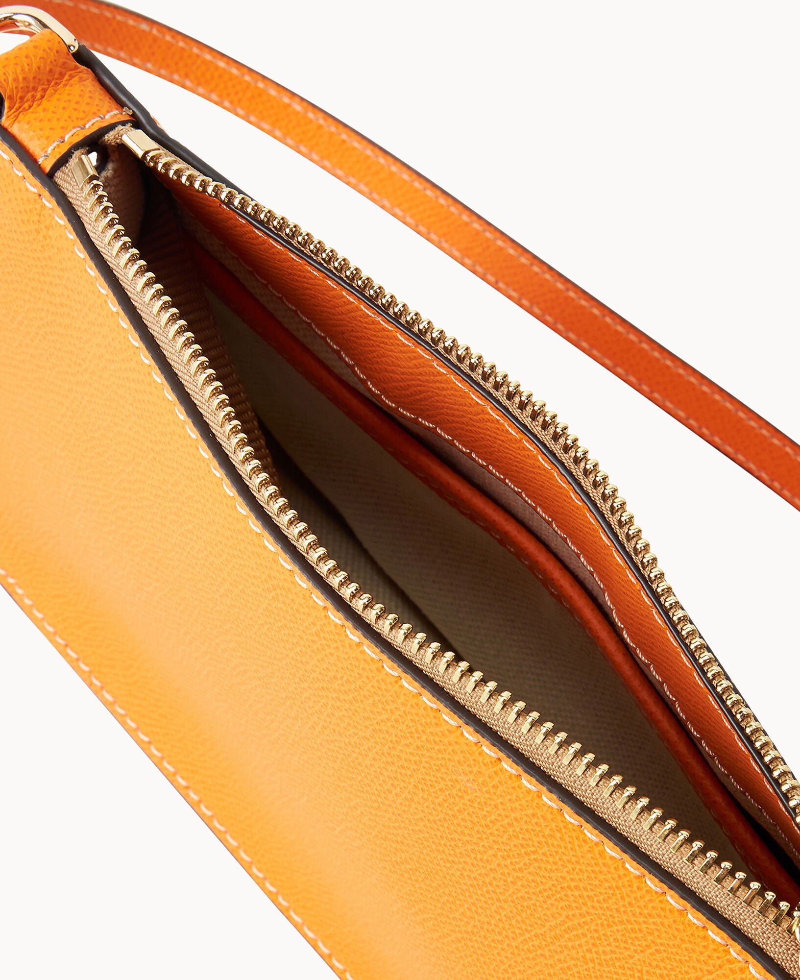 One inside pocket. One inside key hook. Removable strap. Strap drop length 11". Lined. Zipper closure.