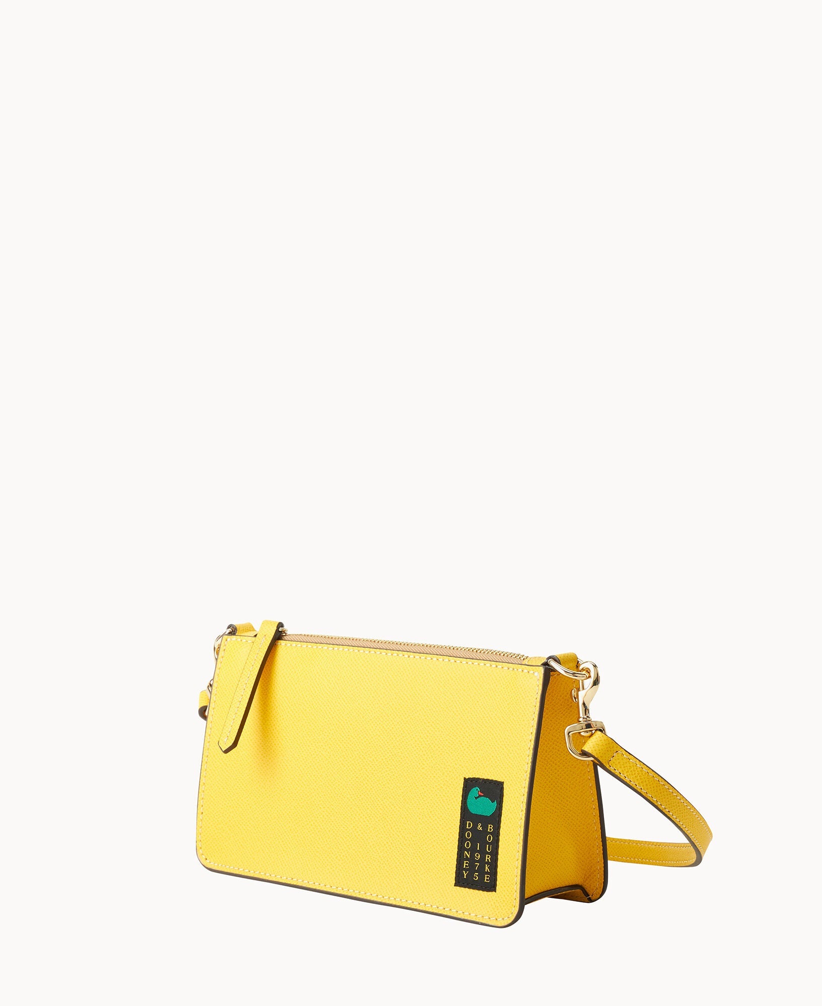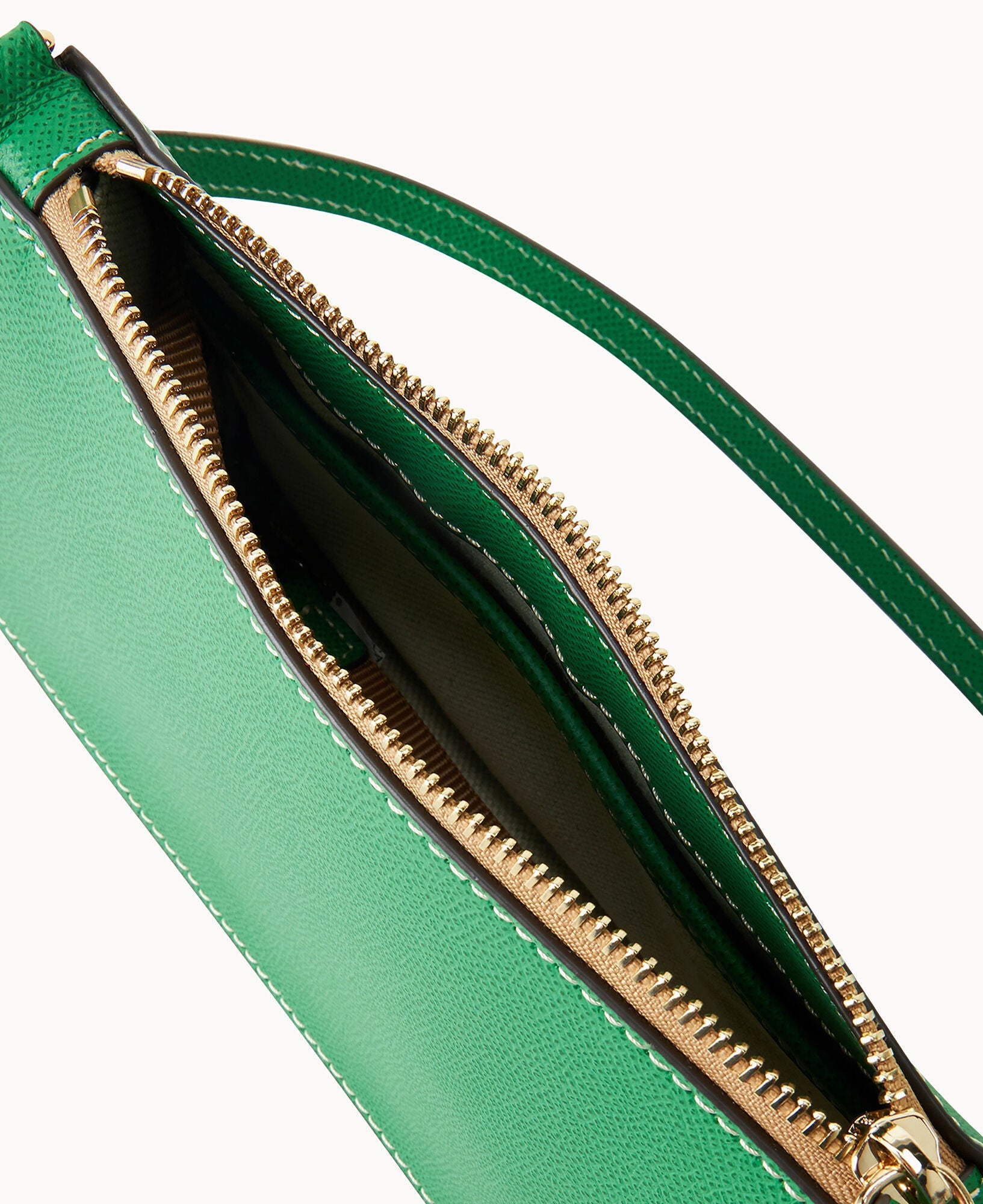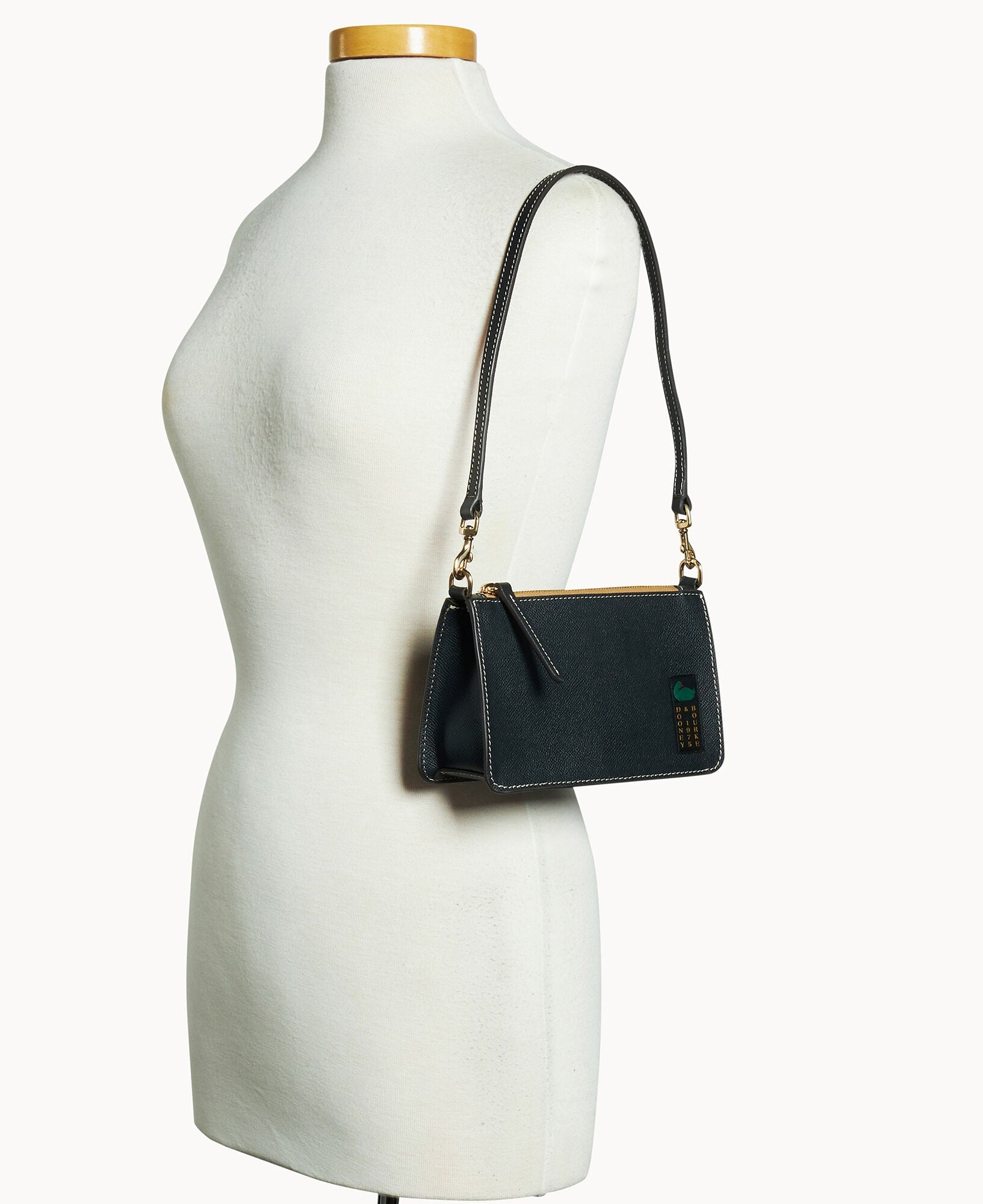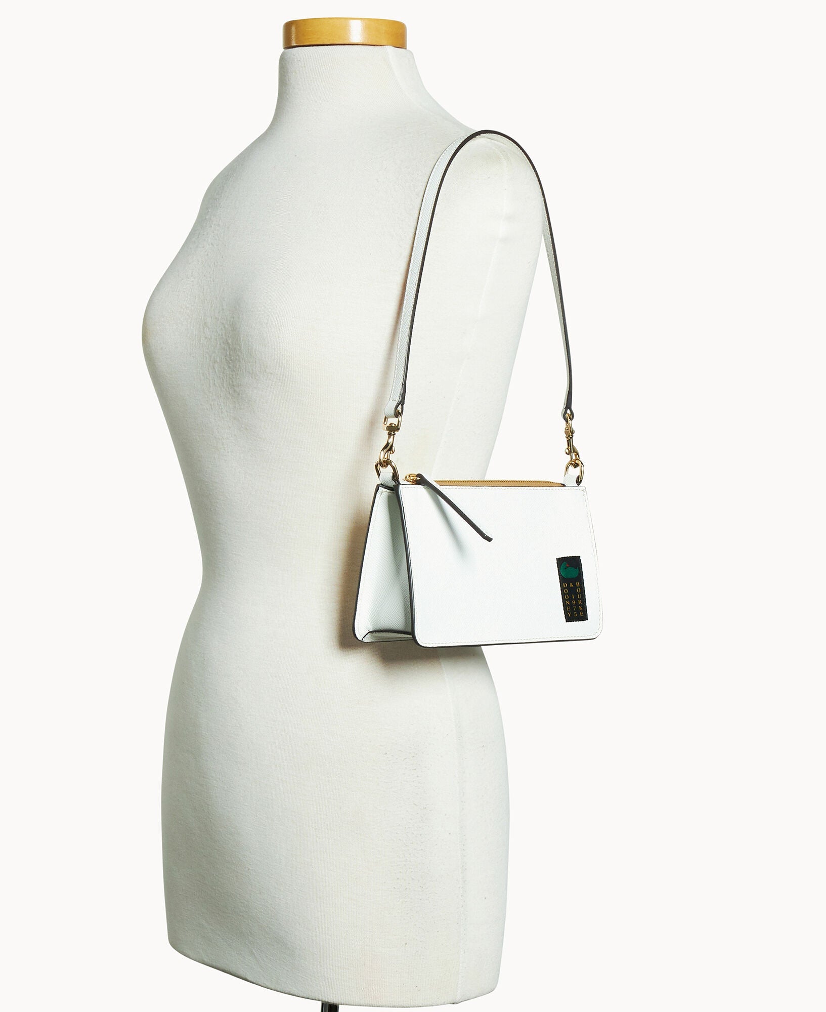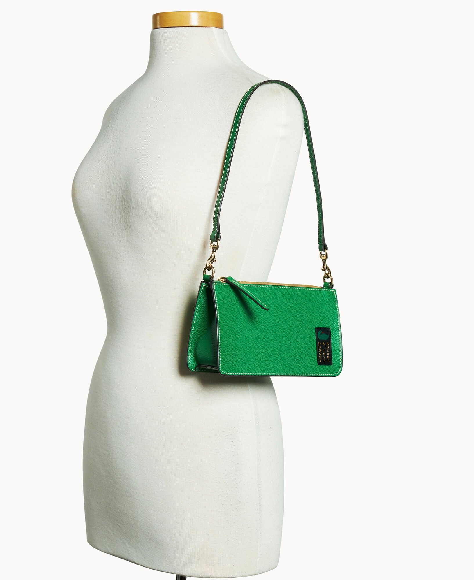 One inside pocket. One inside key hook. Removable strap. Strap drop length 11". Lined. Zipper closure.