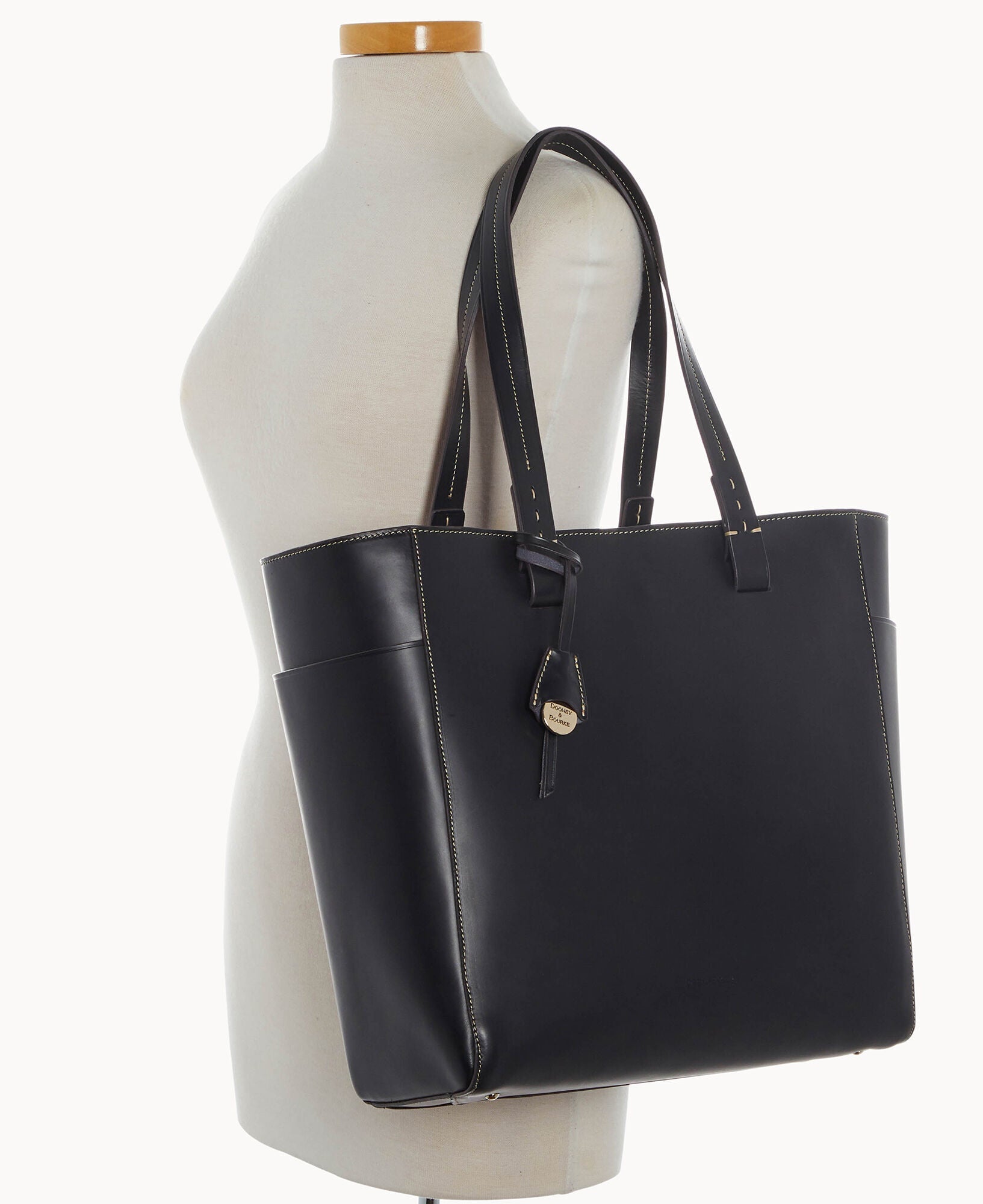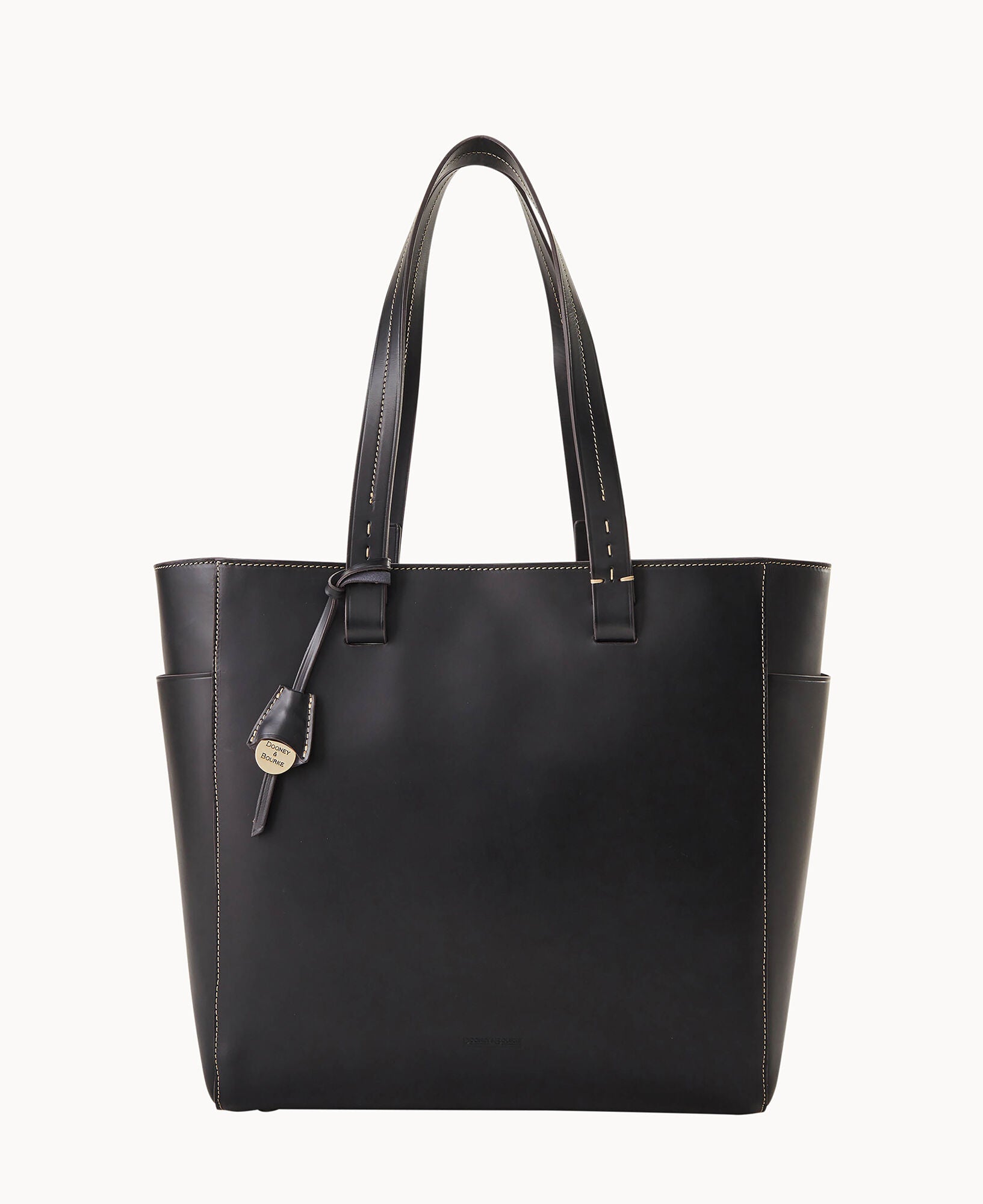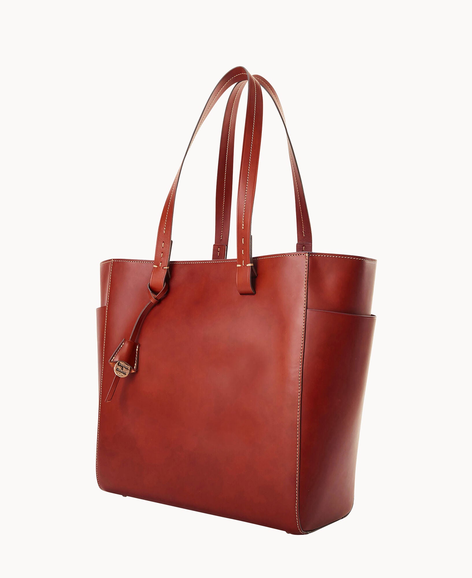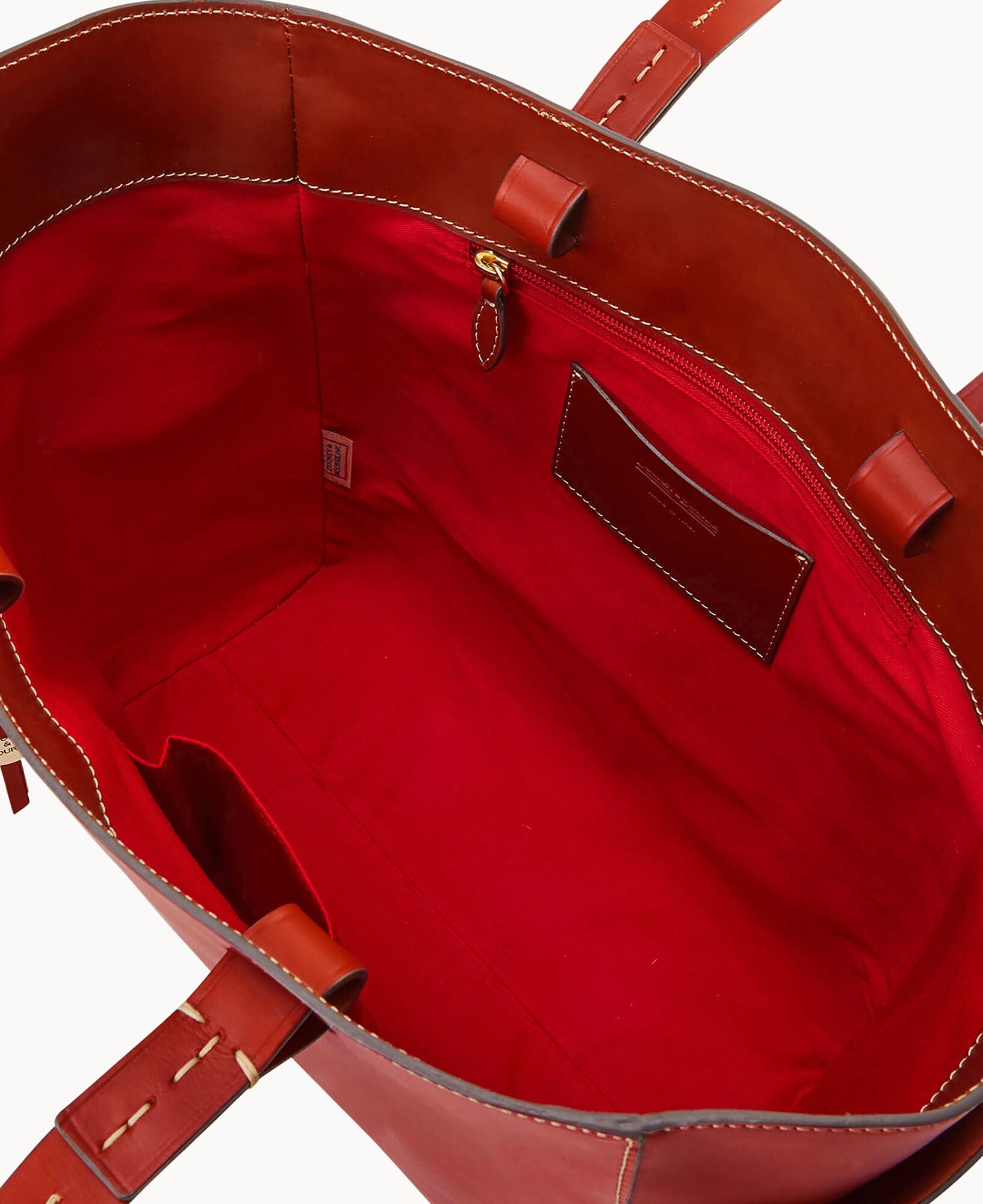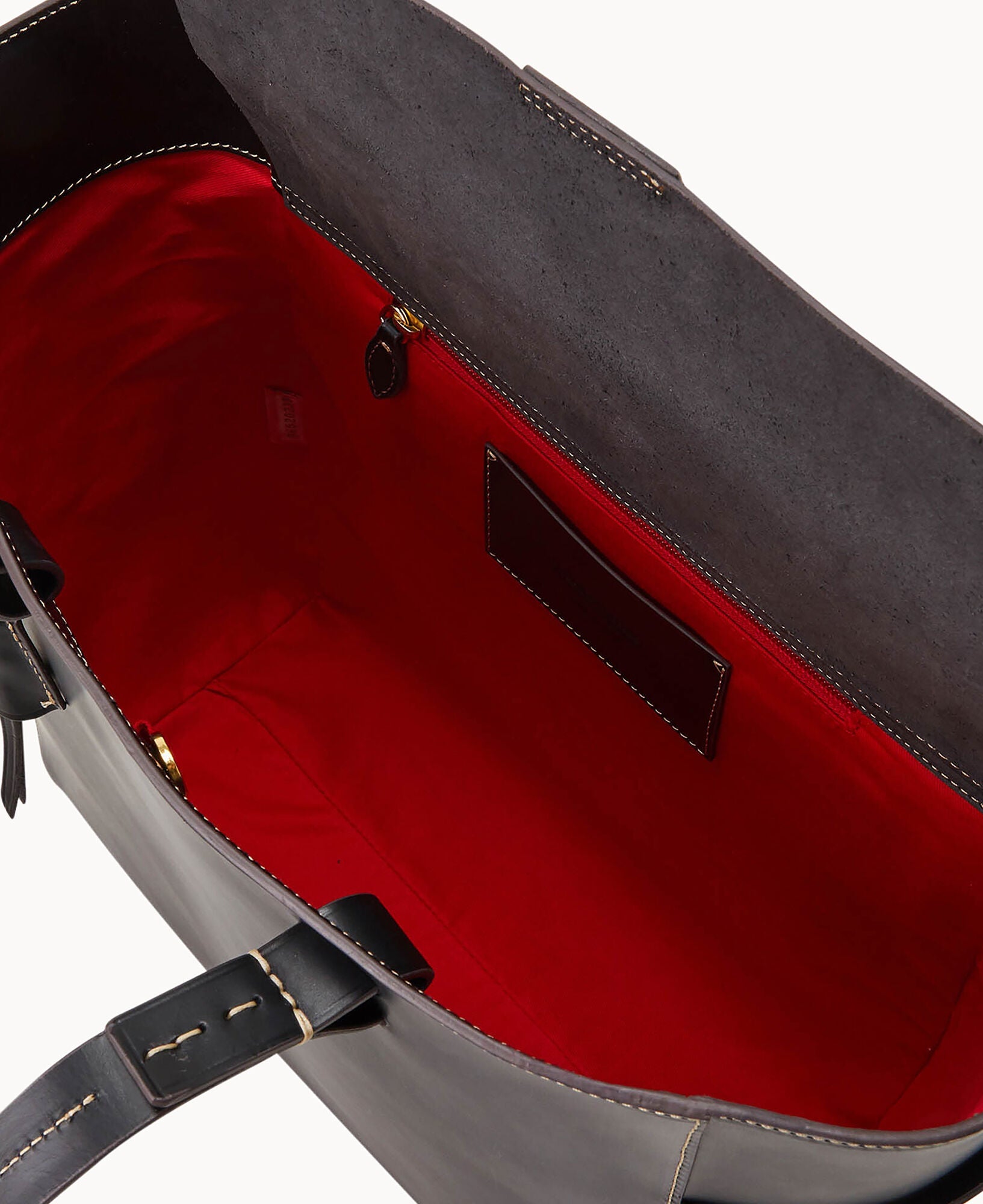 Two outside pockets. One inside pocket. One inside zip pocket. One inside credit card slot. Handle drop length 11". Magnetic snap closure. Feet. Removable medallion. Lined.