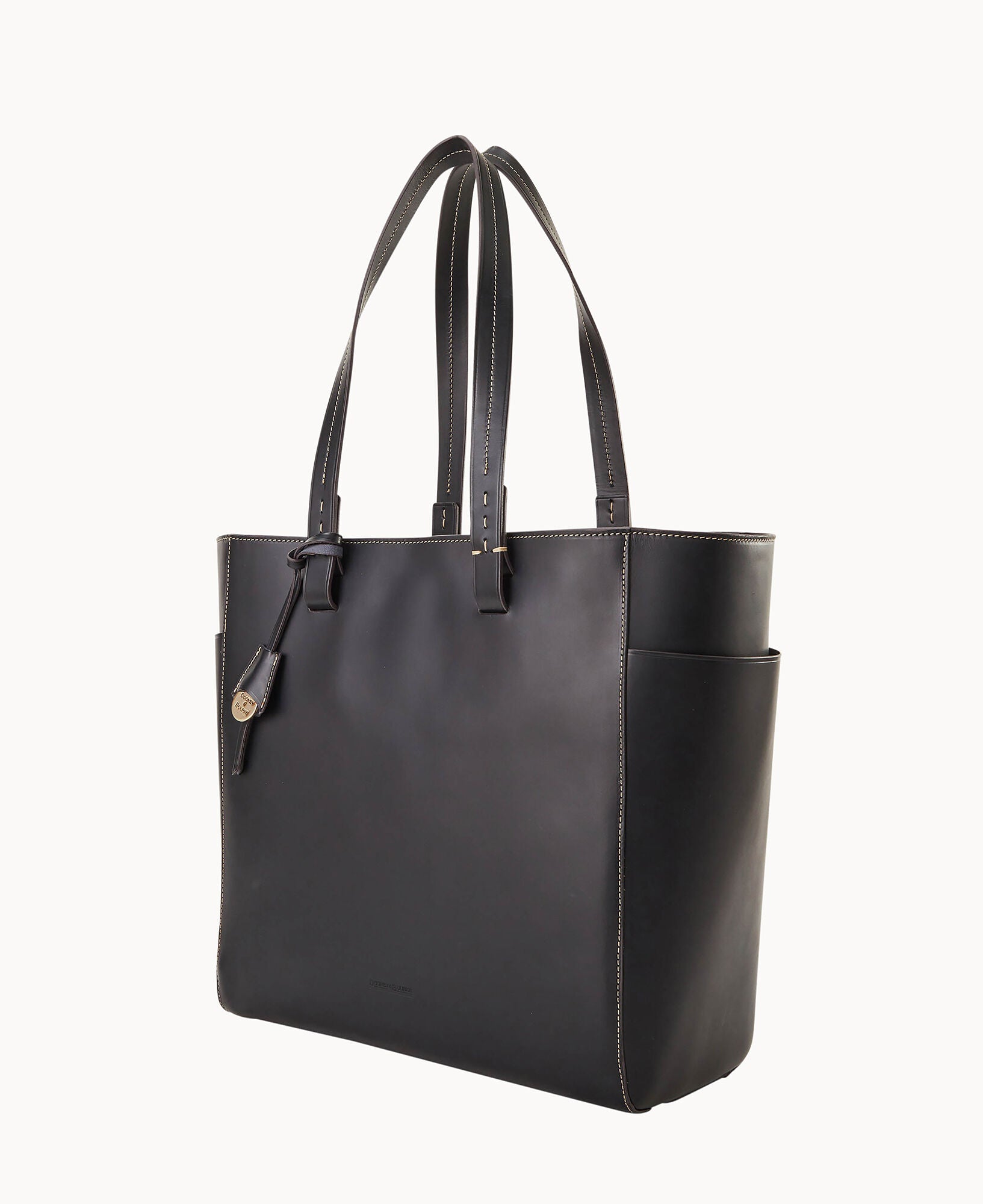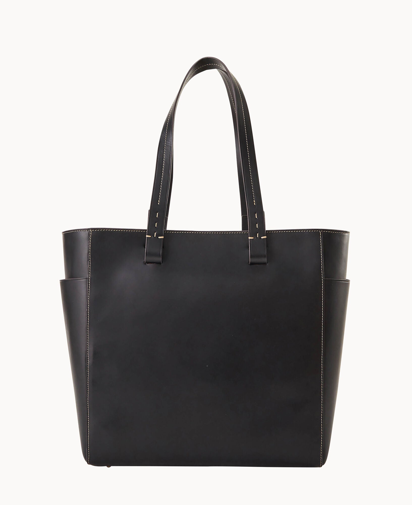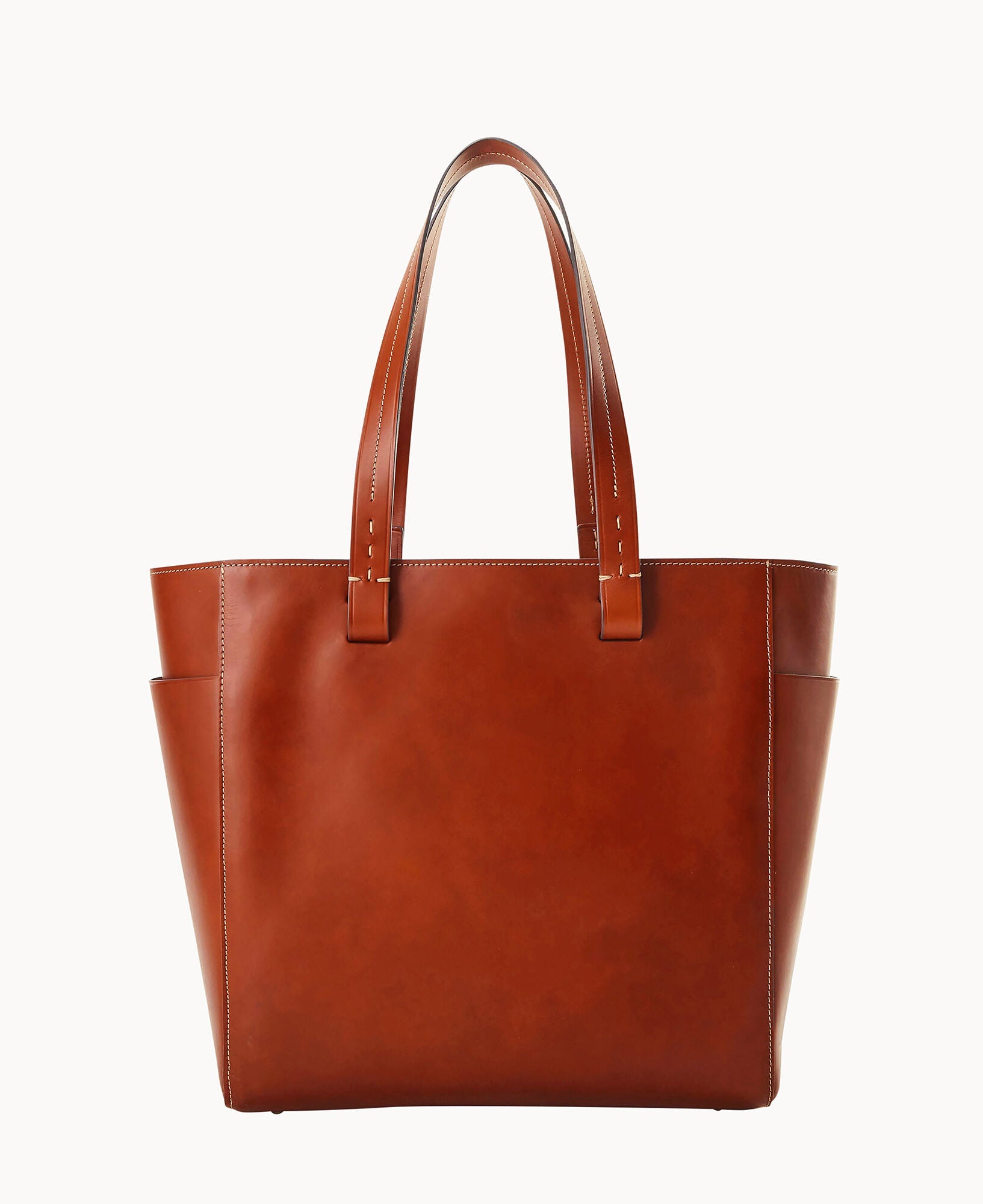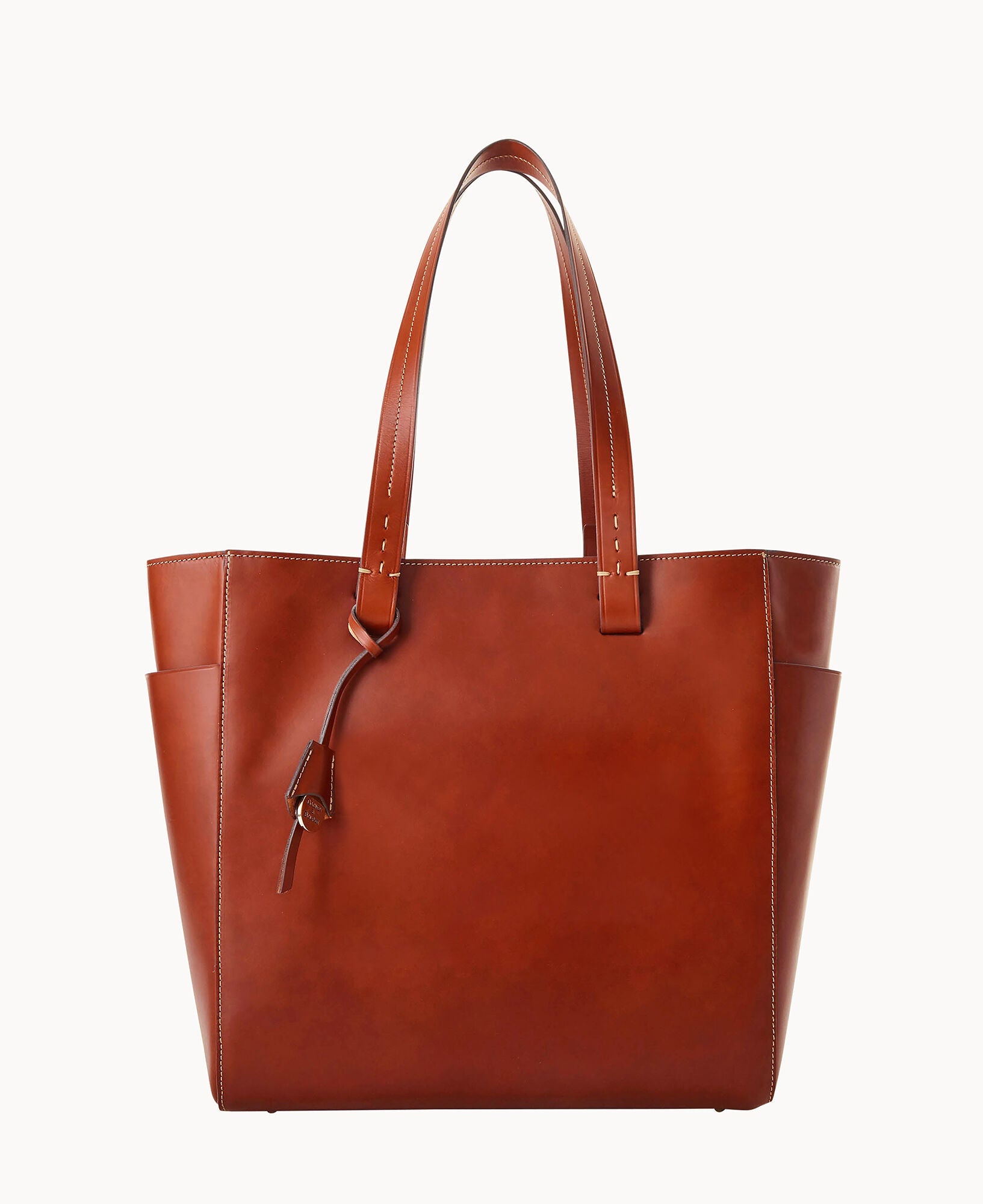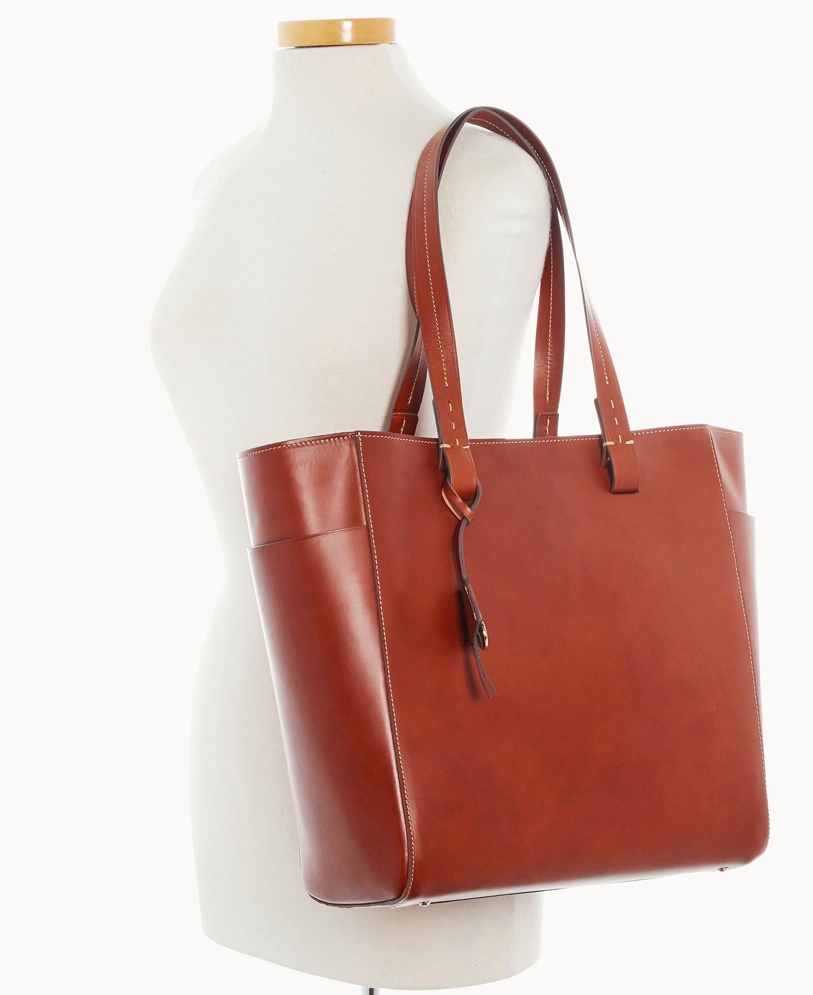 Two outside pockets. One inside pocket. One inside zip pocket. One inside credit card slot. Handle drop length 11". Magnetic snap closure. Feet. Removable medallion. Lined.