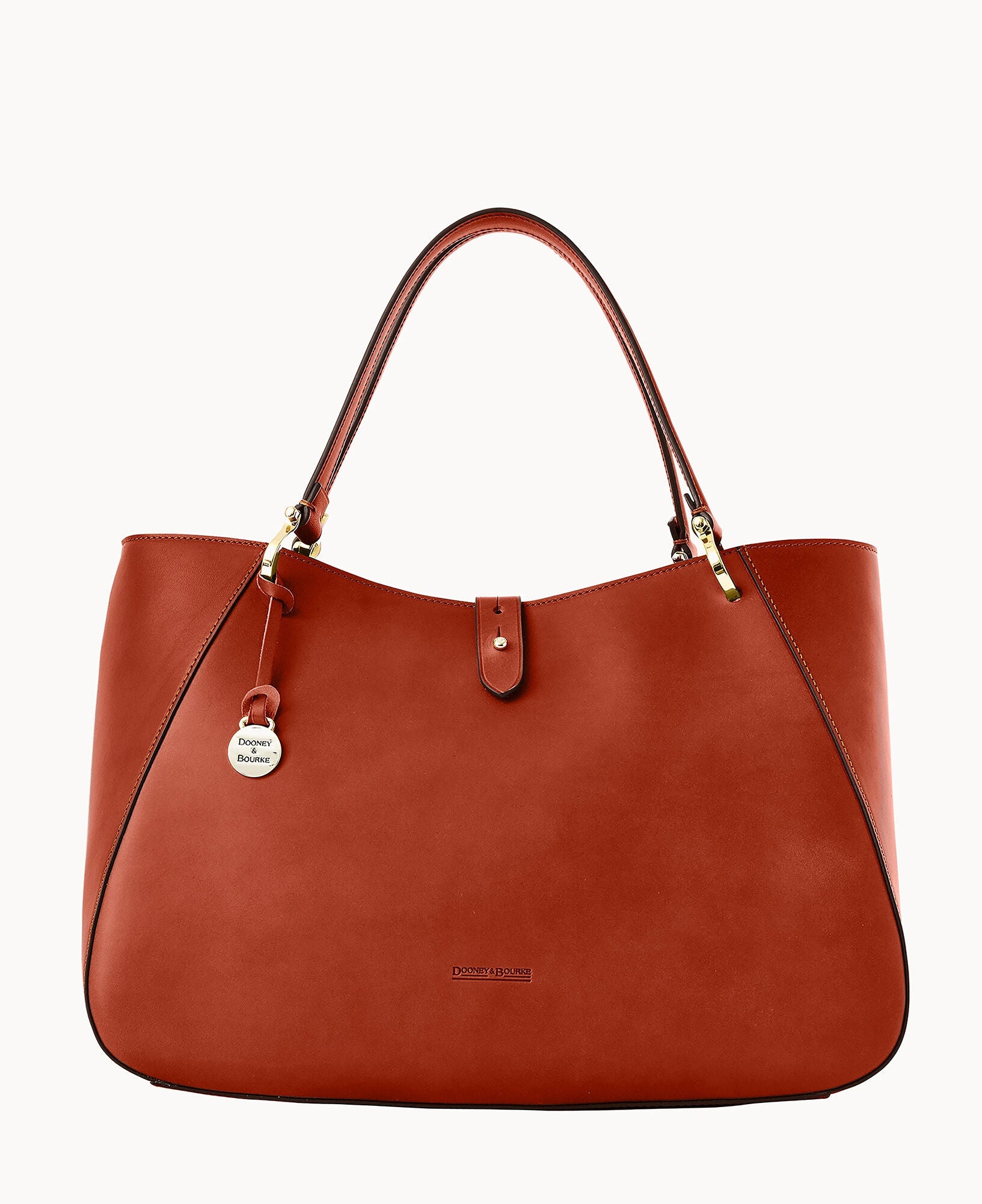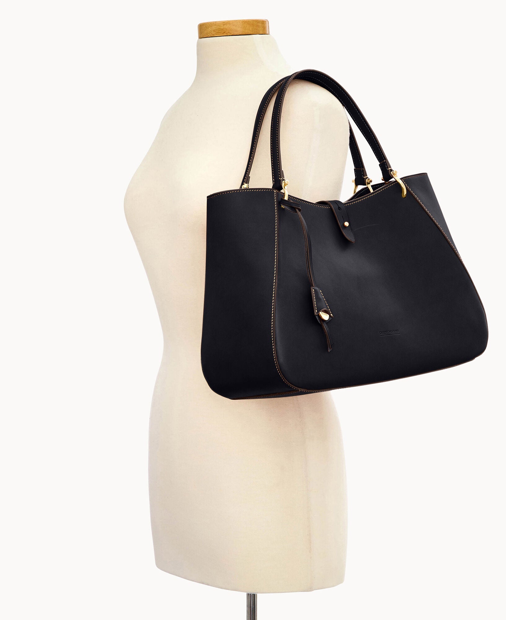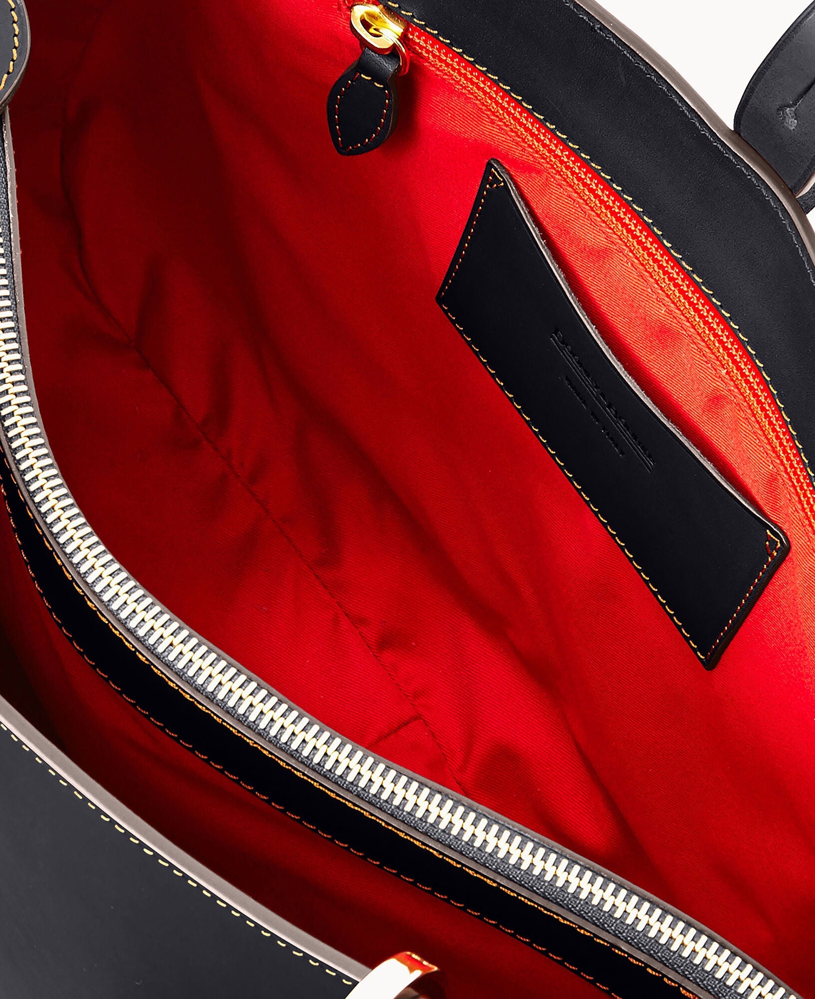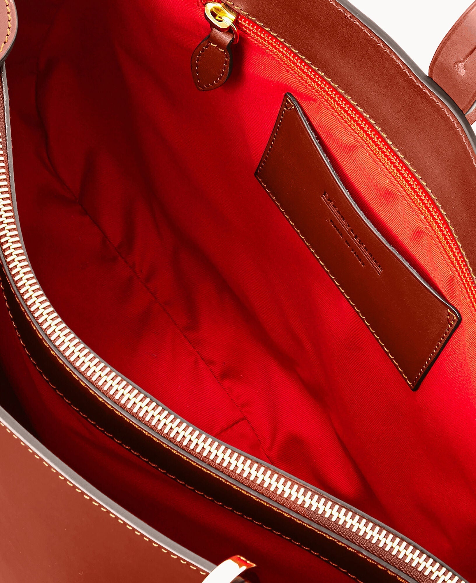 One inside zip pocket. One inside pocket. One inside credit card slot. Center zip divider compartment. Cell phone pocket. Handle drop length 7.75". Lined. Tongue tab buckle closure.