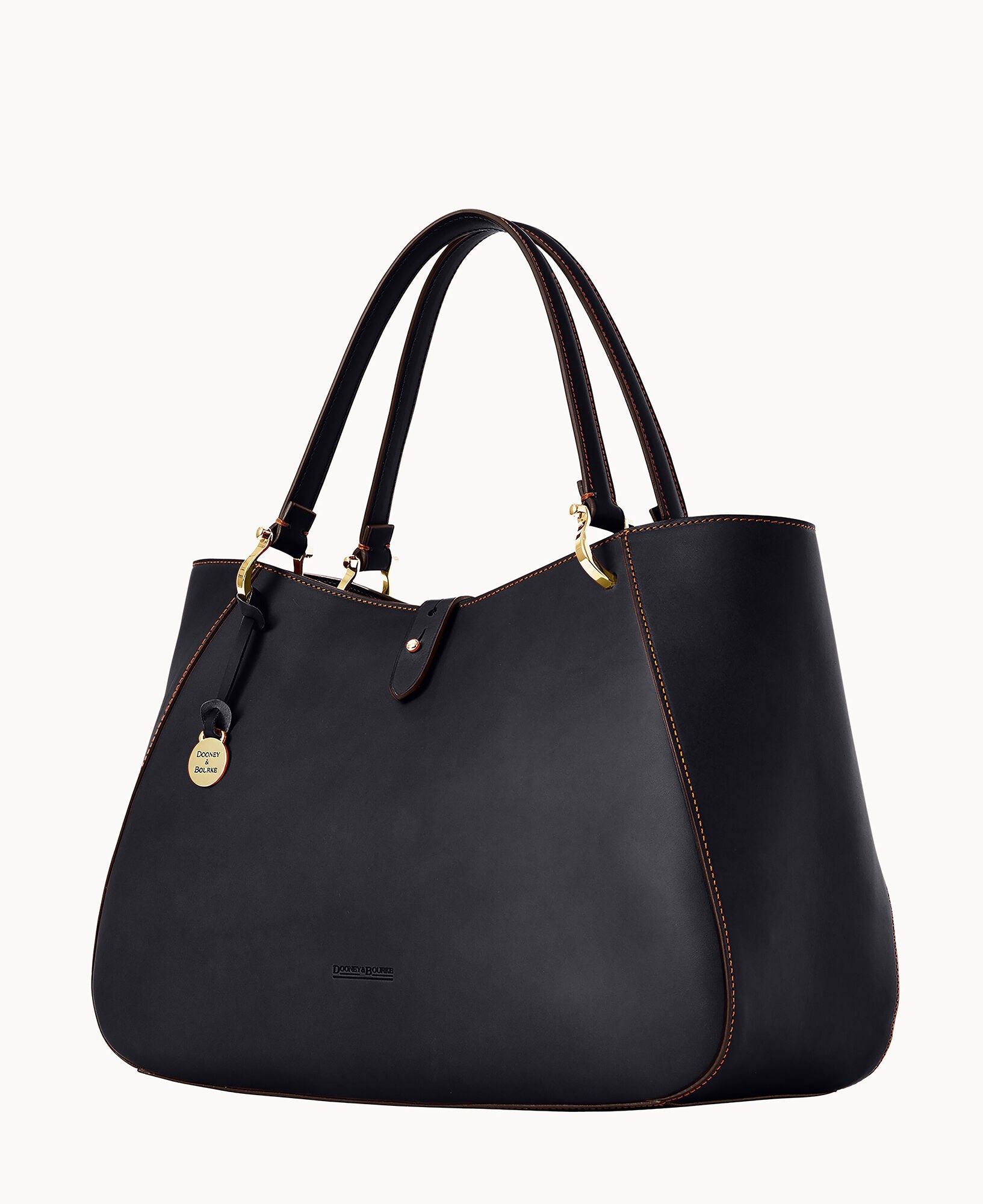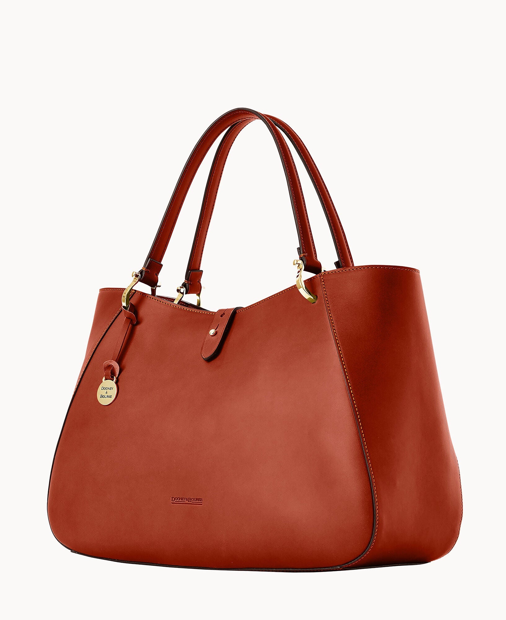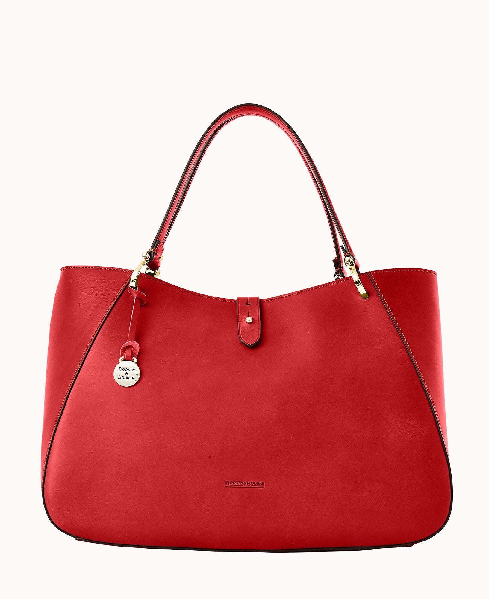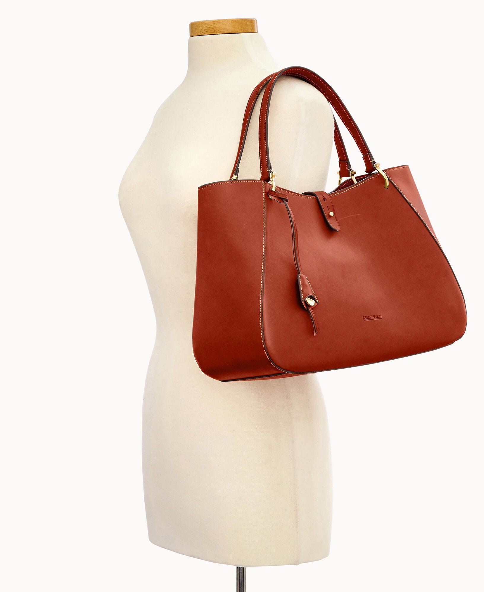One inside zip pocket. One inside pocket. One inside credit card slot. Center zip divider compartment. Cell phone pocket. Handle drop length 7.75". Lined. Tongue tab buckle closure.