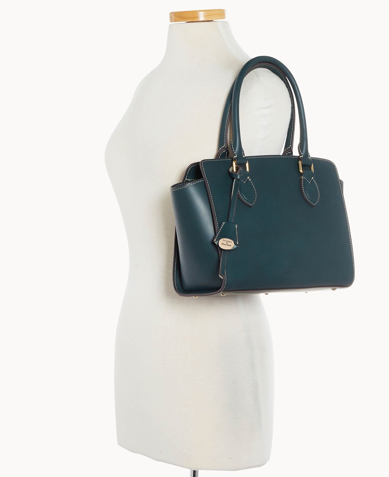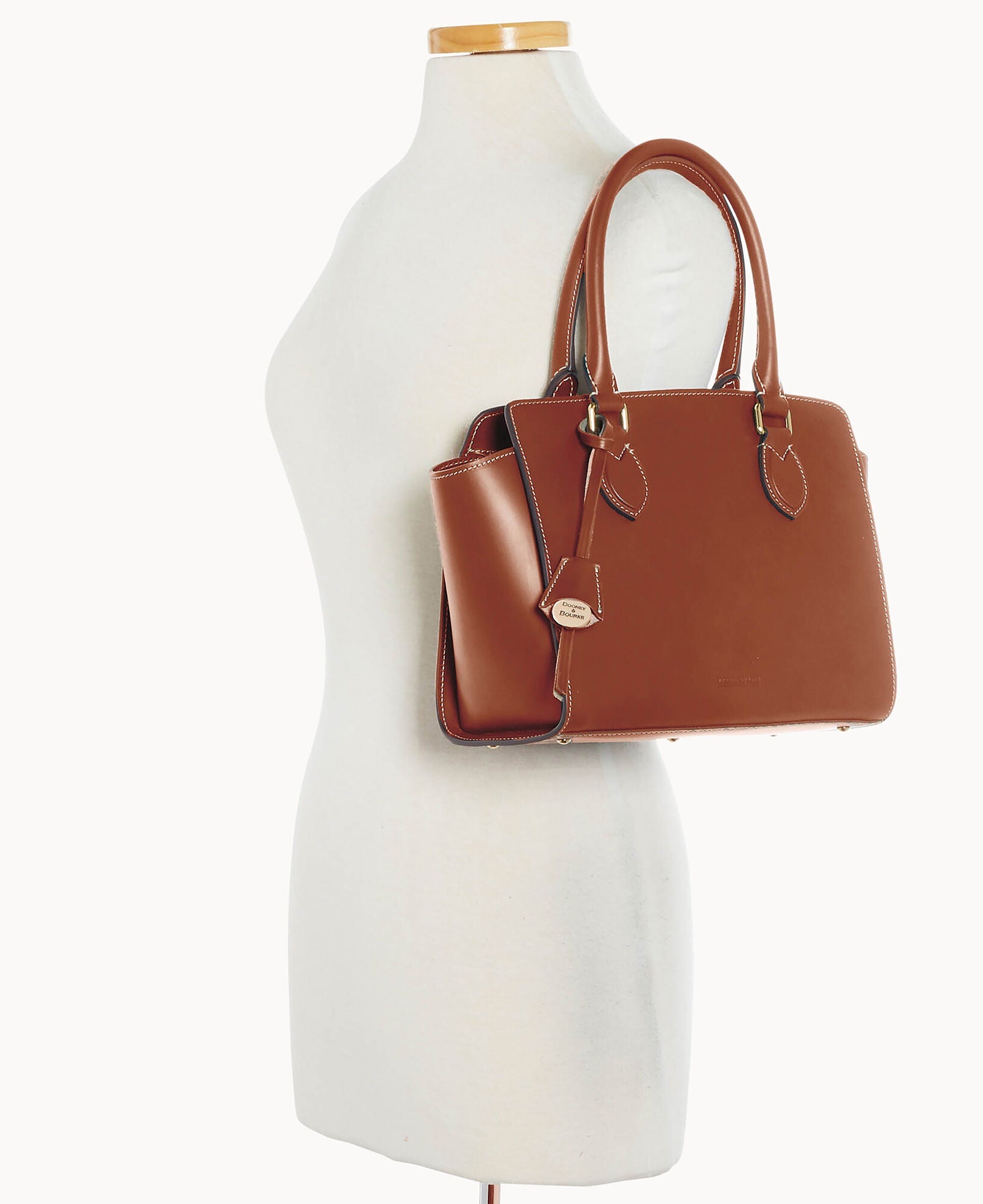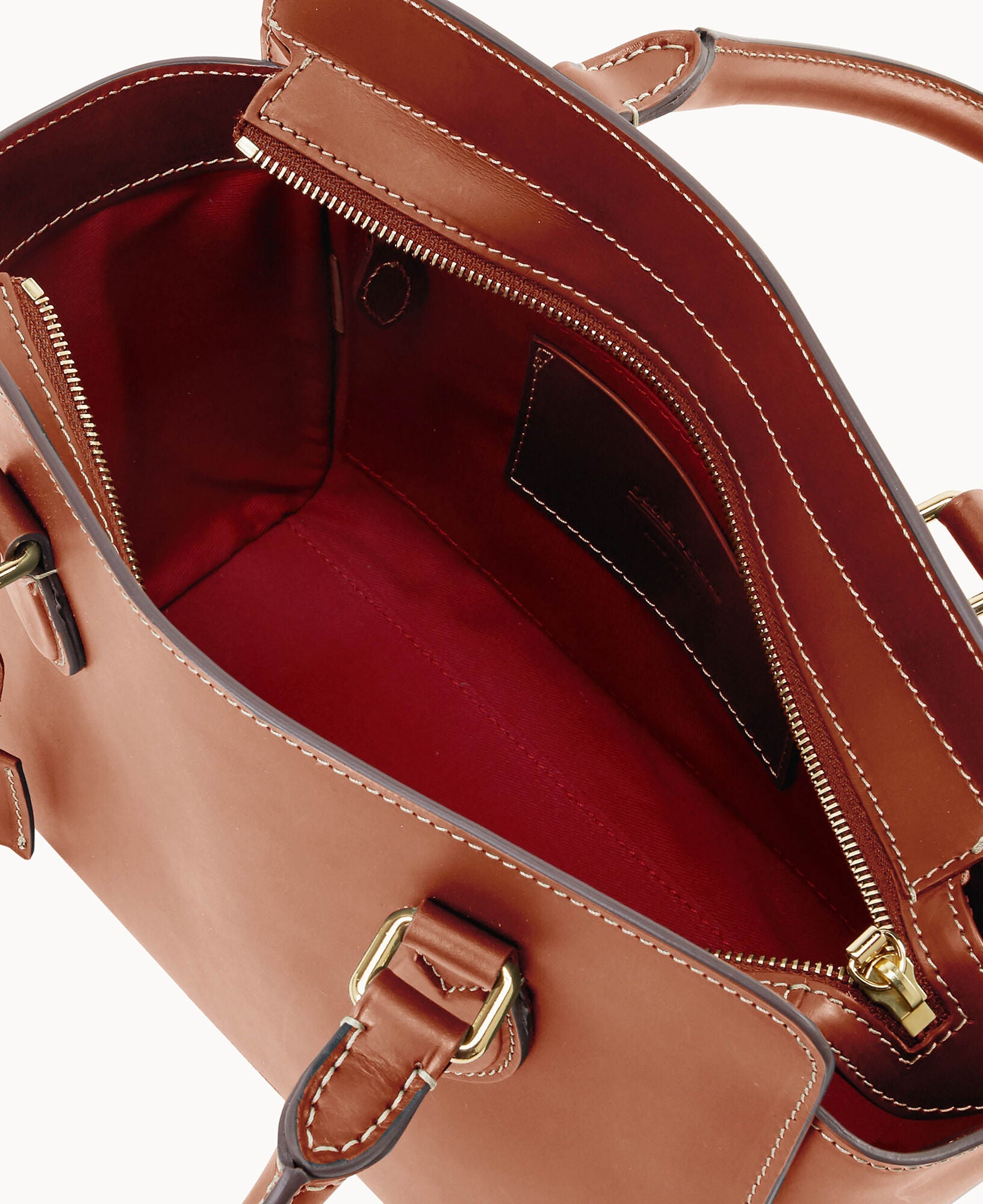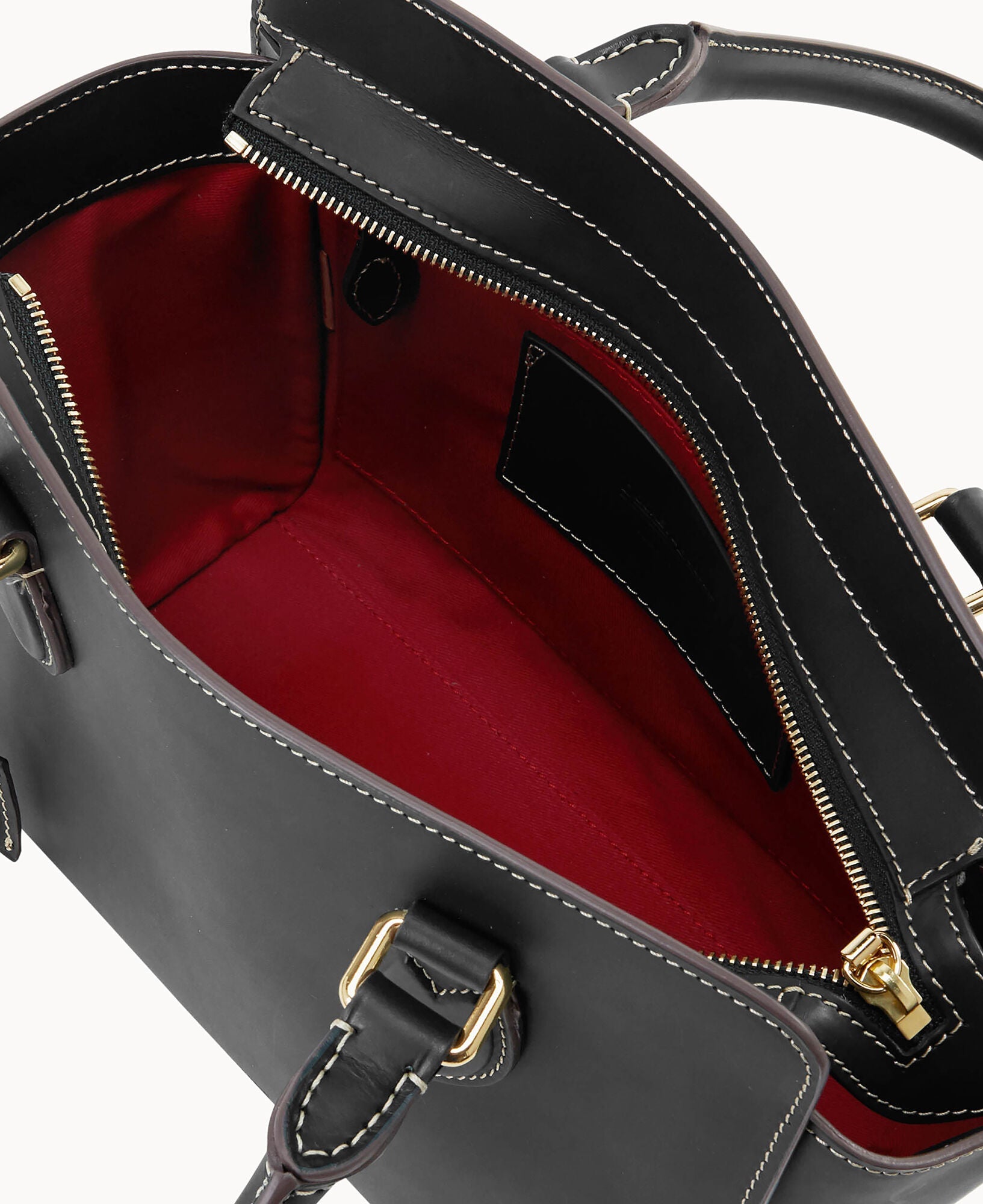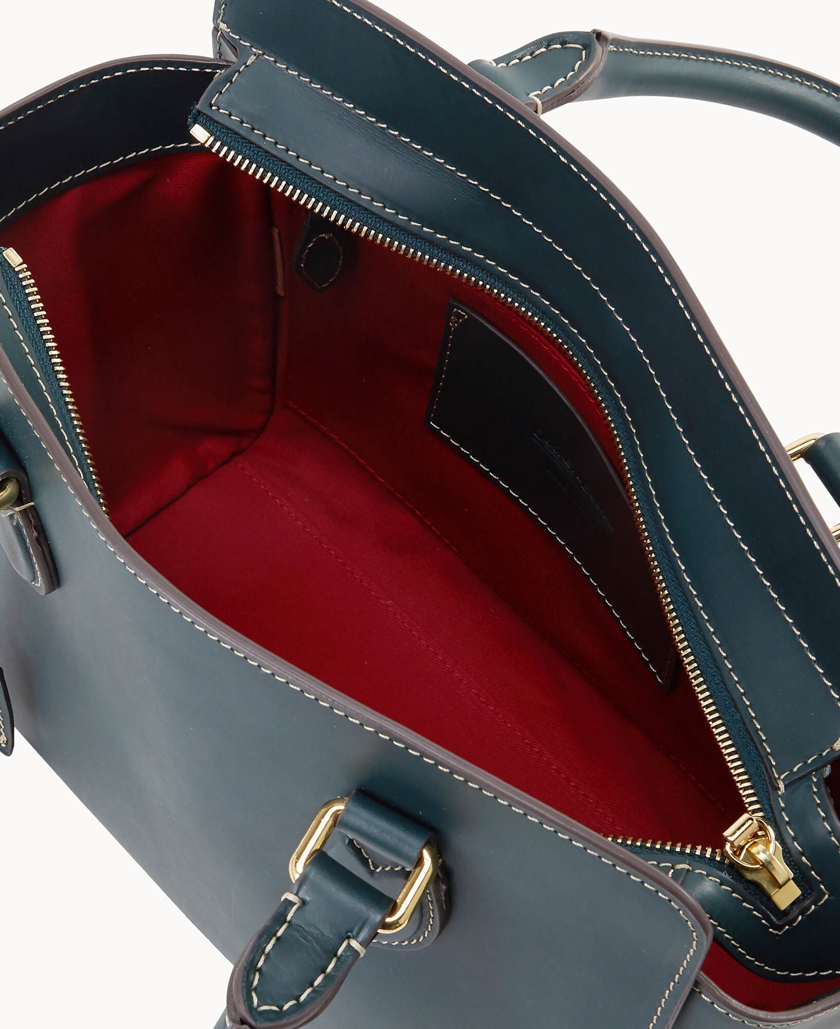 Two inside slip pockets. One inside zip pocket. One cell phone pocket. Removable medallion. Strap drop length 6". Lined. Feet. Zipper closure.