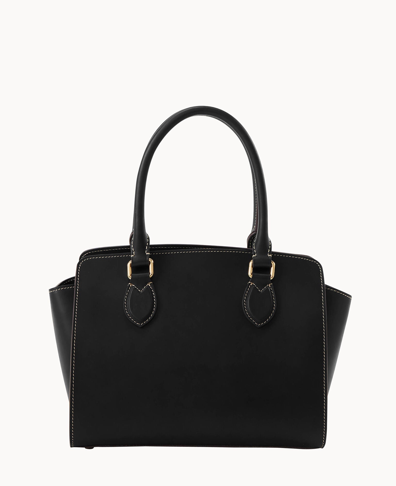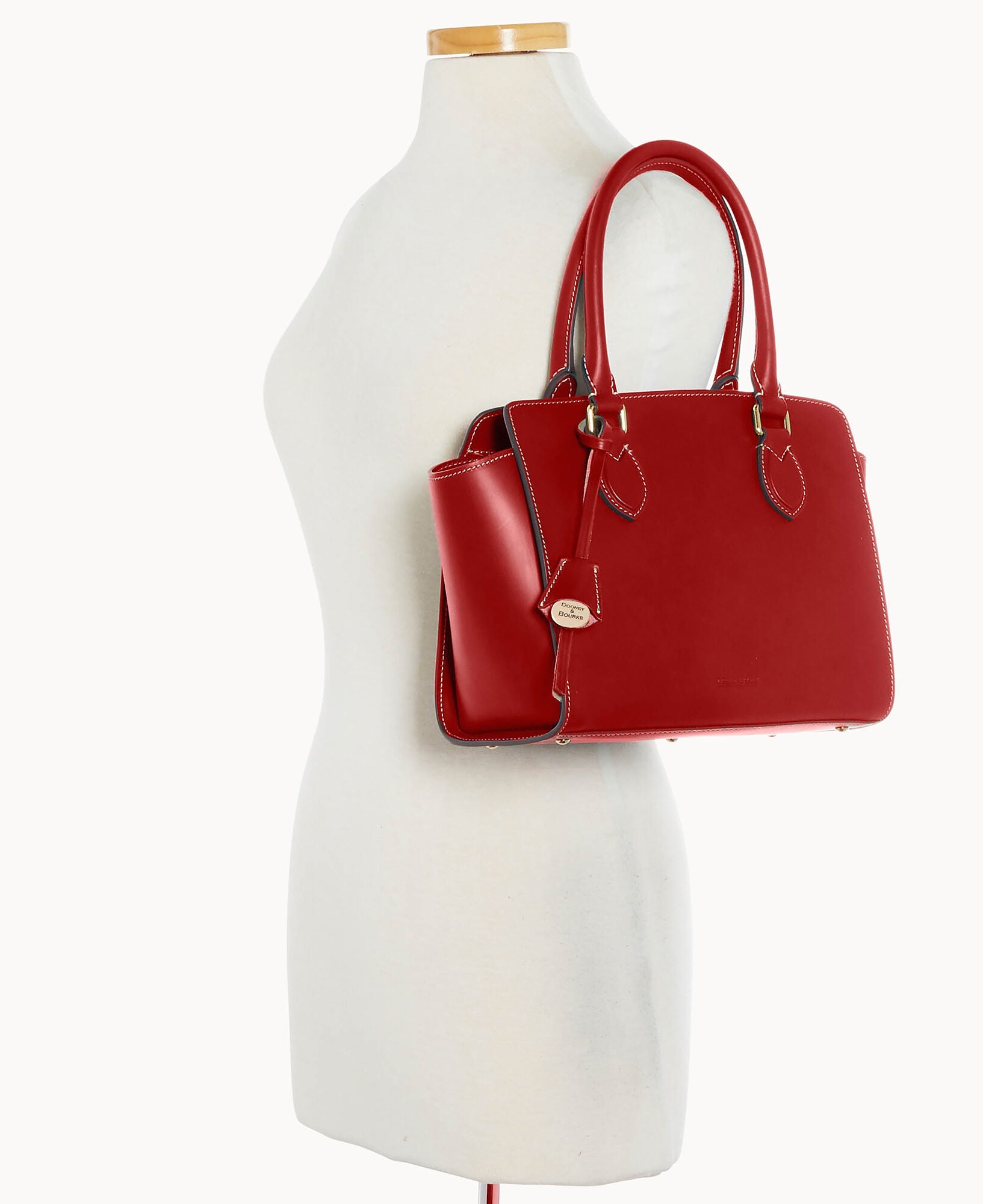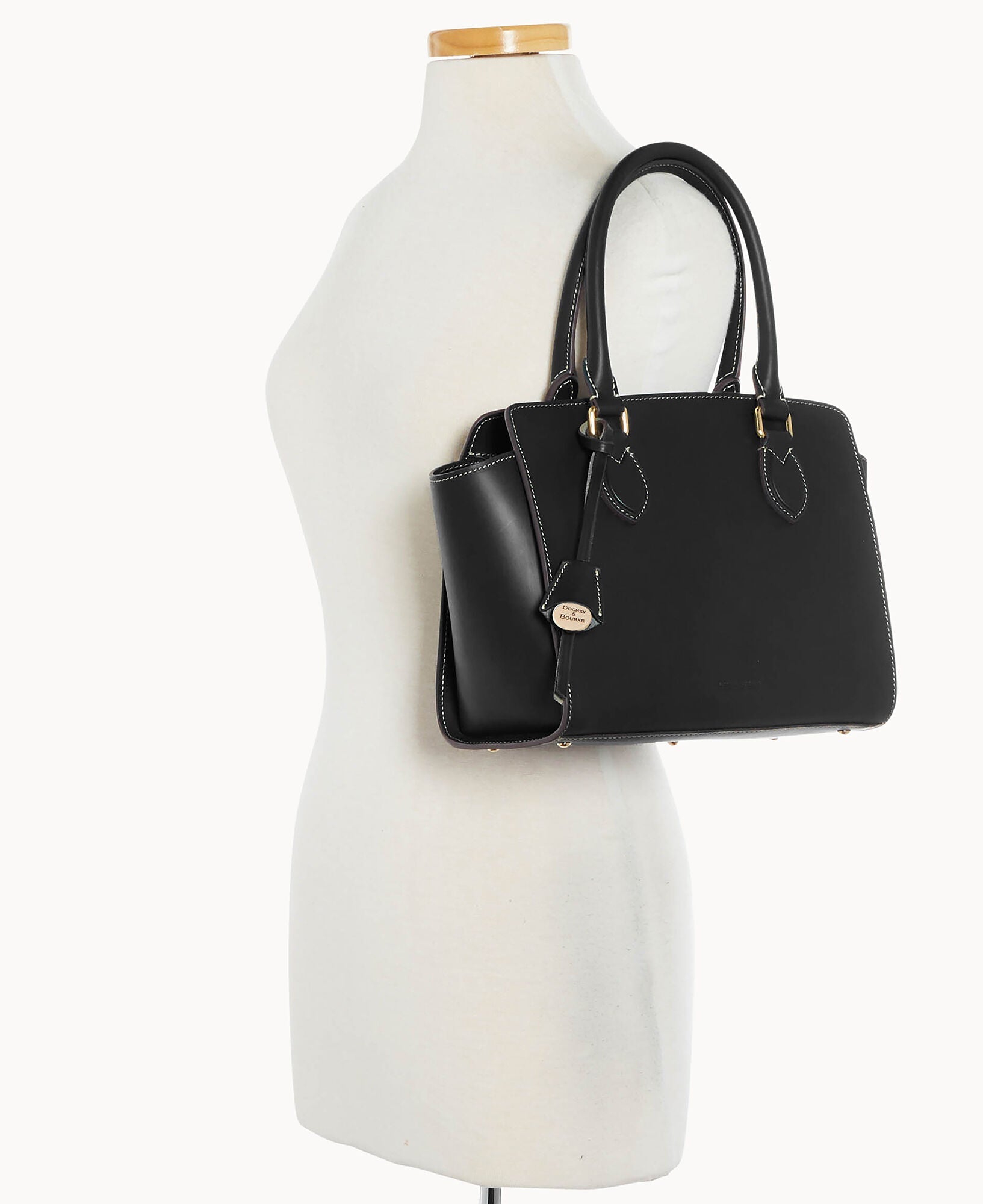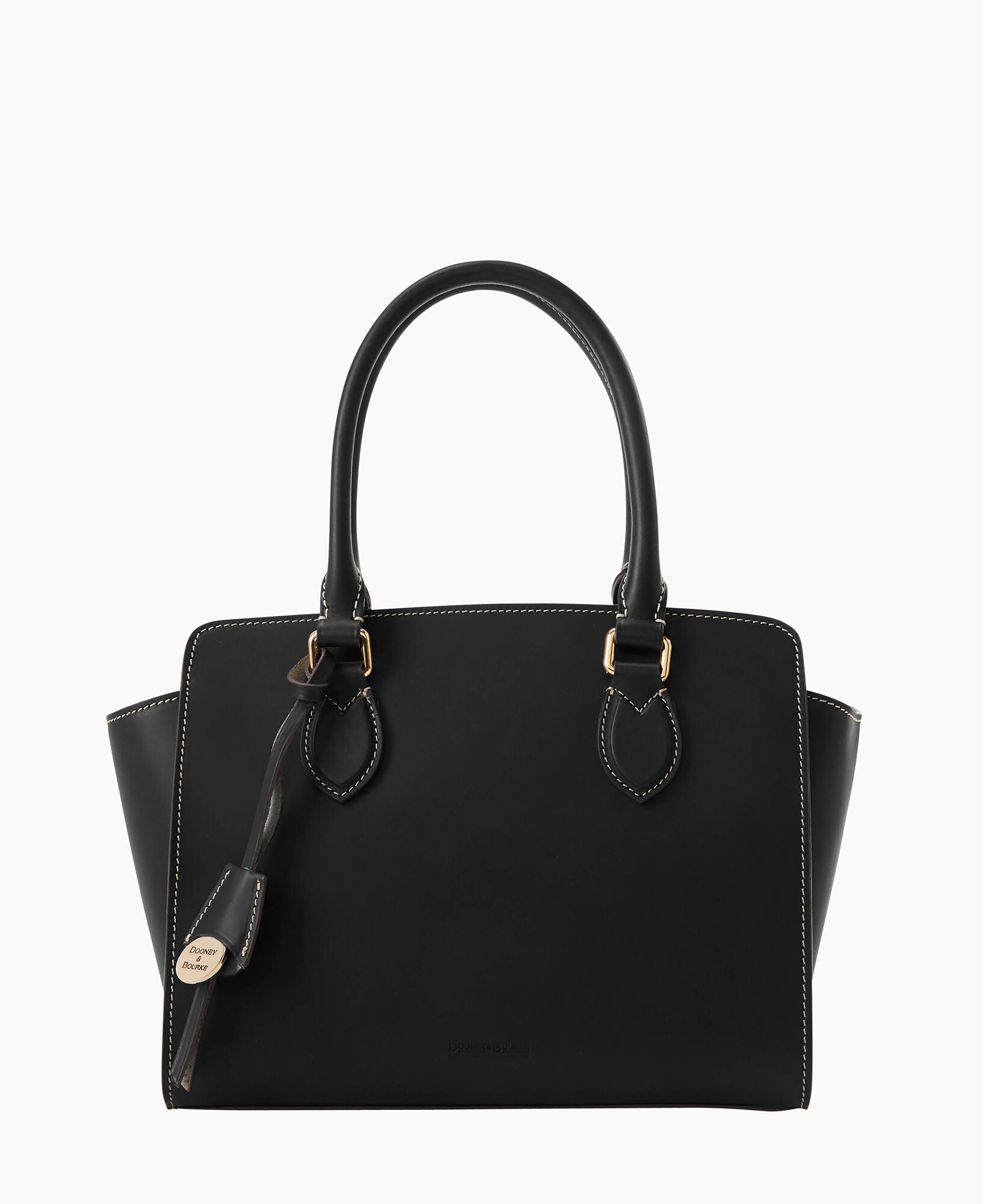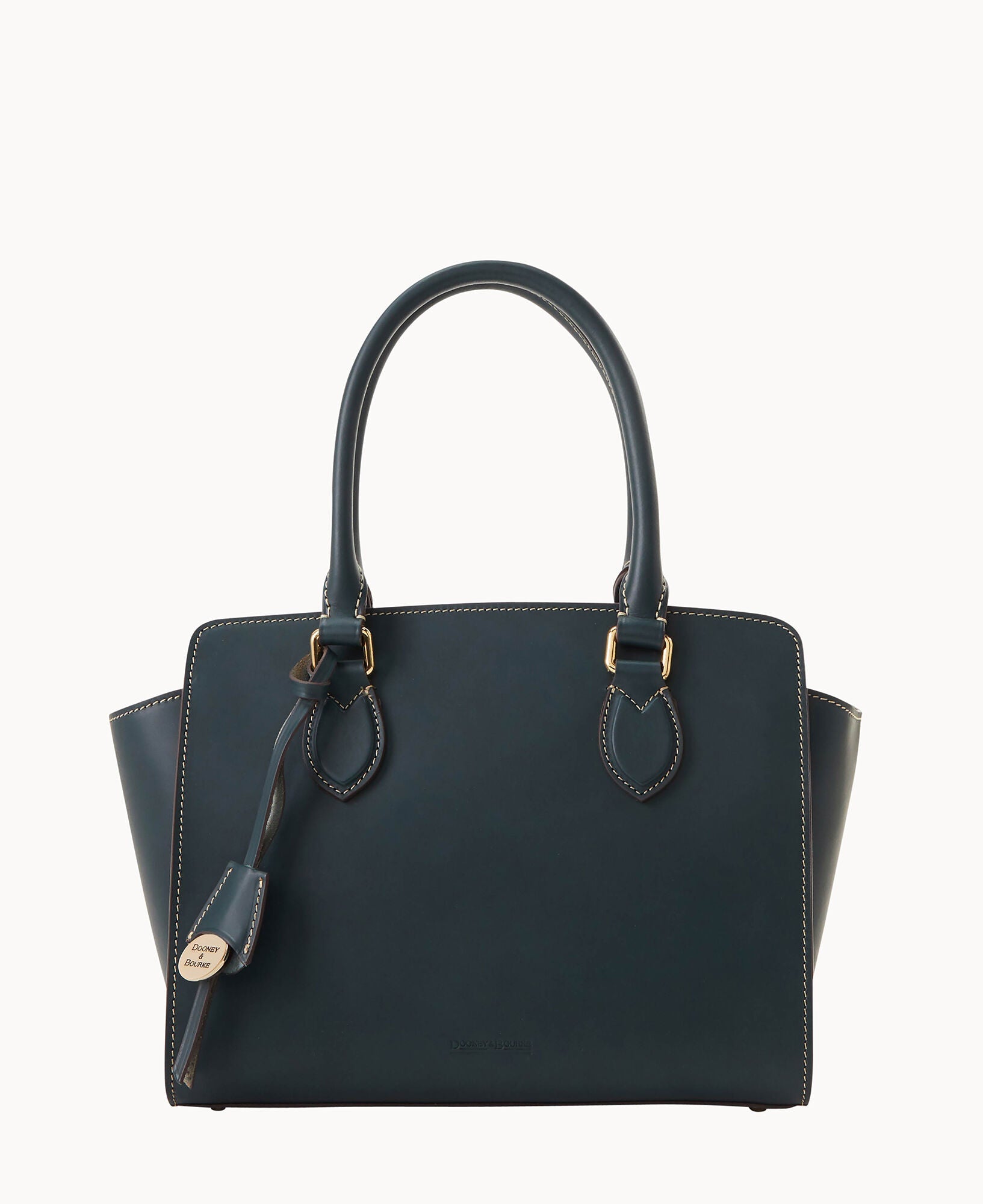 Two inside slip pockets. One inside zip pocket. One cell phone pocket. Removable medallion. Strap drop length 6". Lined. Feet. Zipper closure.