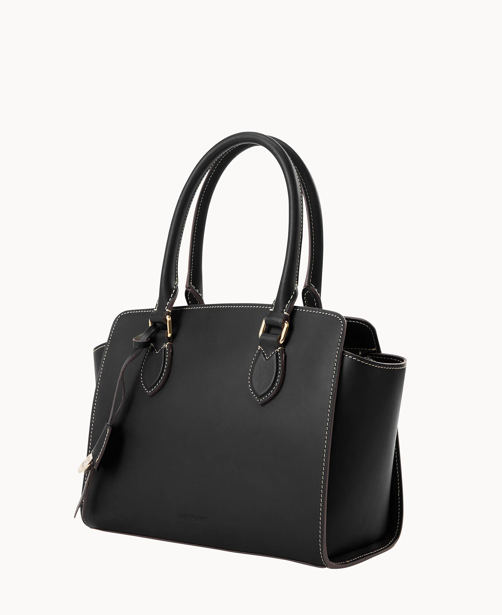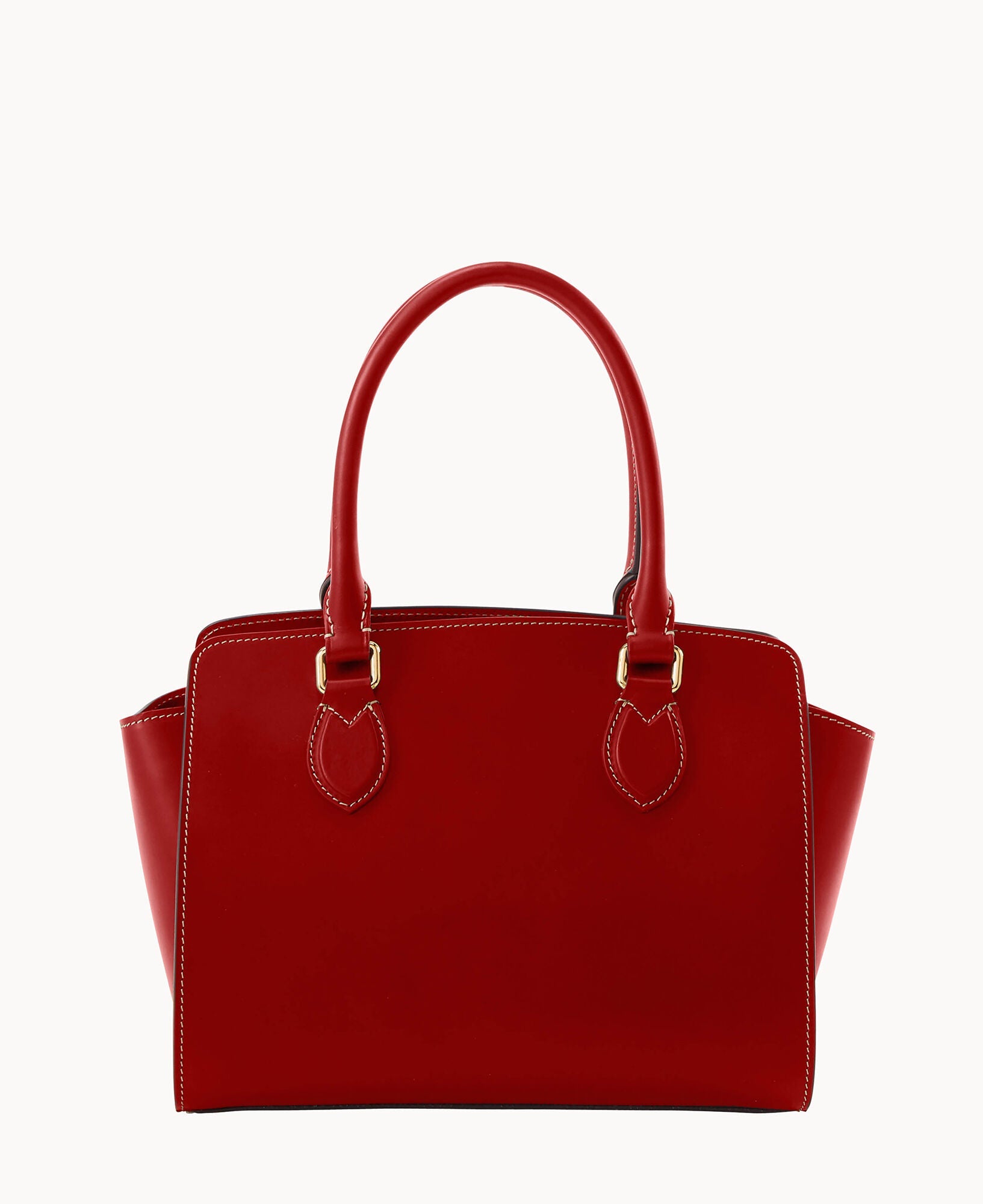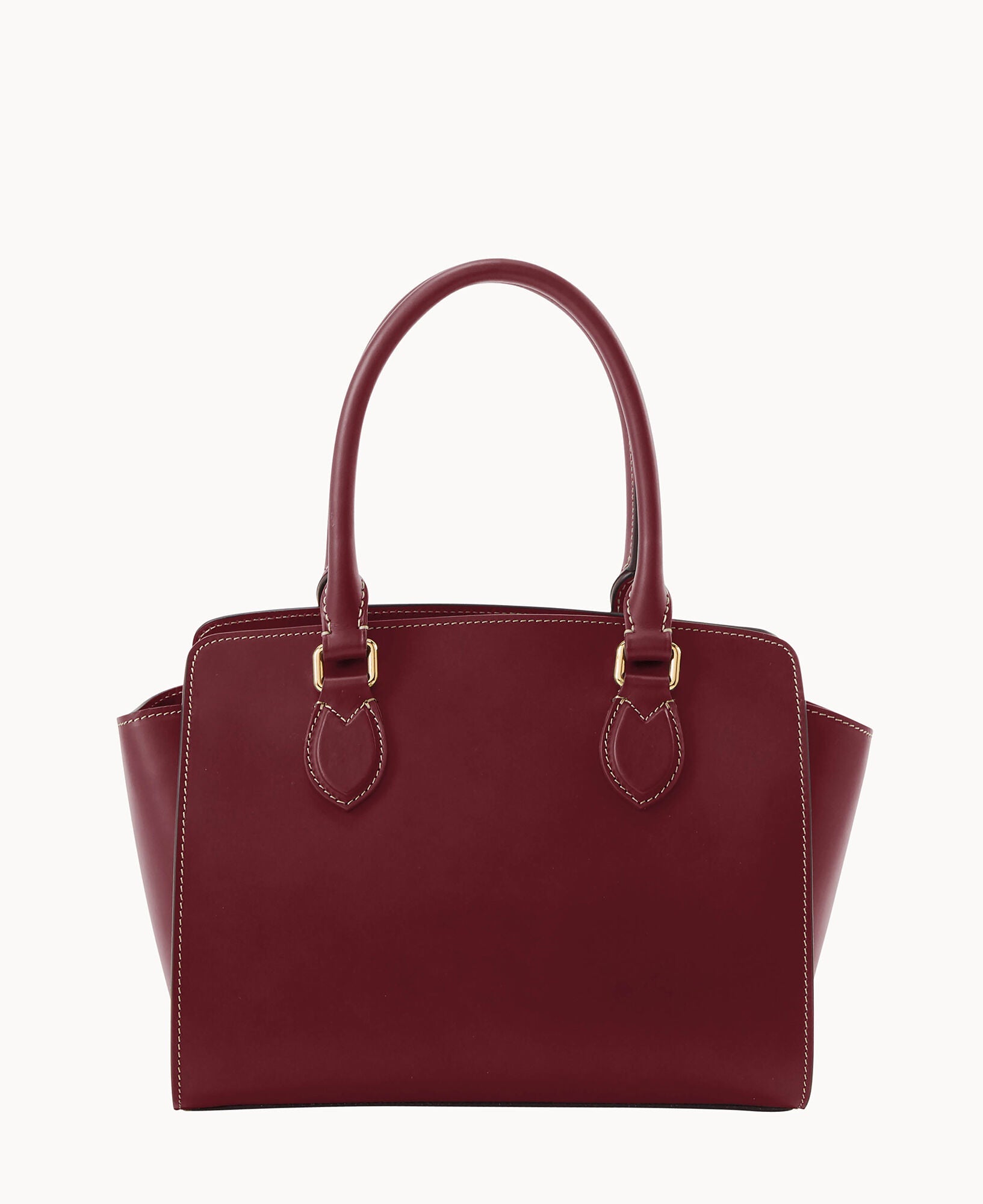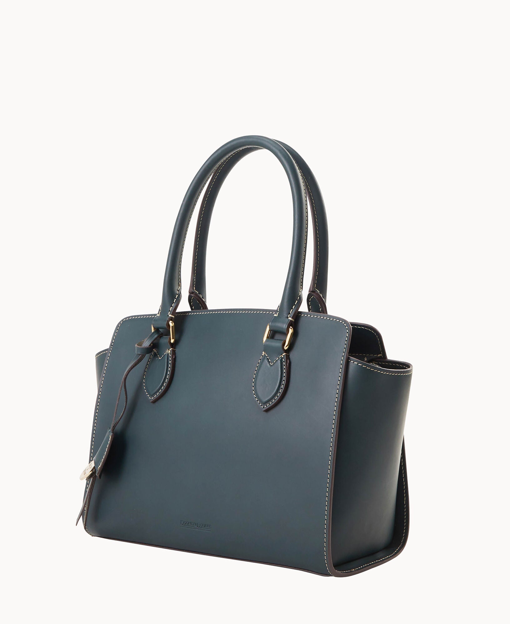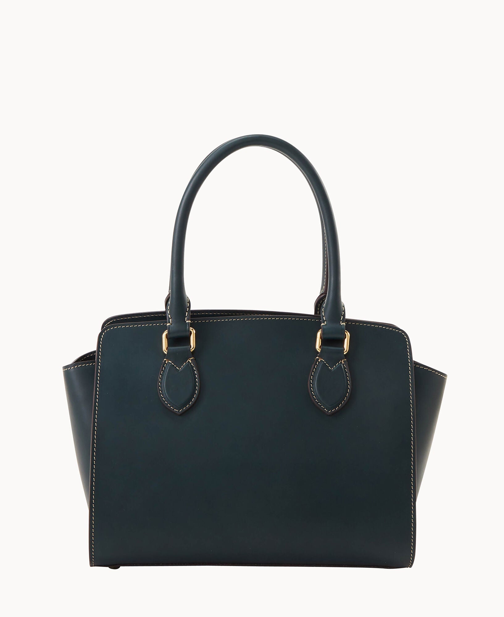 Two inside slip pockets. One inside zip pocket. One cell phone pocket. Removable medallion. Strap drop length 6". Lined. Feet. Zipper closure.