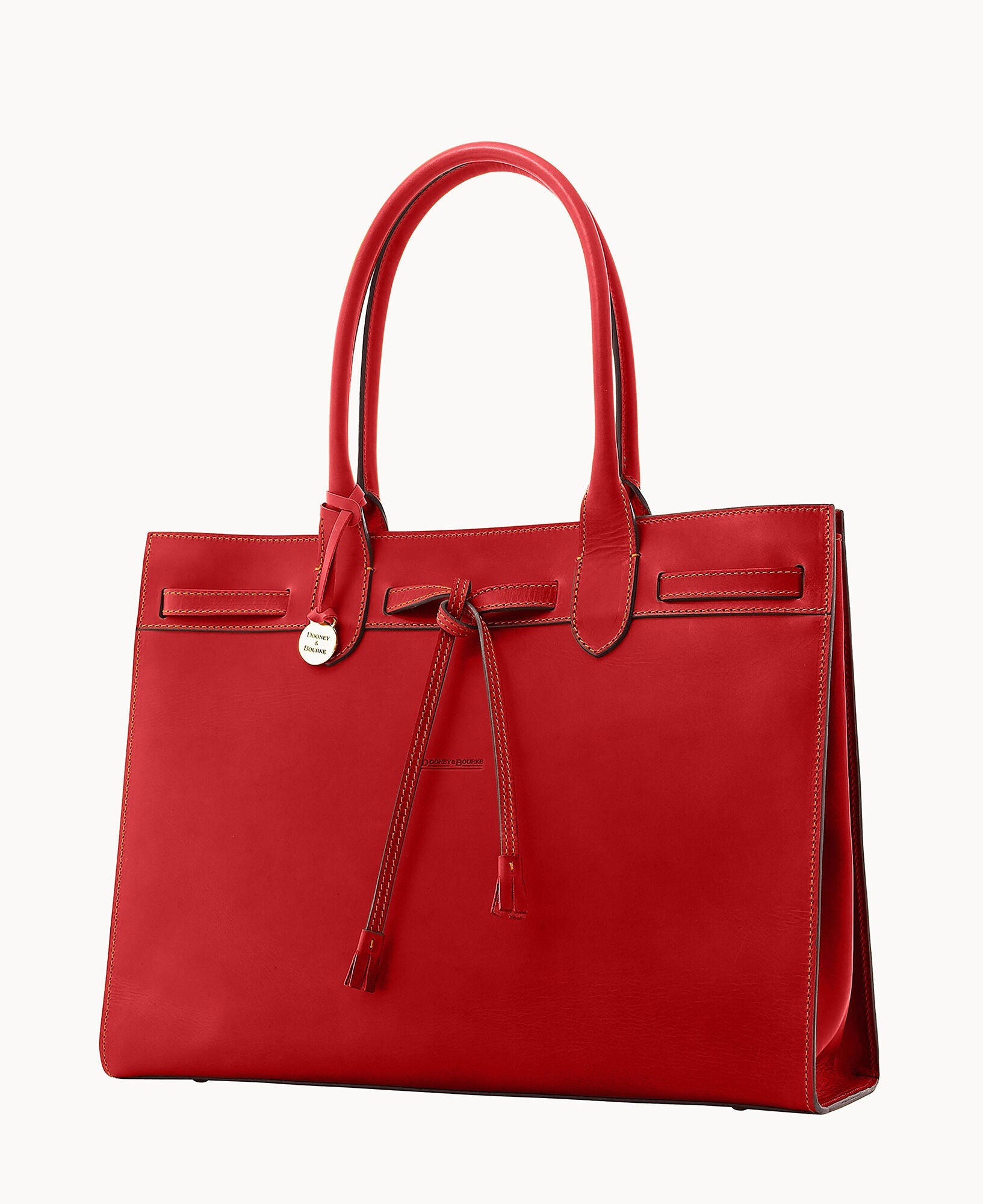 One outside zip pocket. One inside pocket. Cell phone pocket. Handle drop length 4.5". Feet. Magnetic snap closure.