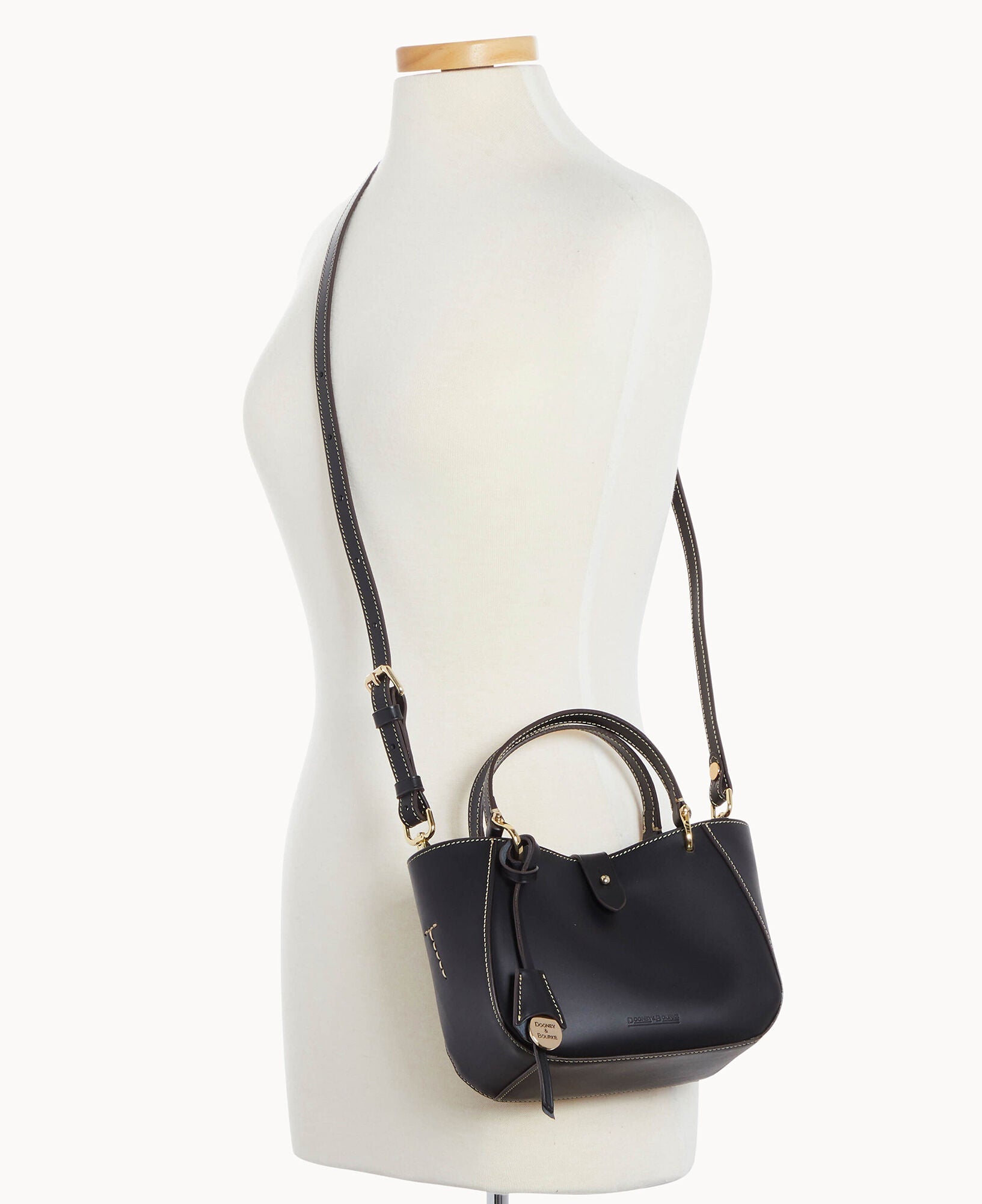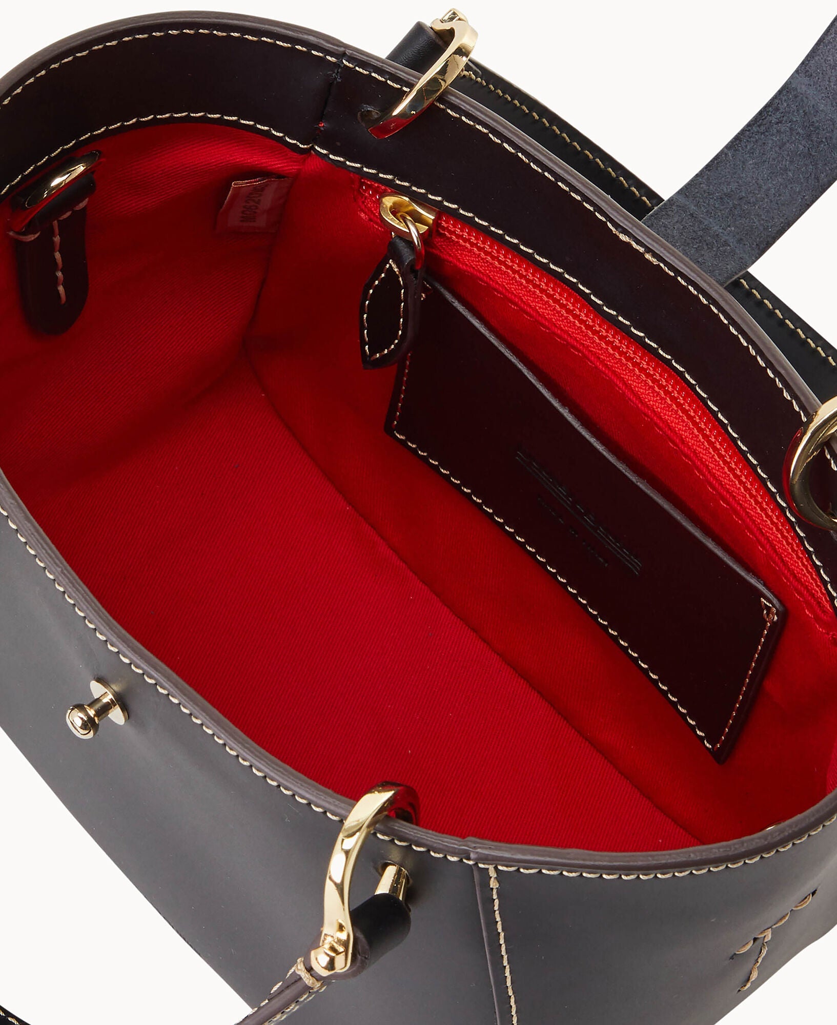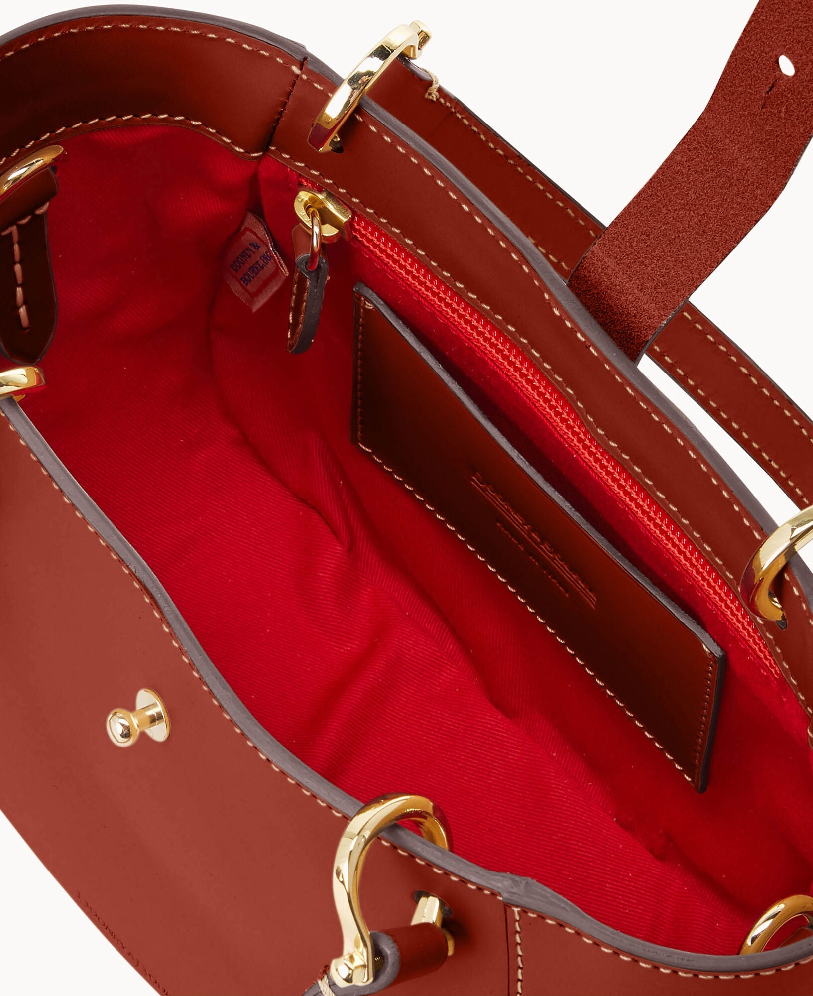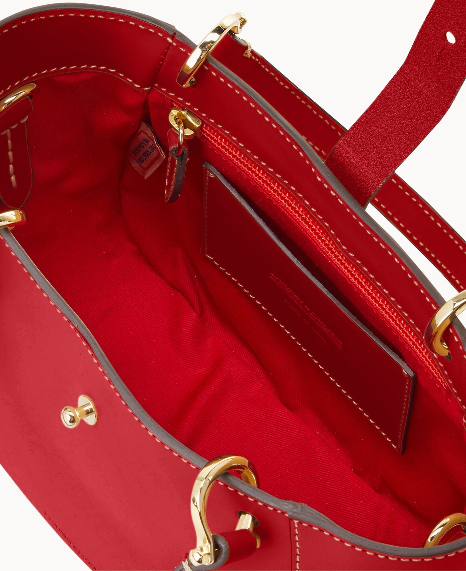 One inside zip pocket. Credit card slot. Handle drop length 4.5". Adjustable, detachable shoulder strap. Strap drop length 22.25". Tongue tab buckle closure.