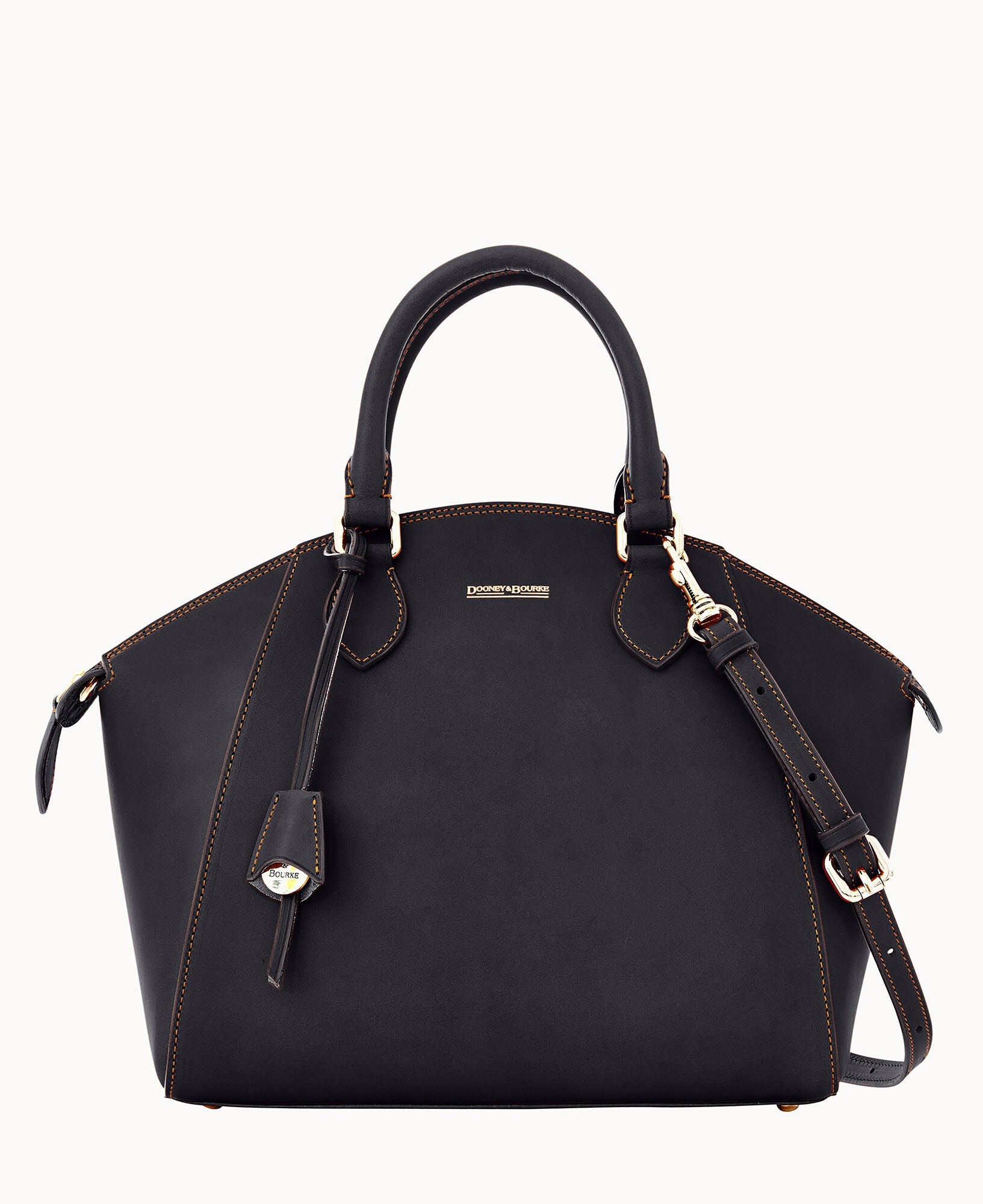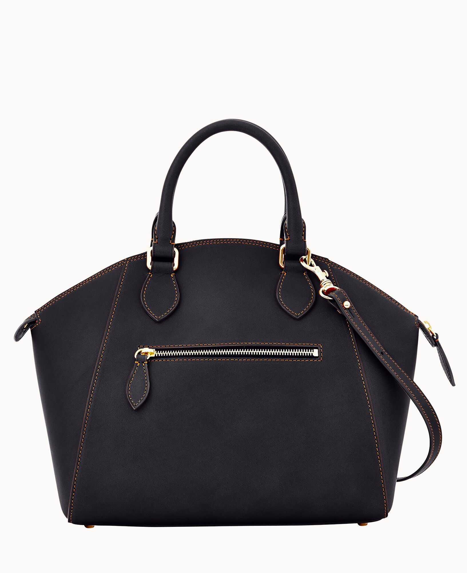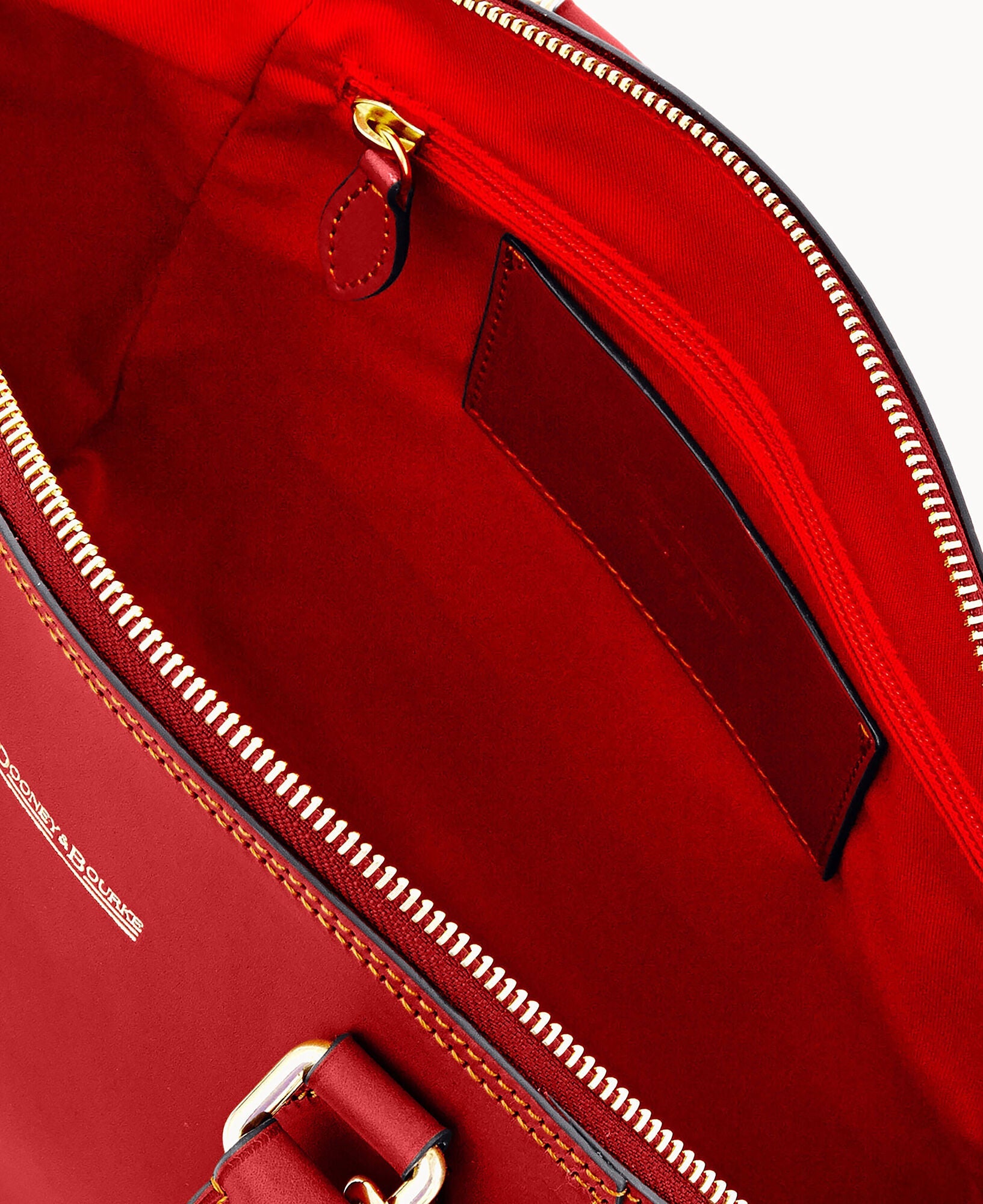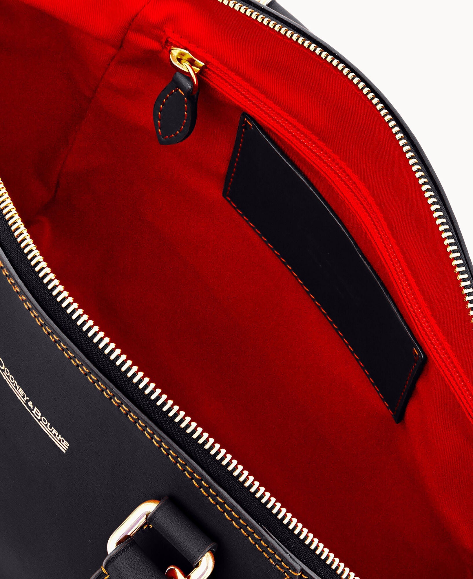 One outside zip pocket. One inside zip pocket. One inside pocket. Cell phone pocket. Handle drop length 4". Adjustable, detachable shoulder strap. Strap drop length 19". Lined. Feet. Zipper closure.