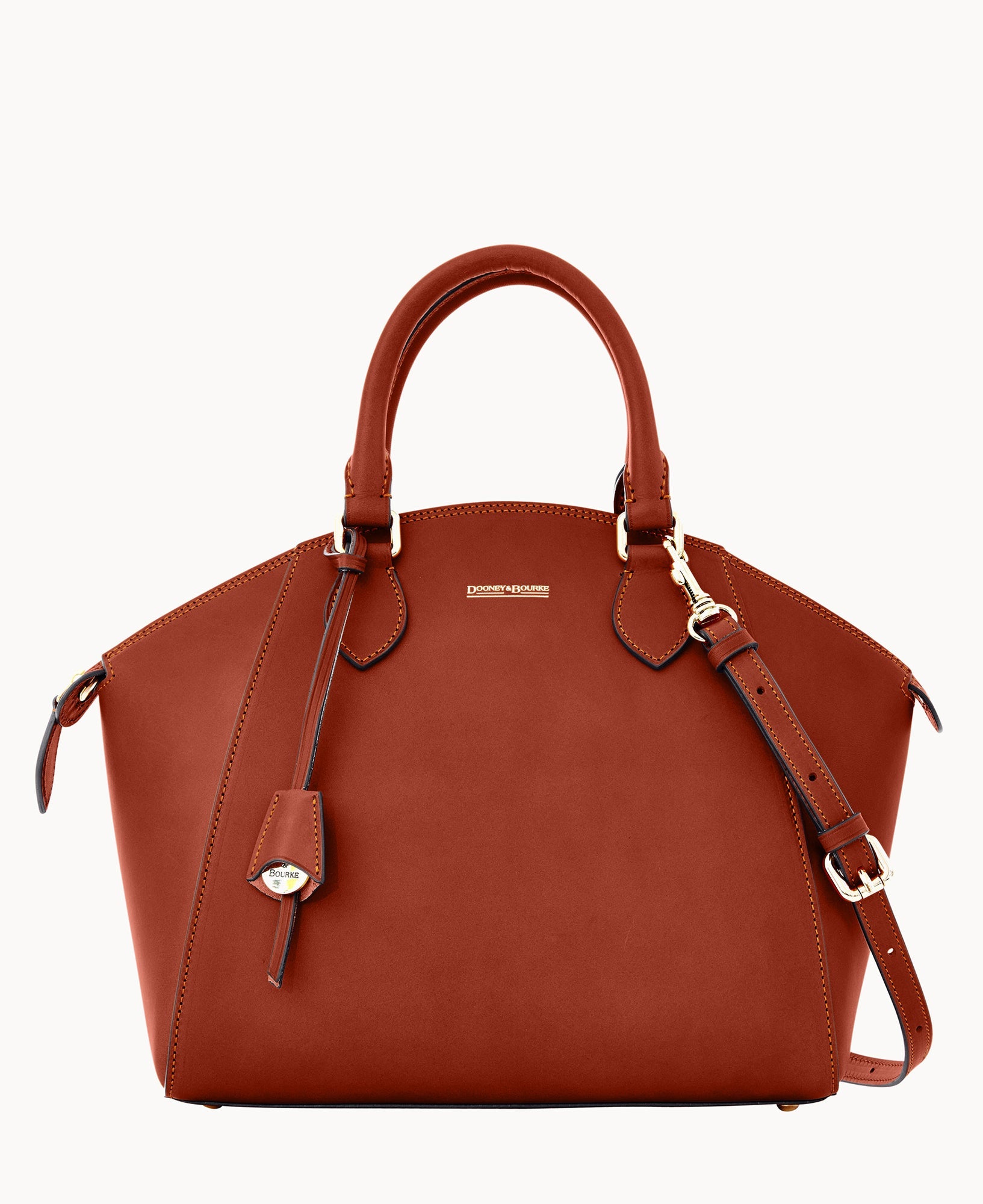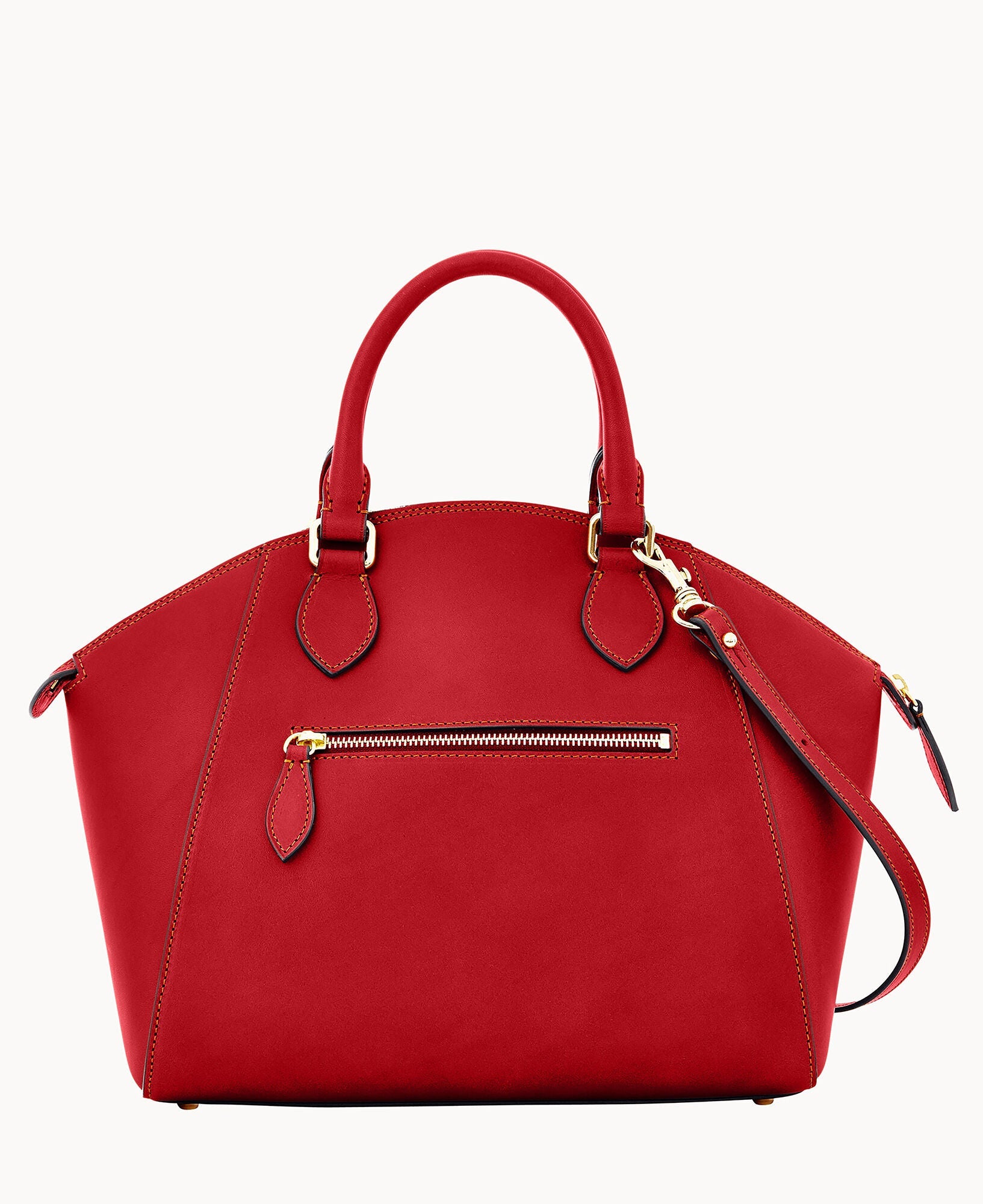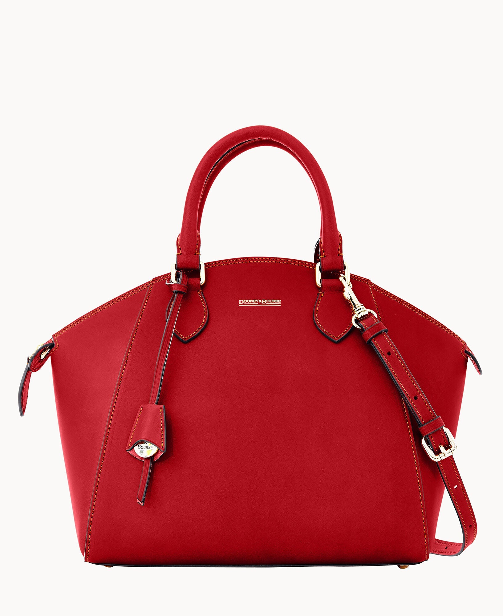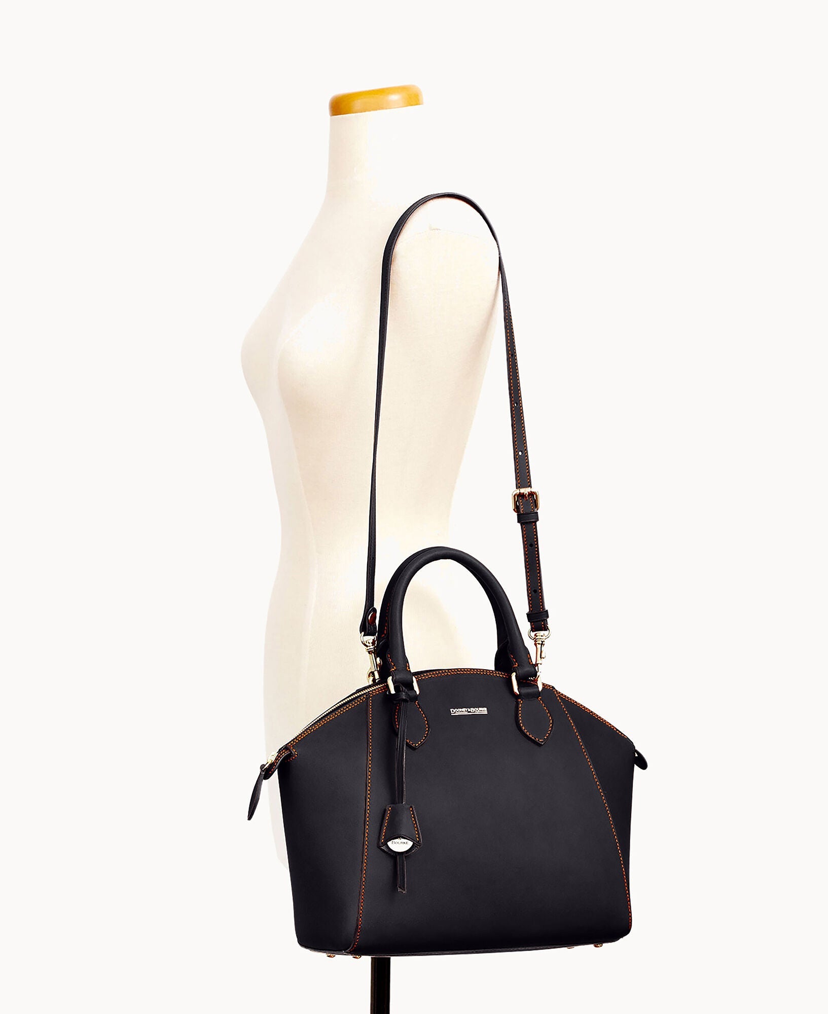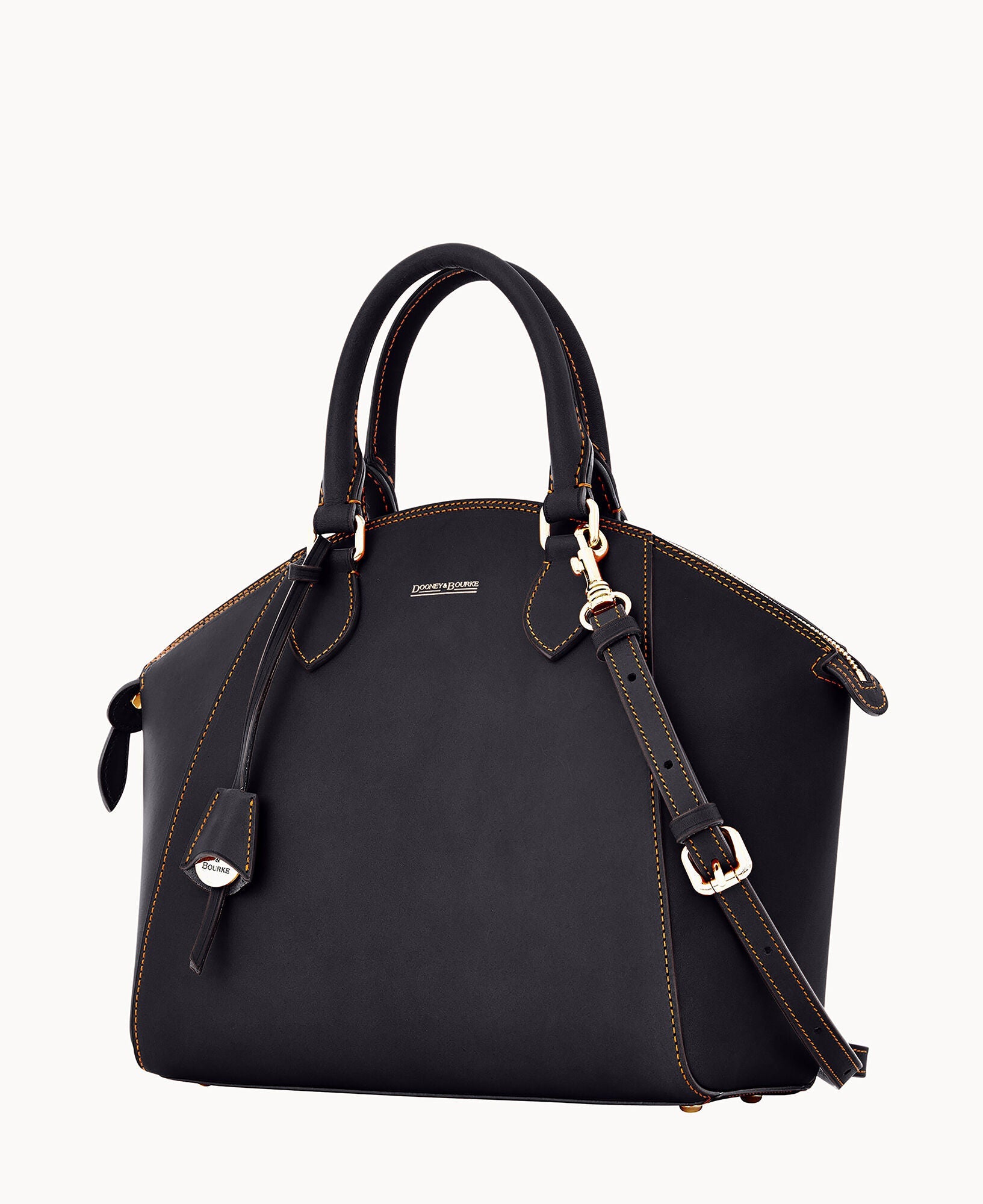 One outside zip pocket. One inside zip pocket. One inside pocket. Cell phone pocket. Handle drop length 4". Adjustable, detachable shoulder strap. Strap drop length 19". Lined. Feet. Zipper closure.