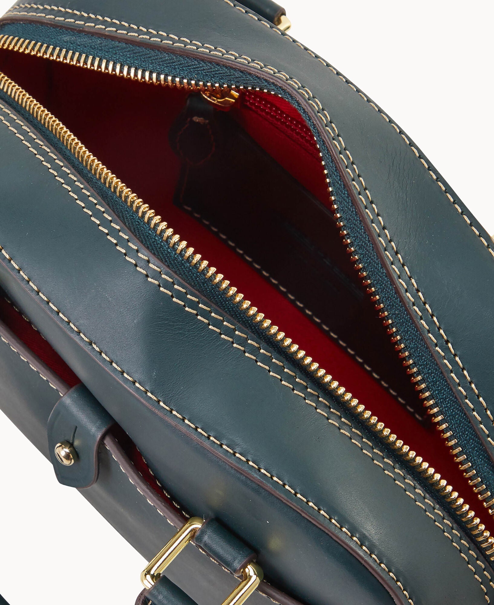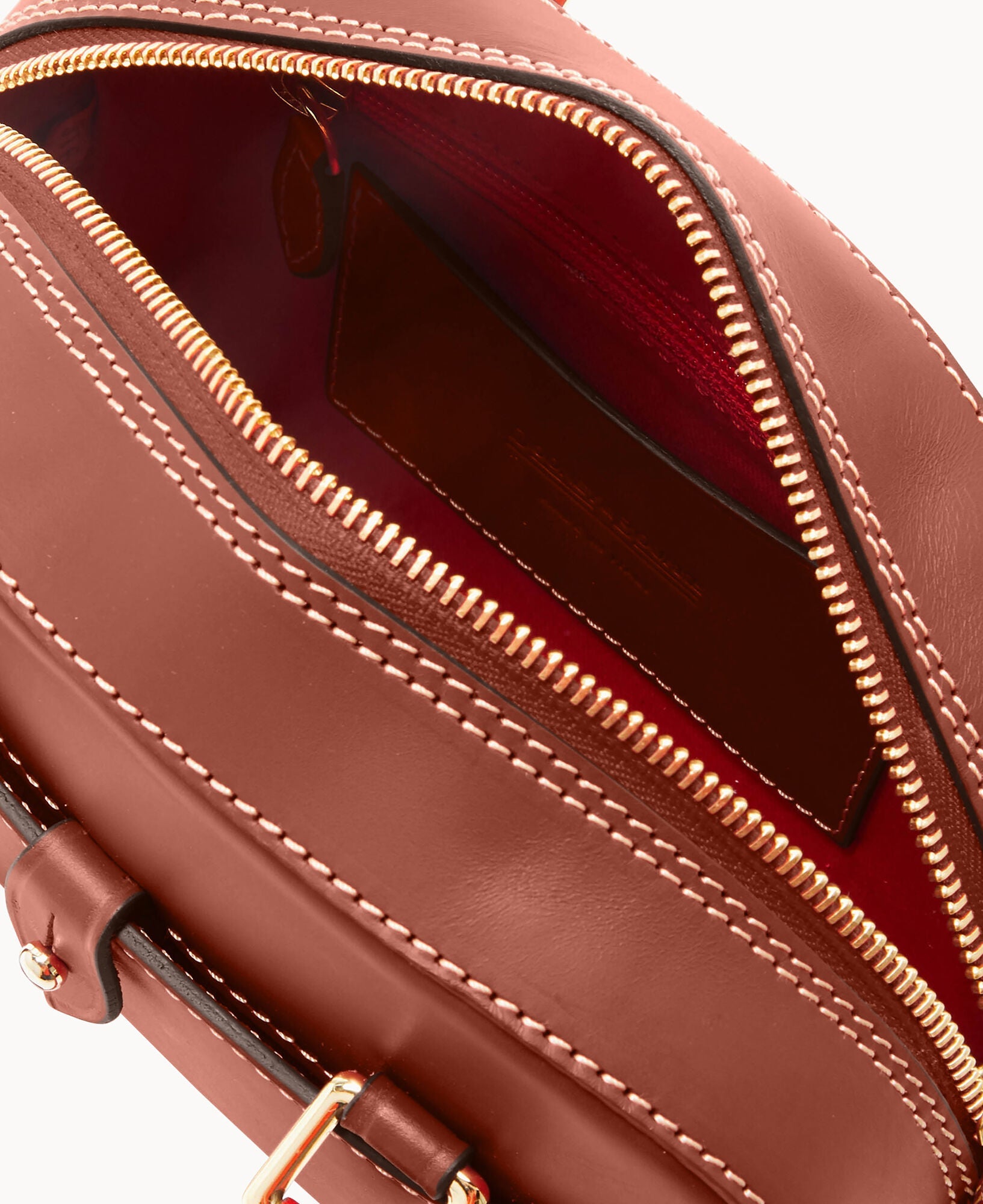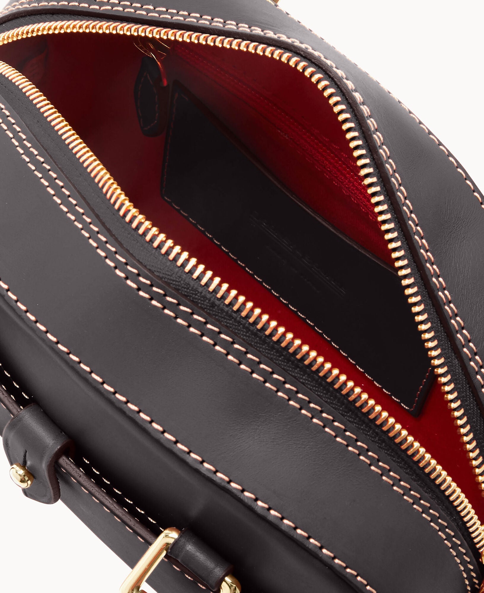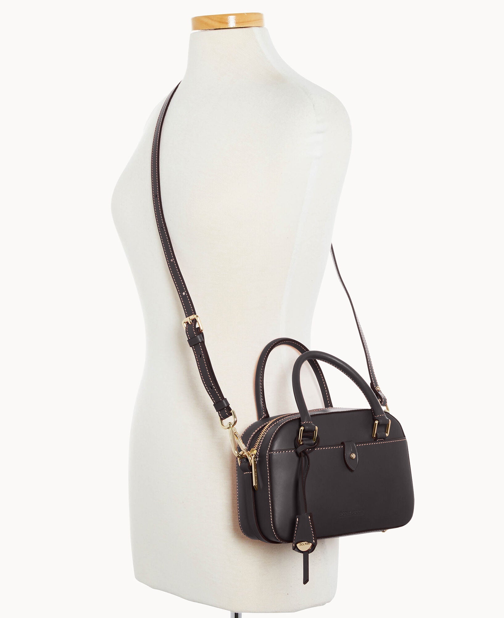 One outside pocket with tongue tab closure. One inside slip pocket. One inside zip pocket. Strap drop length 23". Handle drop length 3.25". Adjustable and detachable strap. Removable medallion. Lined. Feet. Zipper closure.