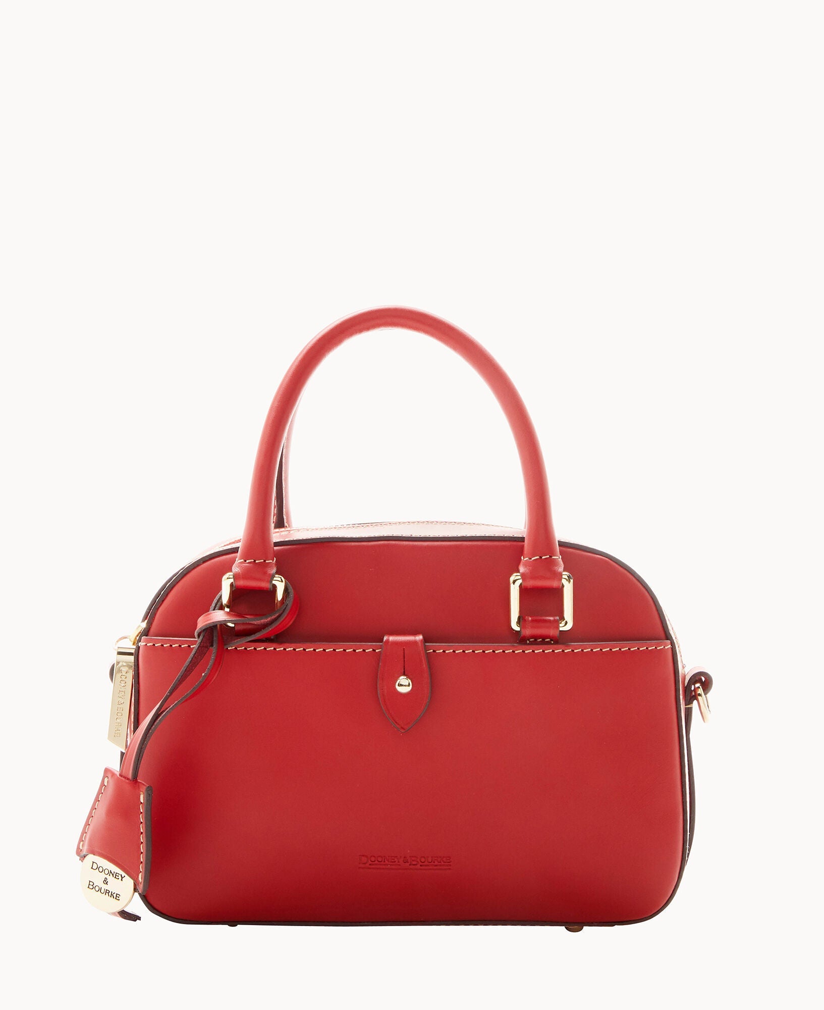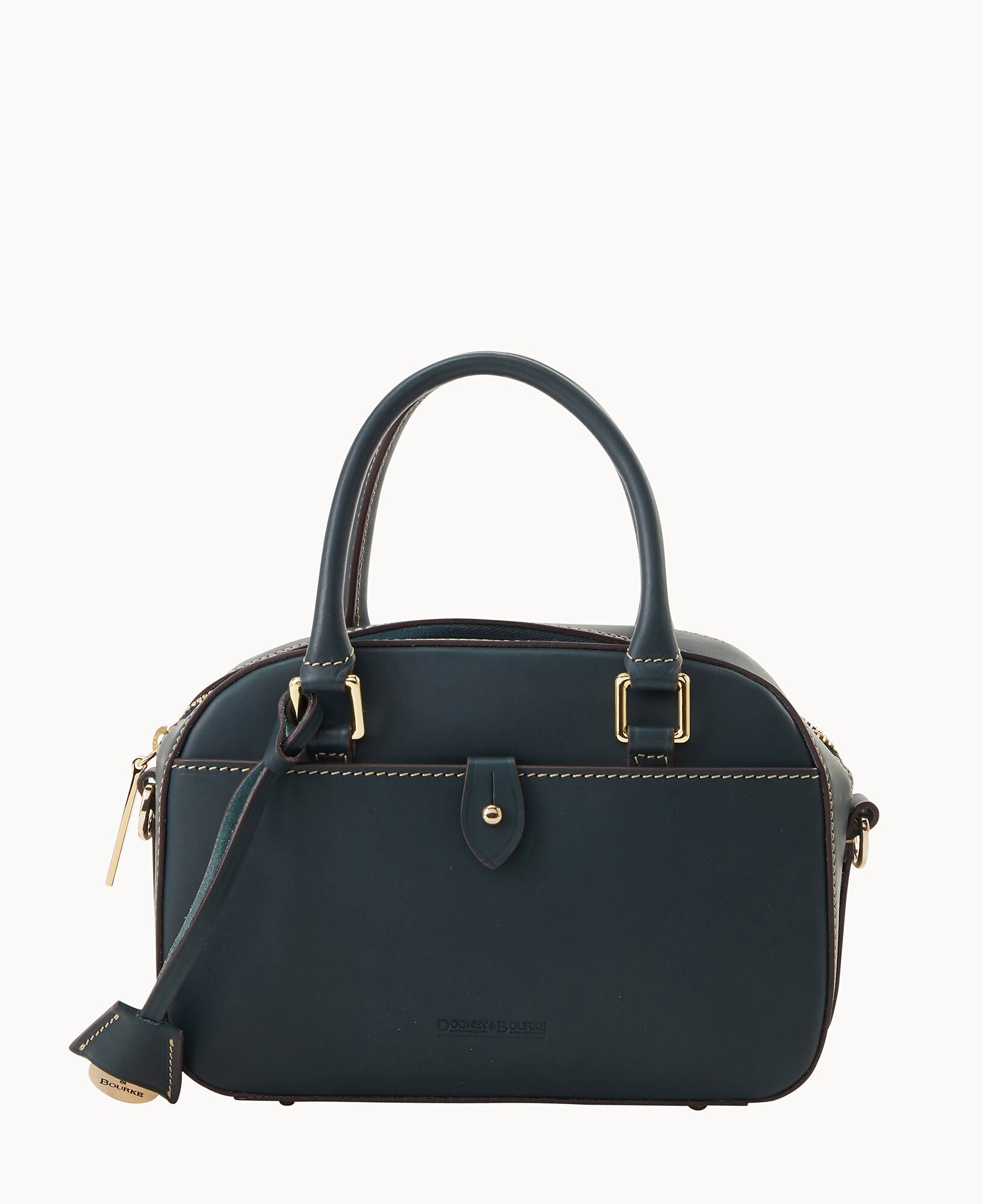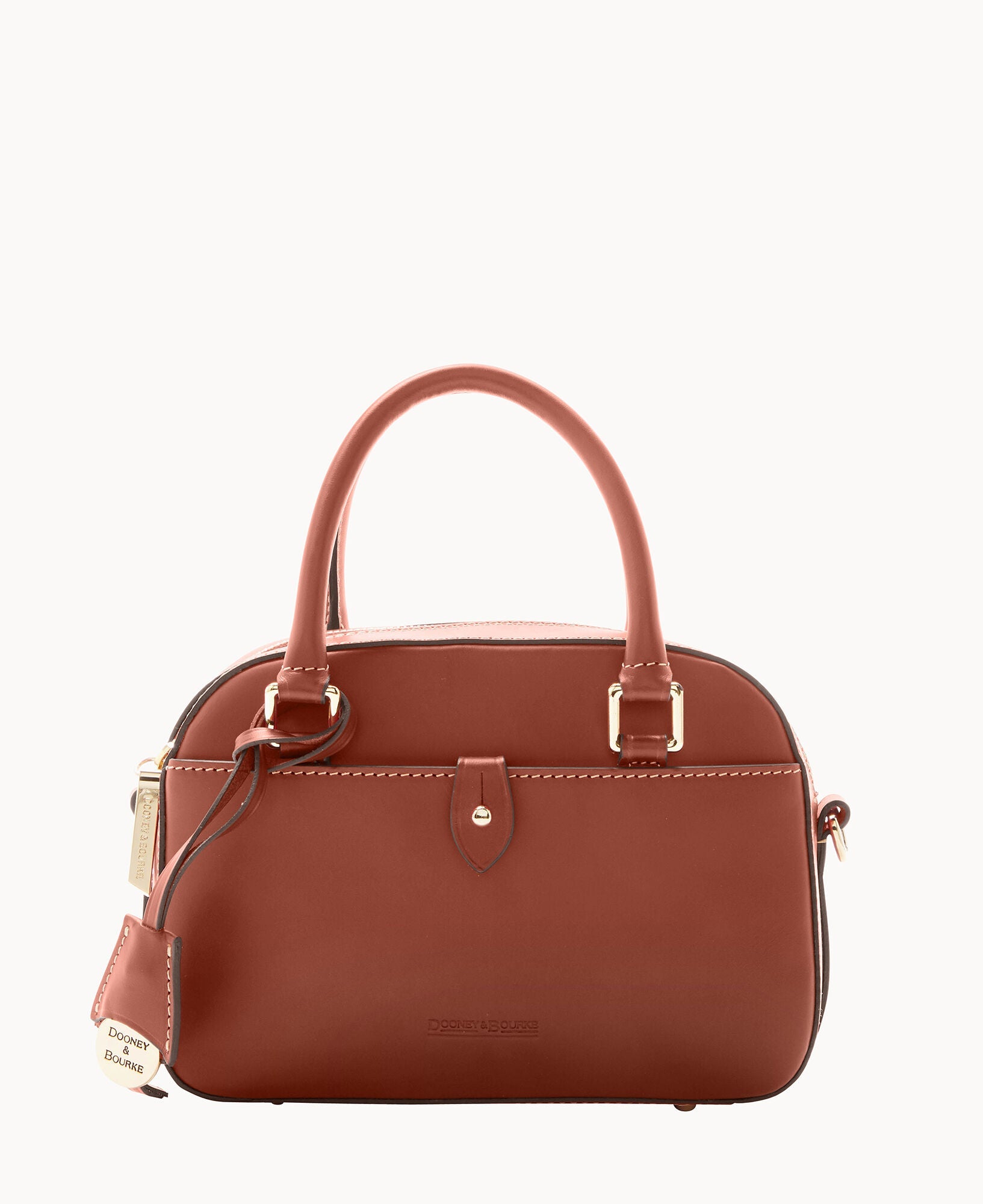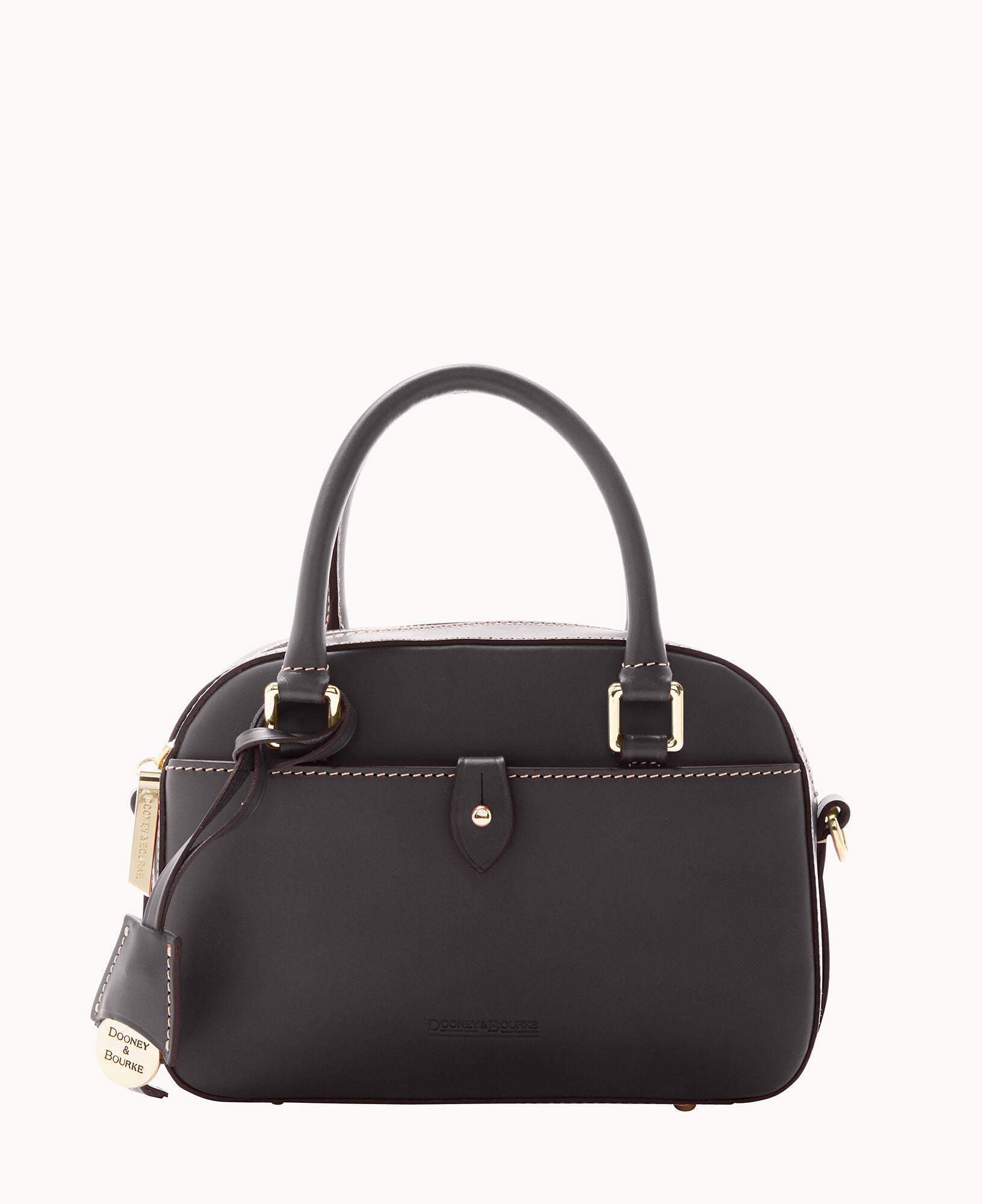 One outside pocket with tongue tab closure. One inside slip pocket. One inside zip pocket. Strap drop length 23". Handle drop length 3.25". Adjustable and detachable strap. Removable medallion. Lined. Feet. Zipper closure.