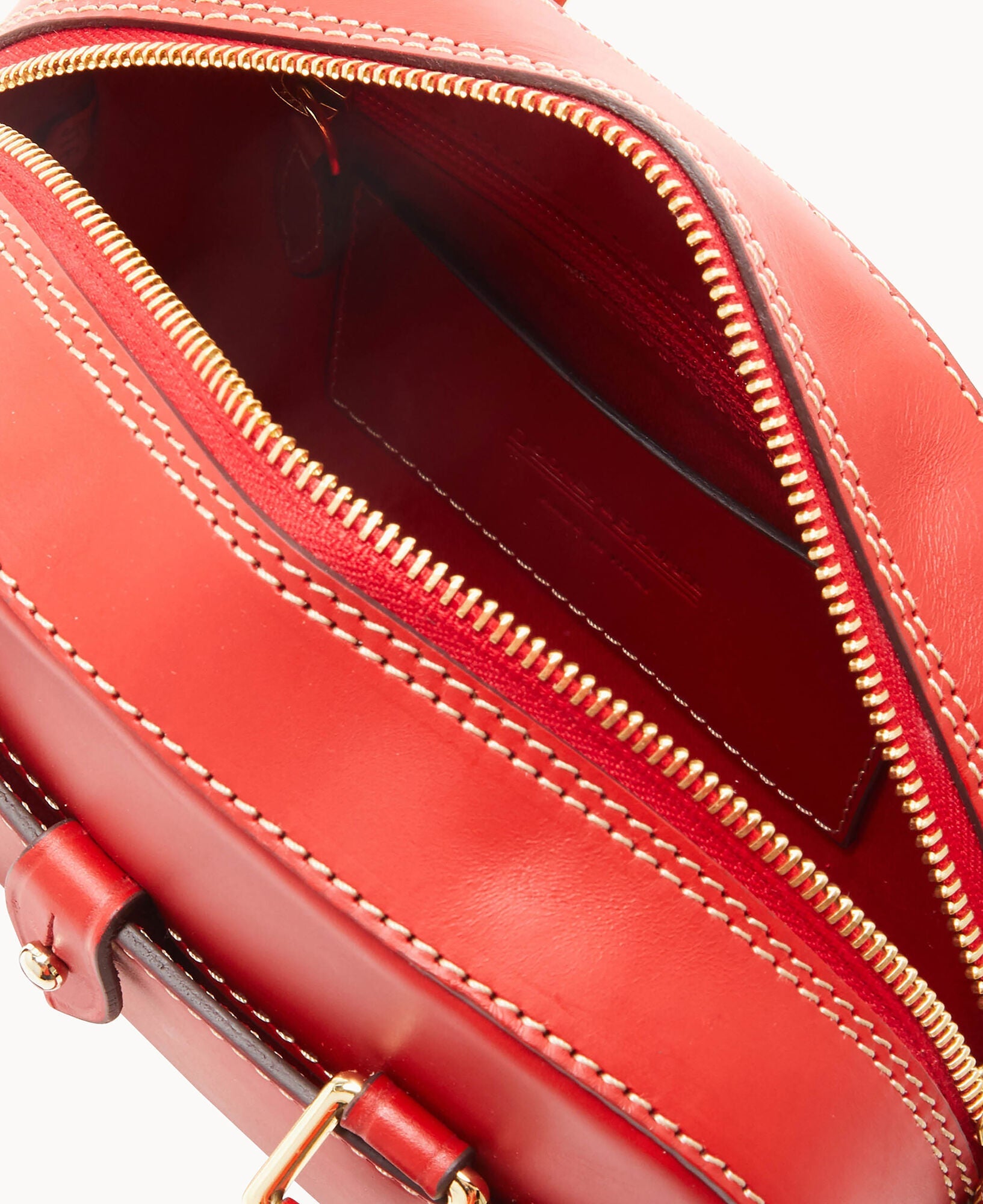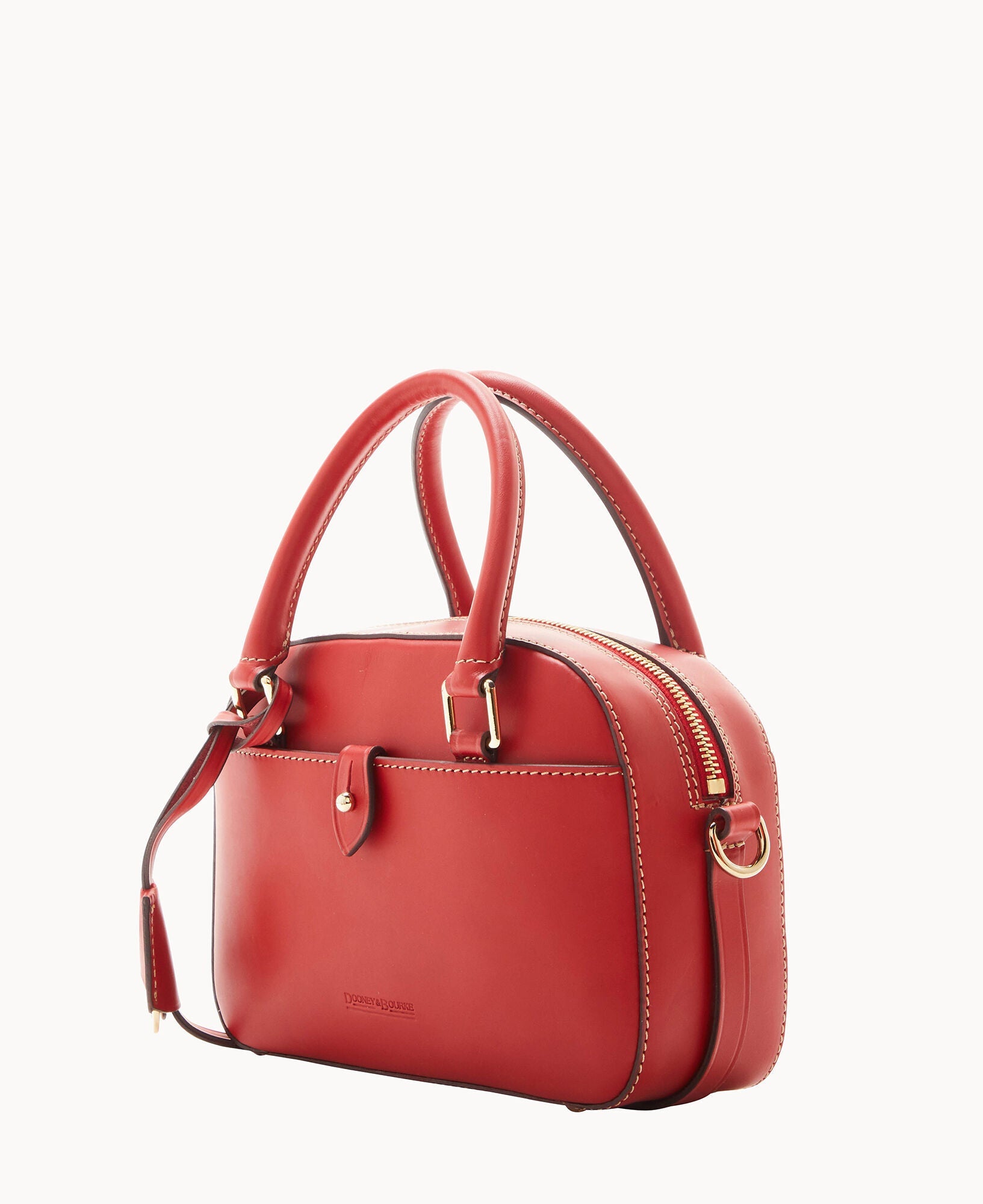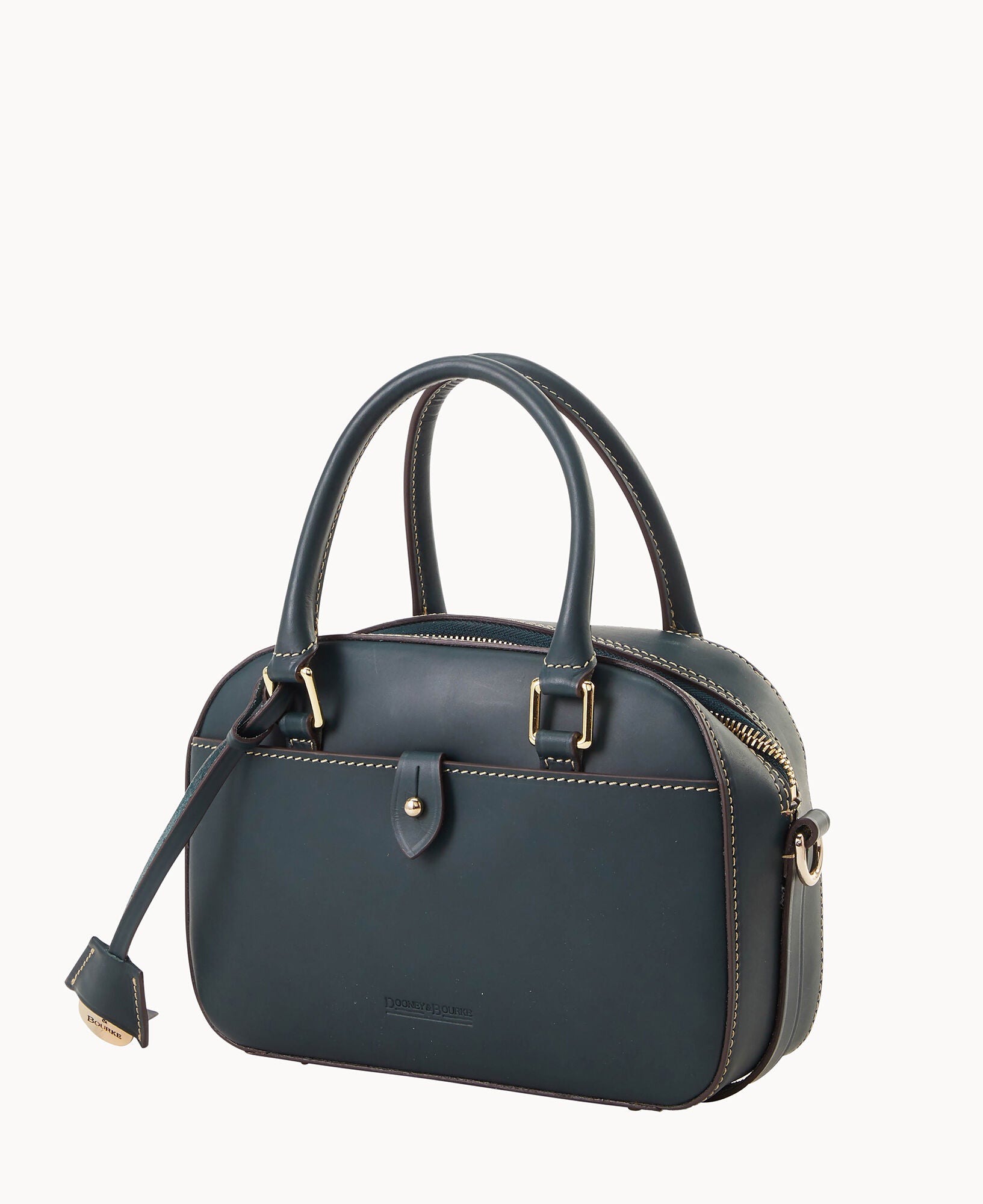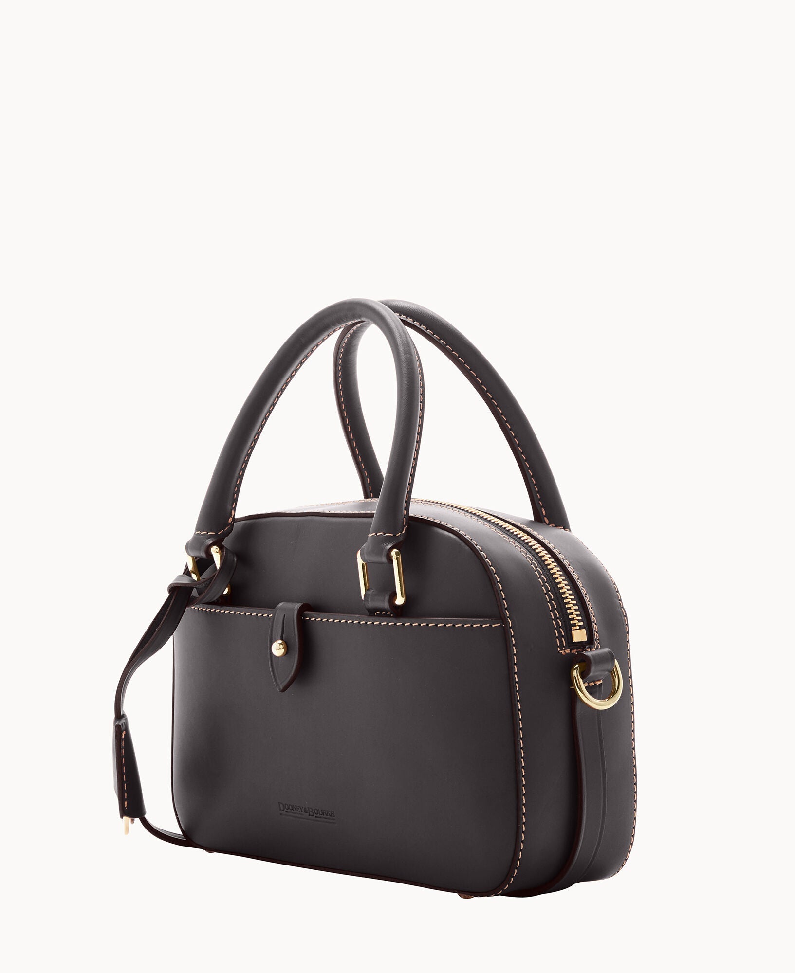 One outside pocket with tongue tab closure. One inside slip pocket. One inside zip pocket. Strap drop length 23". Handle drop length 3.25". Adjustable and detachable strap. Removable medallion. Lined. Feet. Zipper closure.