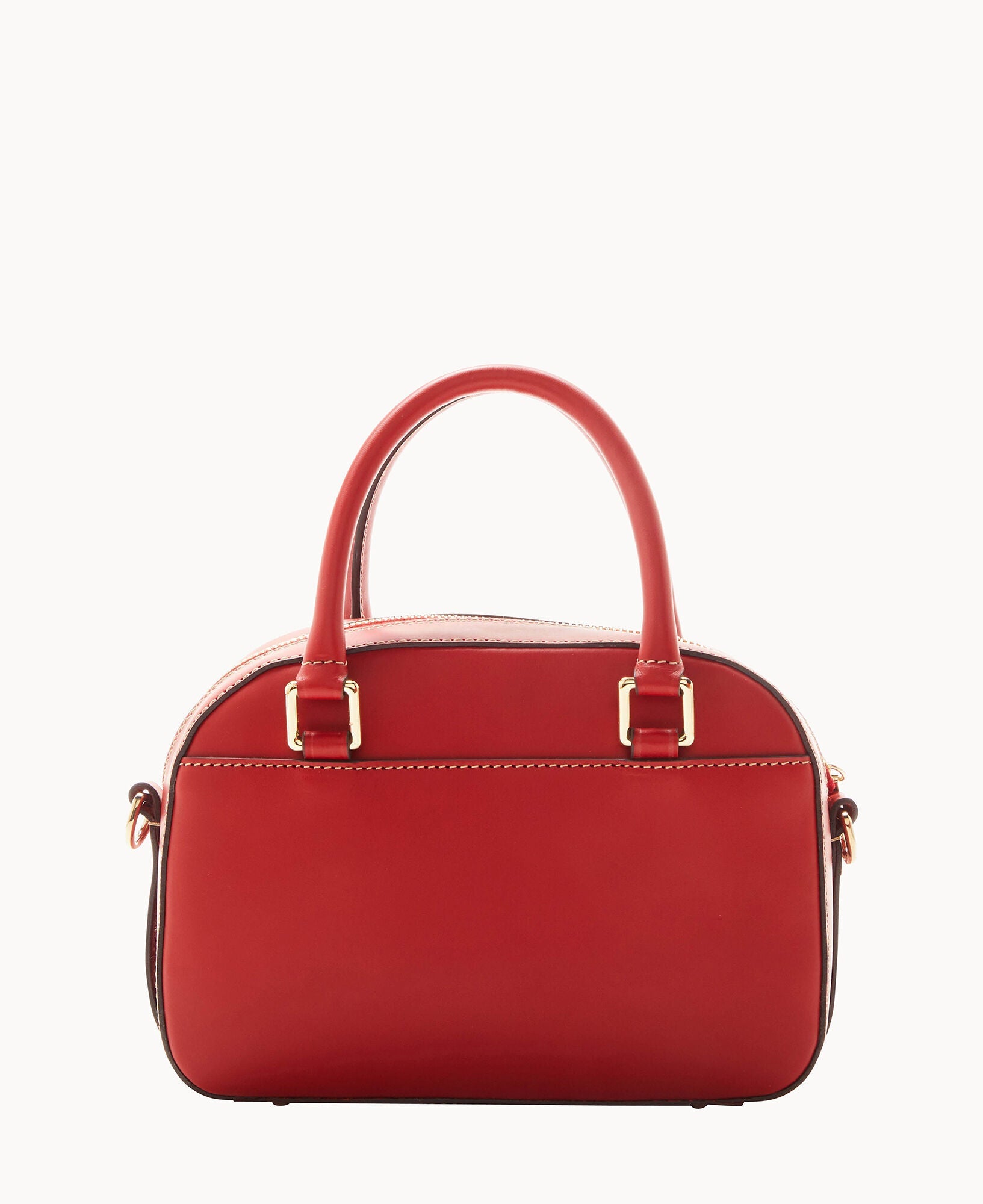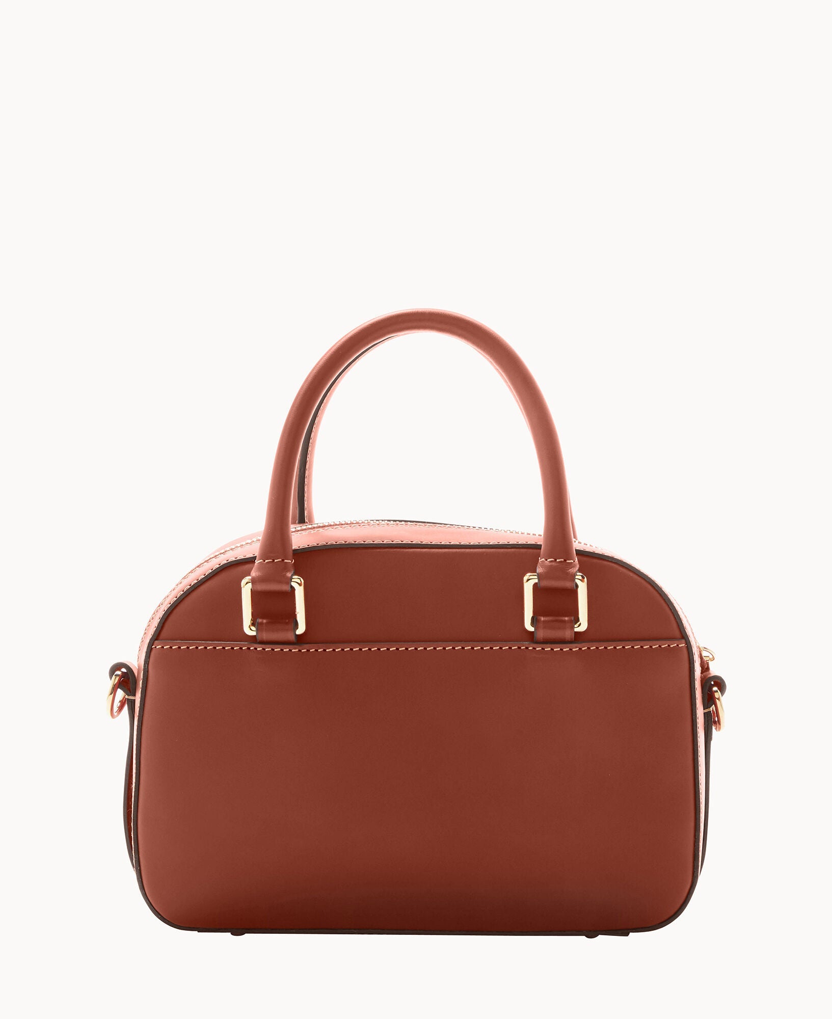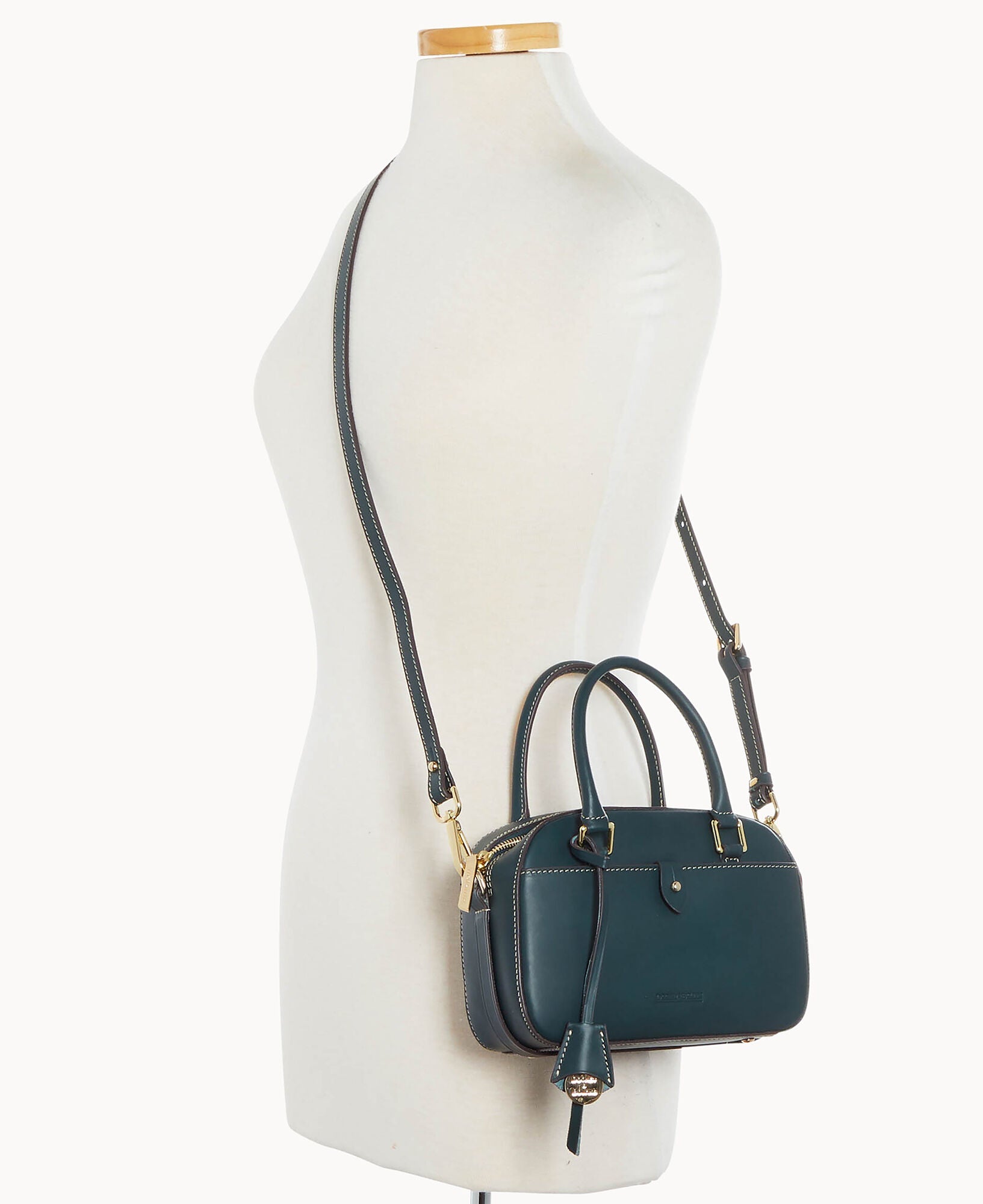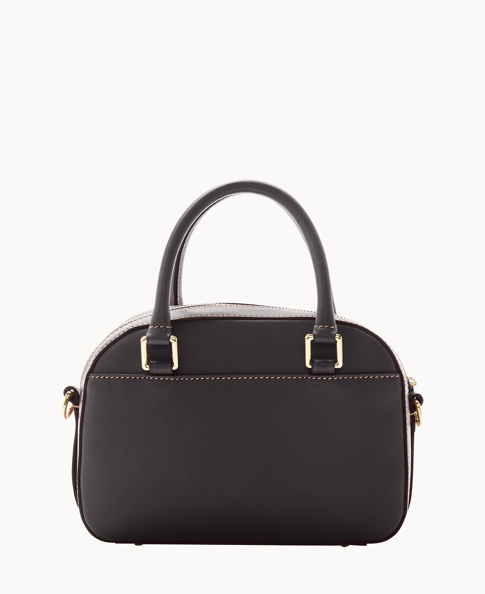 One outside pocket with tongue tab closure. One inside slip pocket. One inside zip pocket. Strap drop length 23". Handle drop length 3.25". Adjustable and detachable strap. Removable medallion. Lined. Feet. Zipper closure.