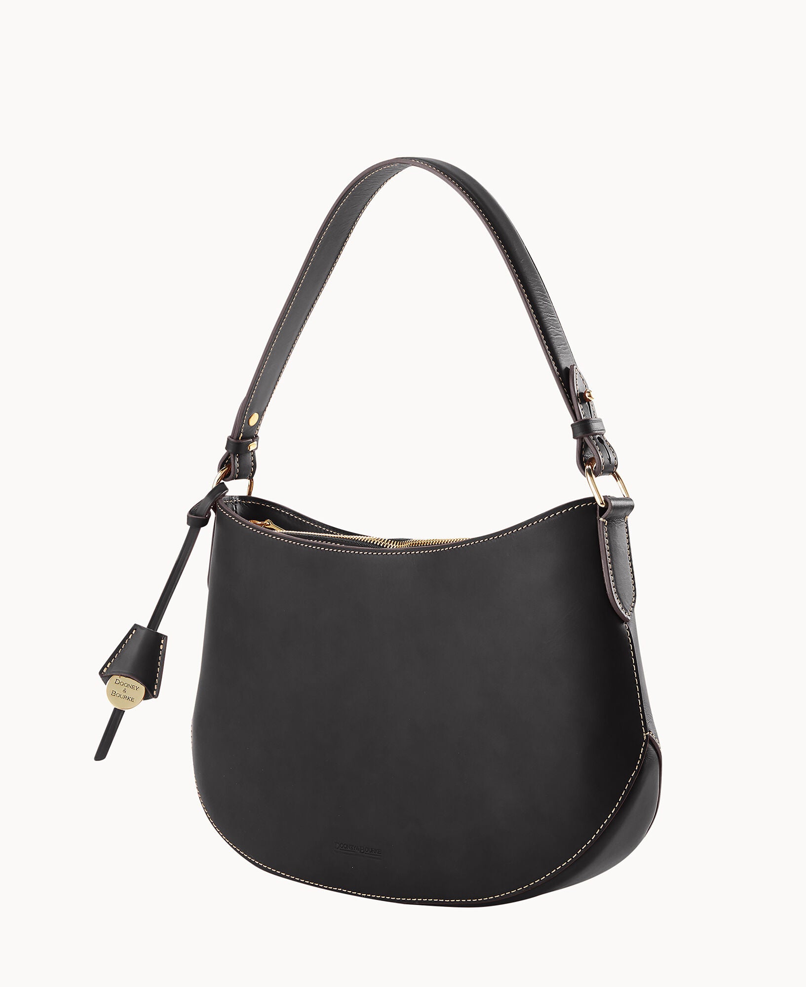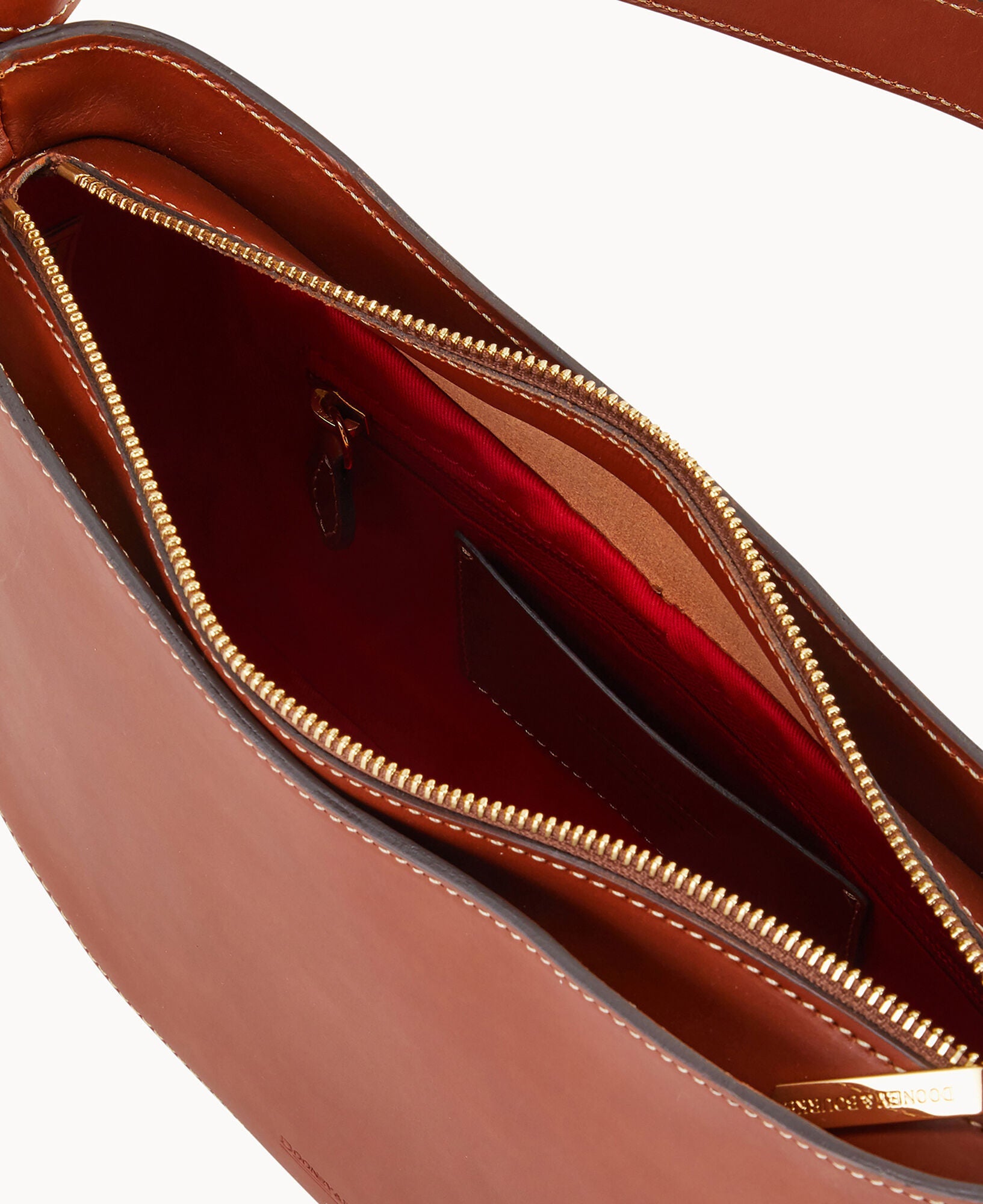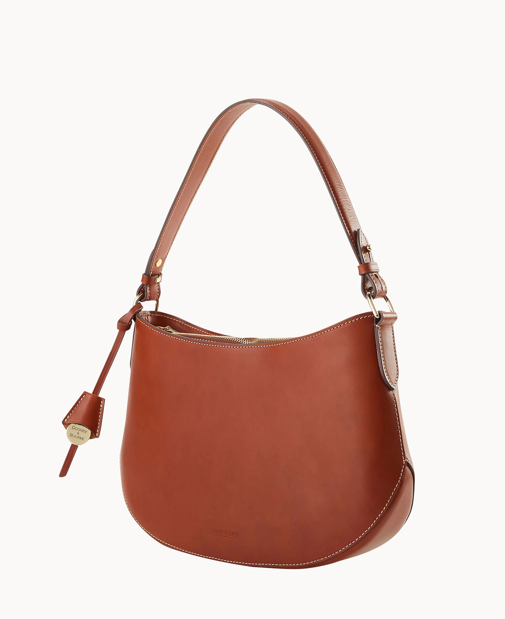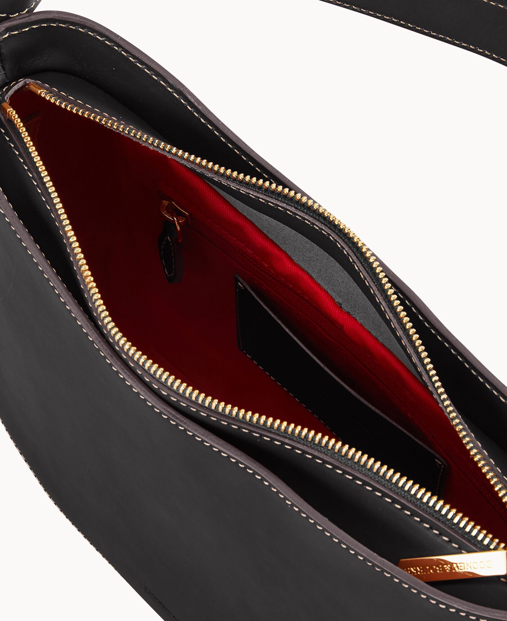 One inside pocket. One inside zipper pocket. One inside credit card slot. Shoulder strap drop length 10". Removable medallion. Lined. Zipper closure.