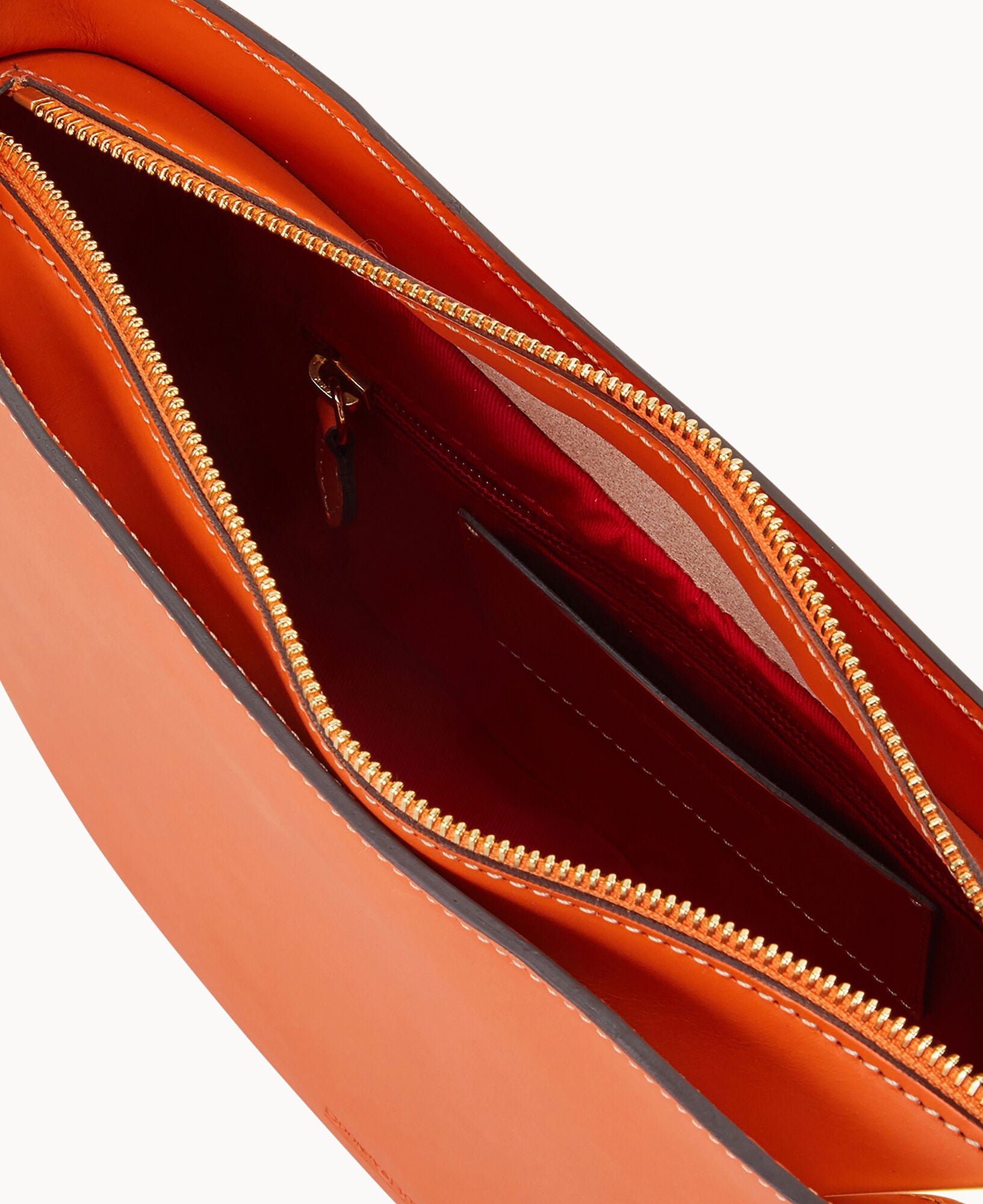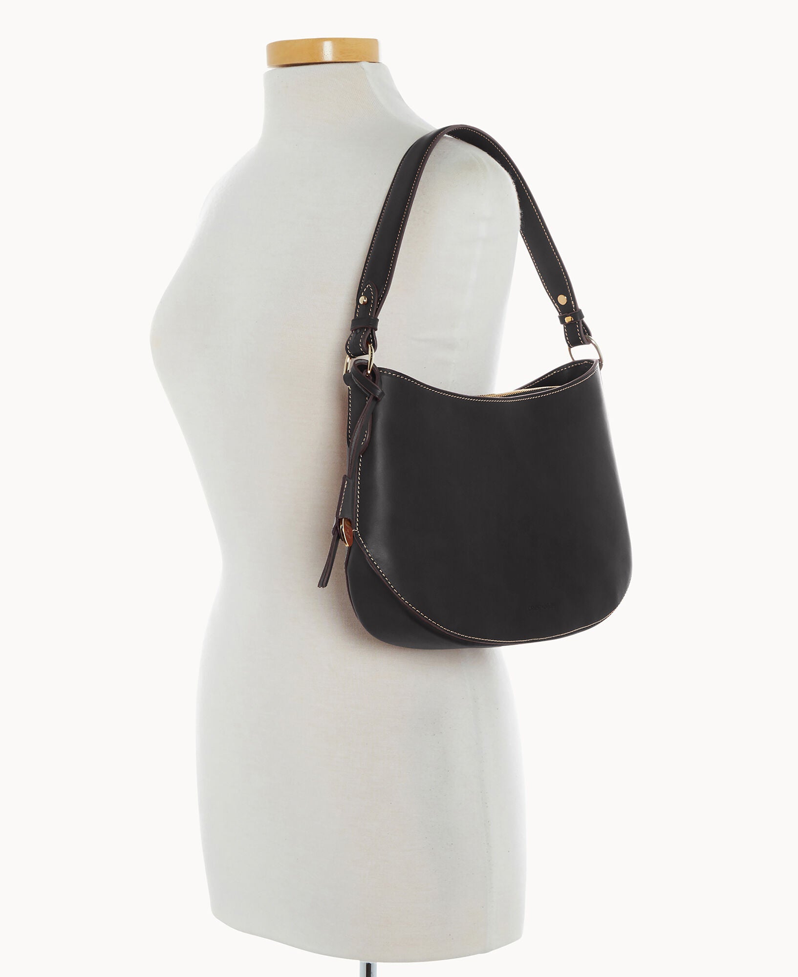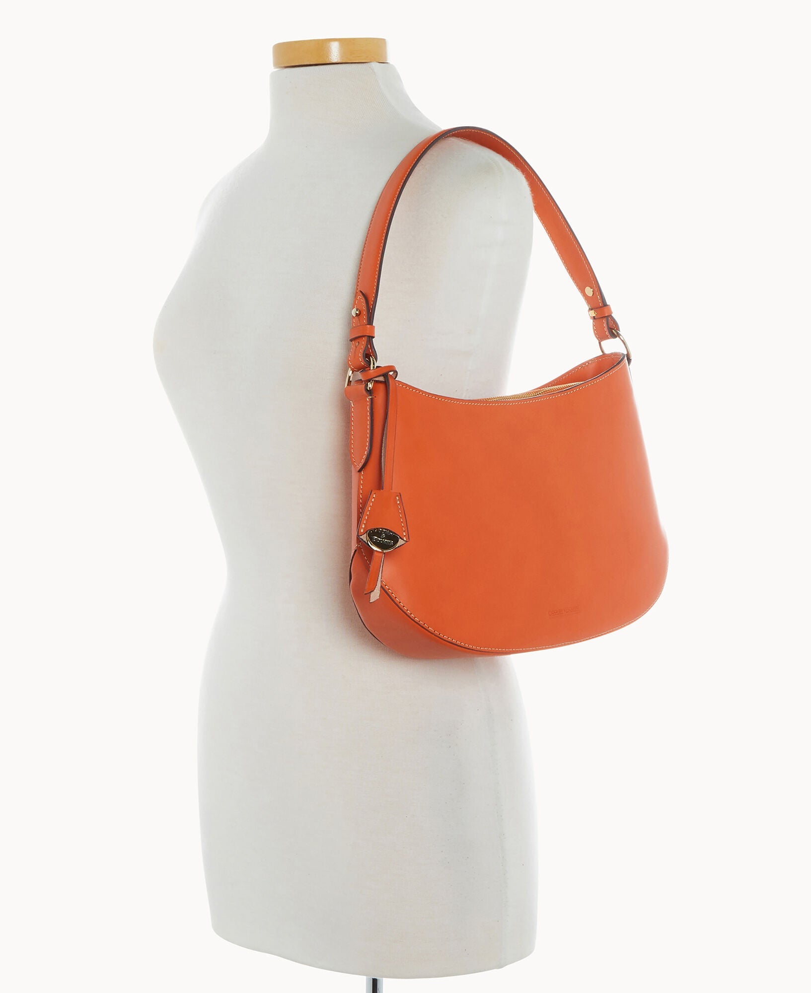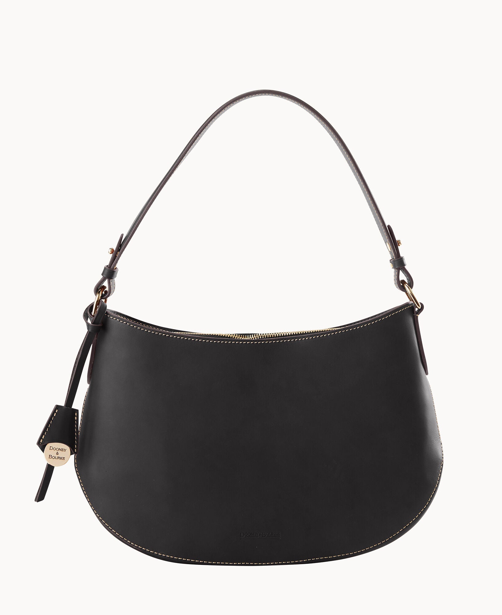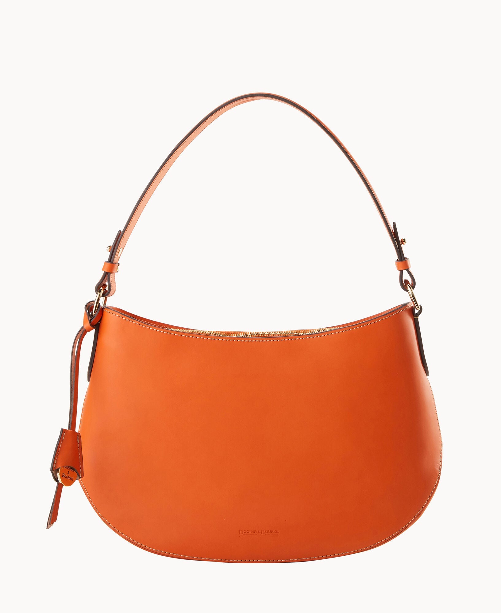One inside pocket. One inside zipper pocket. One inside credit card slot. Shoulder strap drop length 10". Removable medallion. Lined. Zipper closure.