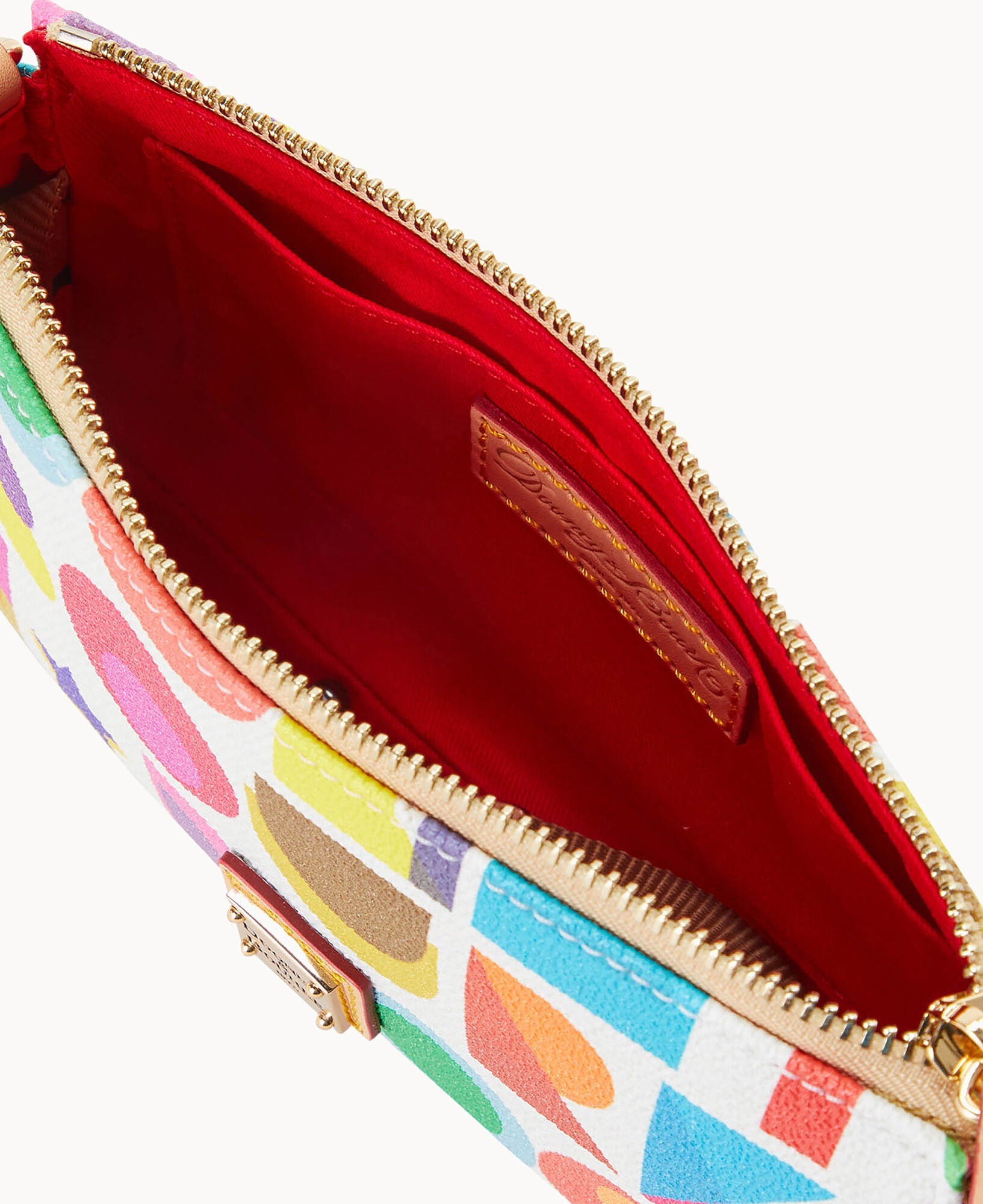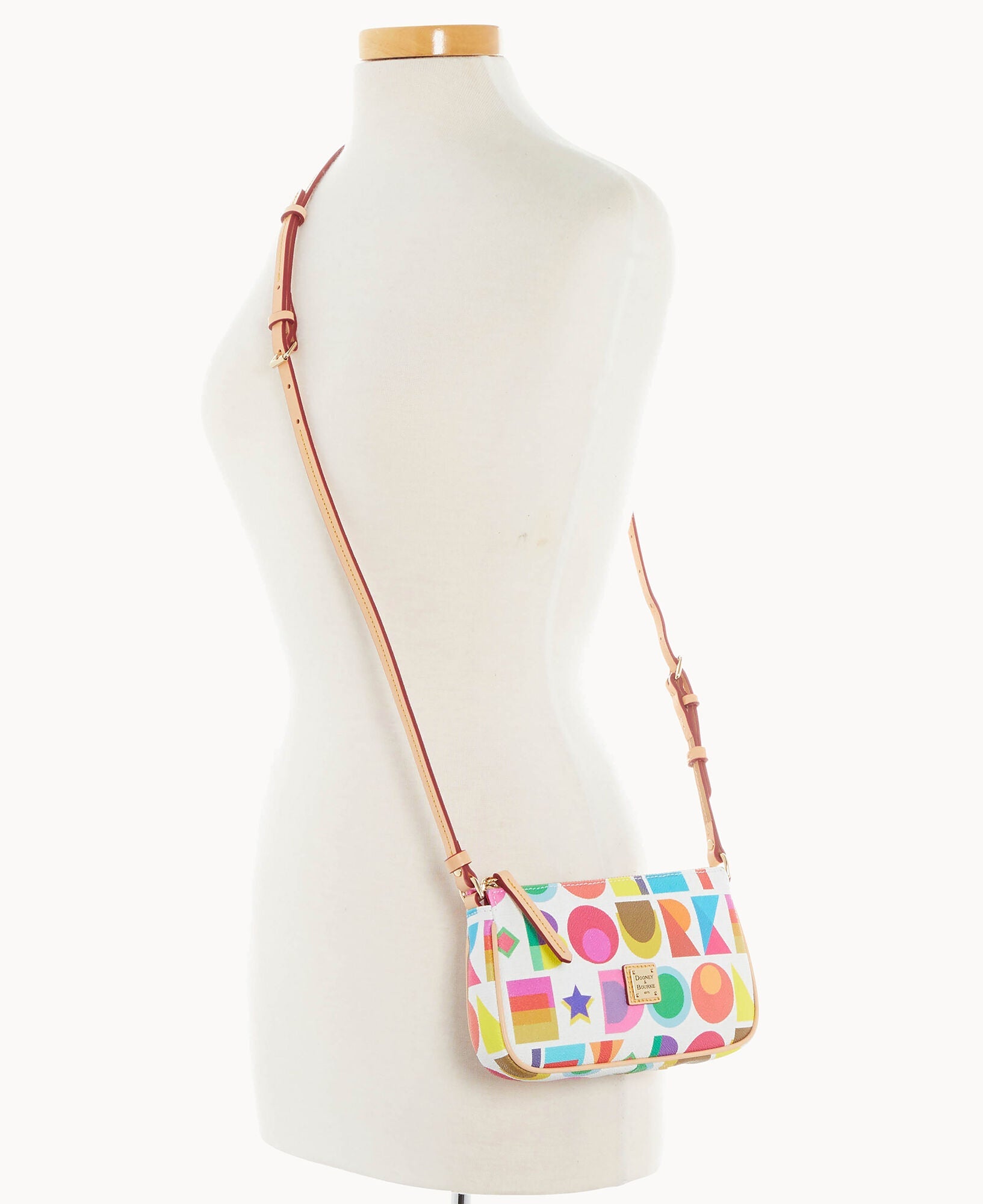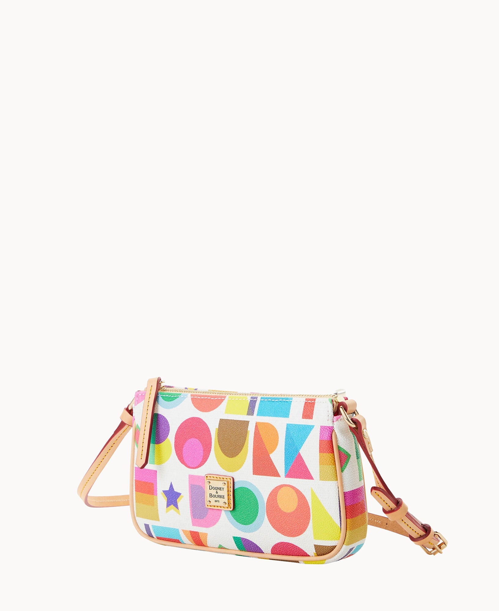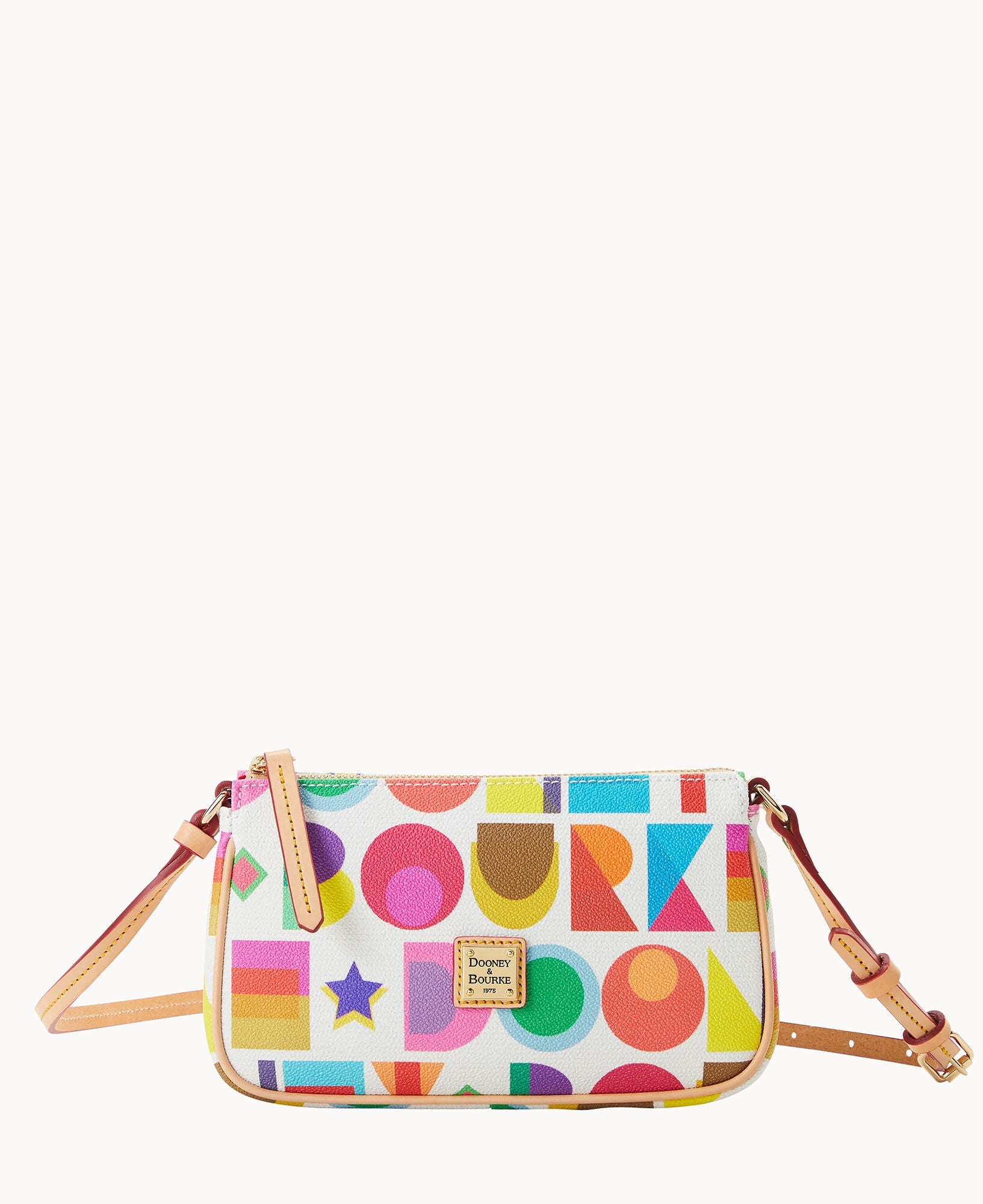 One inside zip pocket. Four credit card slots. Cell phone pocket. Inside key hook. Adjustable shoulder strap. Strap drop length 24.25". Lined. Zipper closure.