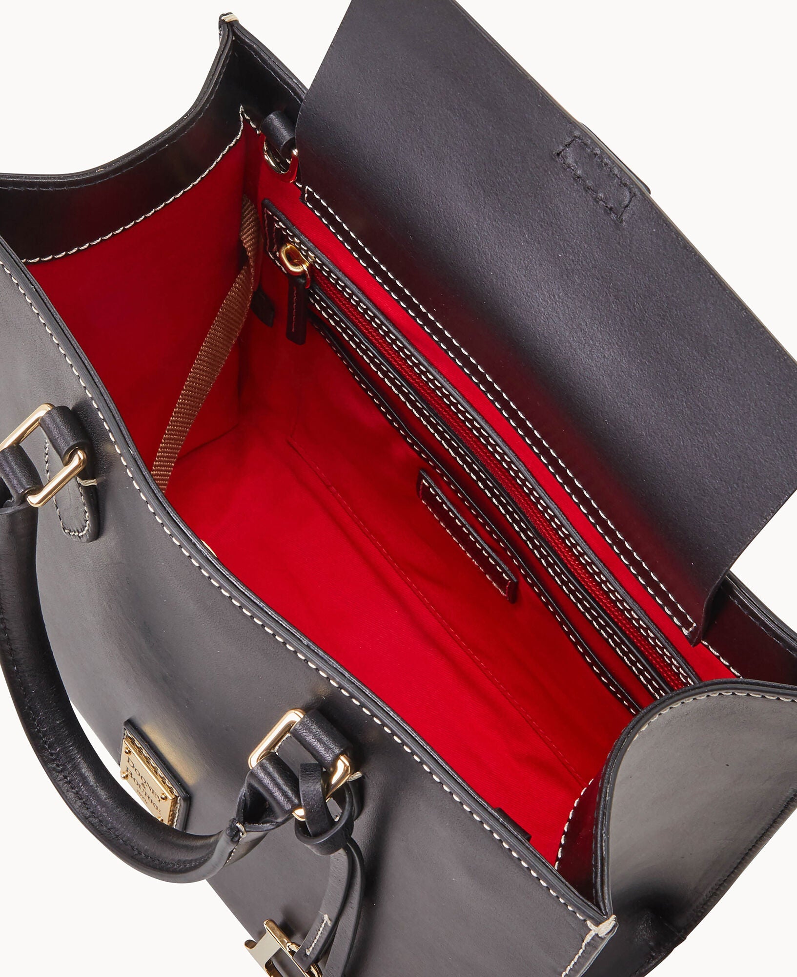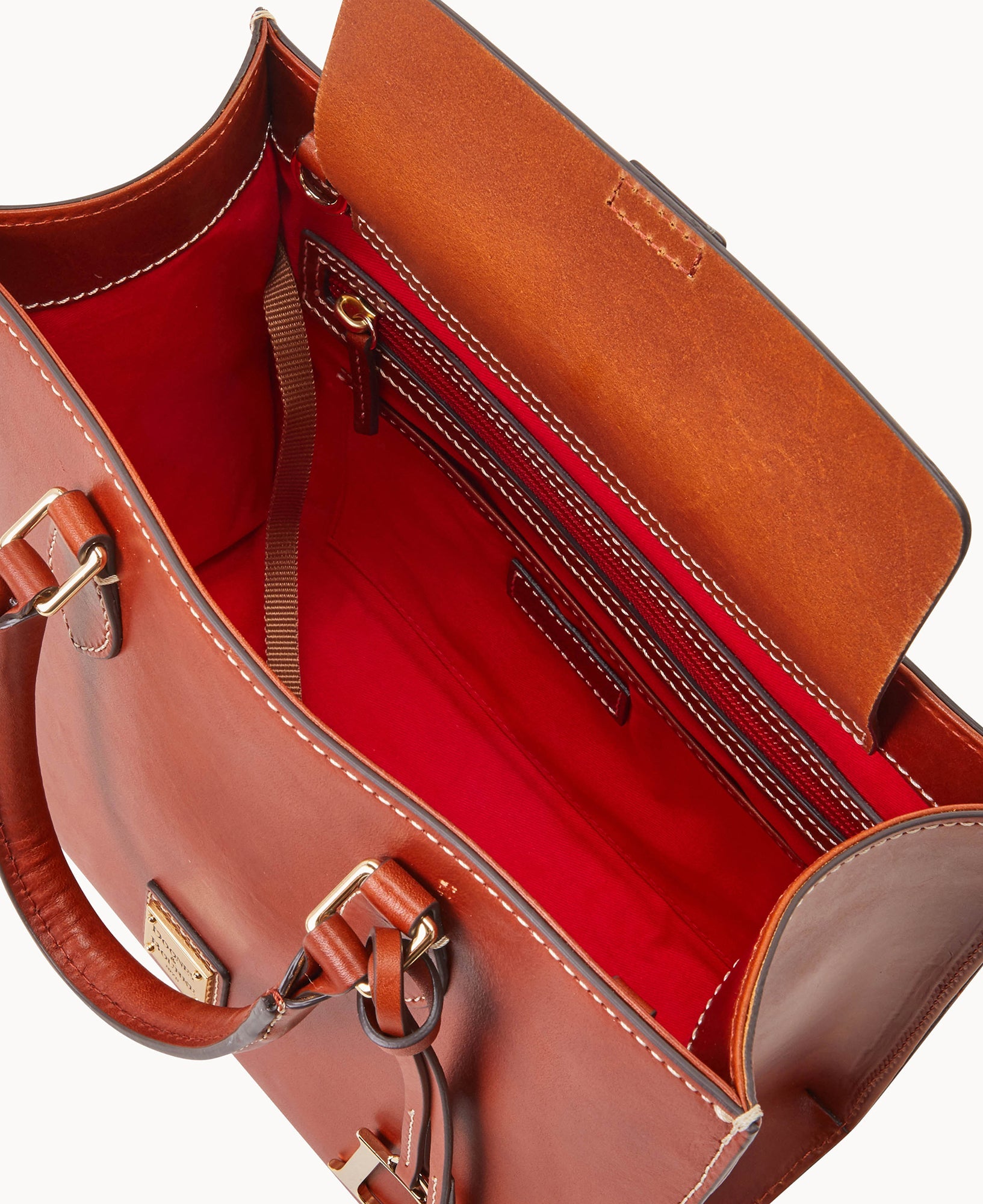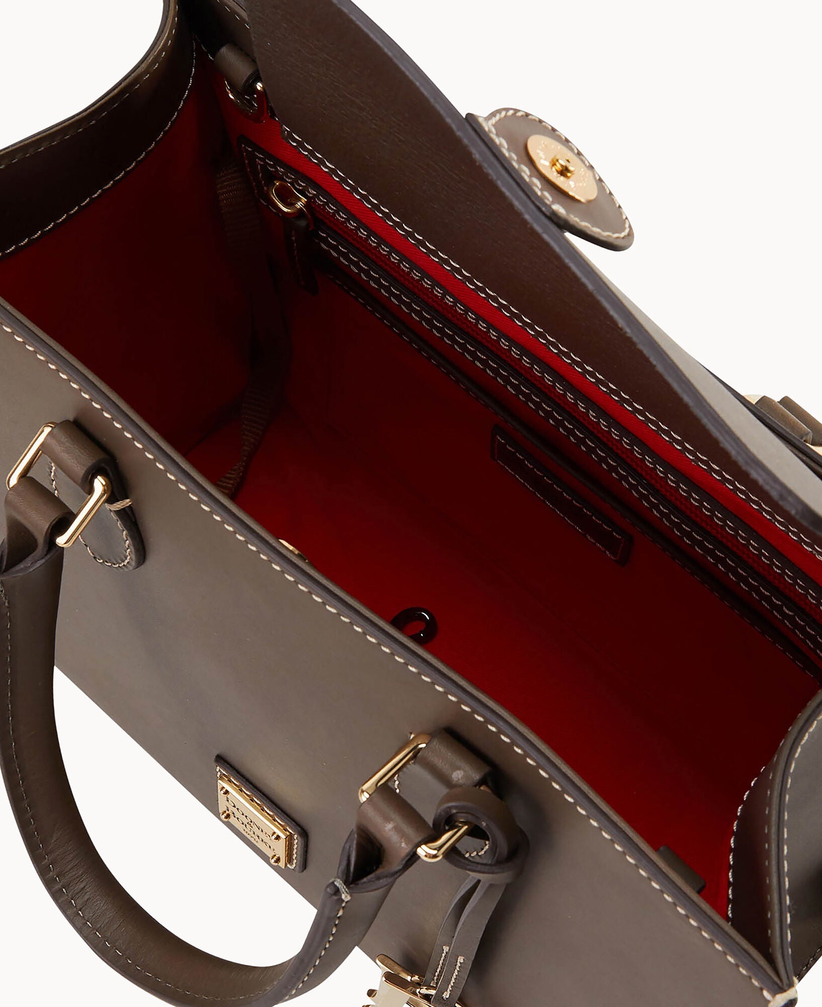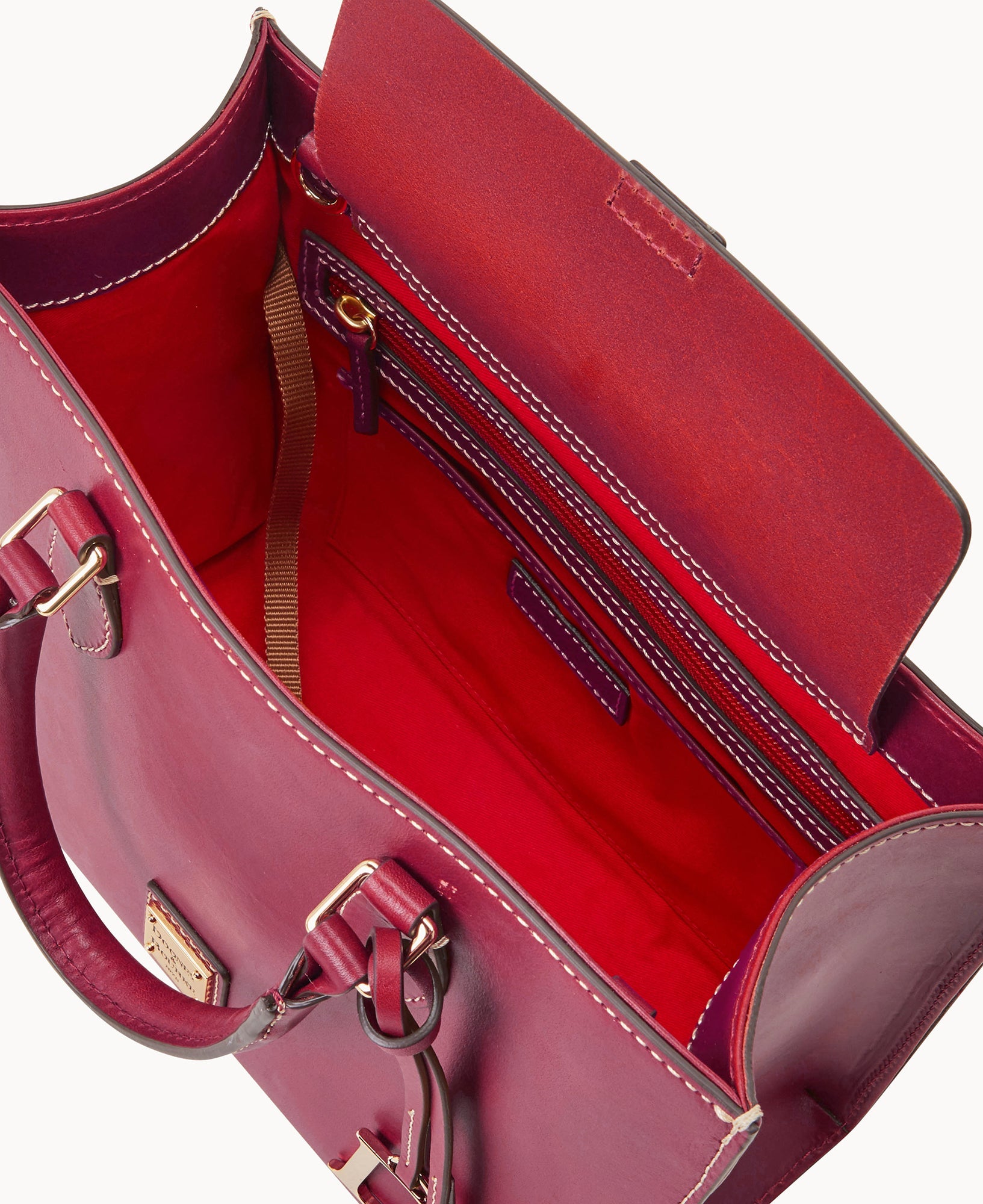 One inside zip pocket. Two inside pockets. Inside key hook. Handle drop length 4.5". Adjustable, detachable shoulder strap. Strap drop length 27". Lined. Feet. Magnetic snap flap closure.