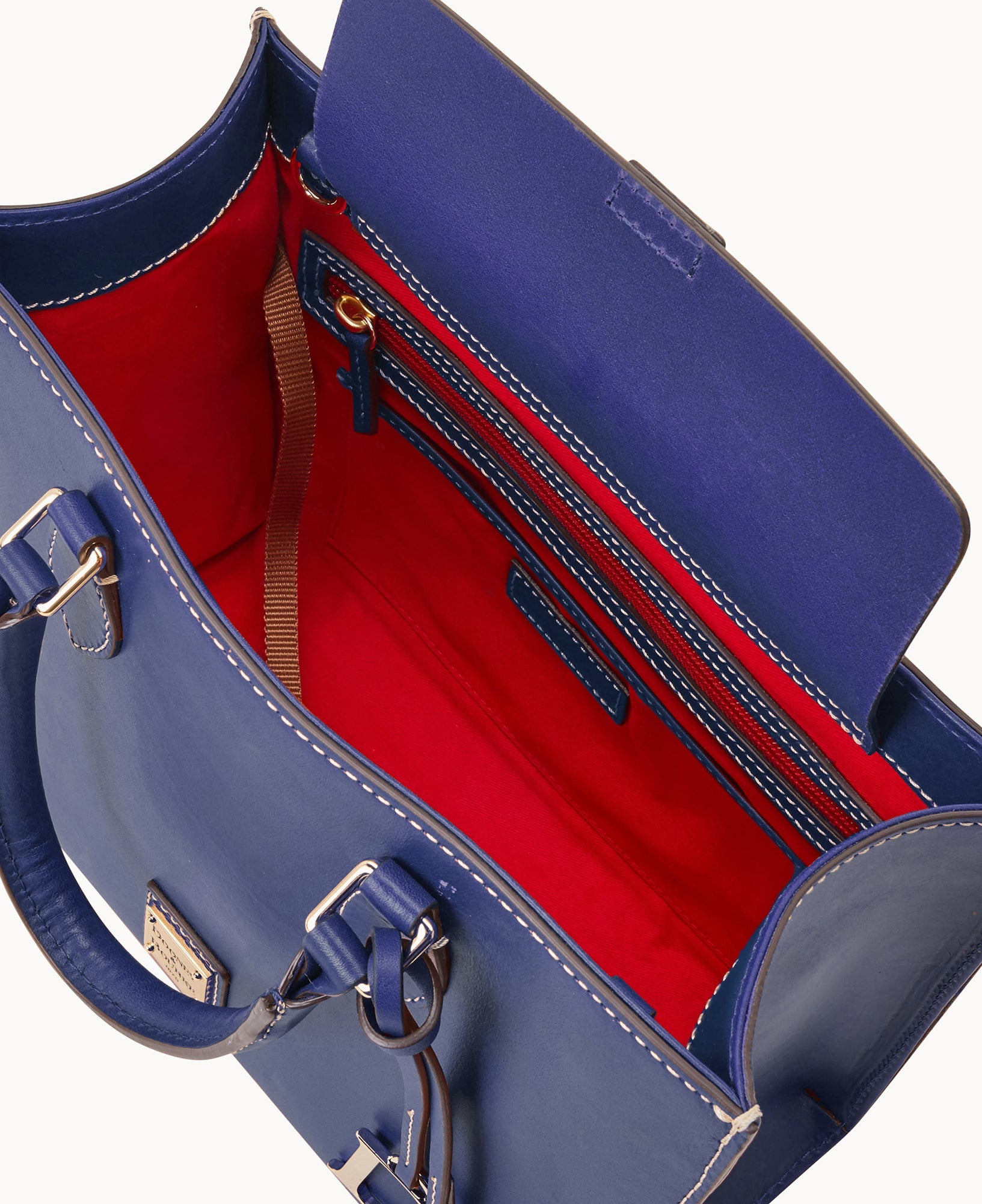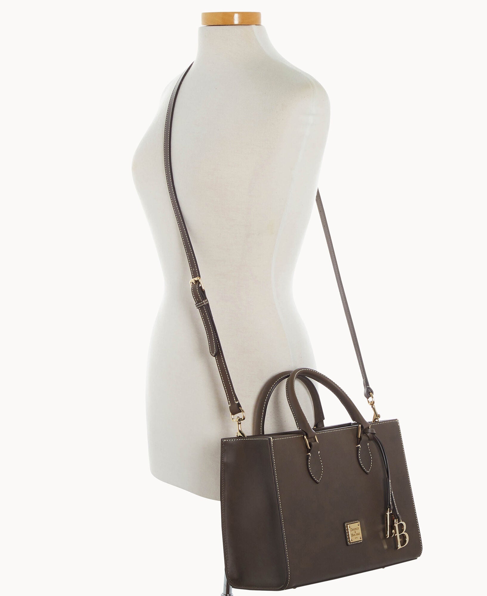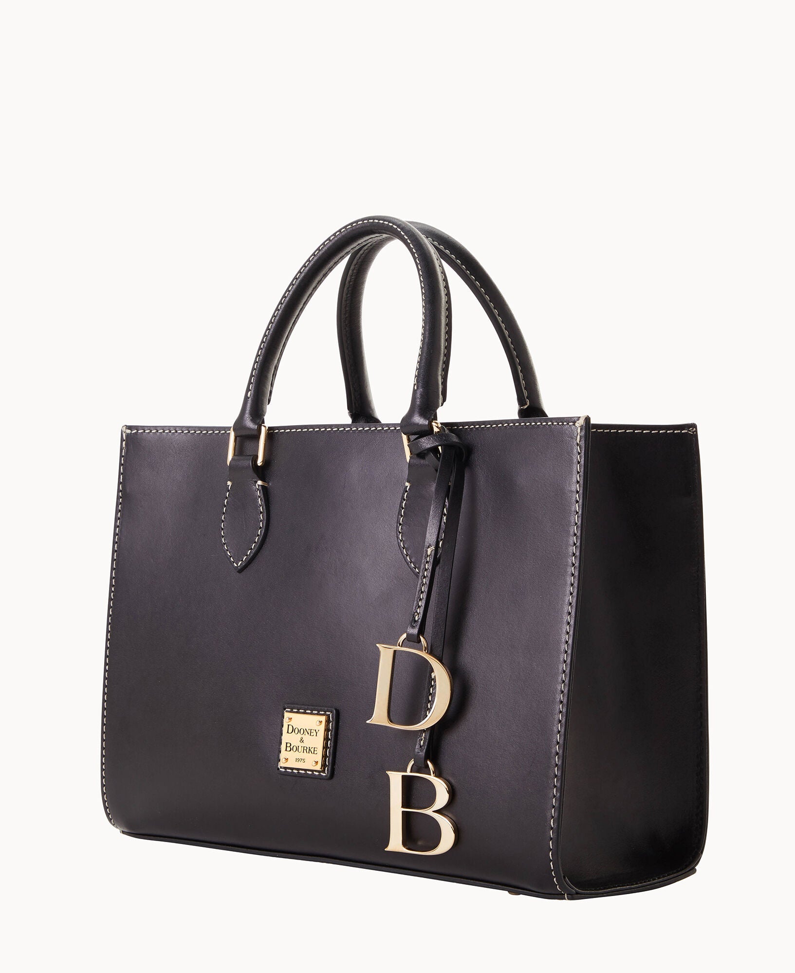 One inside zip pocket. Two inside pockets. Inside key hook. Handle drop length 4.5". Adjustable, detachable shoulder strap. Strap drop length 27". Lined. Feet. Magnetic snap flap closure.