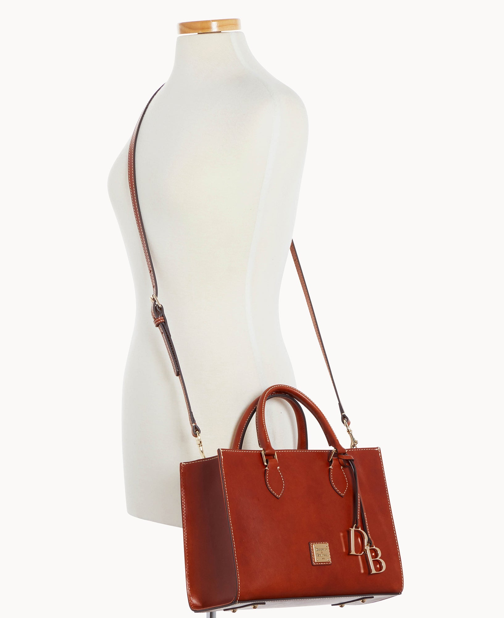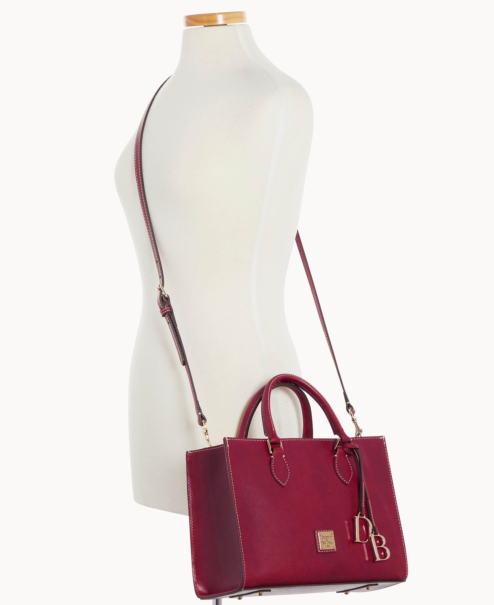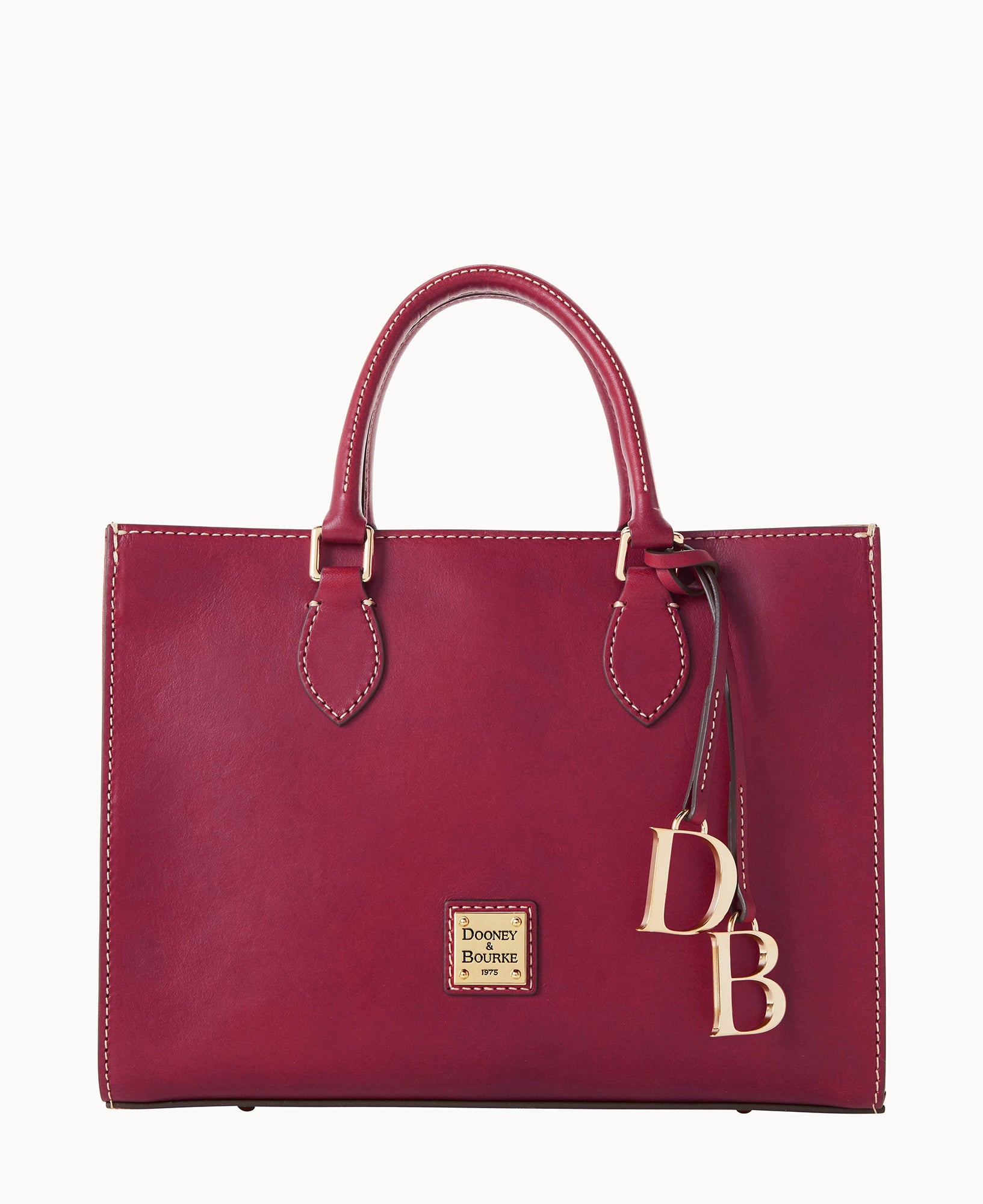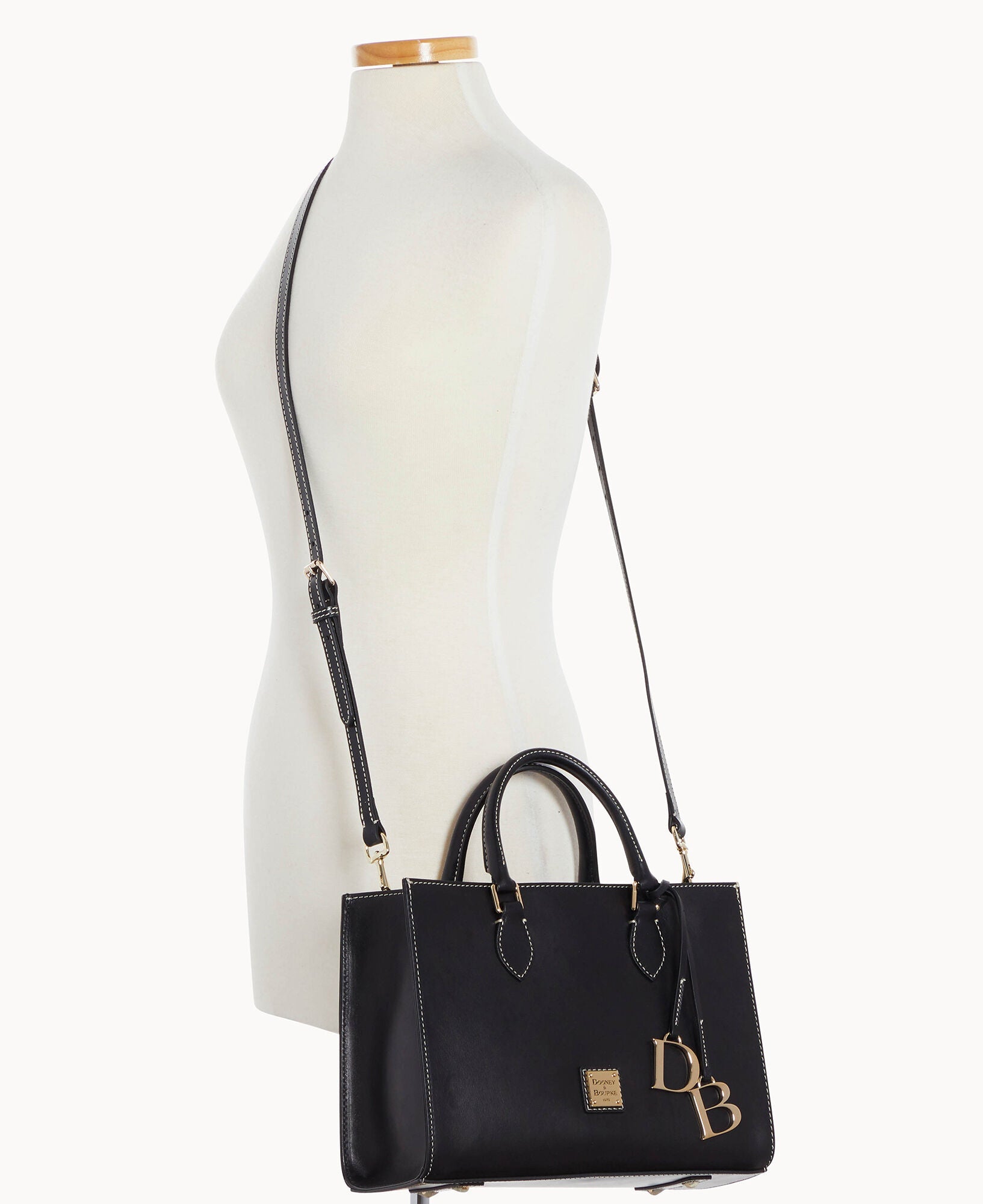 One inside zip pocket. Two inside pockets. Inside key hook. Handle drop length 4.5". Adjustable, detachable shoulder strap. Strap drop length 27". Lined. Feet. Magnetic snap flap closure.