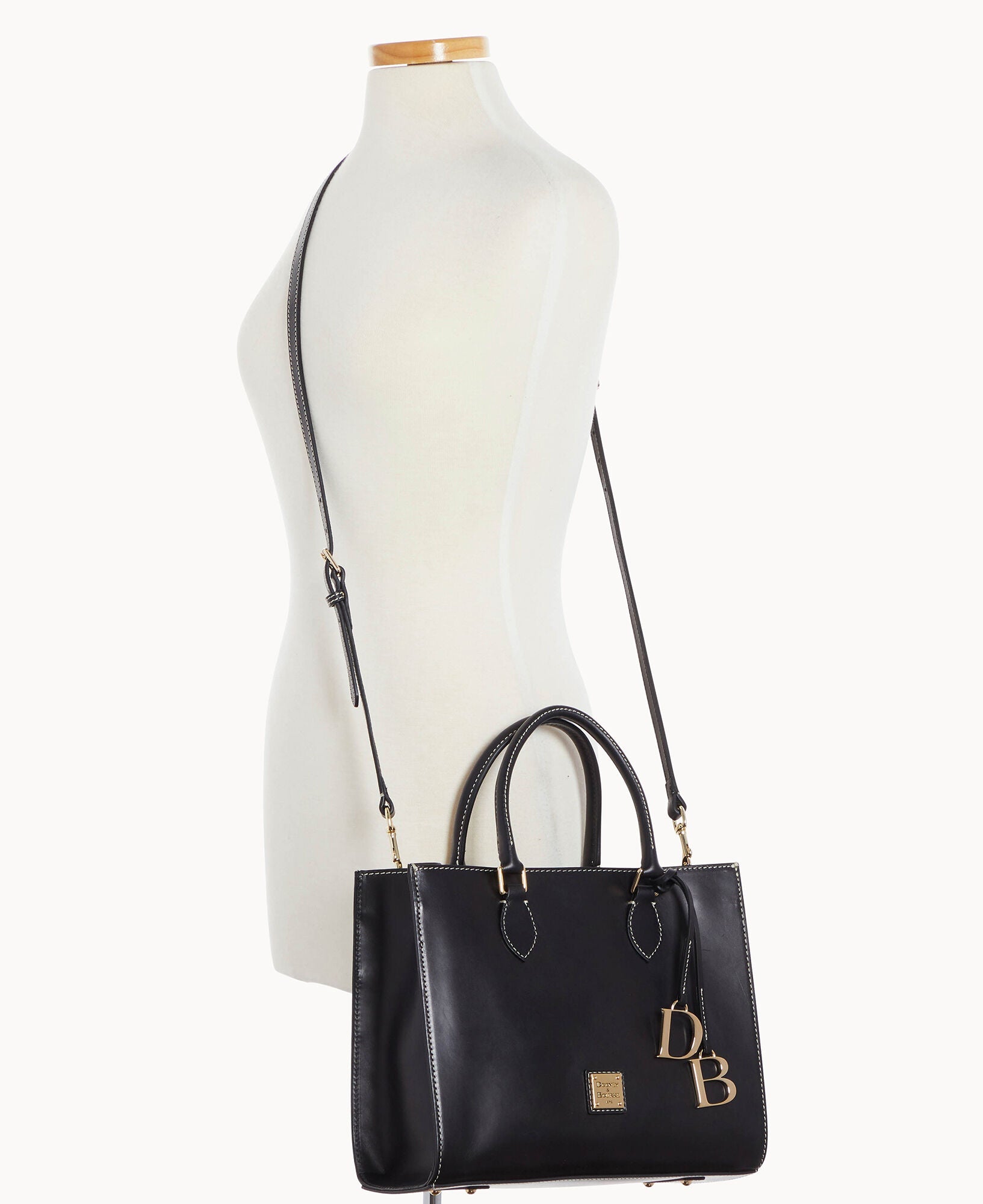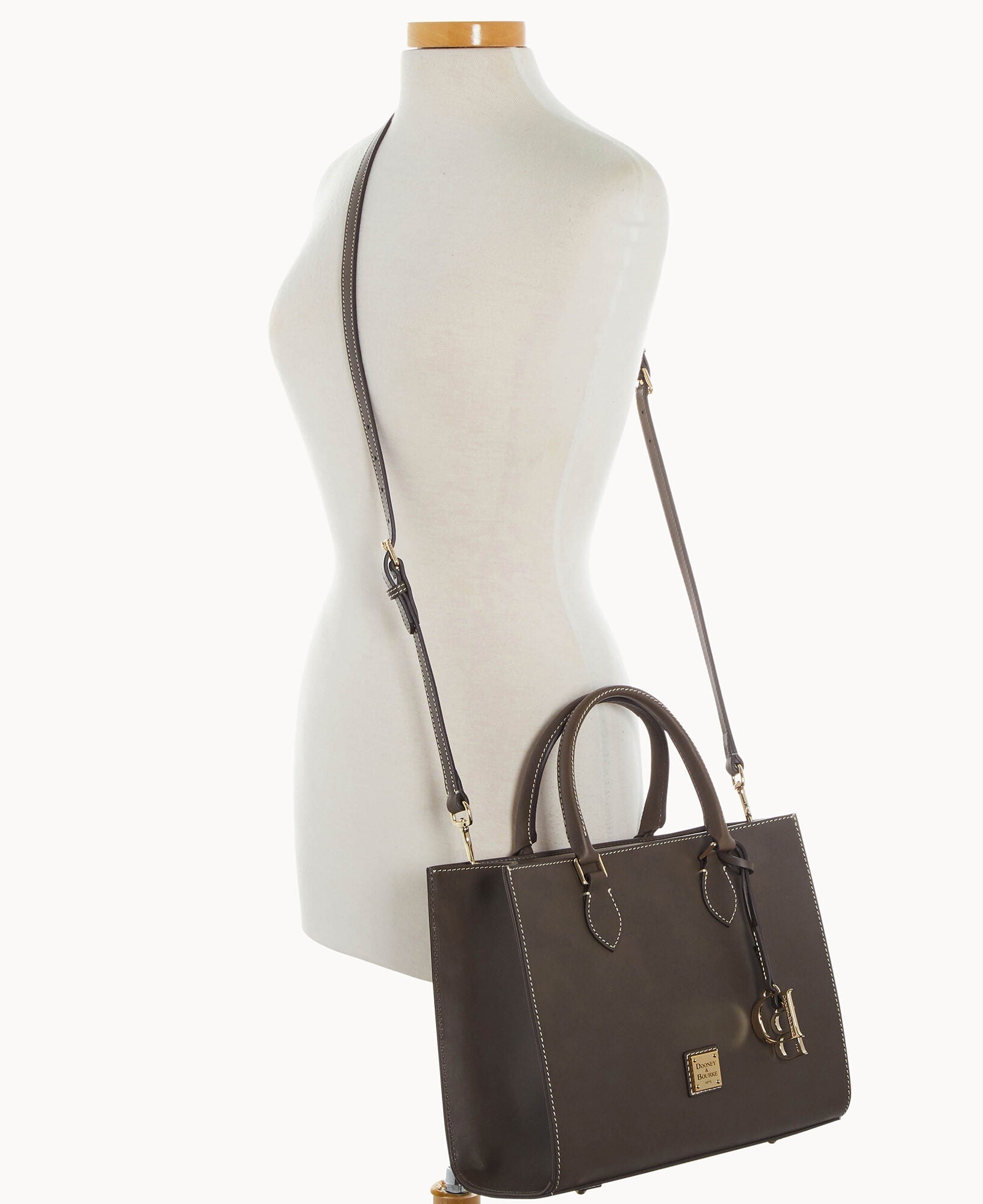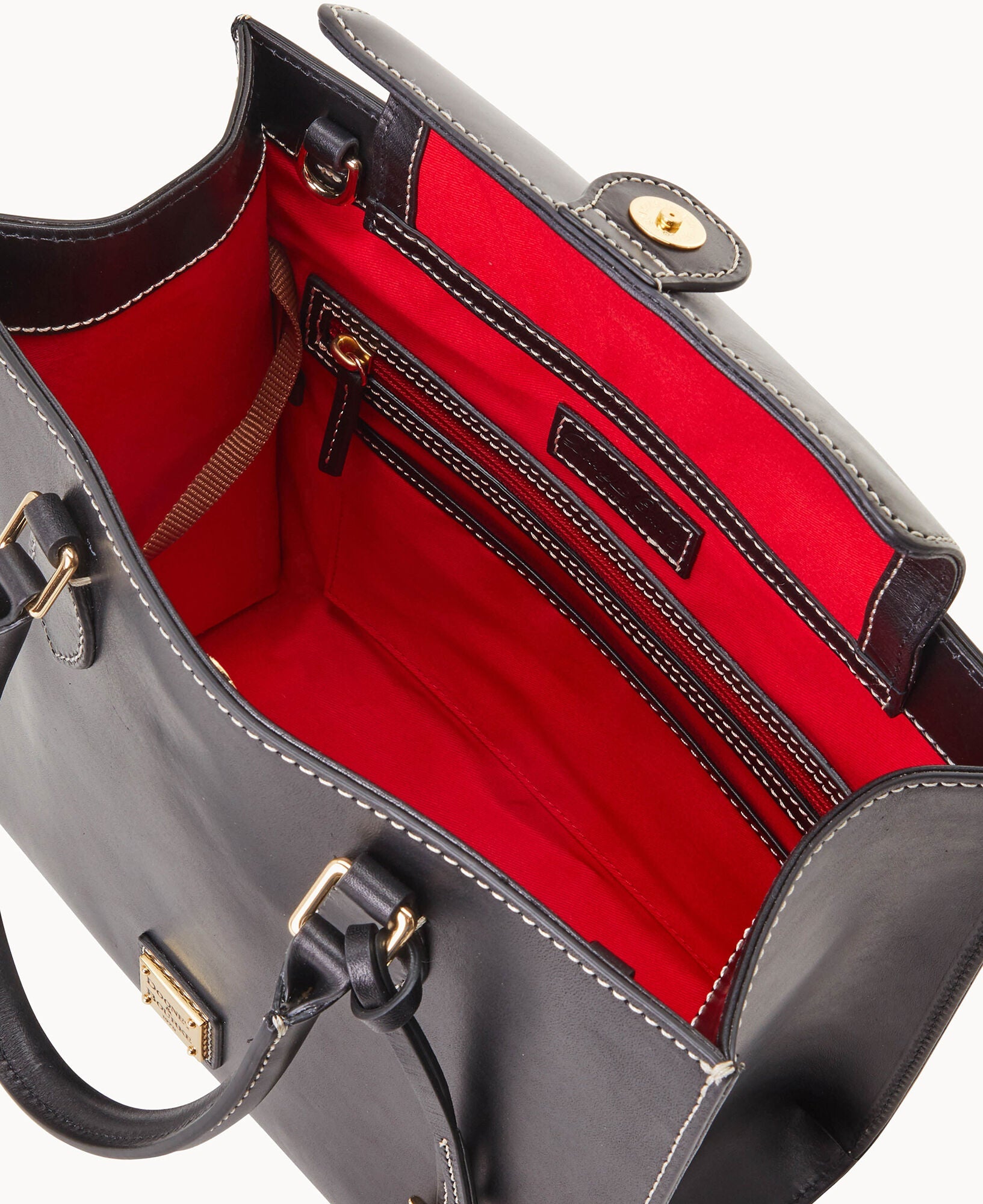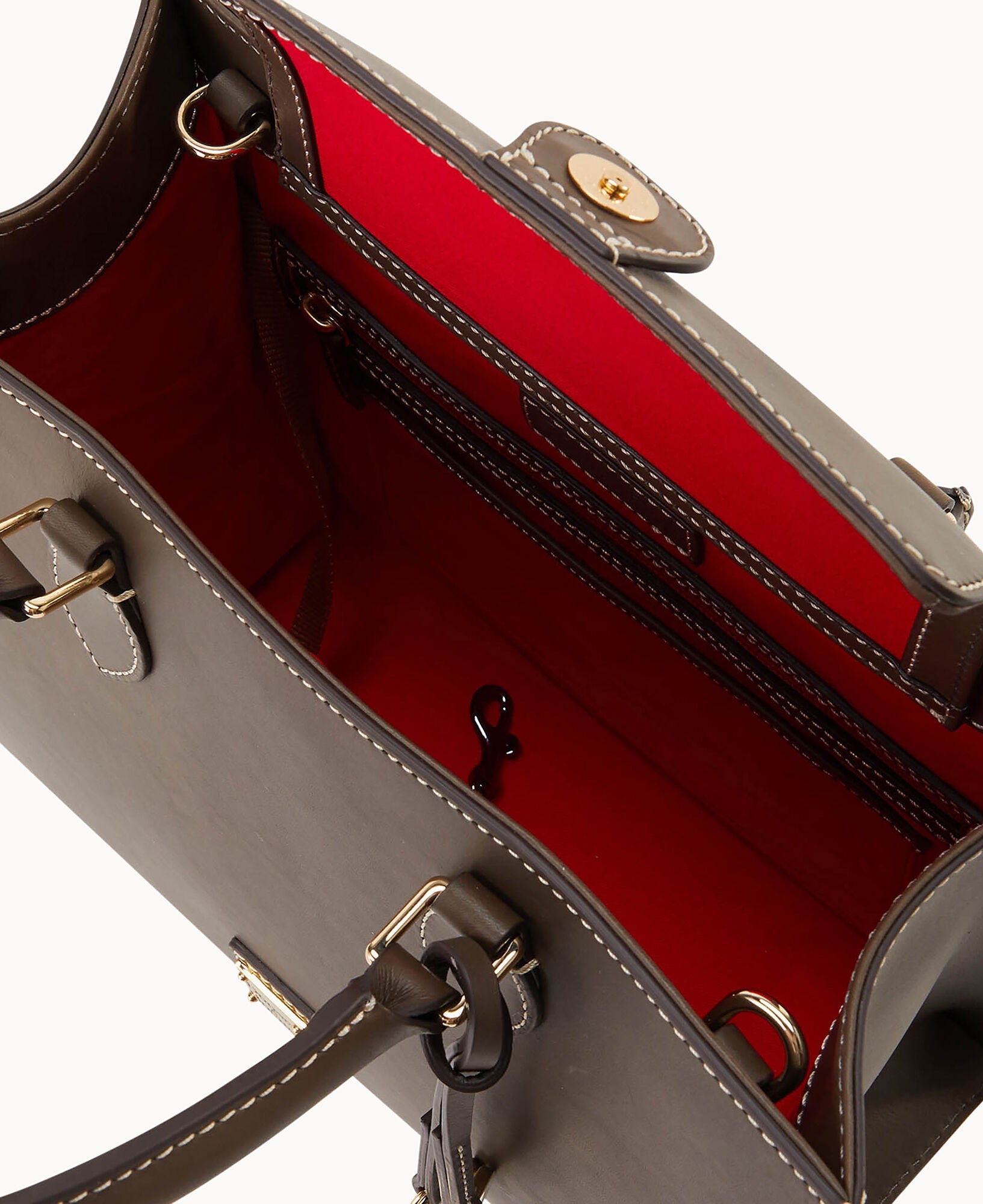 One inside zip pocket. Three inside pockets. Inside key hook. Handle drop length 5.5". Adjustable, detachable shoulder strap. Strap drop length 27". Lined. Feet. Magnetic snap flap closure.