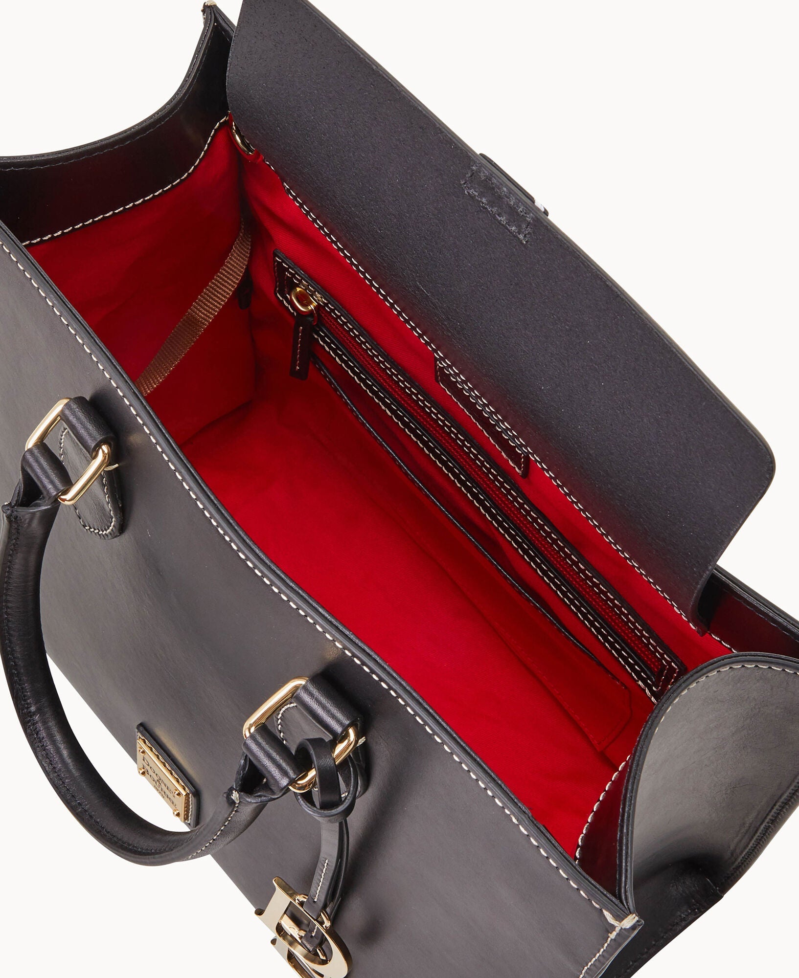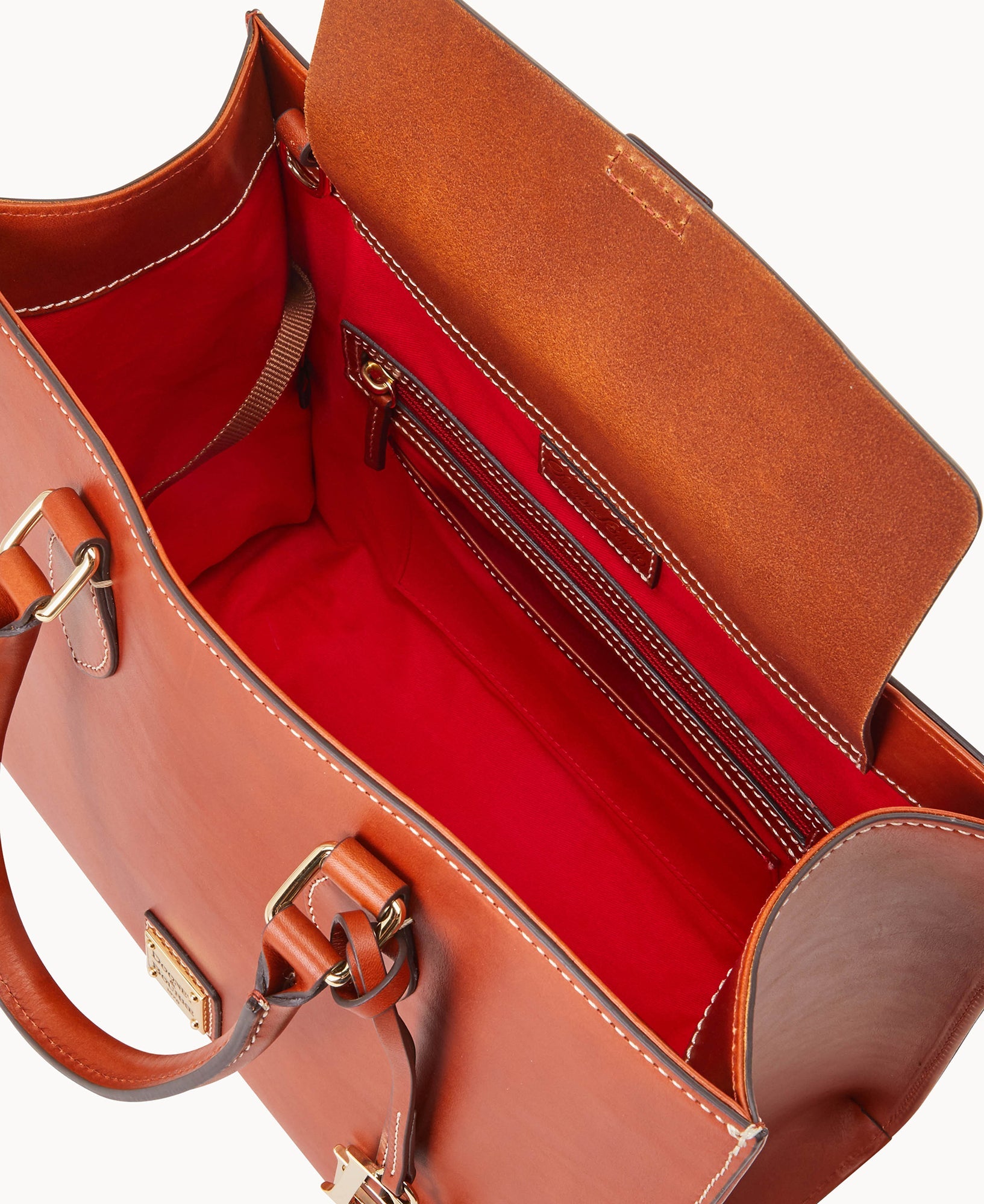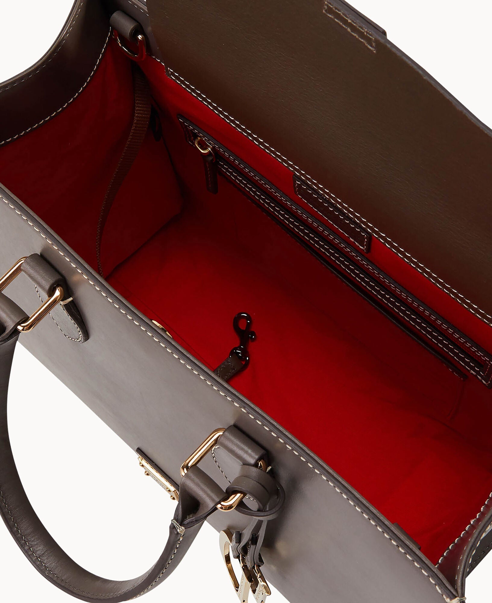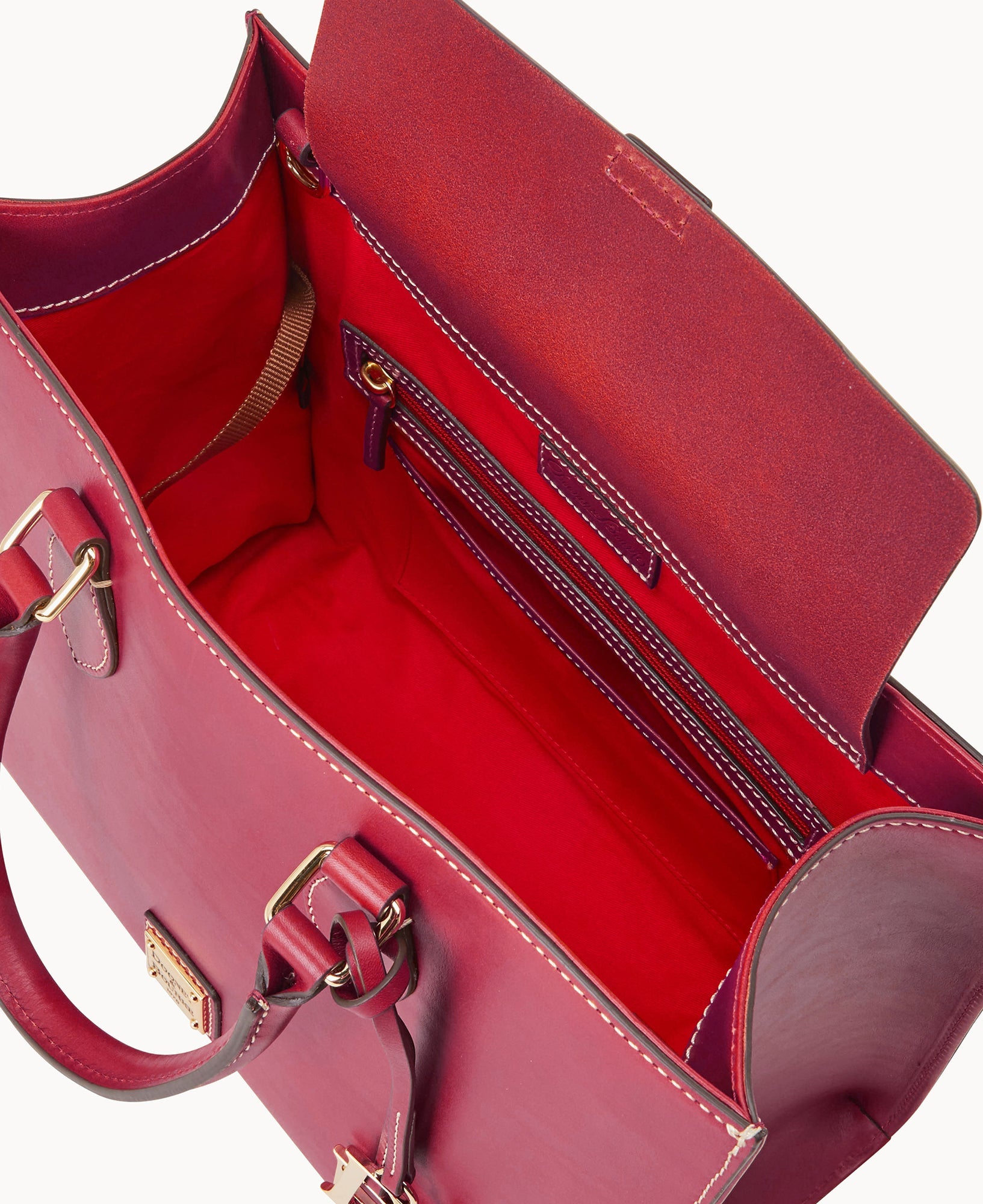 One inside zip pocket. Three inside pockets. Inside key hook. Handle drop length 5". Adjustable, detachable shoulder strap. Lined. Feet. Magnetic snap flap closure.