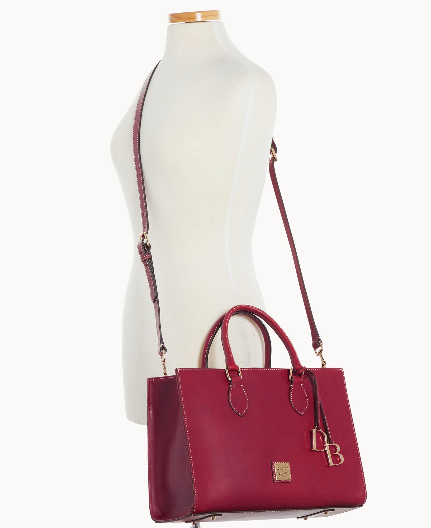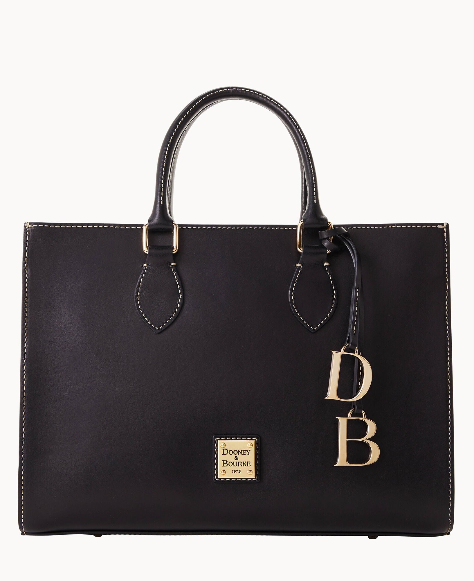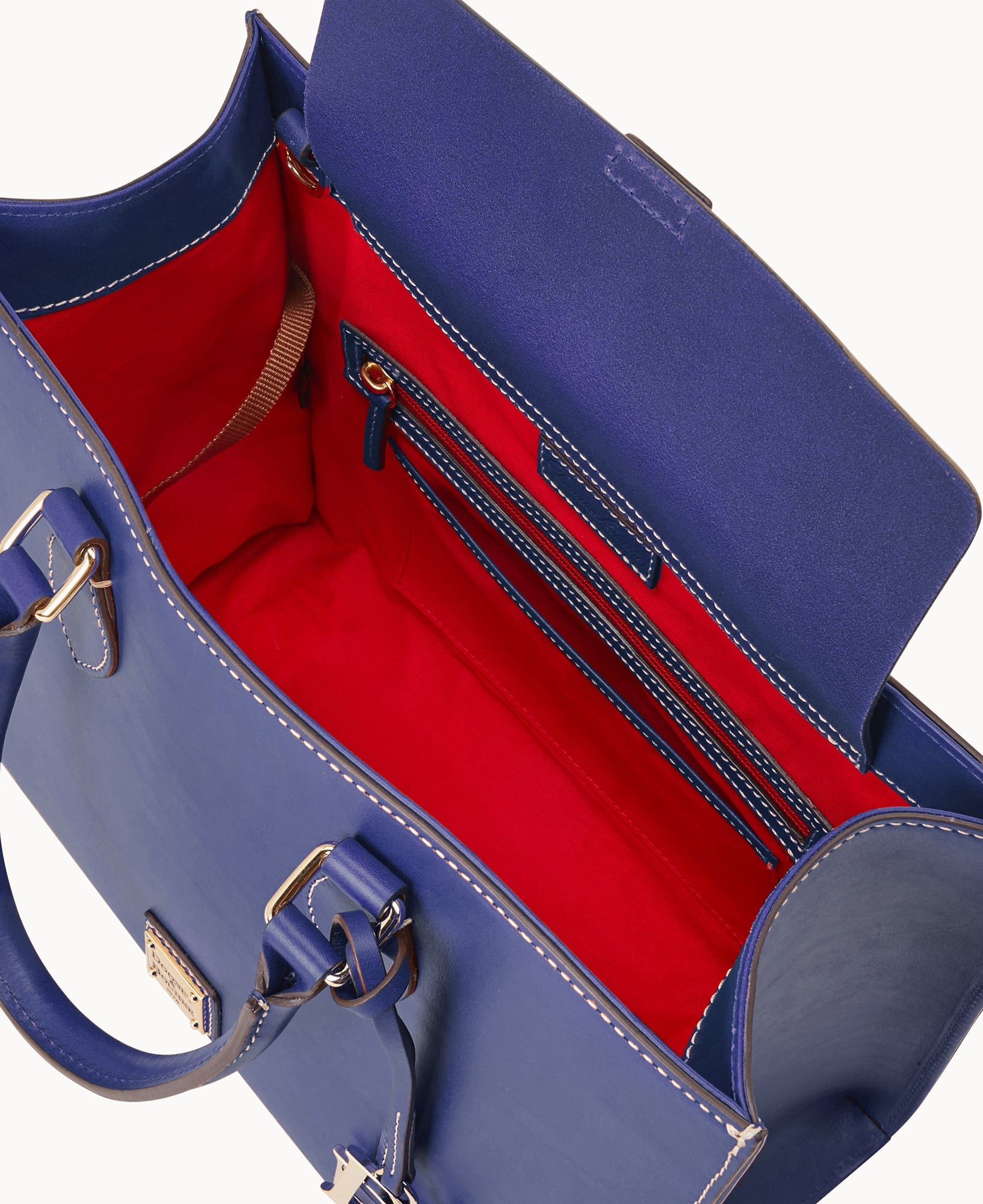 One inside zip pocket. Three inside pockets. Inside key hook. Handle drop length 5". Adjustable, detachable shoulder strap. Lined. Feet. Magnetic snap flap closure.