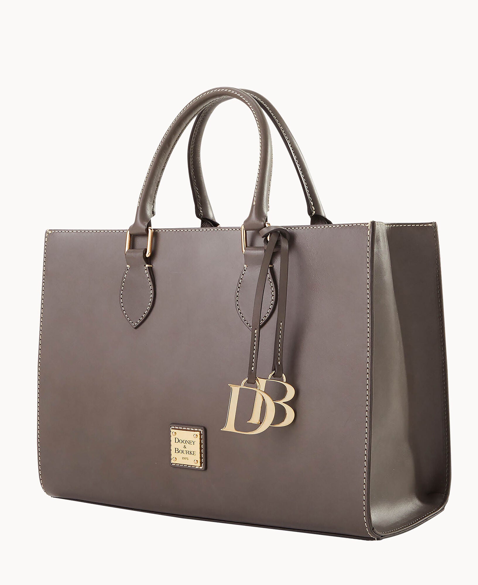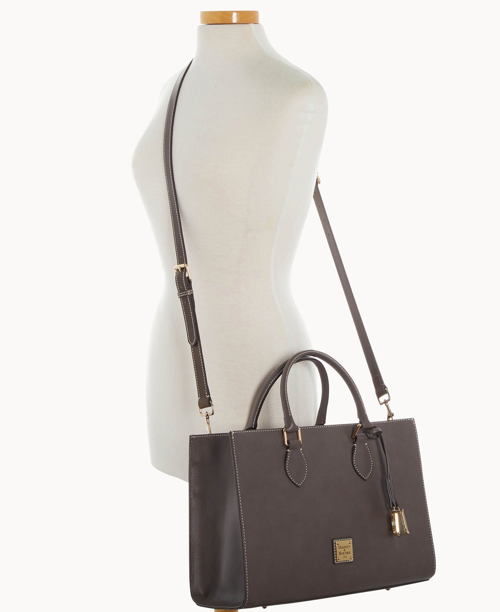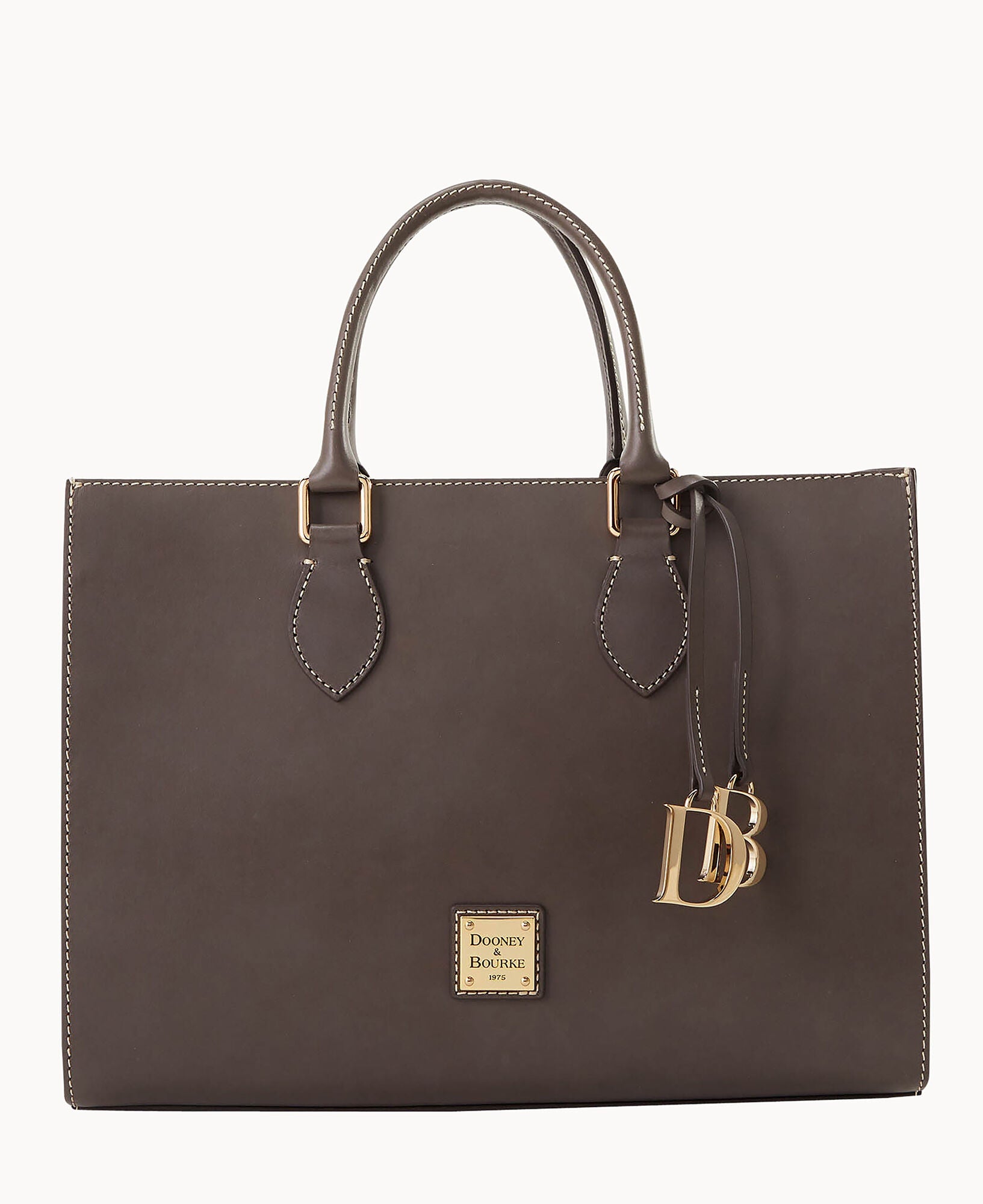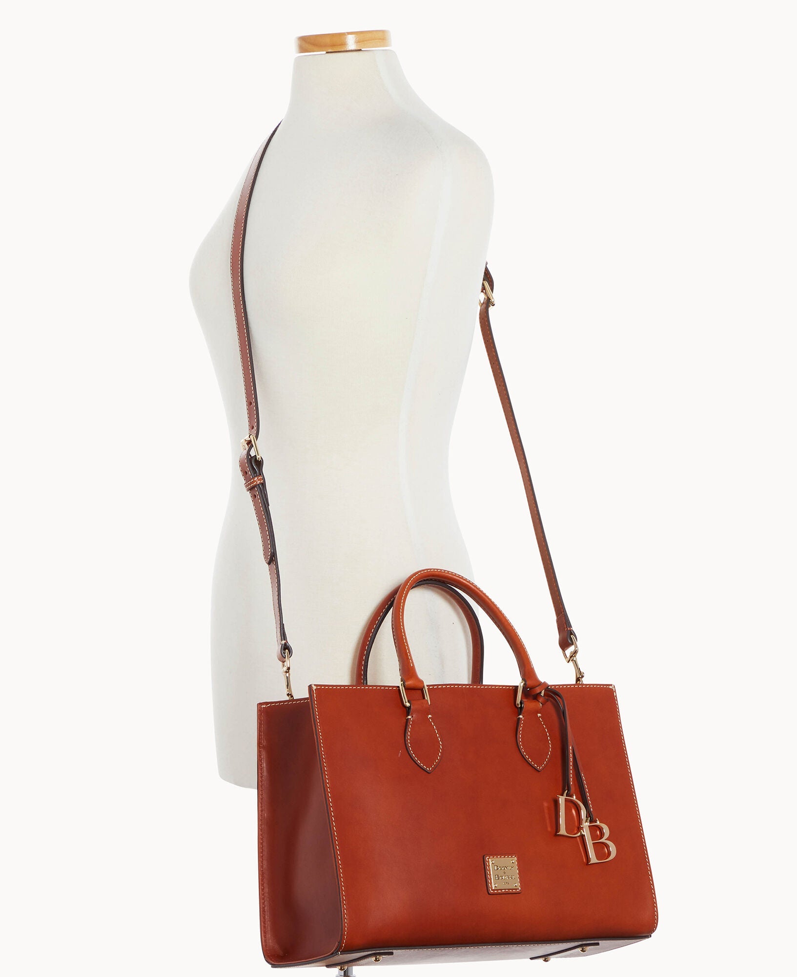One inside zip pocket. Three inside pockets. Inside key hook. Handle drop length 5". Adjustable, detachable shoulder strap. Lined. Feet. Magnetic snap flap closure.