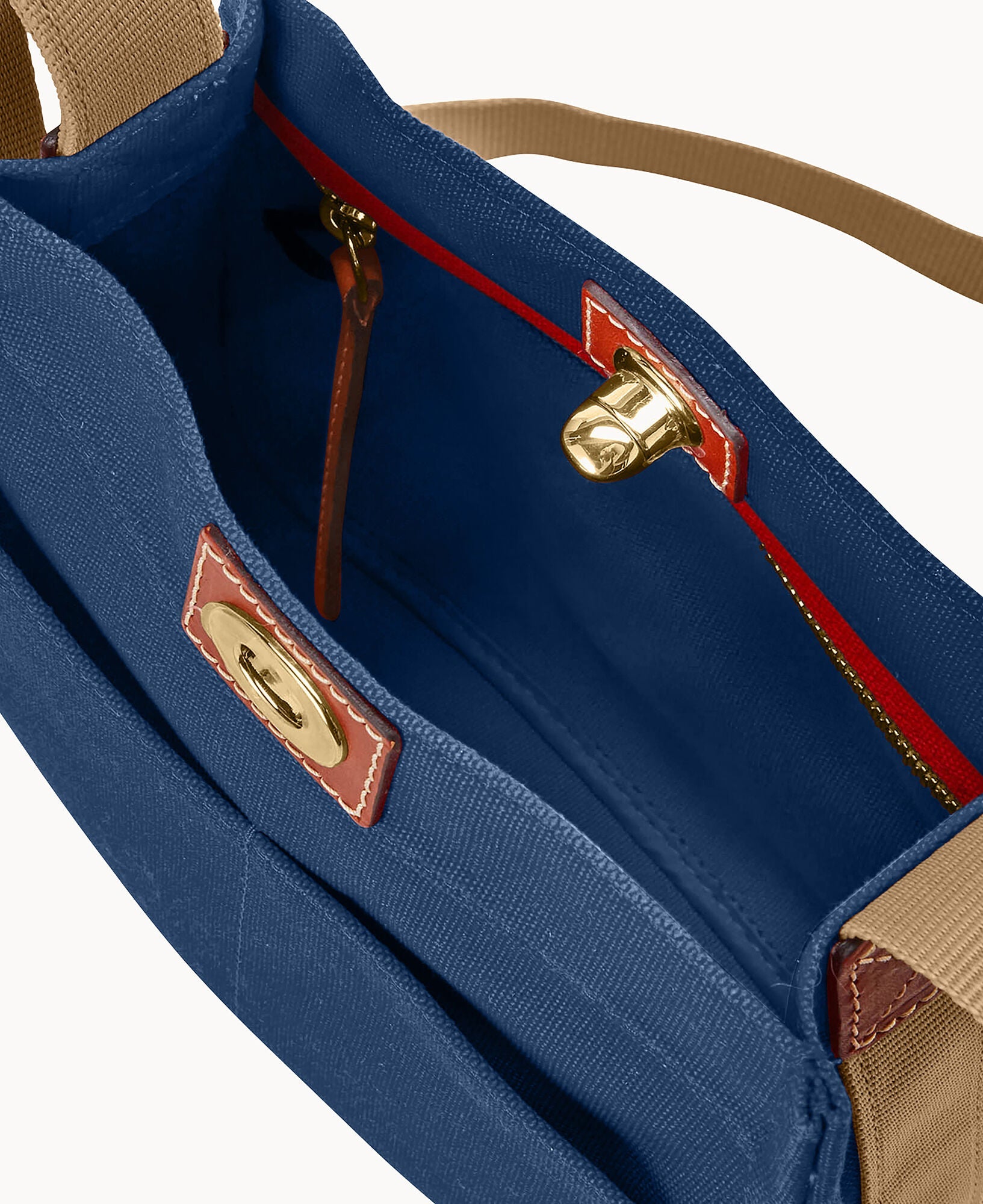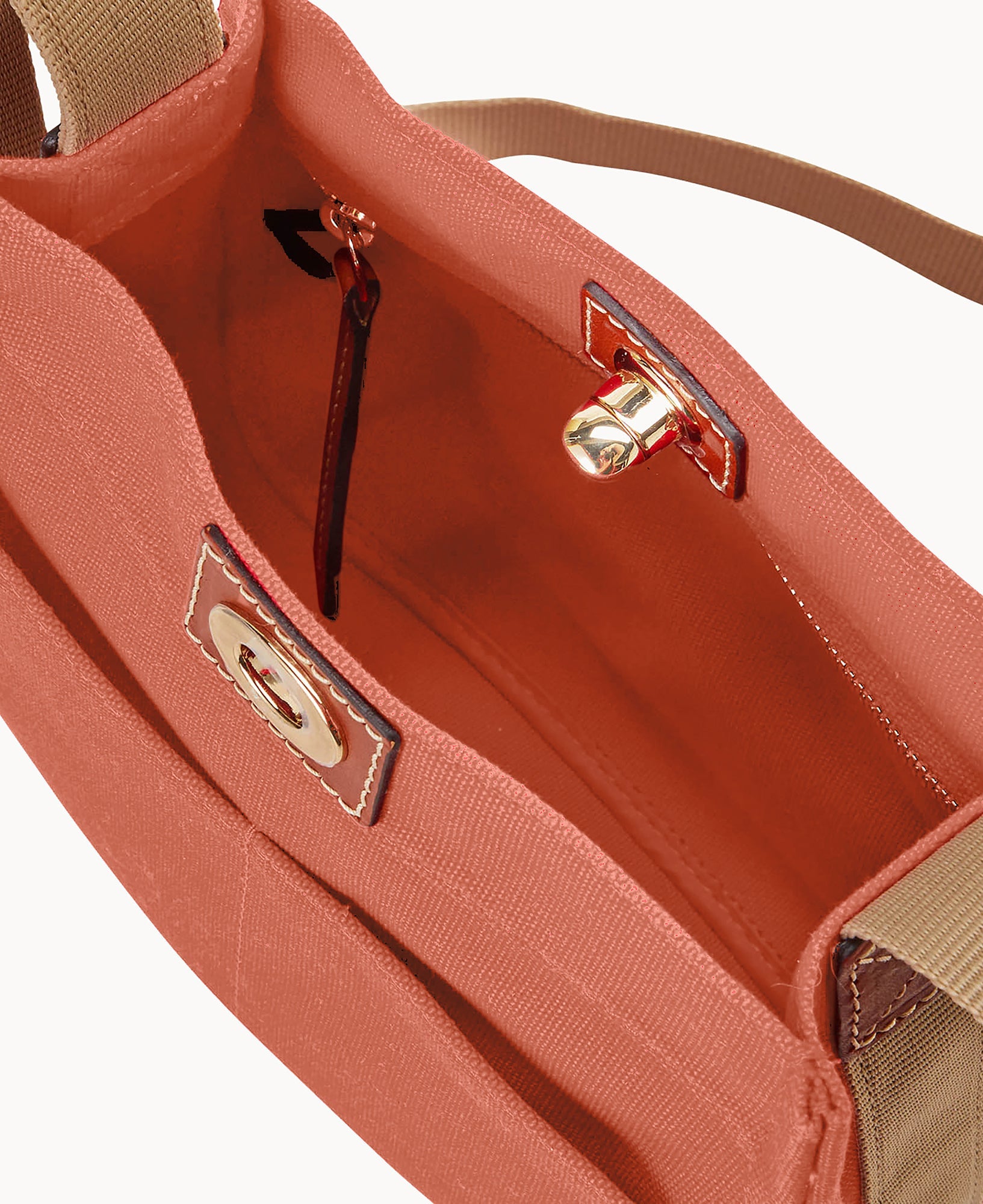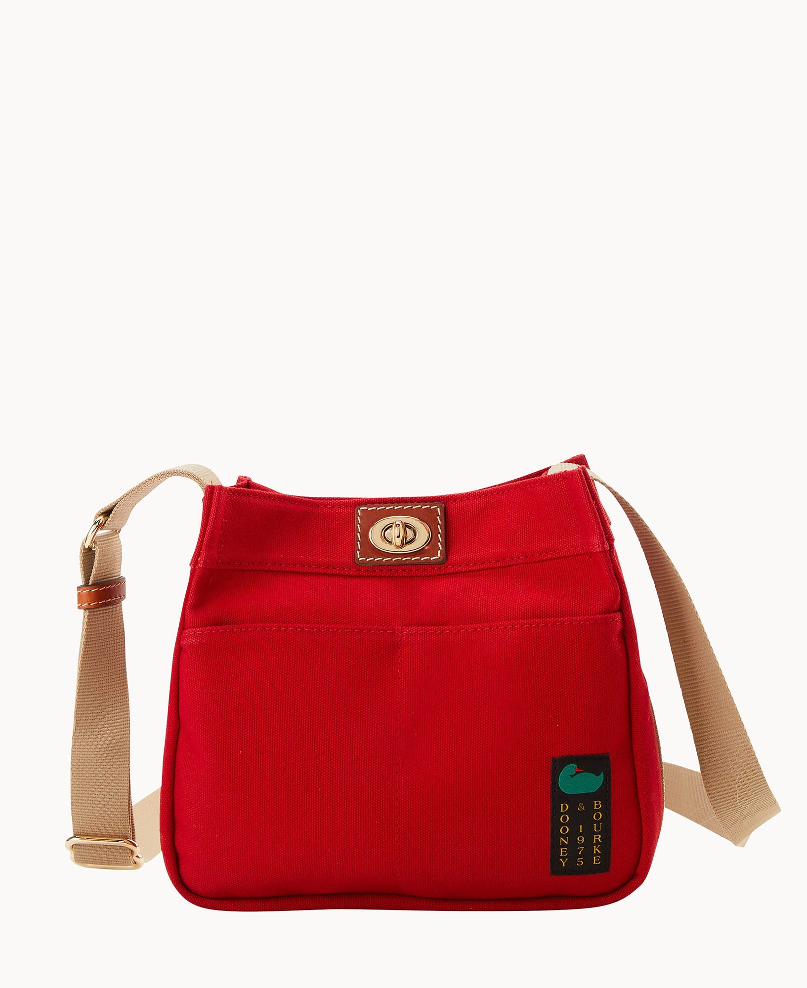 Four outside slip pockets. Two inside zip pockets. Adjustable strap. Strap drop length 27". Turnlock closure.