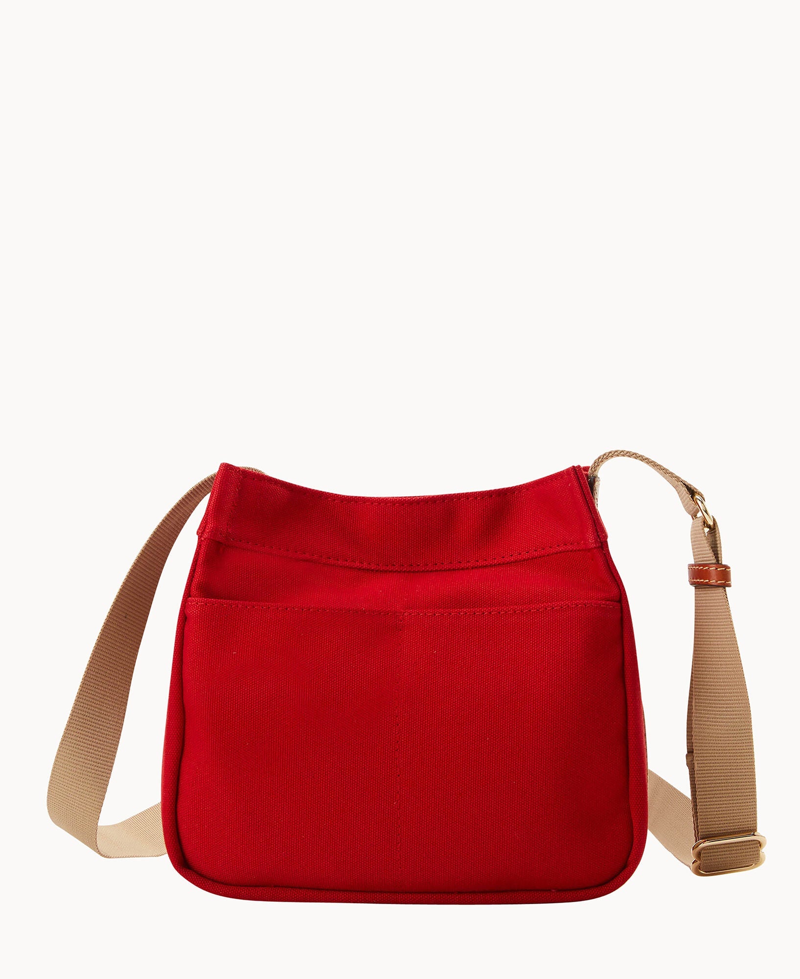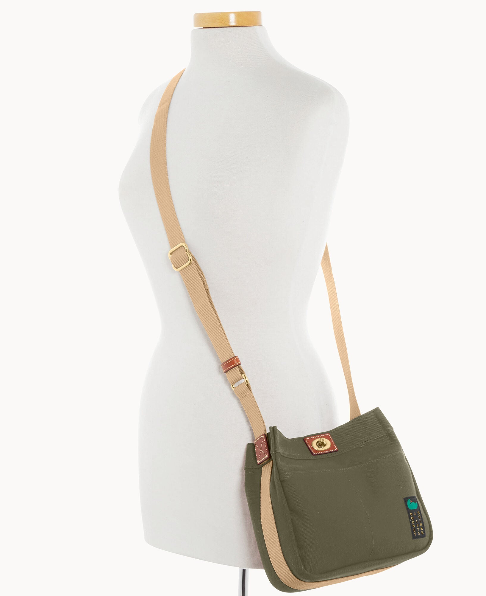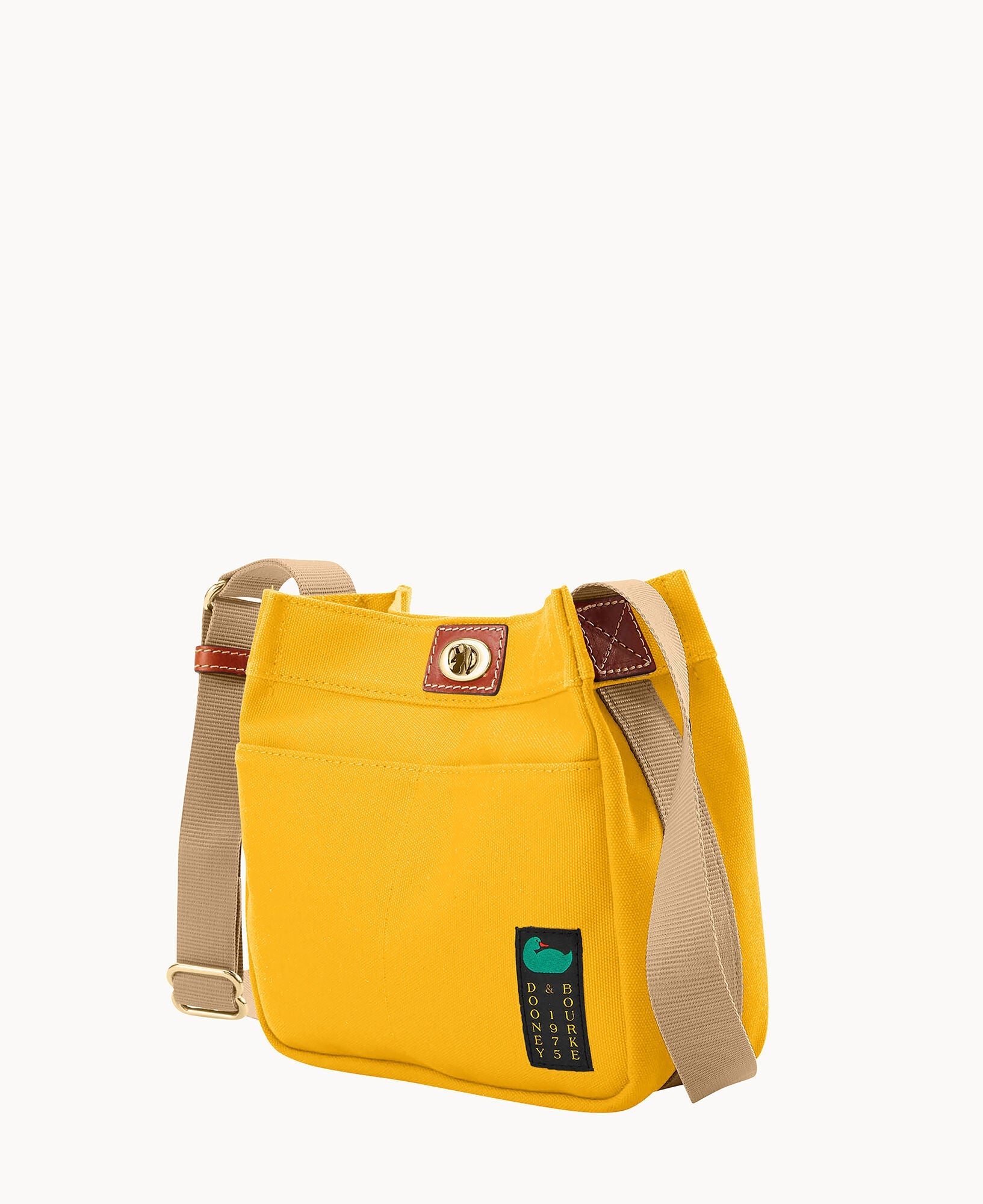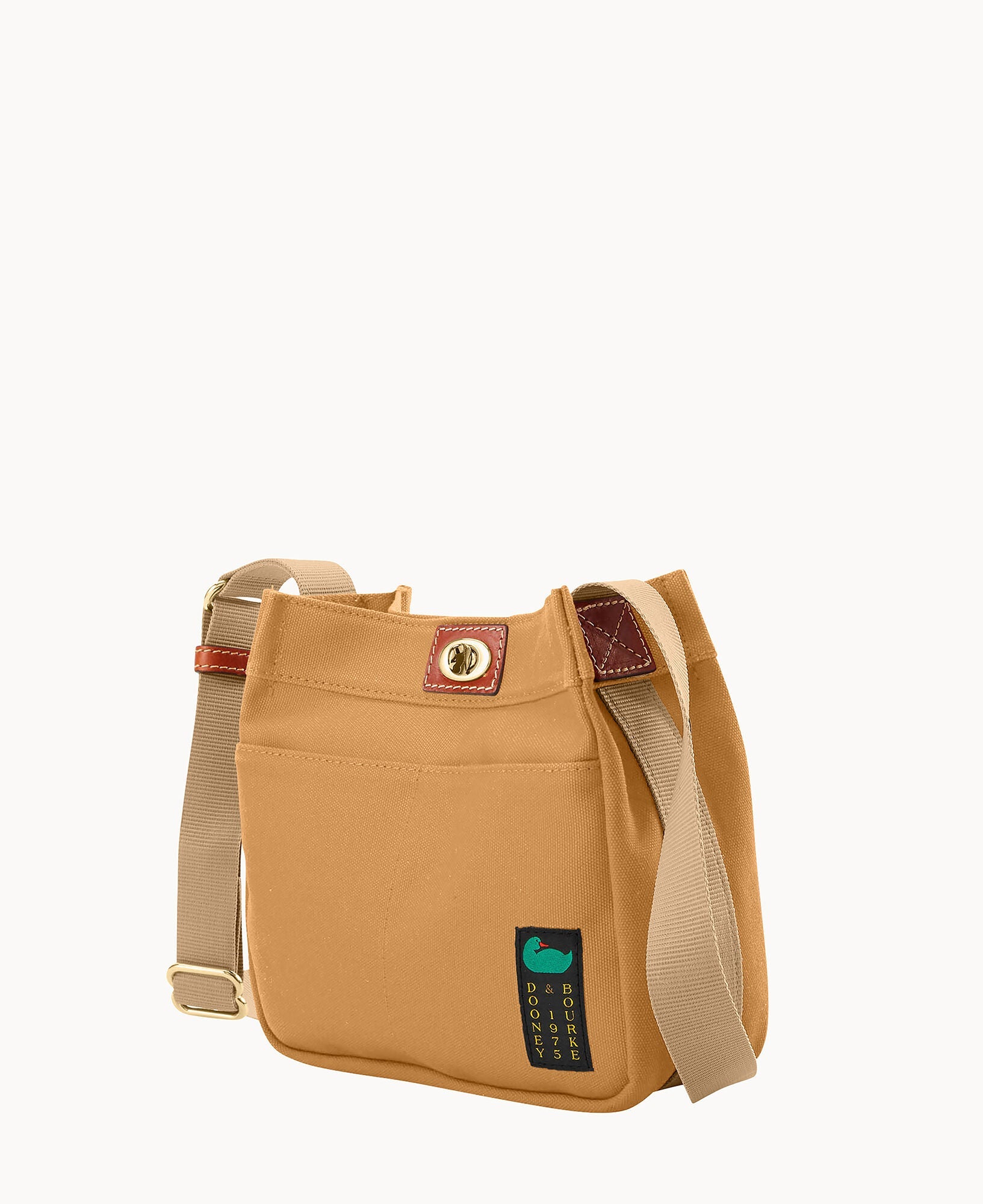Four outside slip pockets. Two inside zip pockets. Adjustable strap. Strap drop length 27". Turnlock closure.