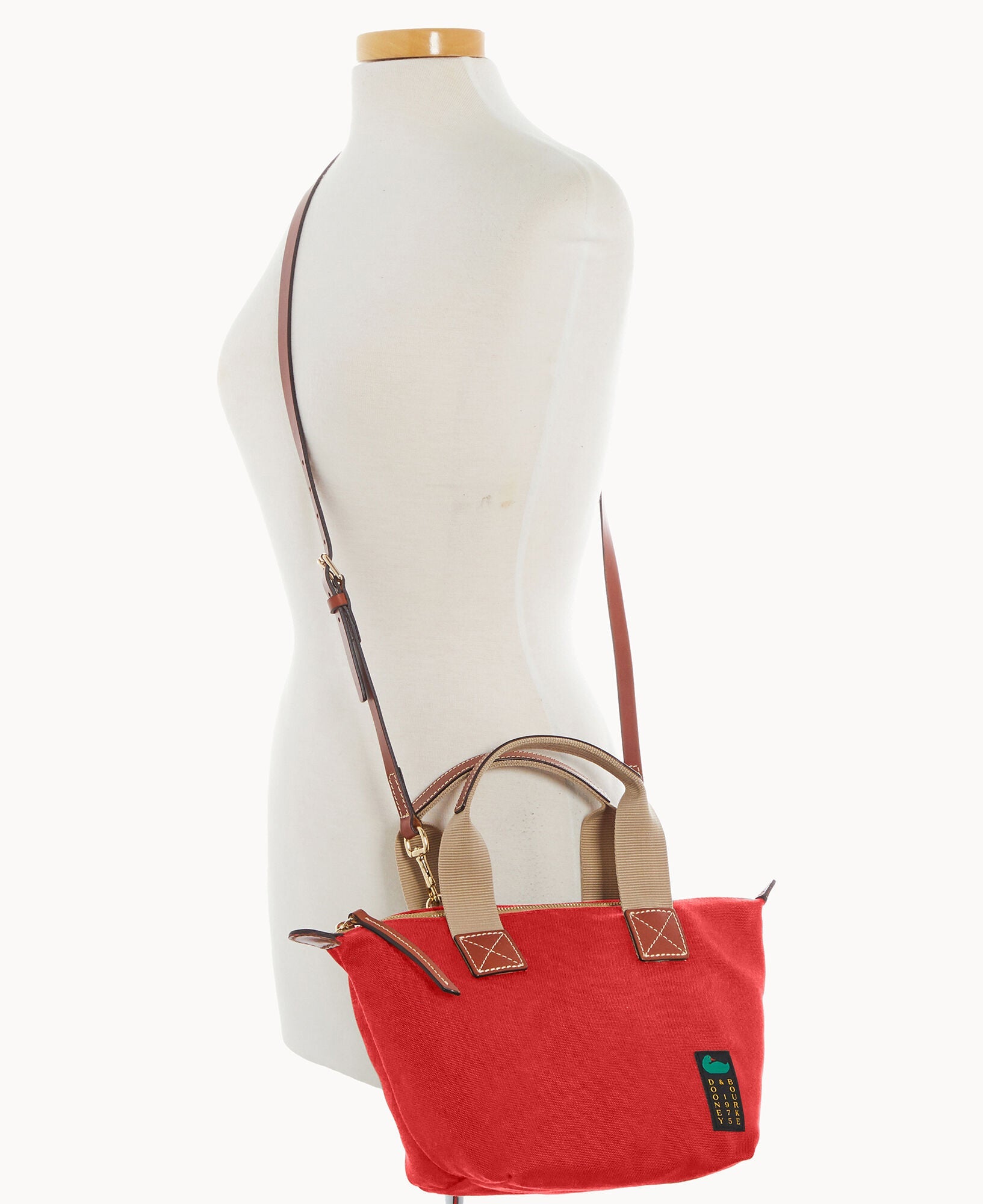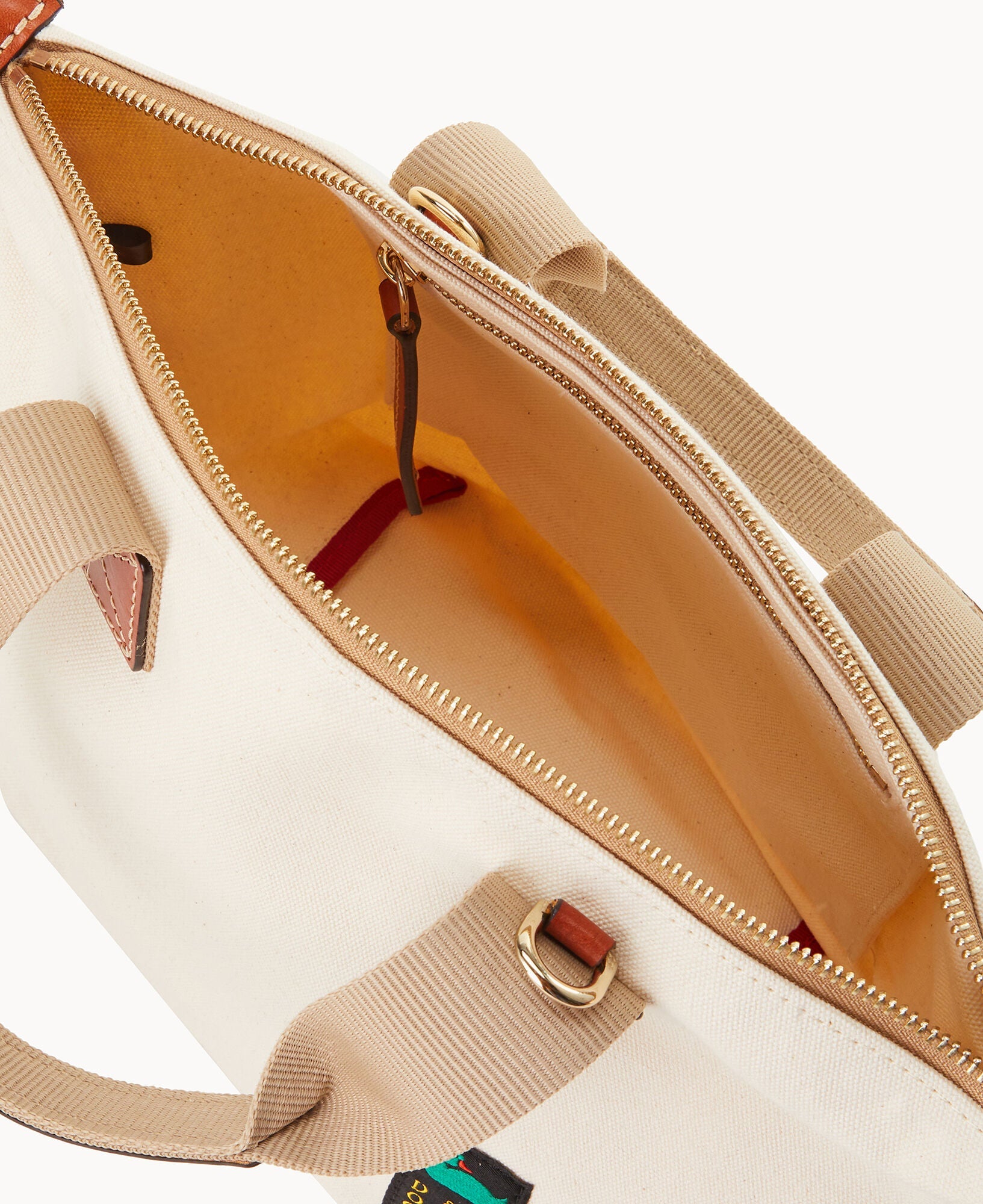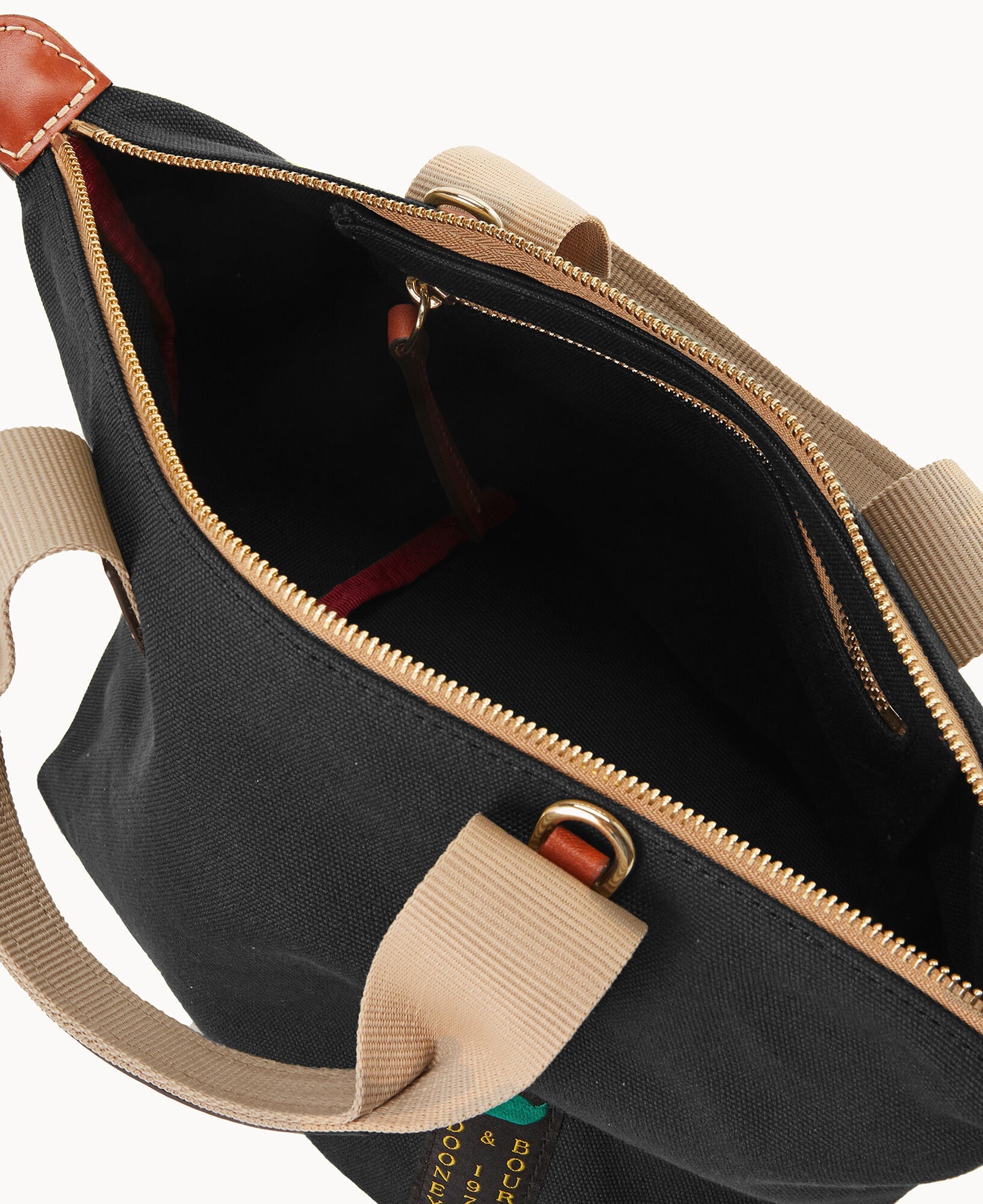 One inside zip pocket. Zipper closure. Adjustable, detchable strap. Strap drop length 24". Handle drop length 4".