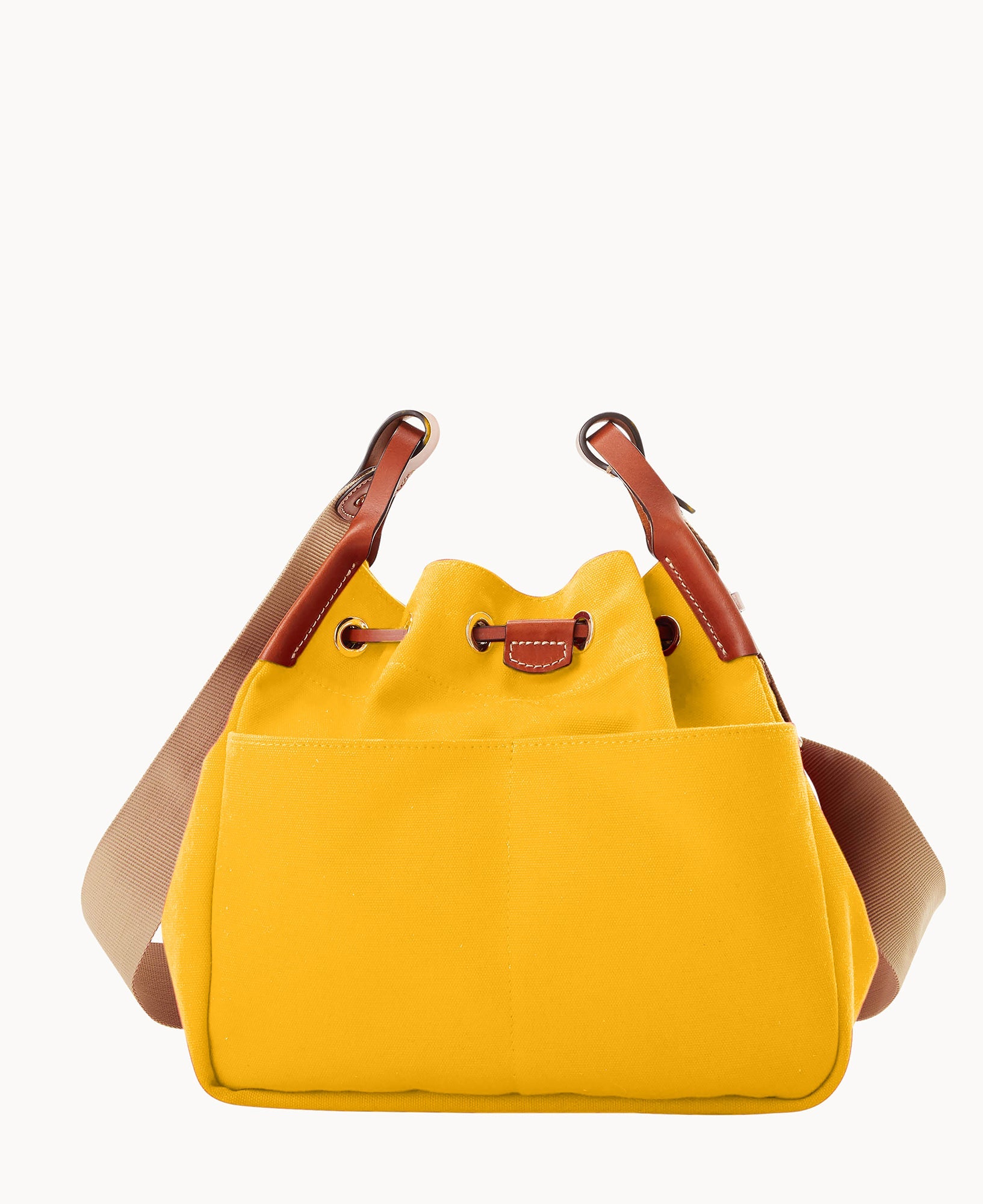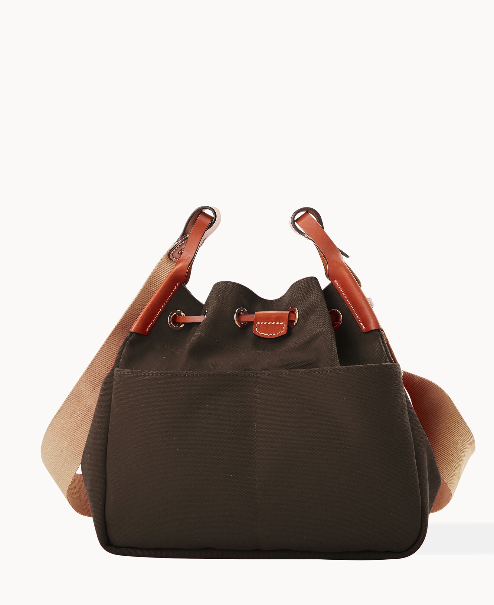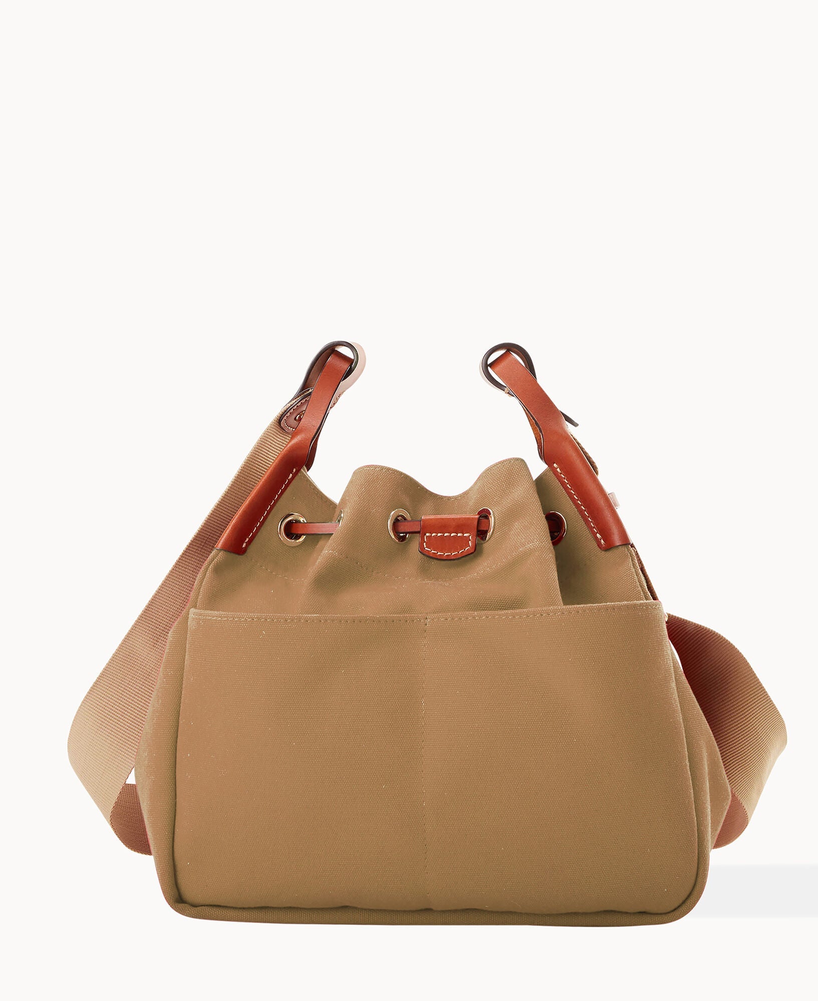 Four outside pockets. Adjustable straps. Drawstring closure.