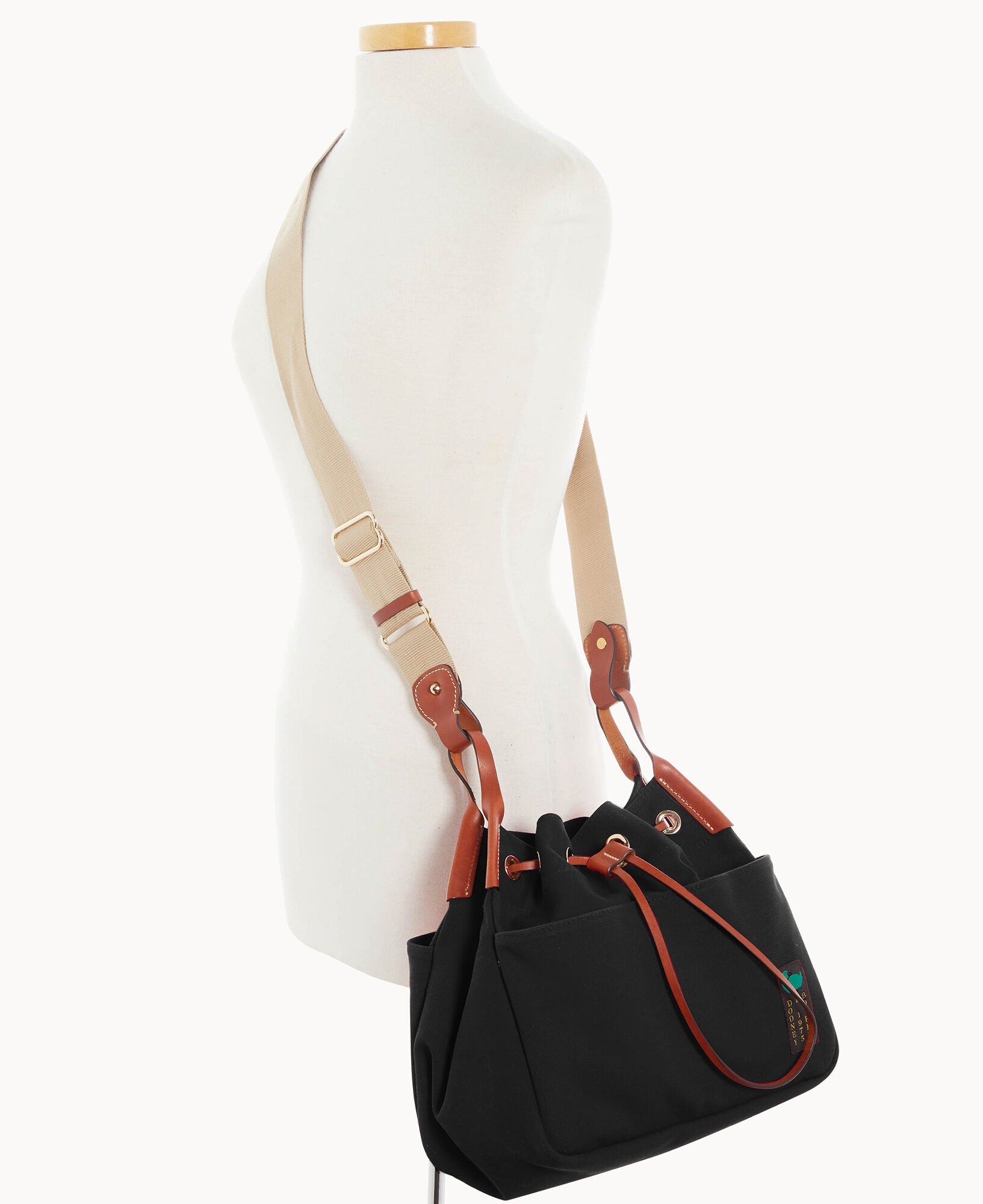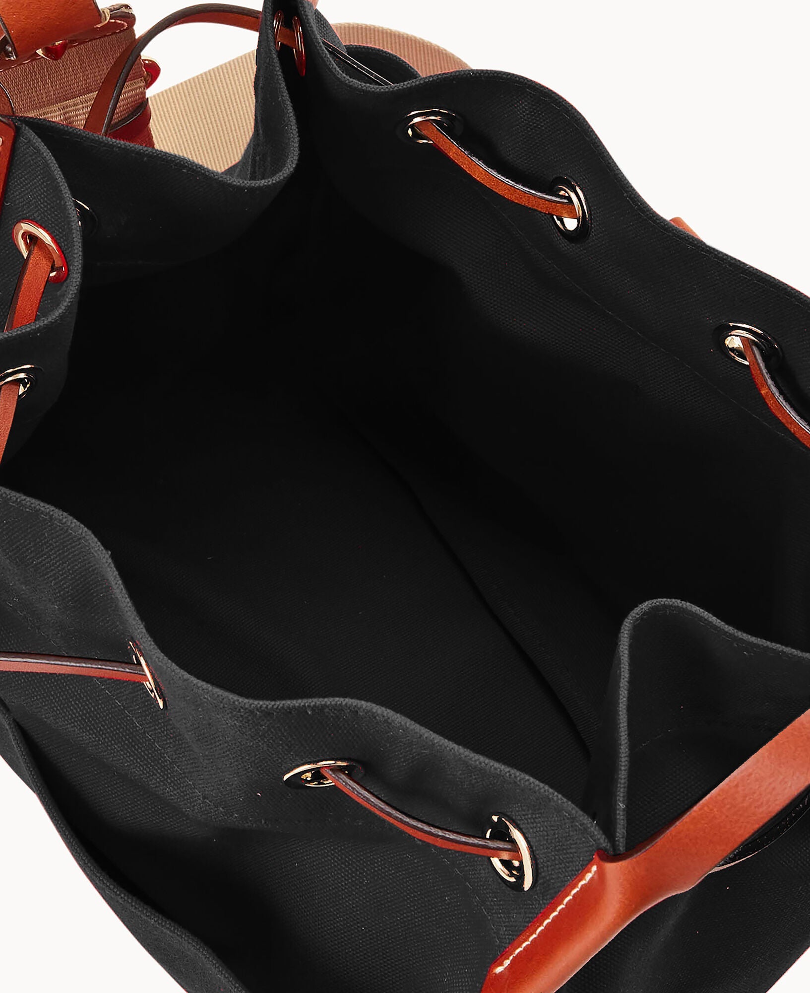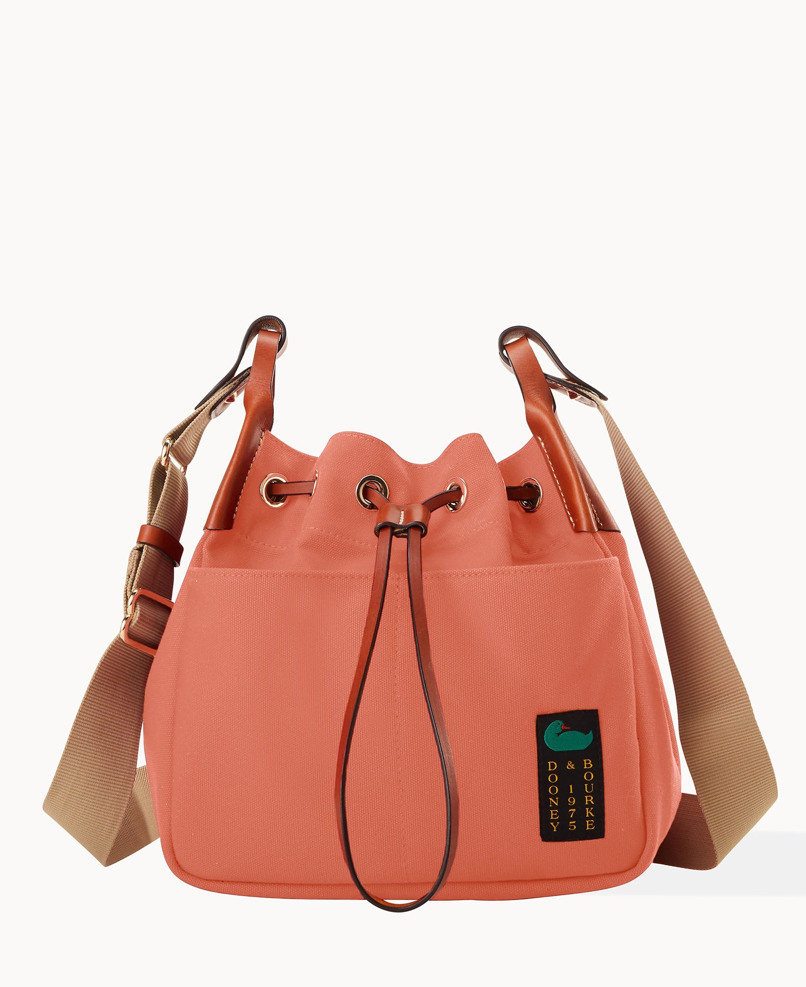 Four outside pockets. Adjustable straps. Drawstring closure.