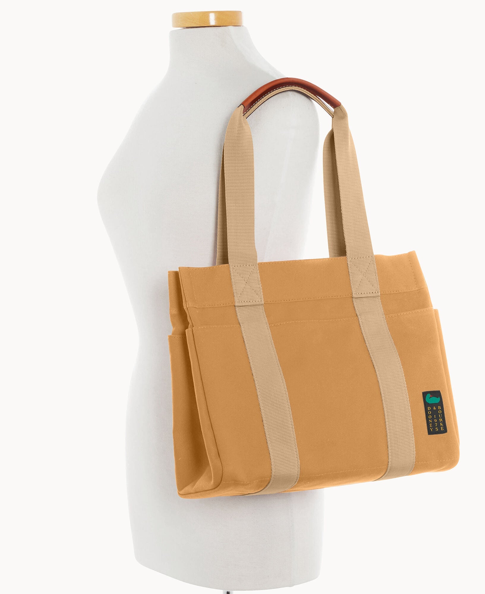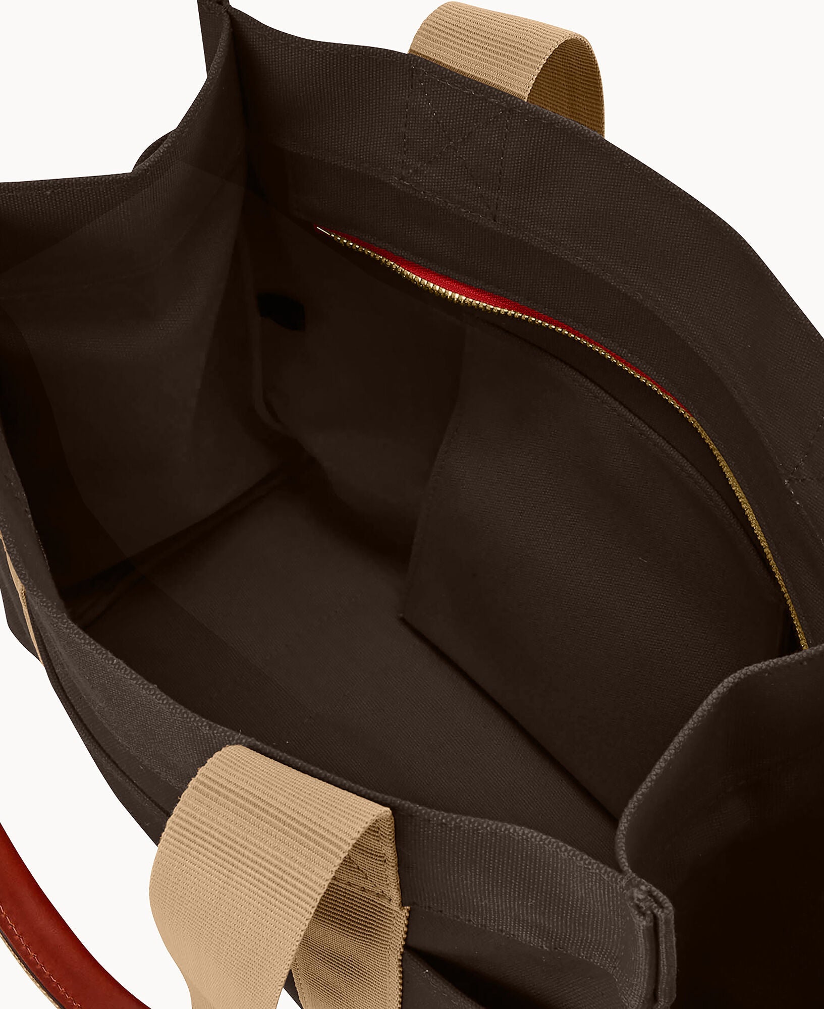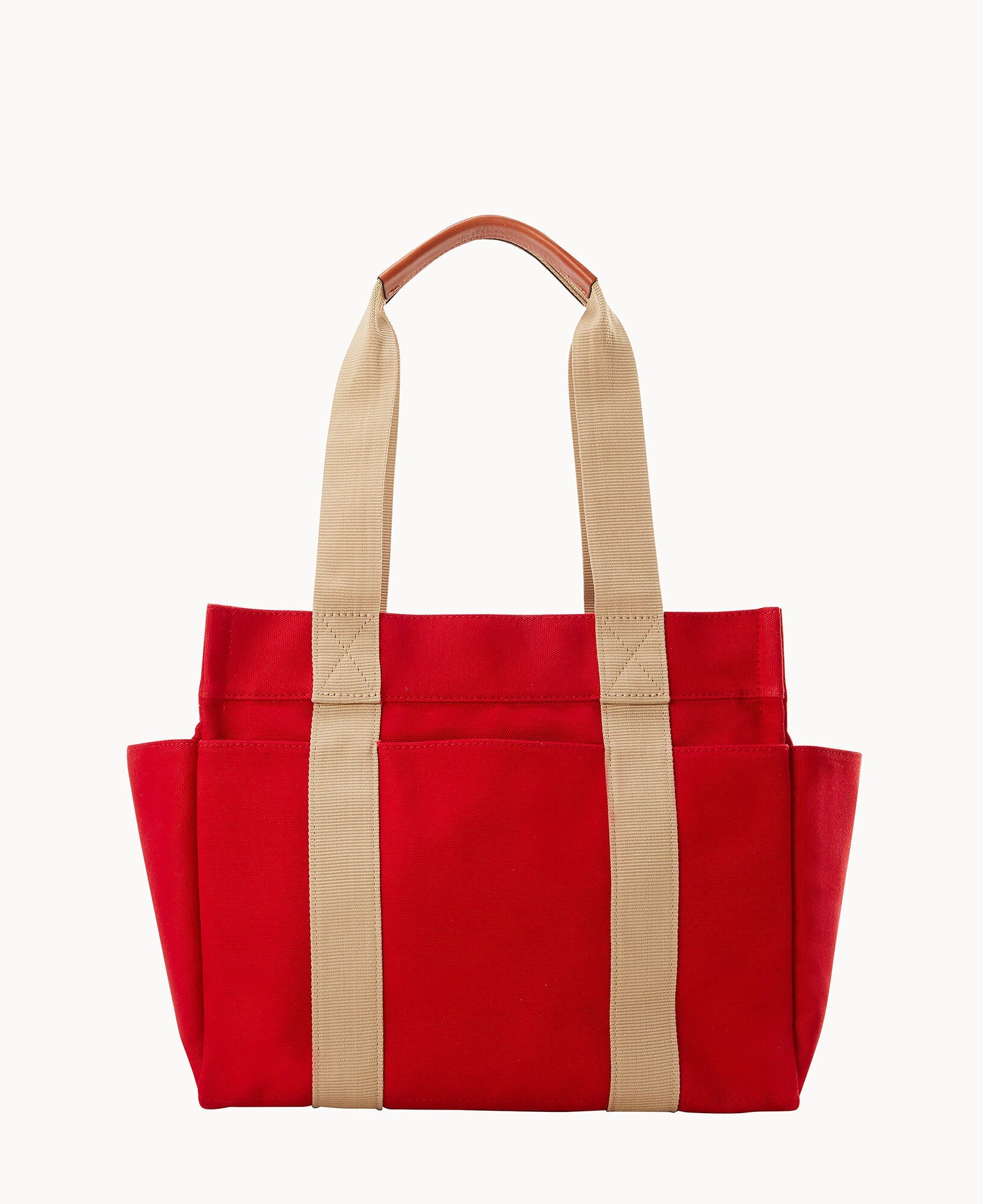 Eight outside slip pockets. Two inside slip pockets. Strap drop length 9.5". Zipper closure.
