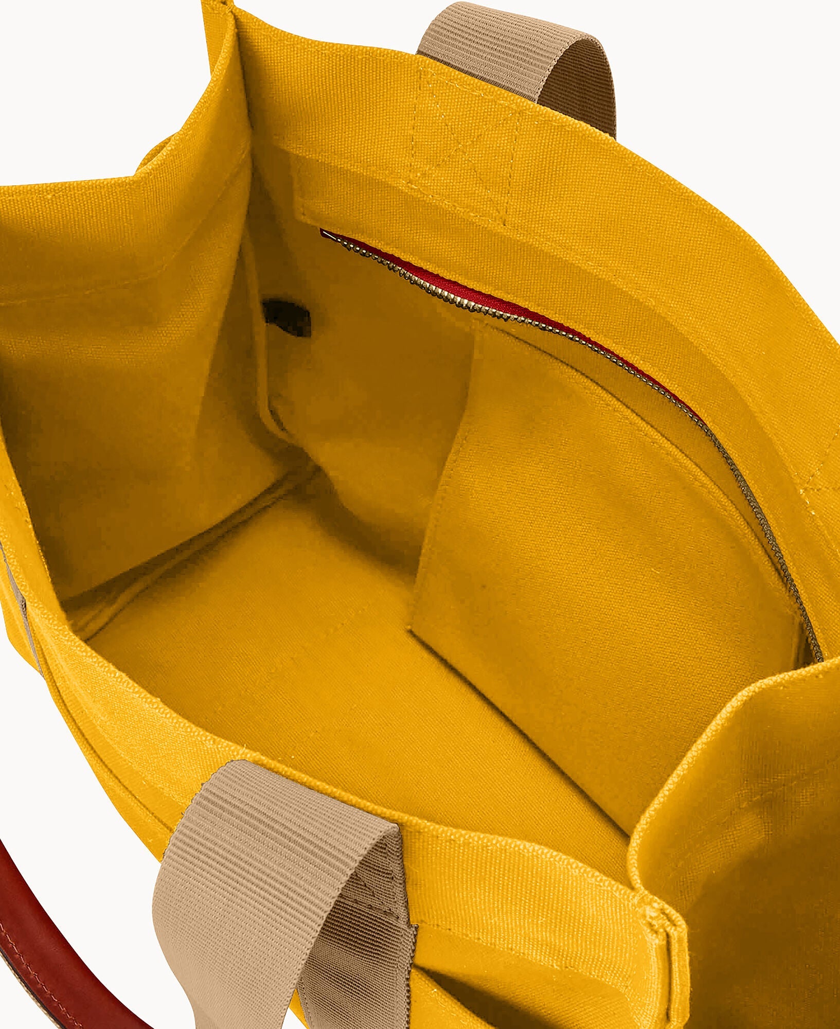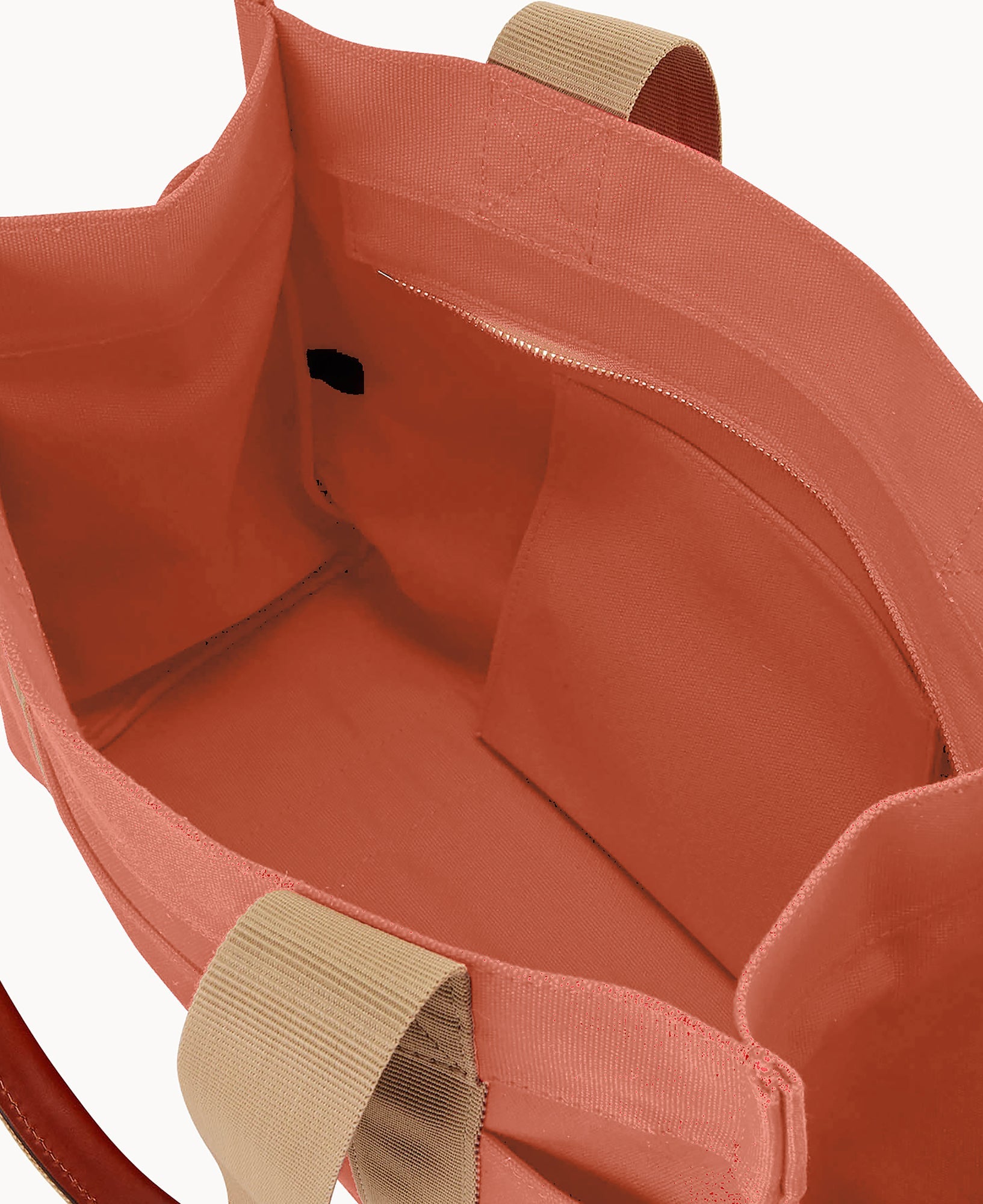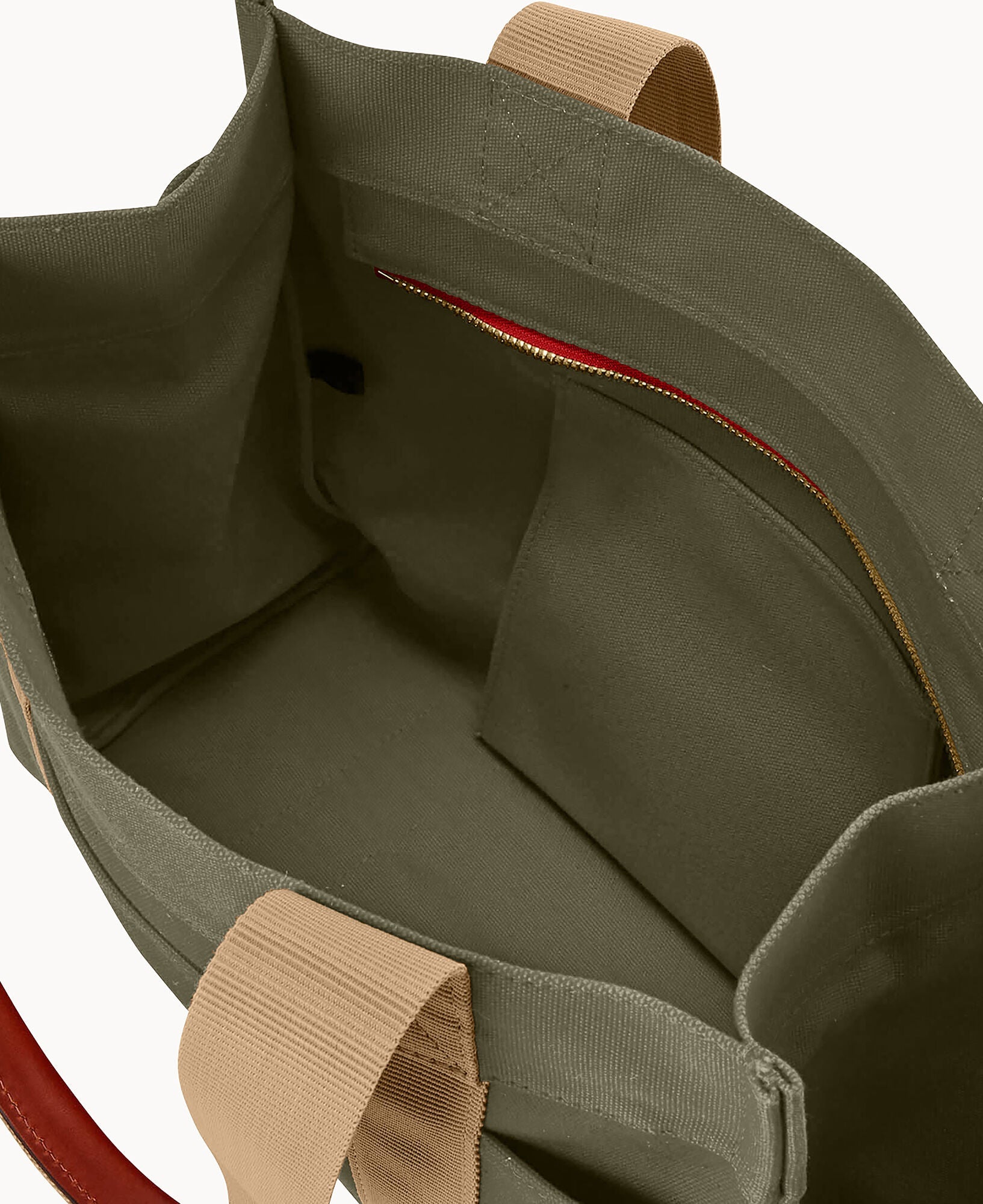 Eight outside slip pockets. Two inside slip pockets. Strap drop length 9.5". Zipper closure.