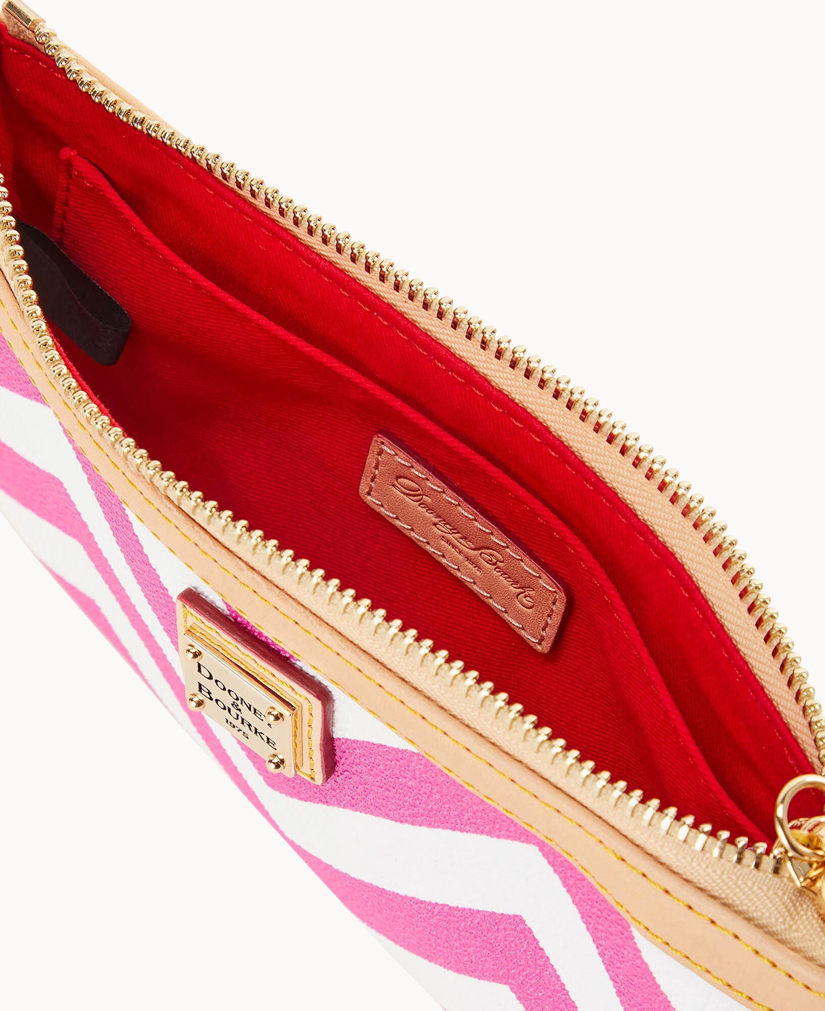 One inside pocket. Adjustable handle. Handle drop length 6.5". Adjustable wrist strap. Strap drop length 7". Lined. Zipper closure.