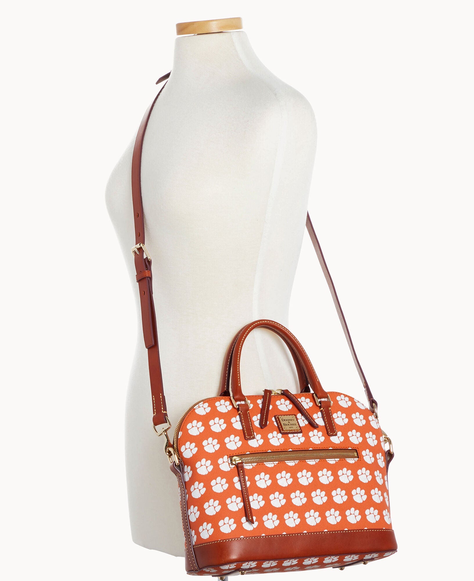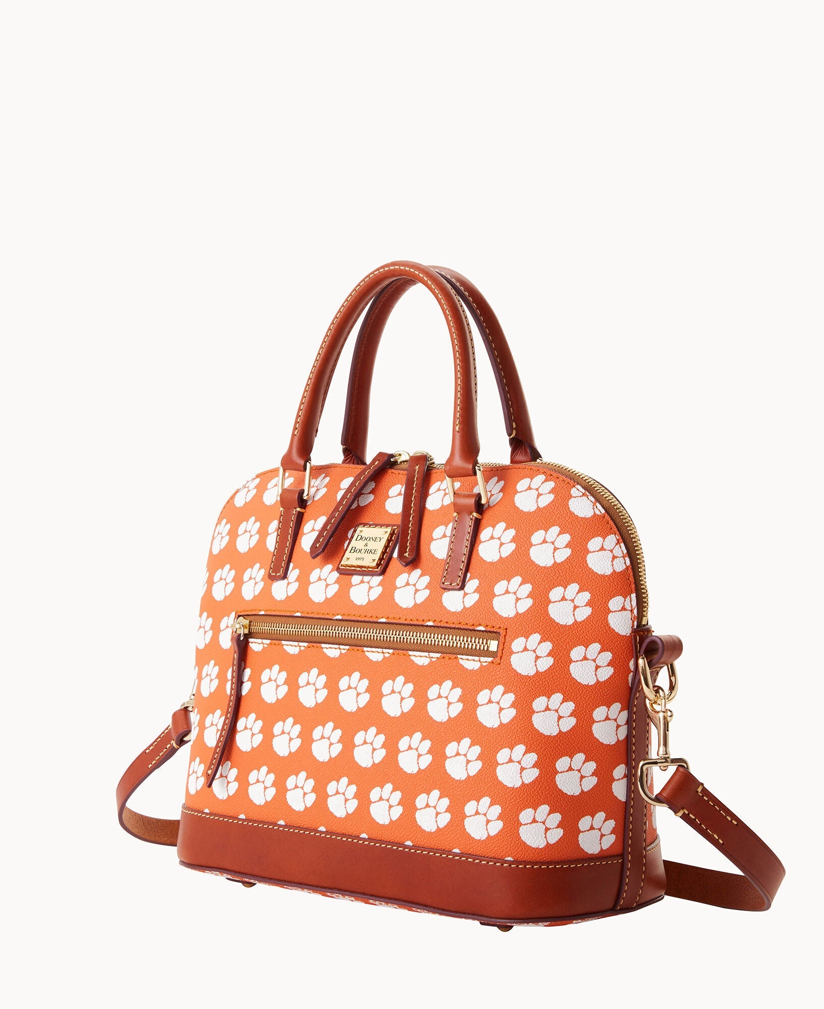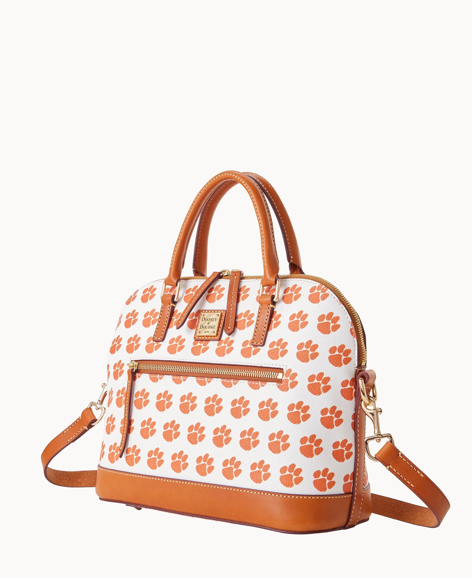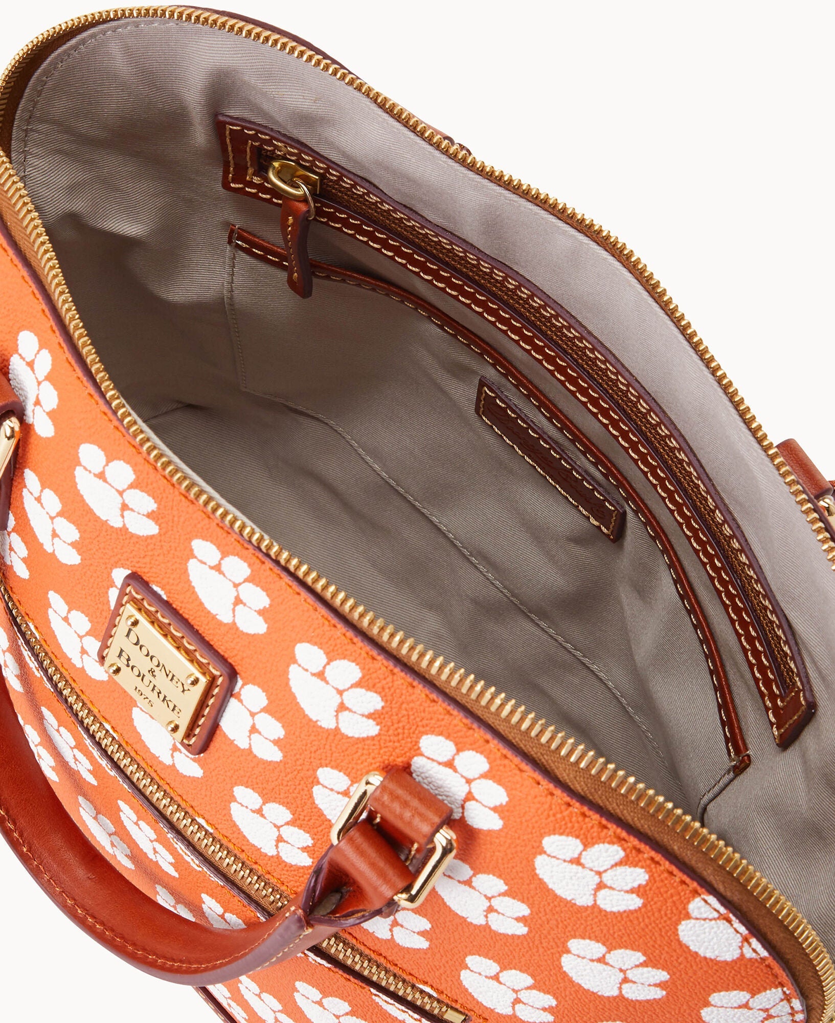 One outside zip pocket. One inside zip pocket. Two inside pockets. Cell phone pocket. Inside key hook. Handle drop length 5". Adjustable, detachable shoulder strap. Strap drop length 21". Lined. Feet. Zipper closure.