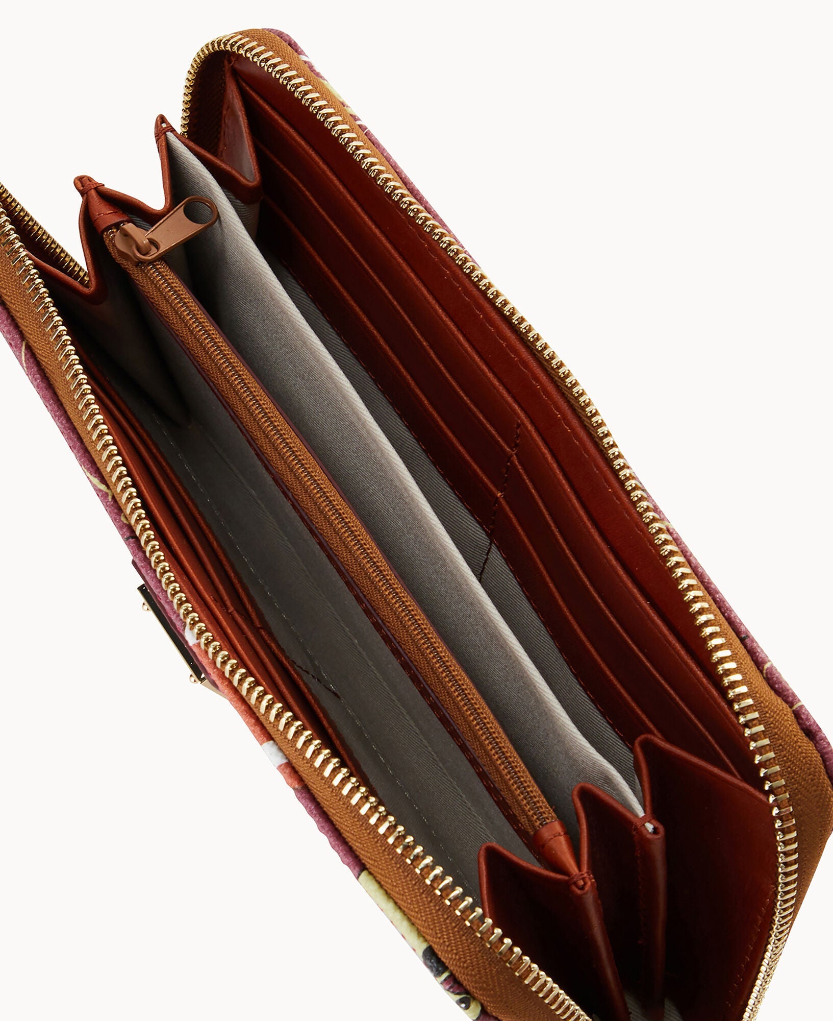 Two compartments. One zip compartment. Twelve credit card slots. Detachable wrist strap. Strap length 7". Lined. Zipper closure.