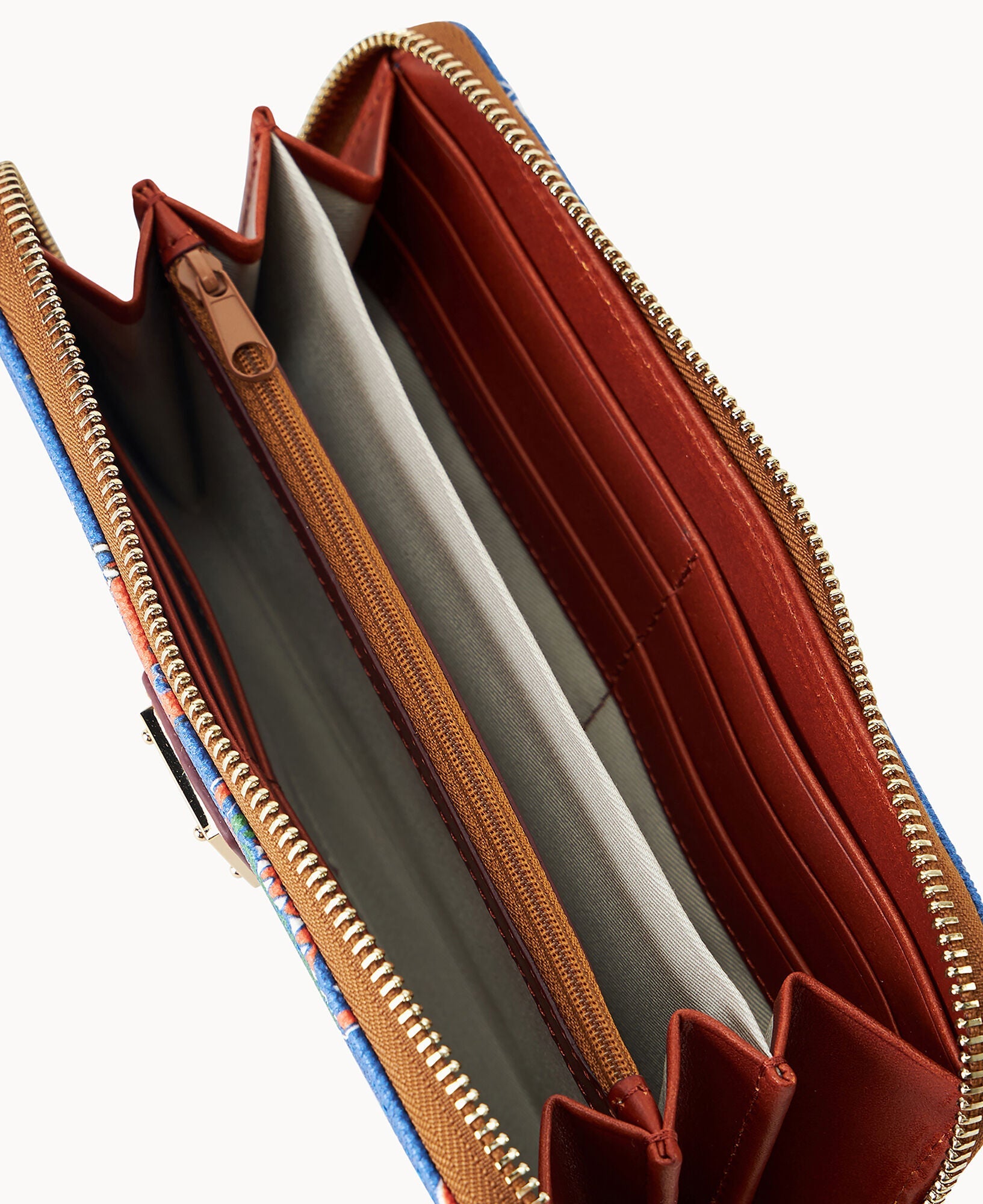 Two compartments. One zip compartment. Twelve credit card slots. Detachable wrist strap. Strap length 7". Lined. Zipper closure.