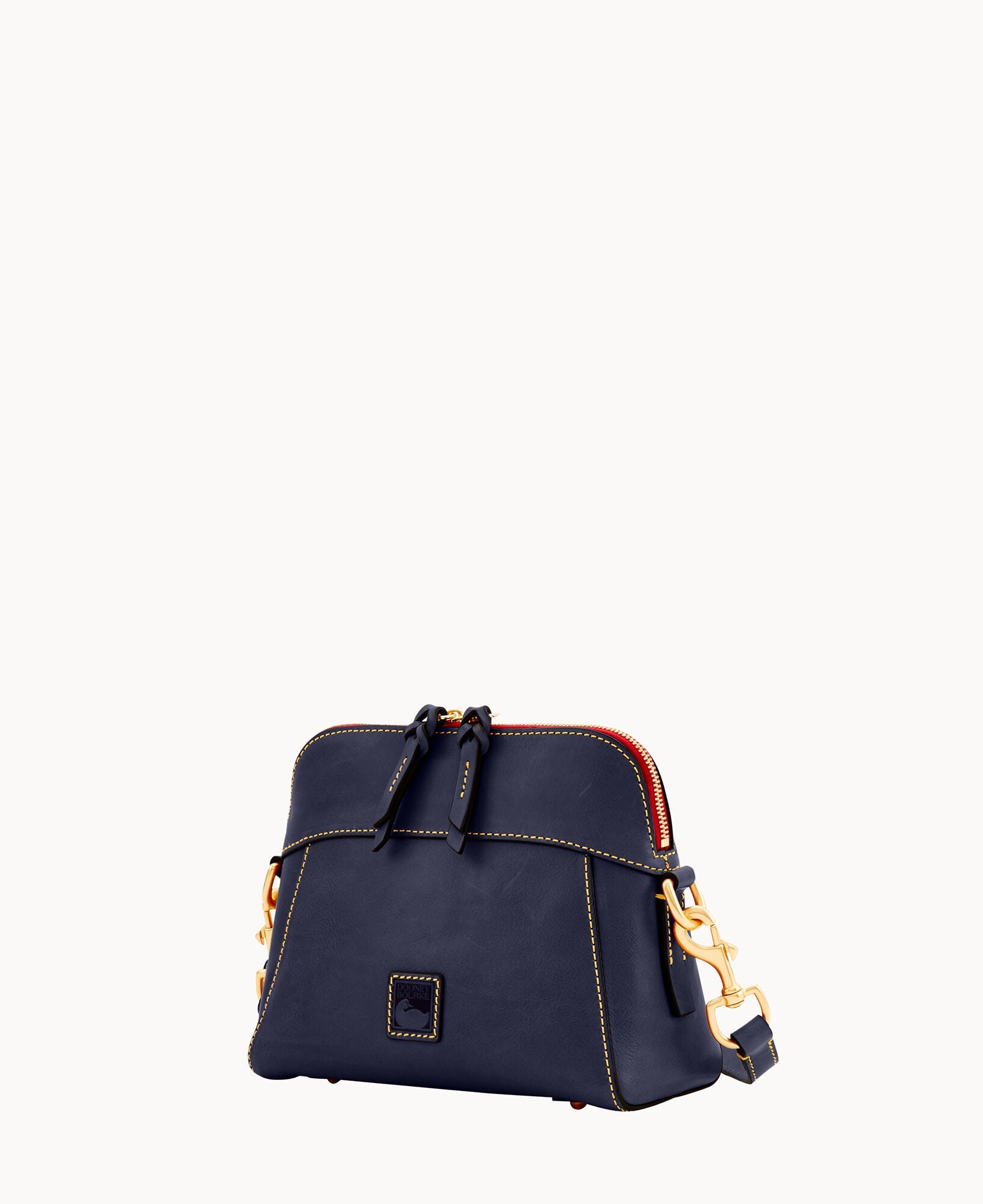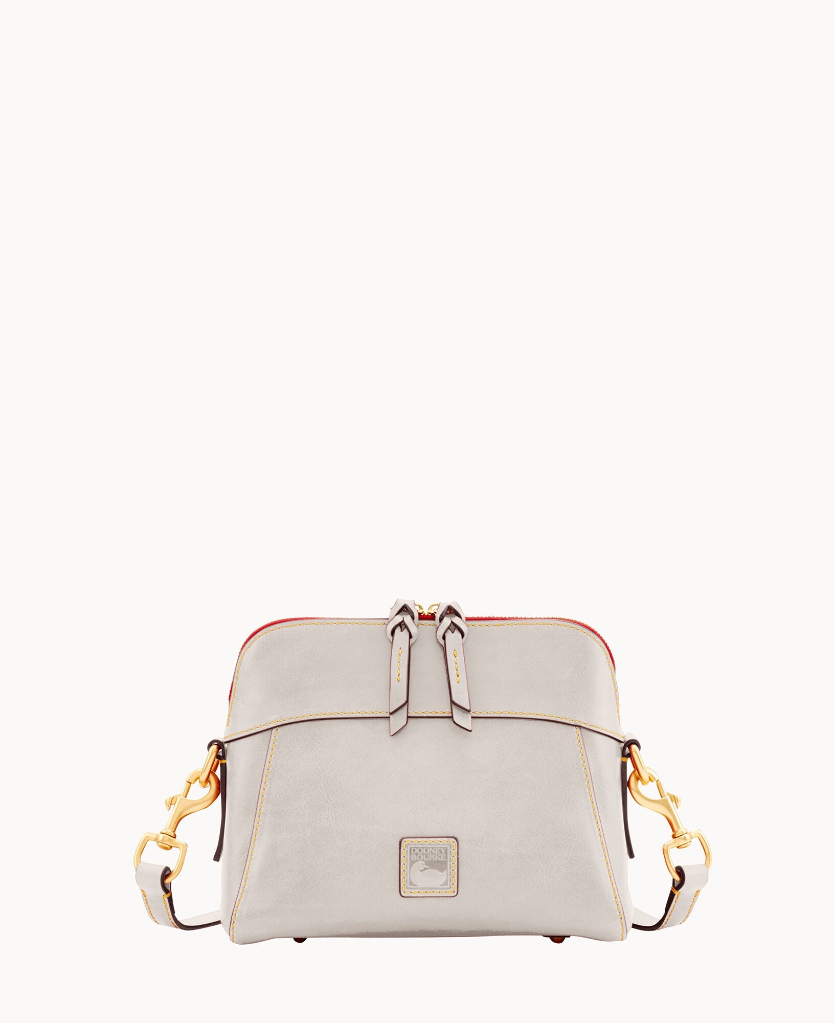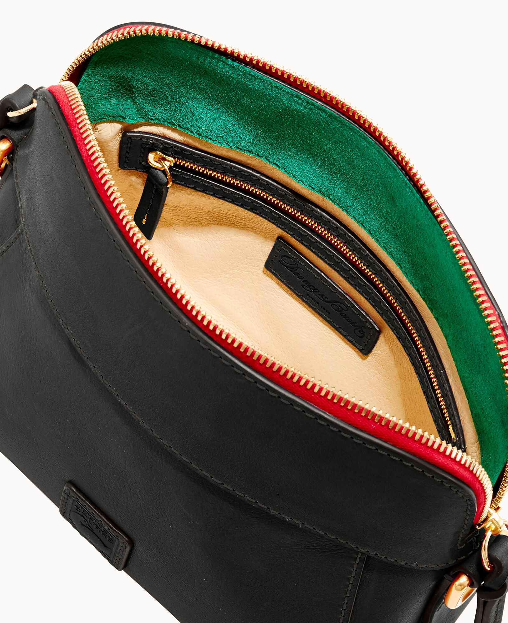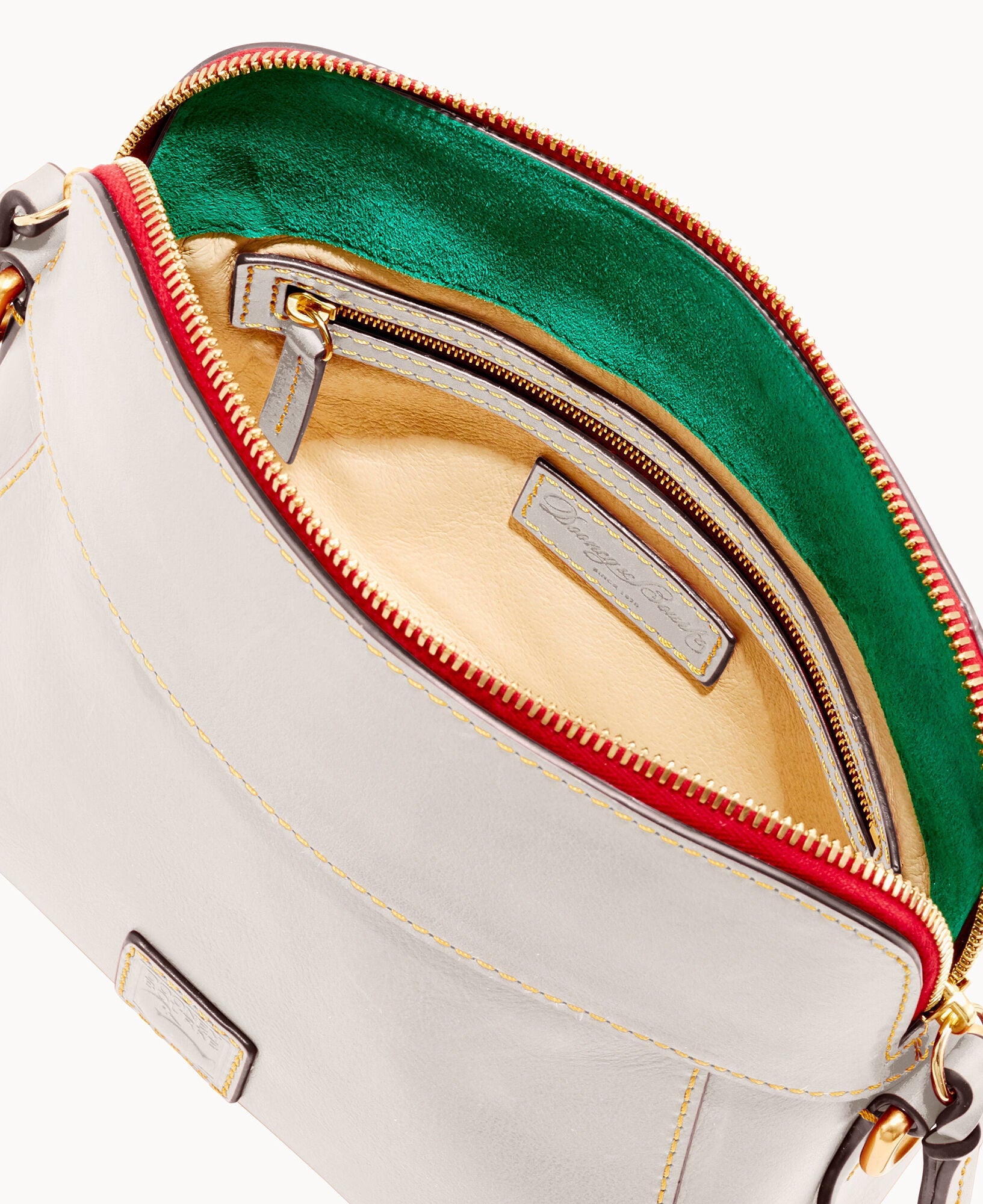 One inside zip pocket. Two inside pockets. Cell phone pocket. Inside key hook. Strap drop length 22.5". Lined. Feet. Zipper closure.