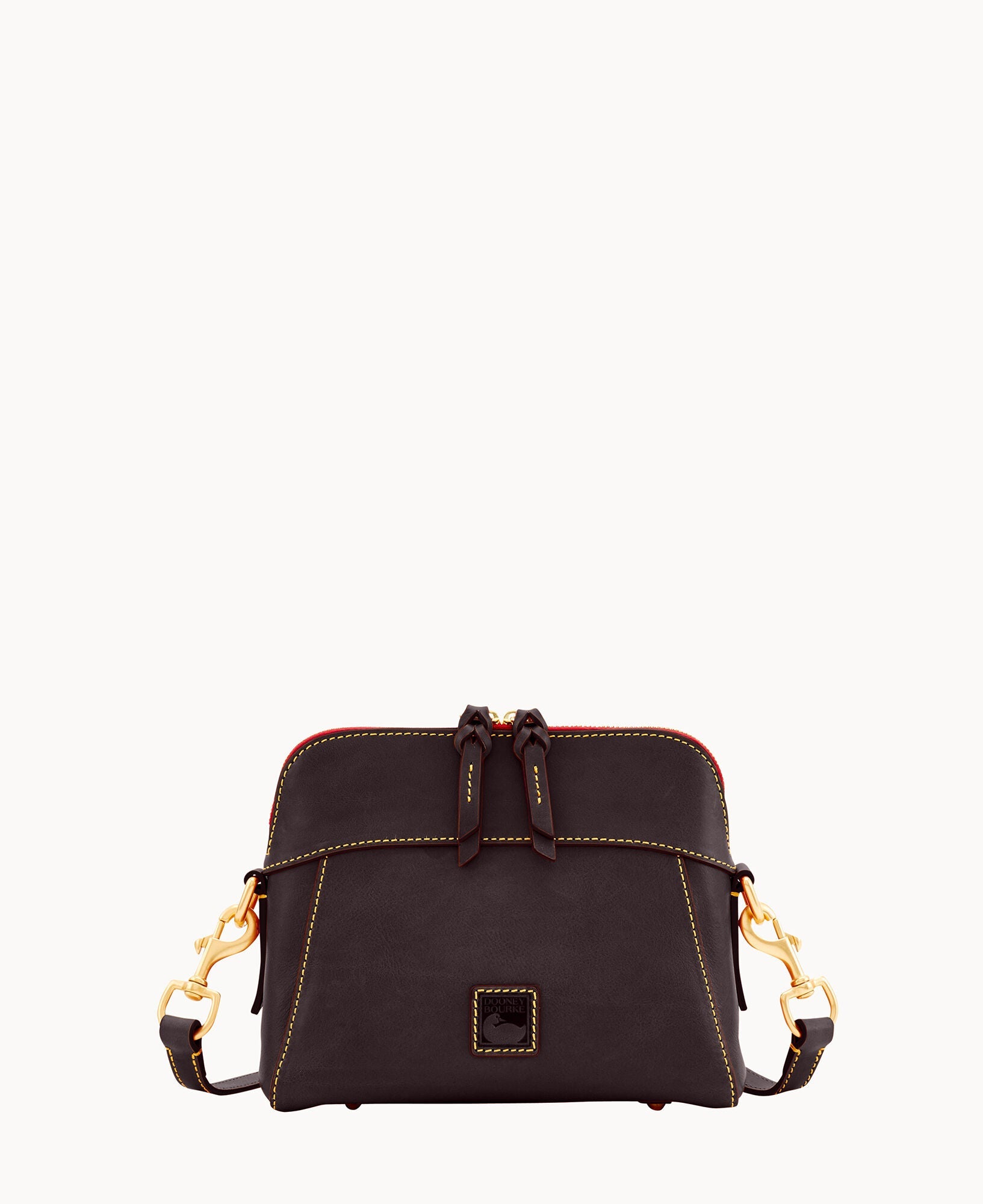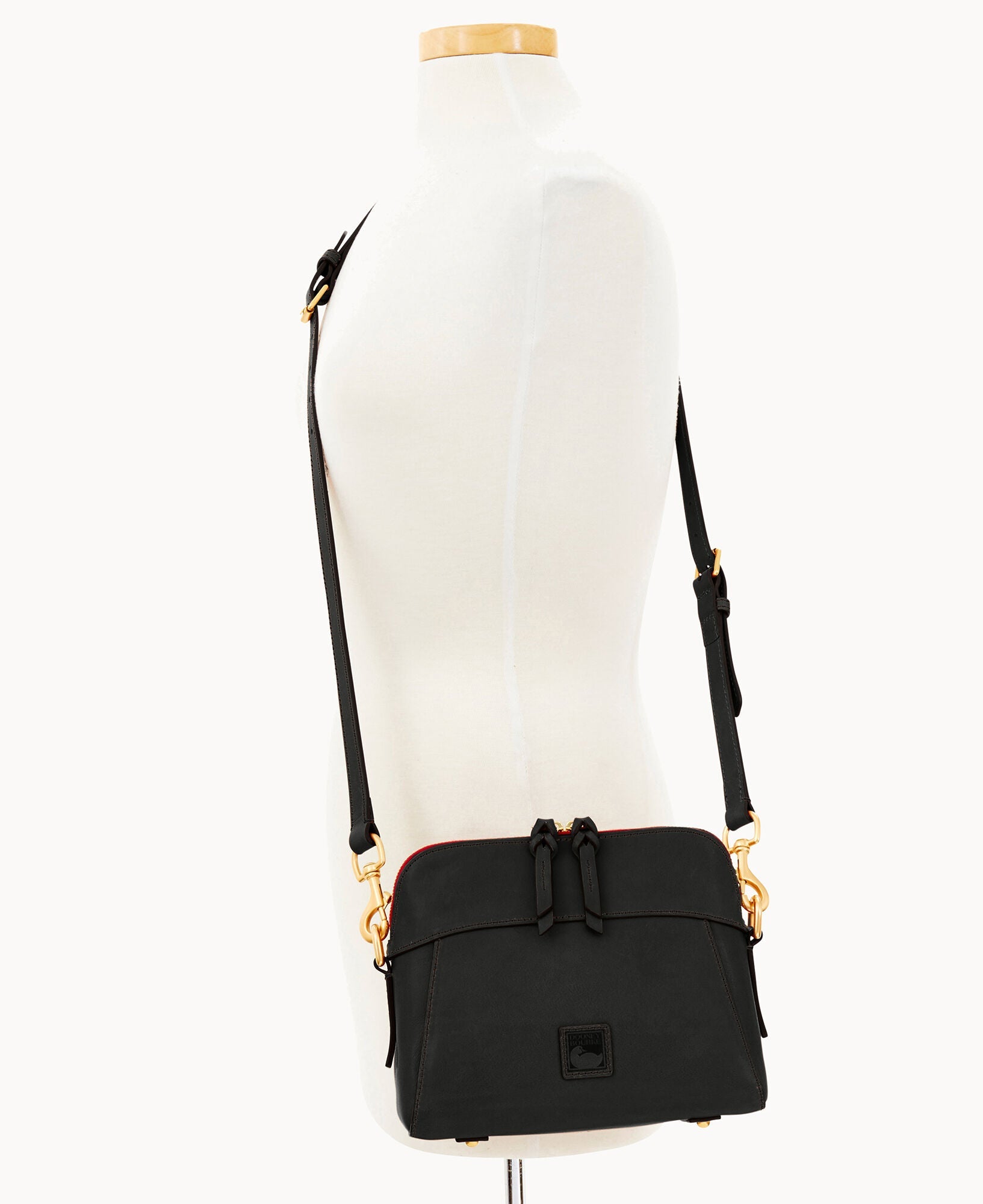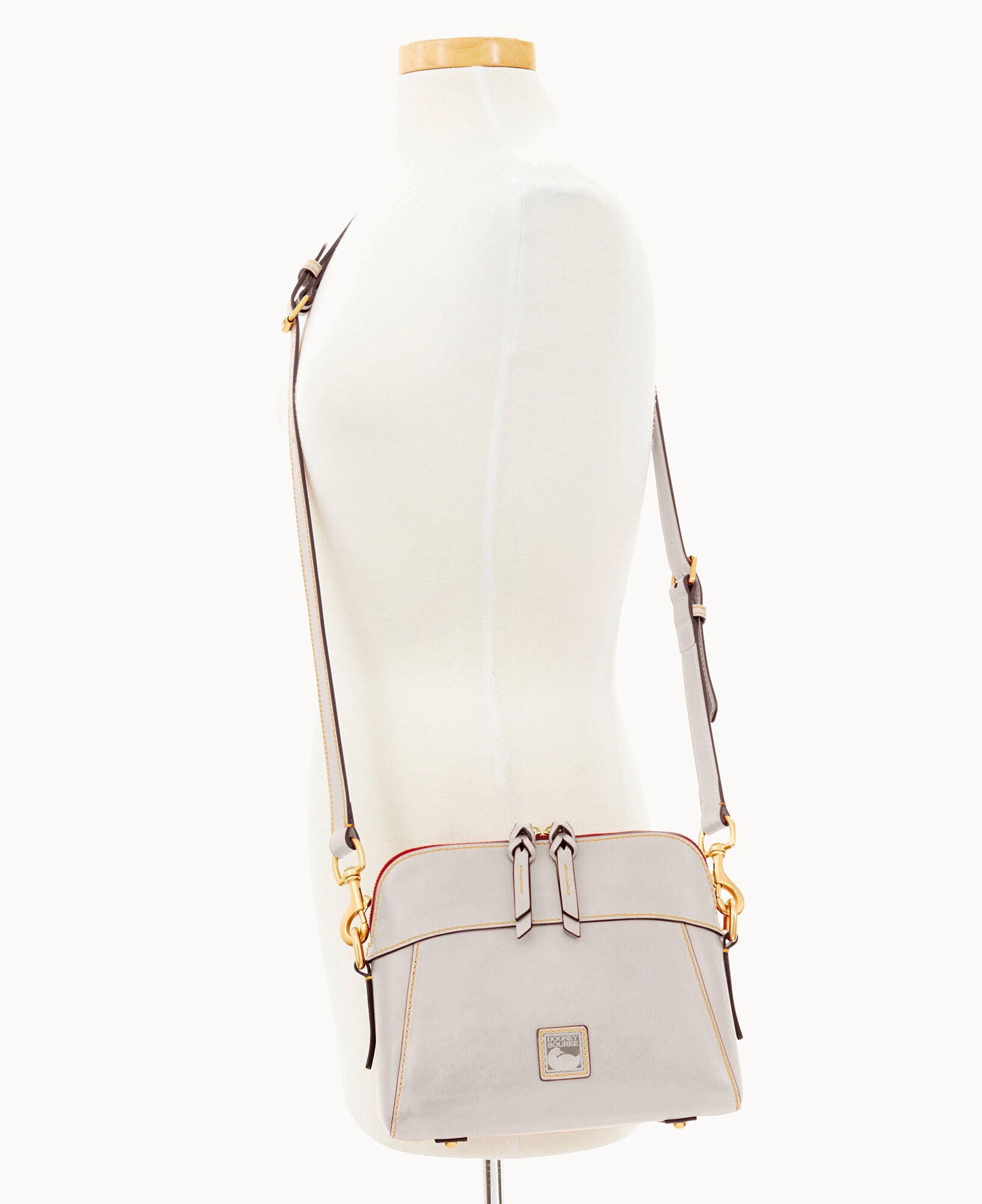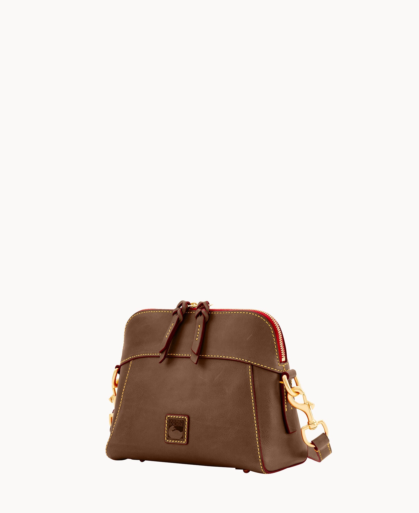One inside zip pocket. Two inside pockets. Cell phone pocket. Inside key hook. Strap drop length 22.5". Lined. Feet. Zipper closure.